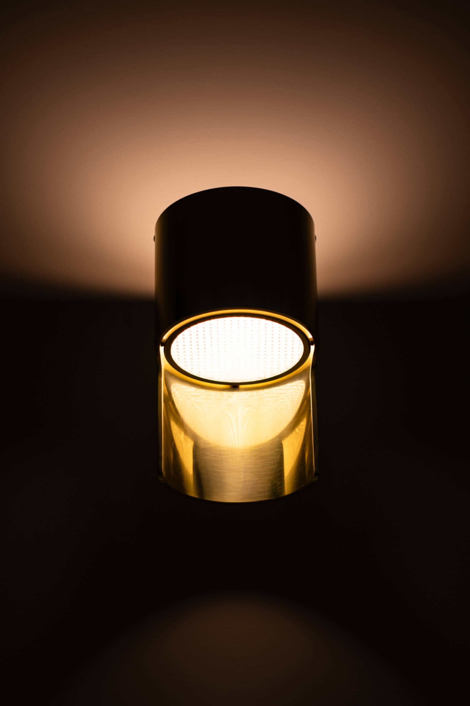 The lamp is executed entirely in brass, giving it a warm golden surface with strong reflective qualities. A textured diffuser element is integrated in the lower opening, functioning as a glare control component while also creating a more even and softened light distribution. When lit, the lamp produces a distinct architectural lighting effect, casting both an ambient glow and a pronounced pattern of light and shadow onto the surrounding wall surface. The result is typical of Scandinavian mid-century lighting design, where the technical shaping of metal is used to guide and modulate the illumination.