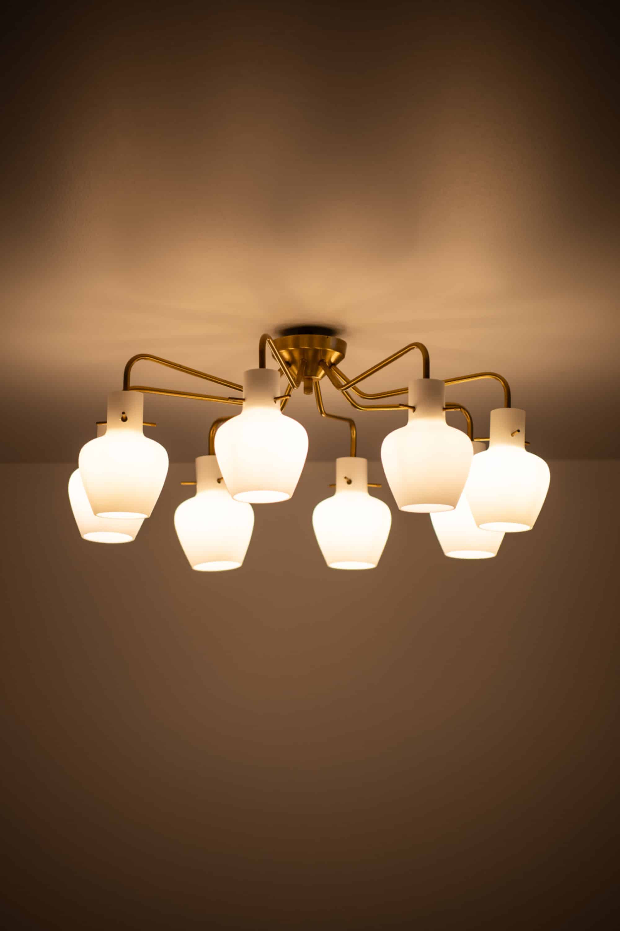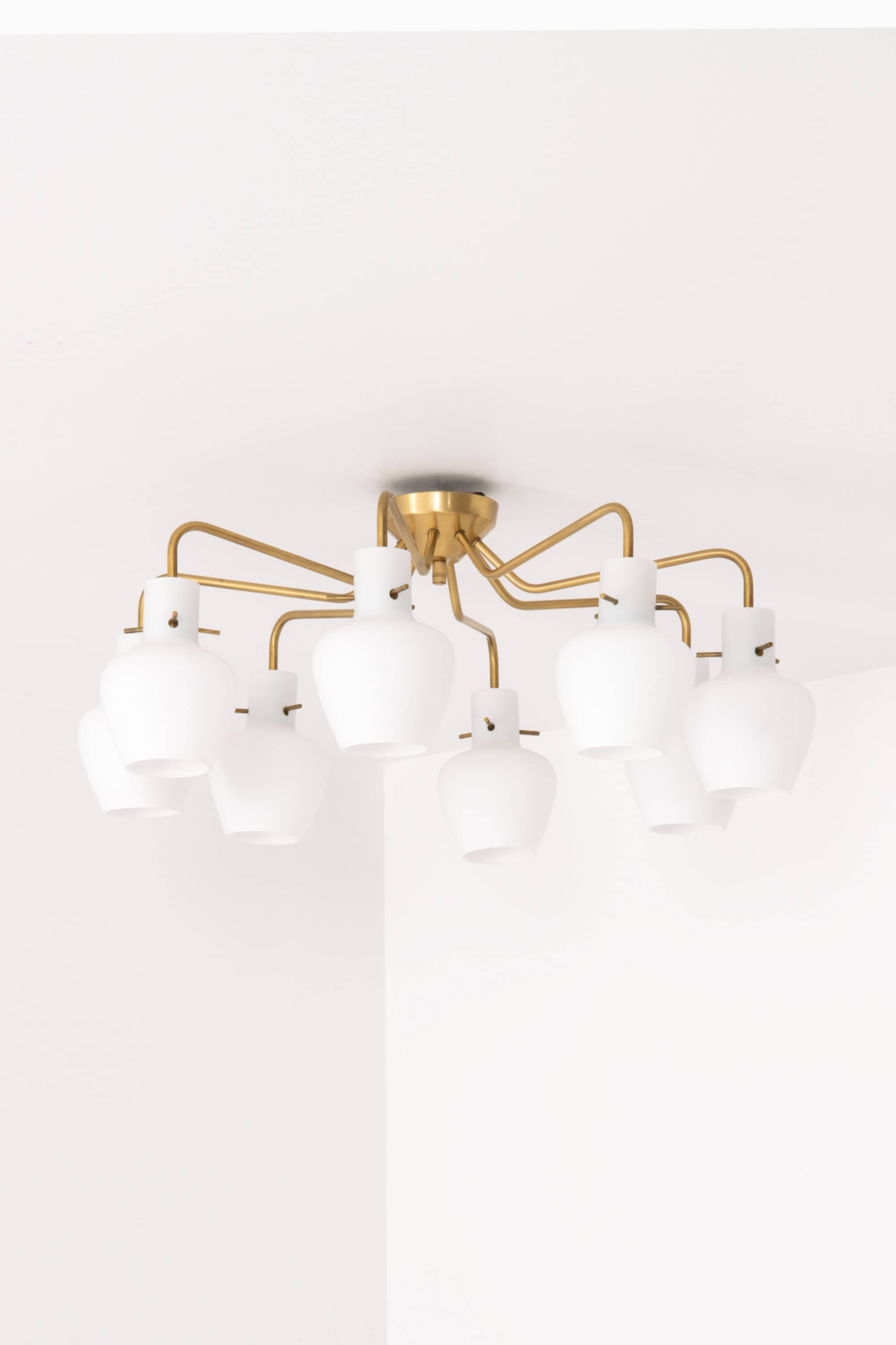 This very rare ceiling lamp, model 136, was designed by Hans Bergström and produced by Ateljé Lyktan in Åhus, Sweden during the 1940s. The fixture is executed in brass with eight opaline glass shades, creating a multi-armed structure with a strong architectural presence while still maintaining an airy, balanced overall profile.