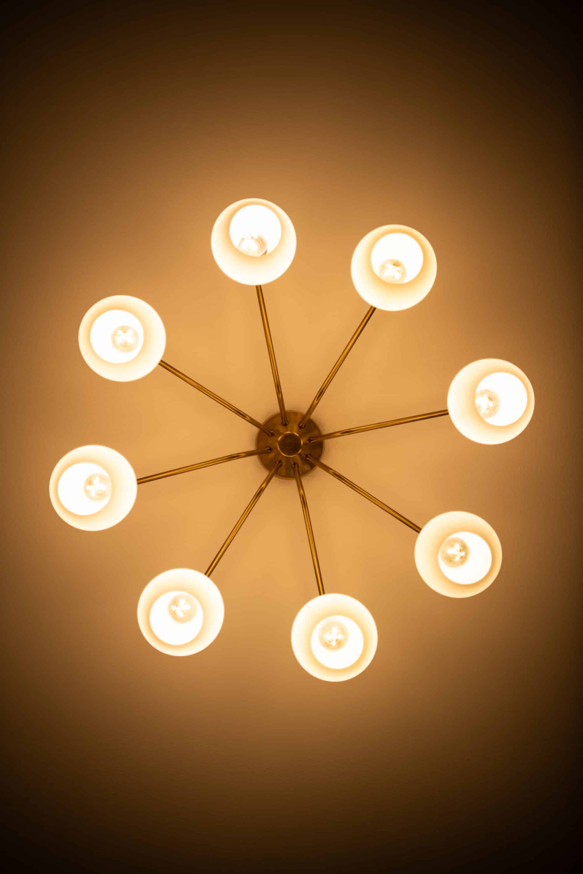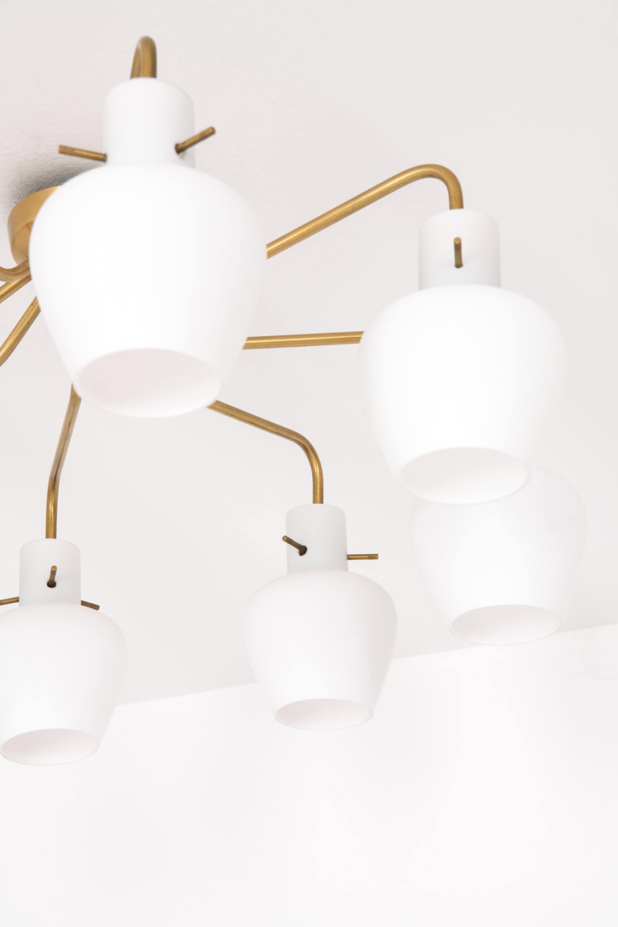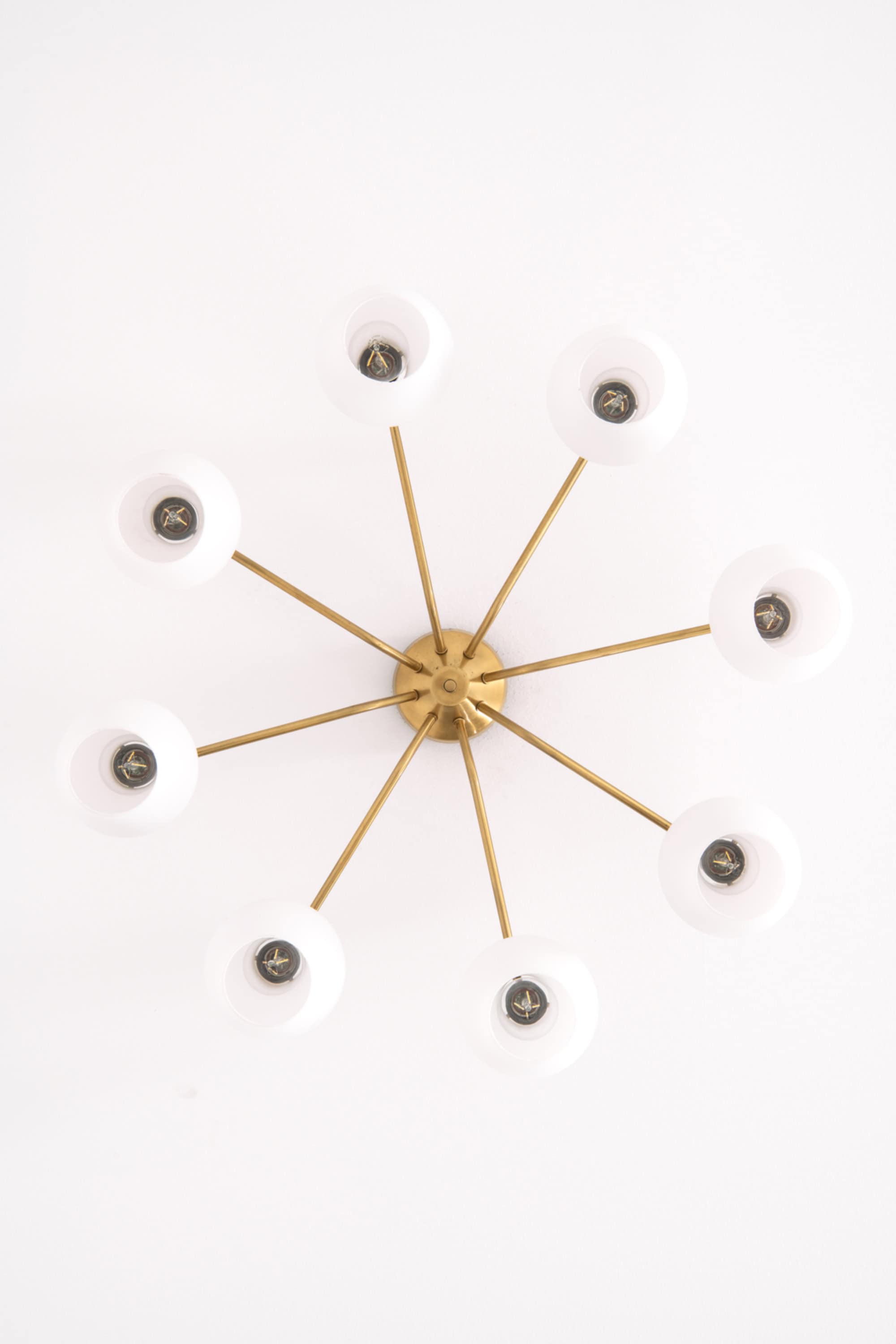 The construction is based around a central ceiling canopy in brass from which eight arms extend radially. Each arm is formed from bent tubular brass, creating a rhythmic geometry with subtle directional changes before terminating in the lamp holders. The glass shades are made in opaline glass with a softly rounded, slightly tapered body and an open lower edge, distributing light both downward and outward. Each shade is secured at the neck with small brass fittings, adding a precise mechanical detail and emphasizing the relationship between metal and glass.