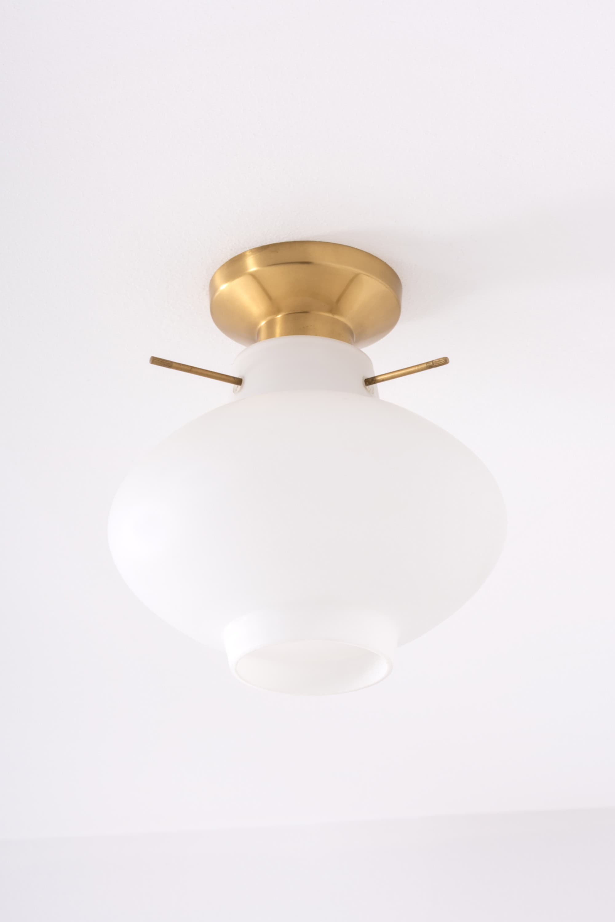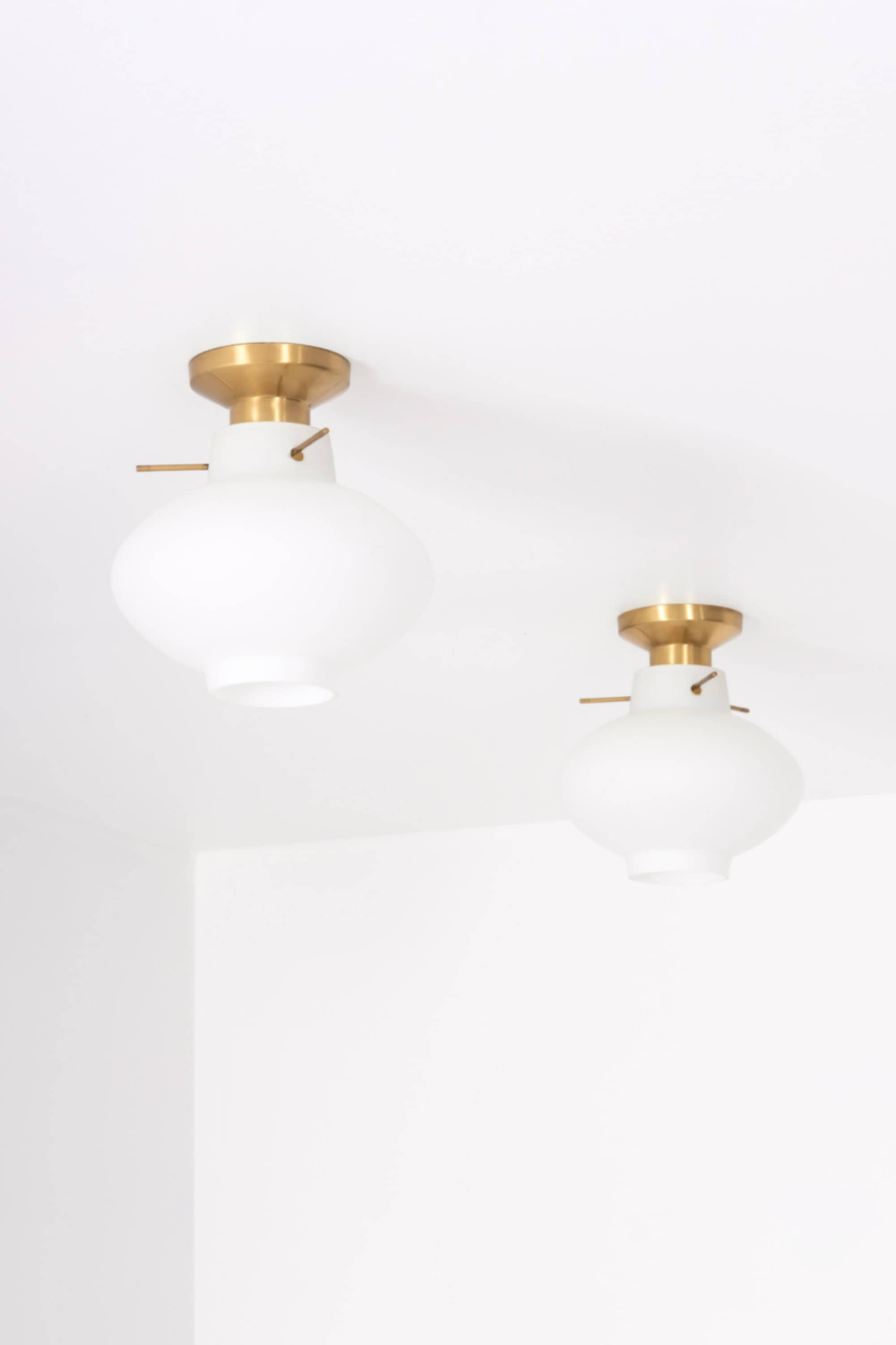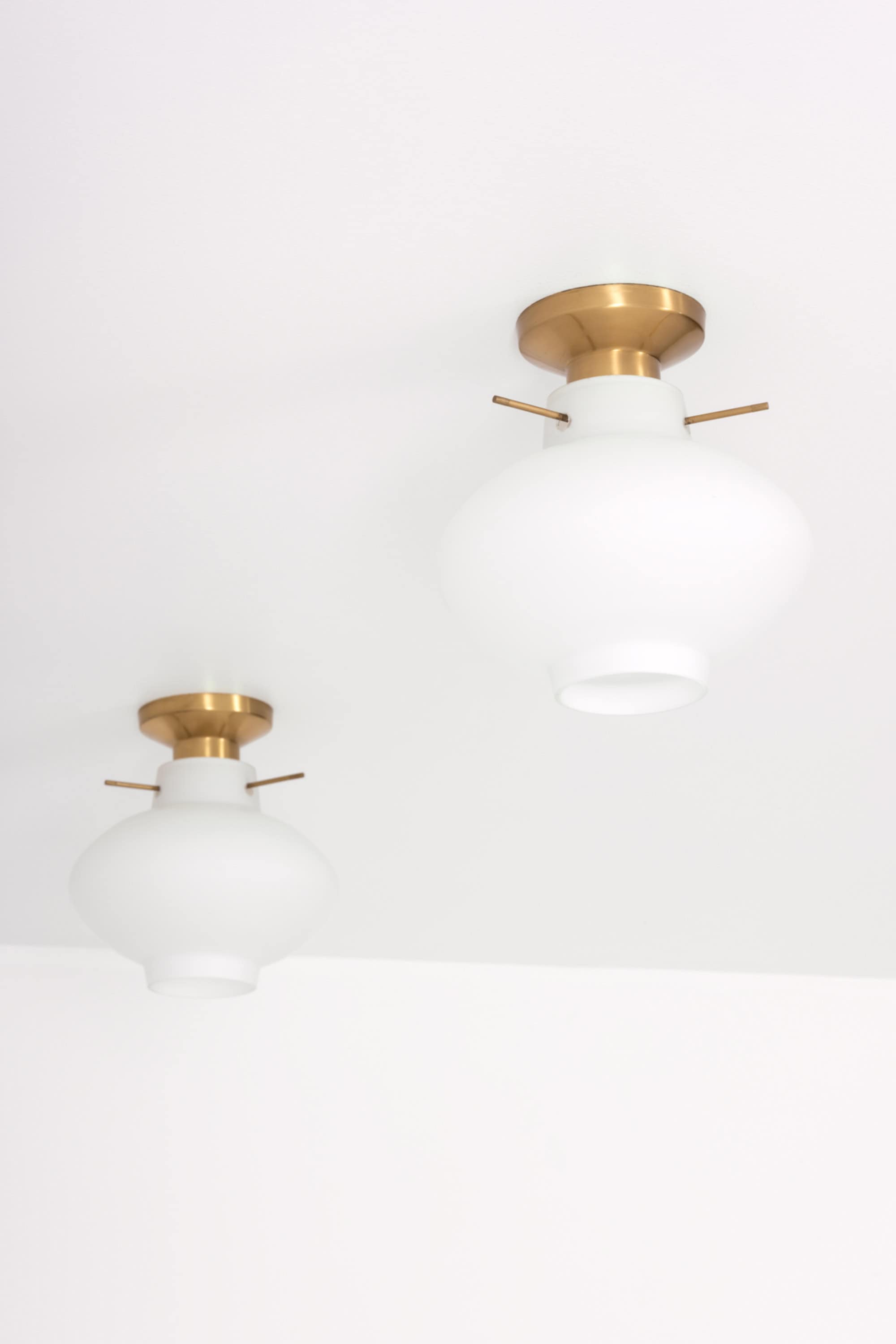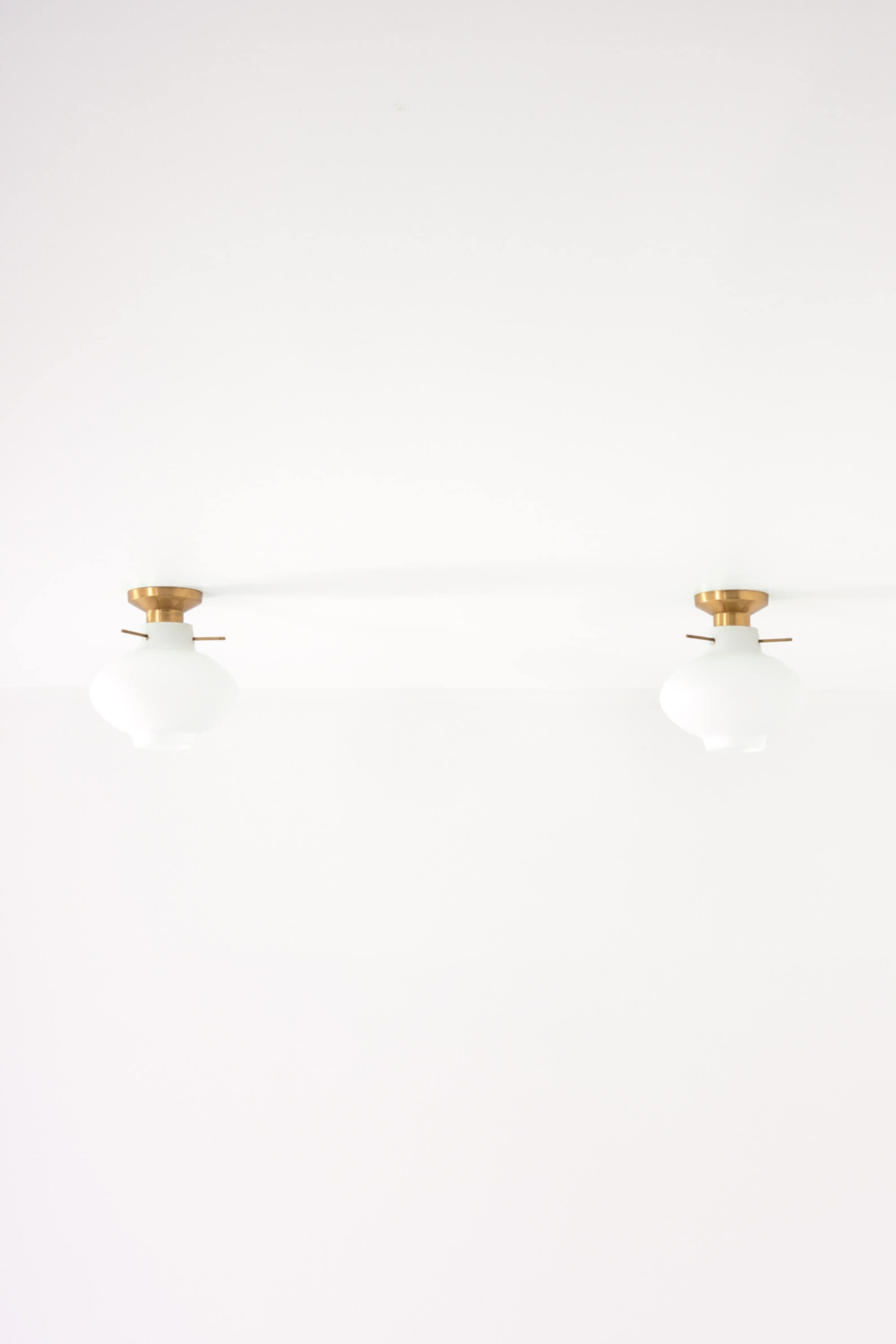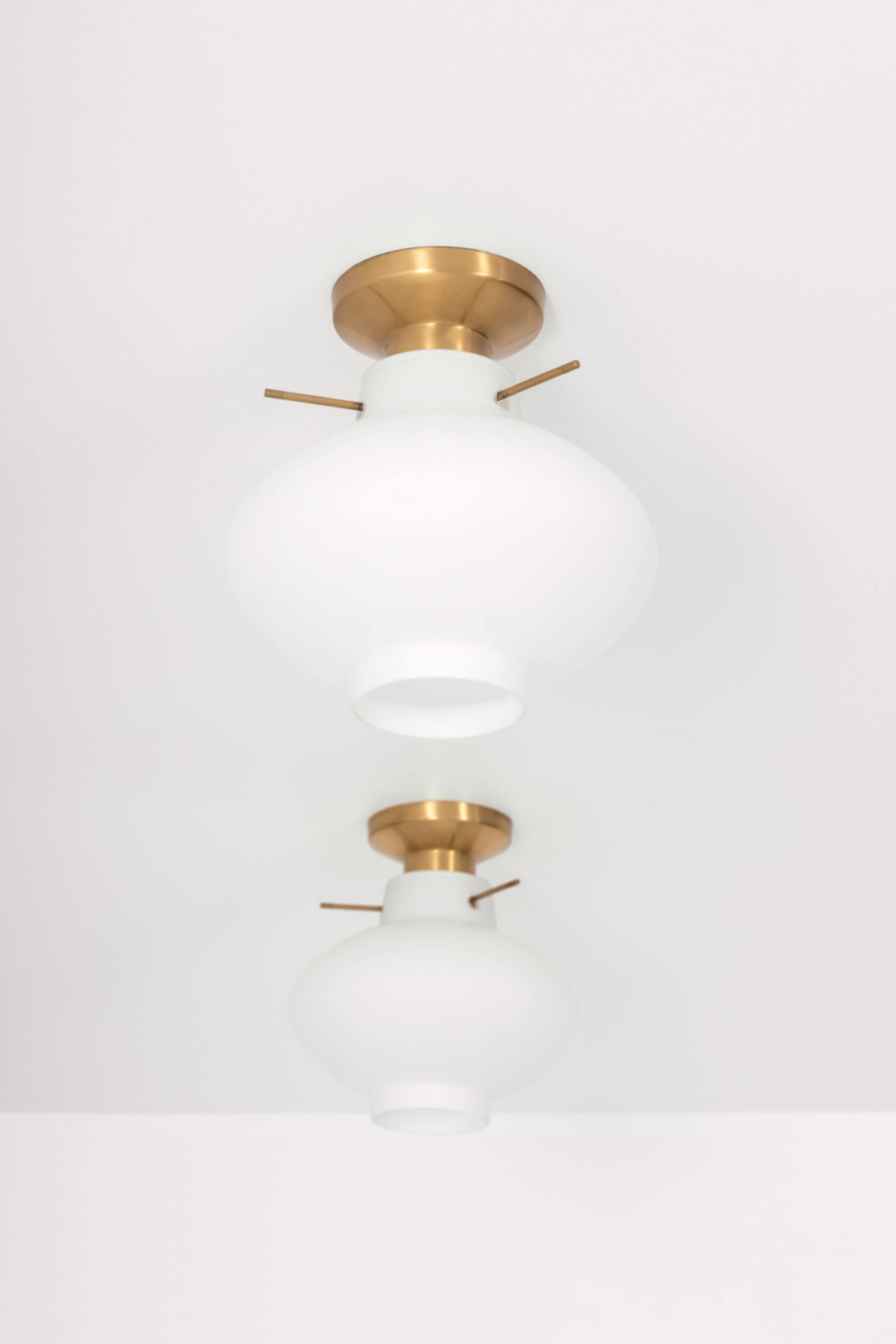 Each lamp consists of a mouth-blown opaline glass shade with a softly rounded, slightly compressed spherical form. The glass is white and opaque, with a smooth surface that diffuses light evenly and reduces glare. When illuminated, the glass emits a warm, gentle glow with subtle tonal depth, while unlit it appears clean and neutral. The shade is held in place by a brass structure, including a circular ceiling canopy and slender horizontal brass rods that secure the glass. These details introduce a precise, architectural contrast to the organic glass form.