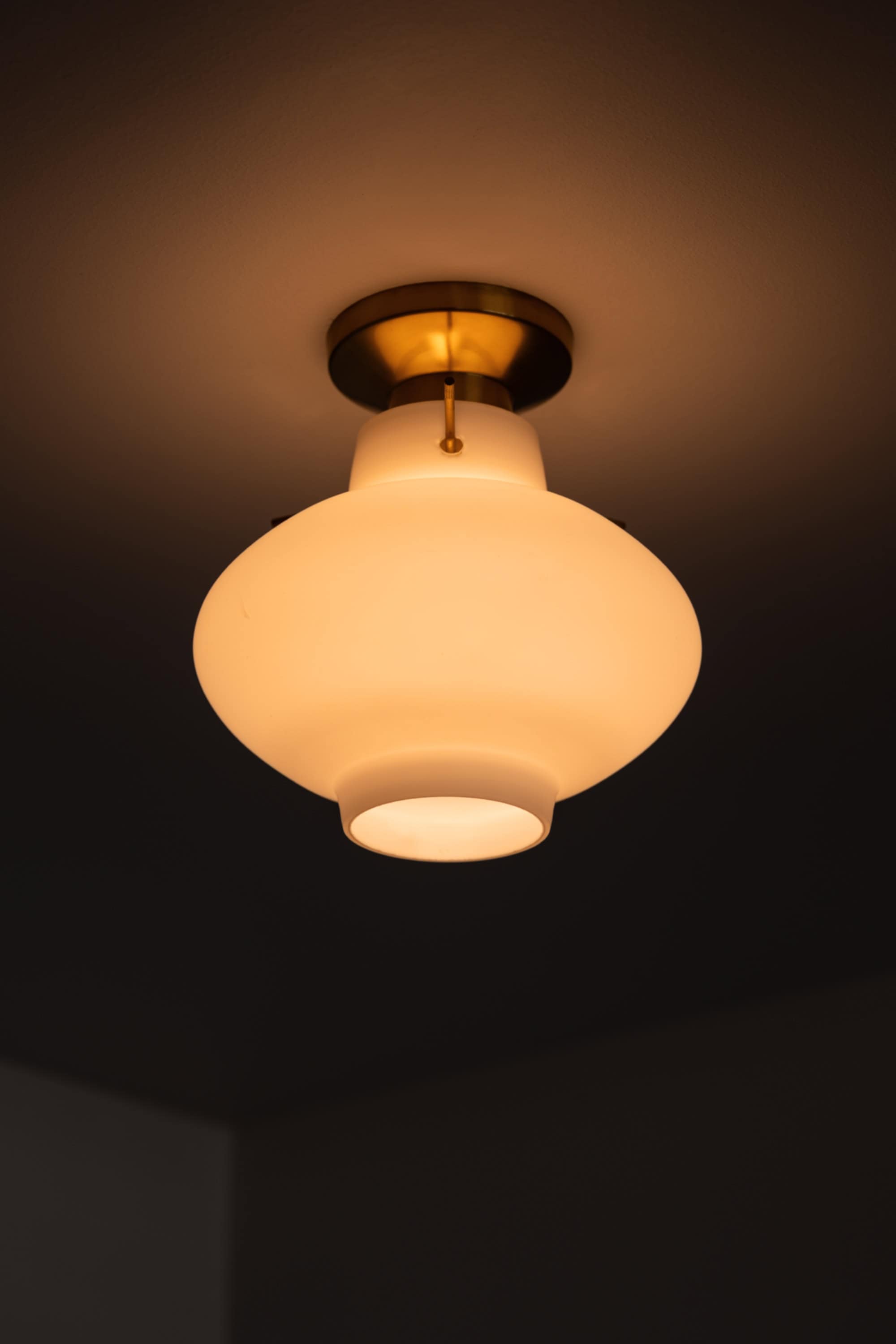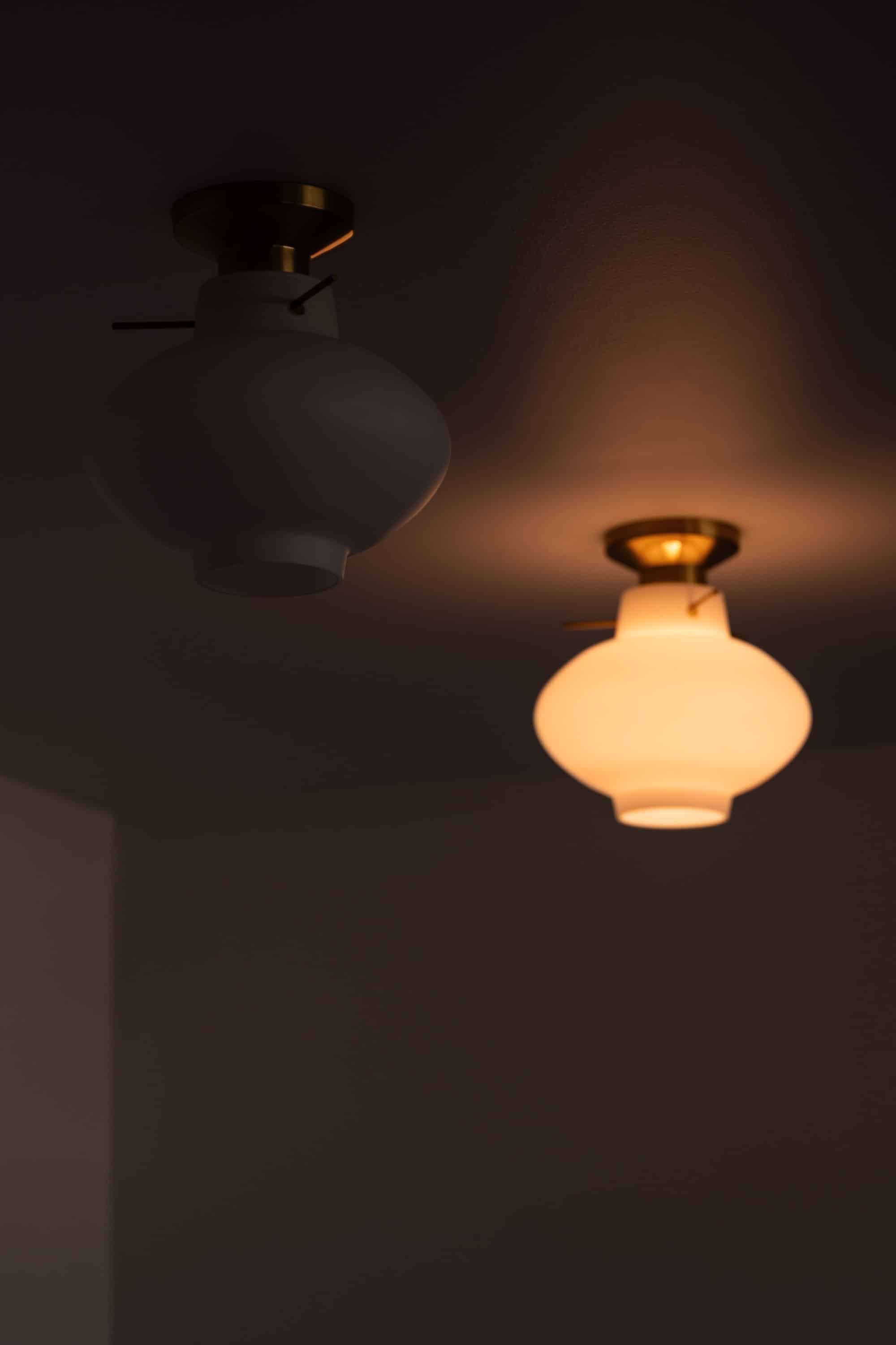 The brass components have a warm golden tone and a finely finished surface, characteristic of Ateljé Lyktan’s production quality during this period. The construction is both robust and visually light, allowing the lamps to sit close to the ceiling without appearing heavy. This type of flush mount was particularly suited to interiors with lower ceiling heights, while still providing a generous and atmospheric light output.