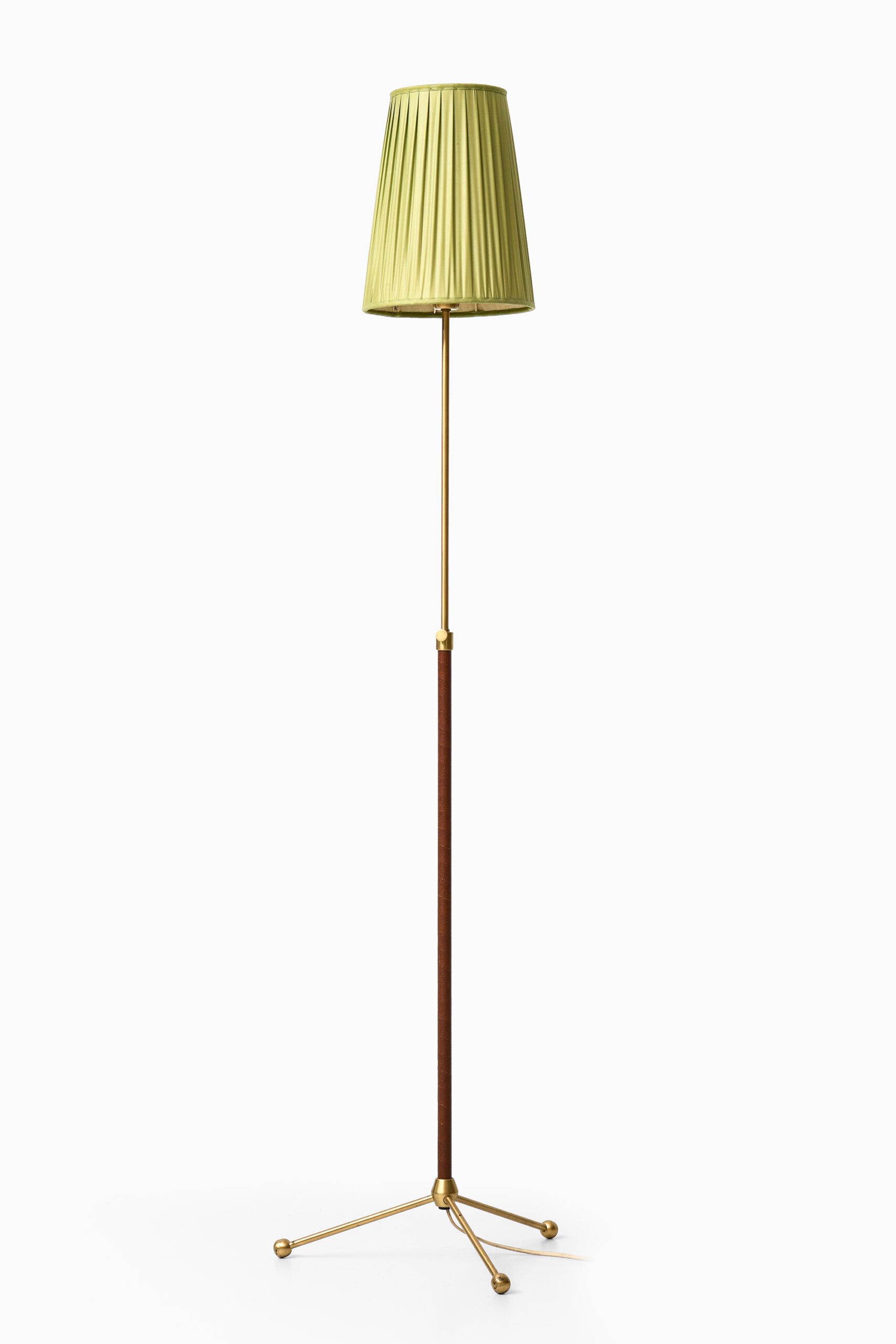 This very rare height-adjustable floor lamp, model 544, was designed by Hans Bergström and produced by Ateljé Lyktan in Åhus, Sweden, during the 1940s. The lamp is constructed from brass and leather, and retains its original pleated lampshade in chartreuse green textile, making it a notable example of early Scandinavian modern lighting that combines refined materials with functional elegance.