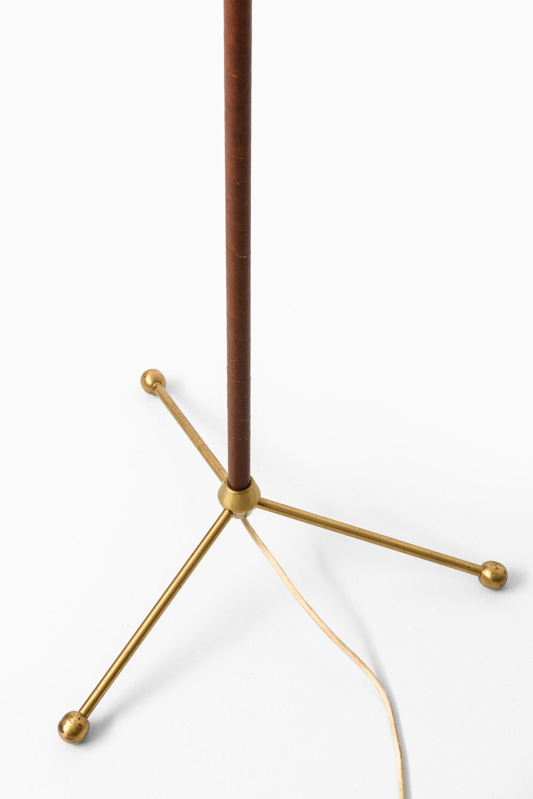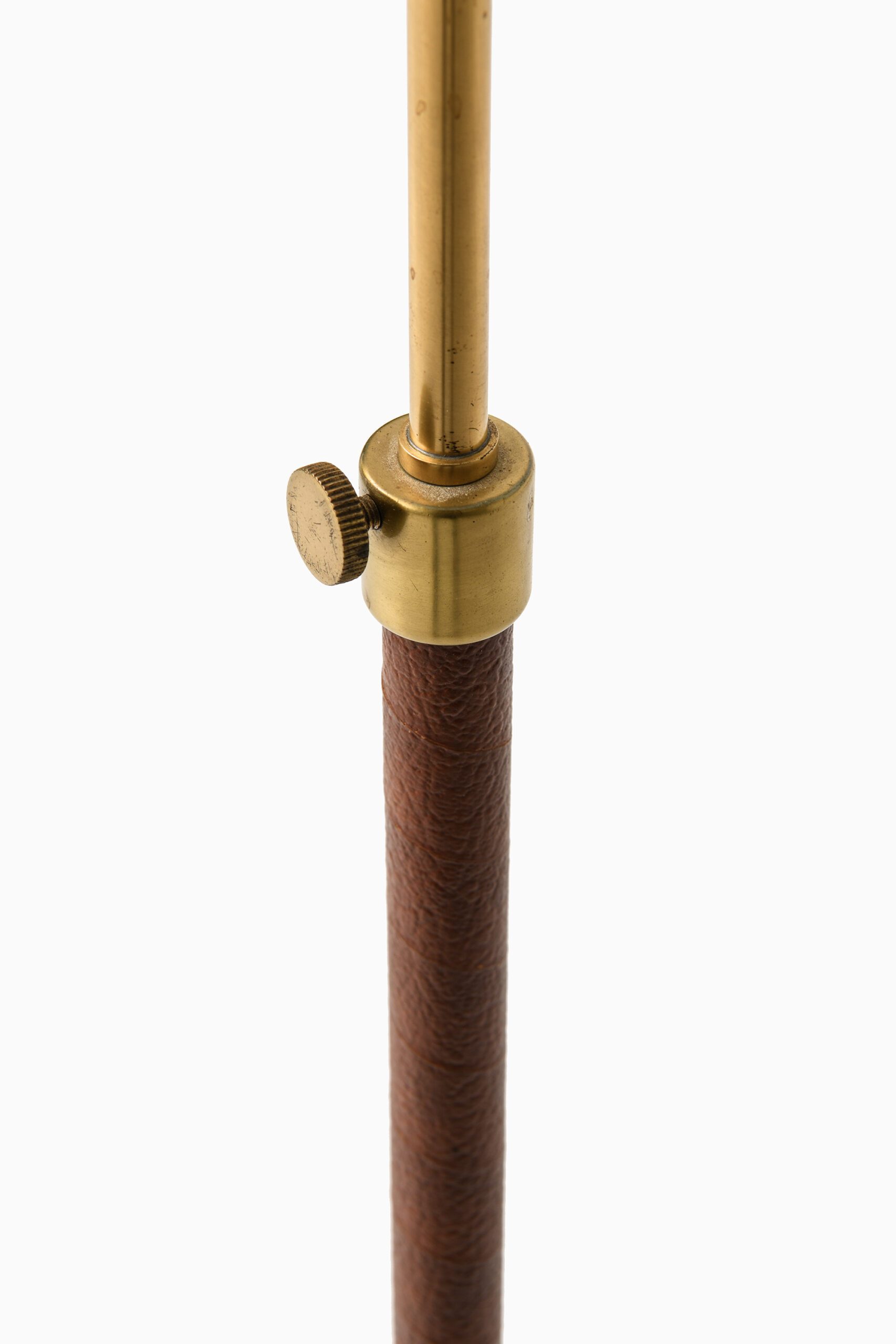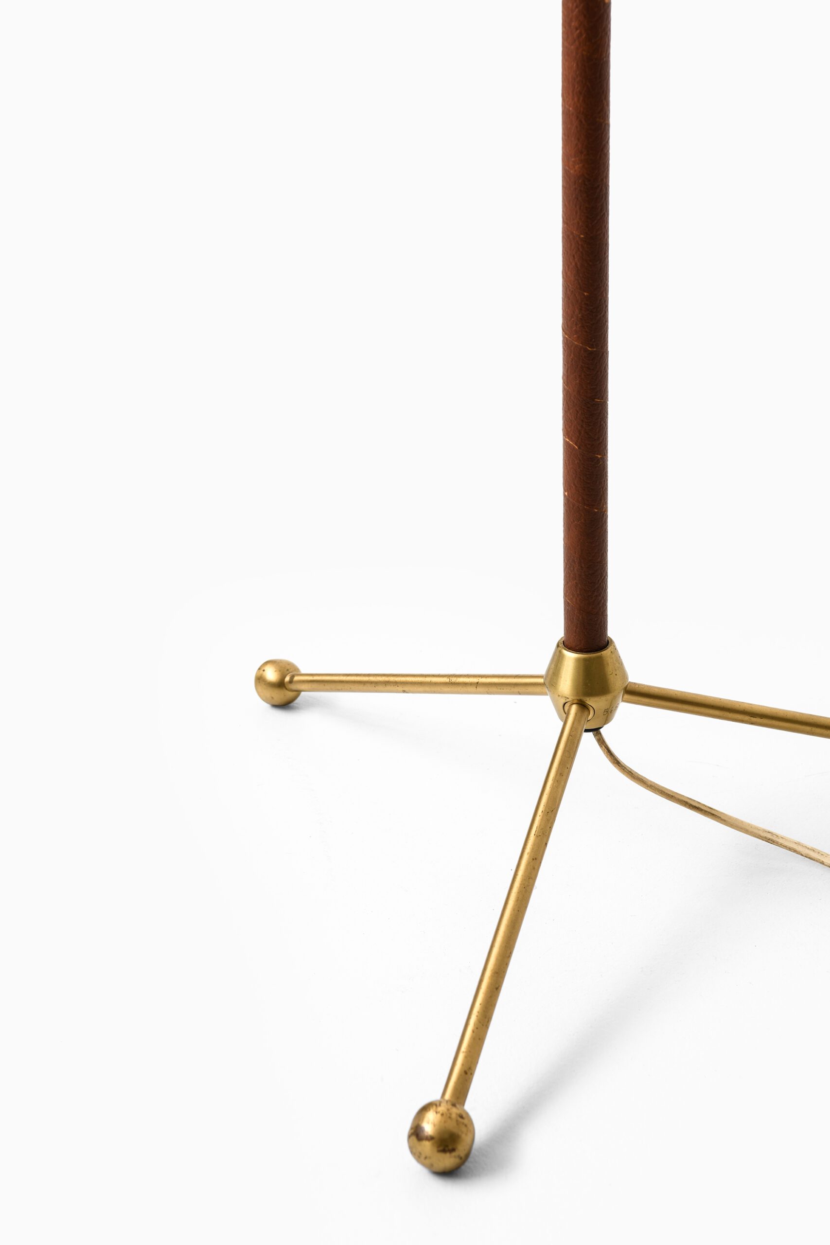 The lamp features a slender brass stem, which is telescopically adjustable in height. The lower section of the stem is wrapped in coiled brown leather, applied in a continuous spiral, providing both a tactile grip and a visual contrast to the cool, metallic finish. The base consists of three splayed brass legs, each ending in spherical feet, a design feature characteristic of Bergström’s work, which emphasizes lightness and stability in equal measure.