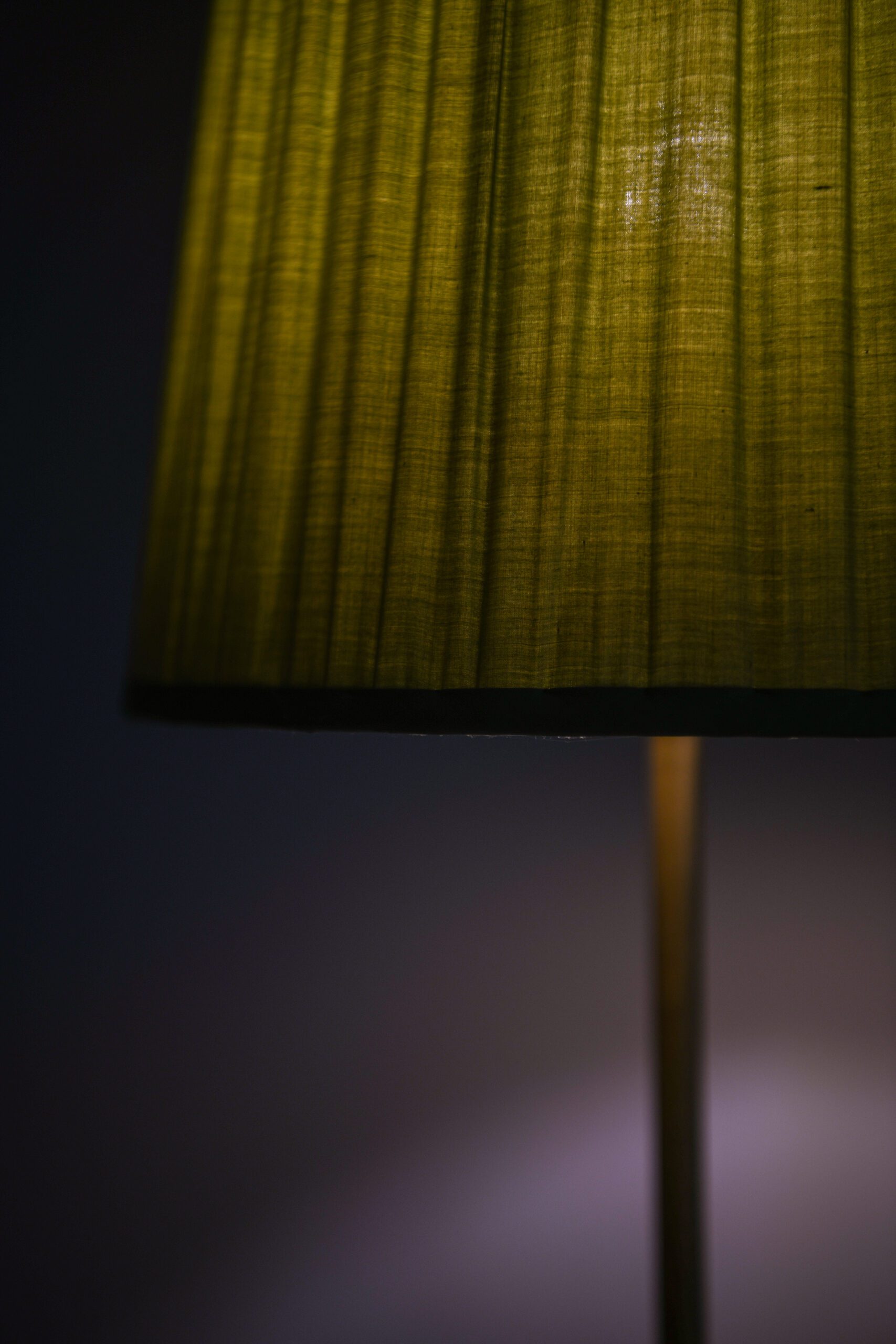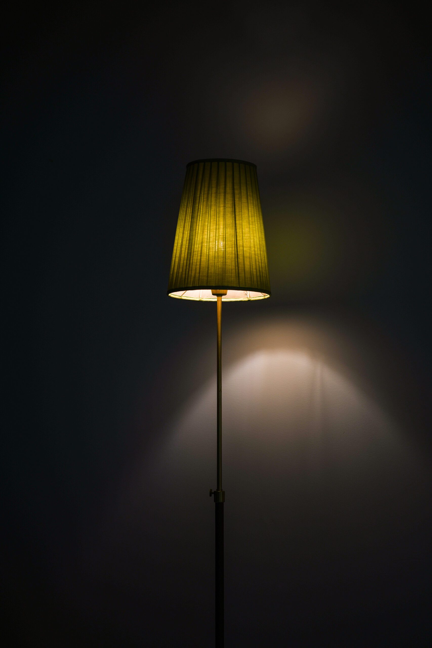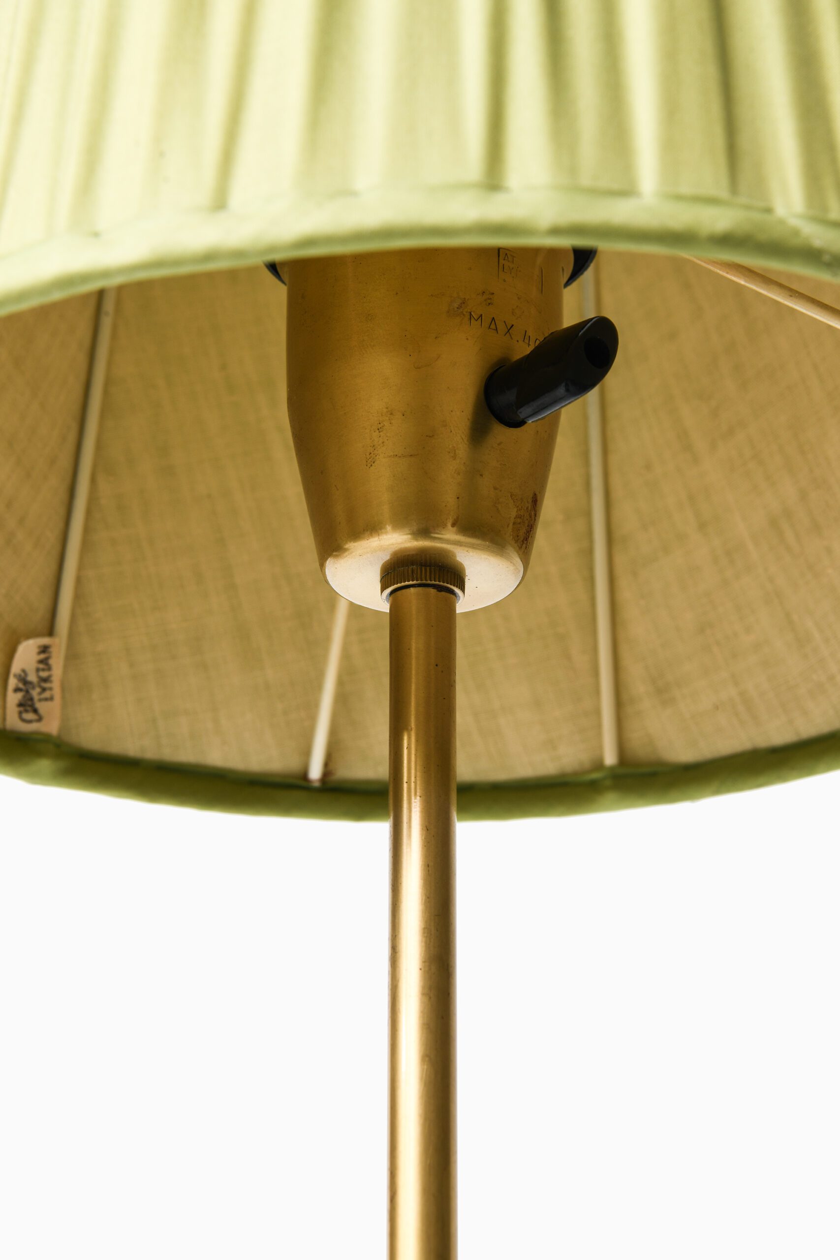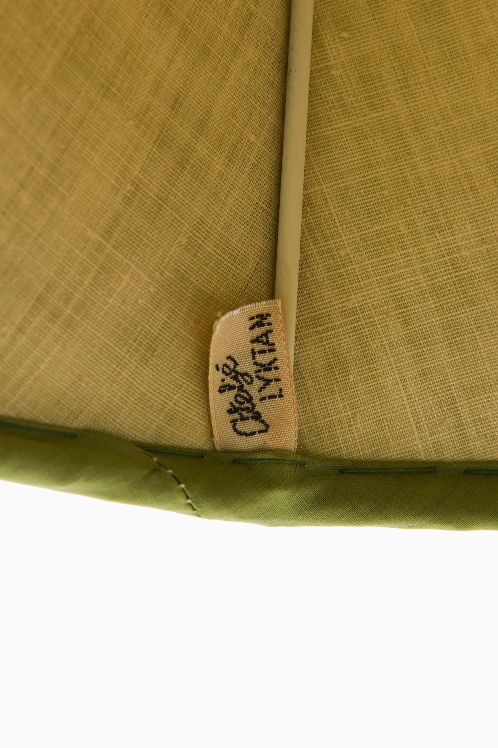 The original pleated textile shade is conical in form, slightly flared toward the base. The shade is marked with the Ateljé Lyktan label, confirming its authenticity. The color and texture of the shade contribute a distinct mid-century tonal palette, frequently explored in Swedish interior design during the era.