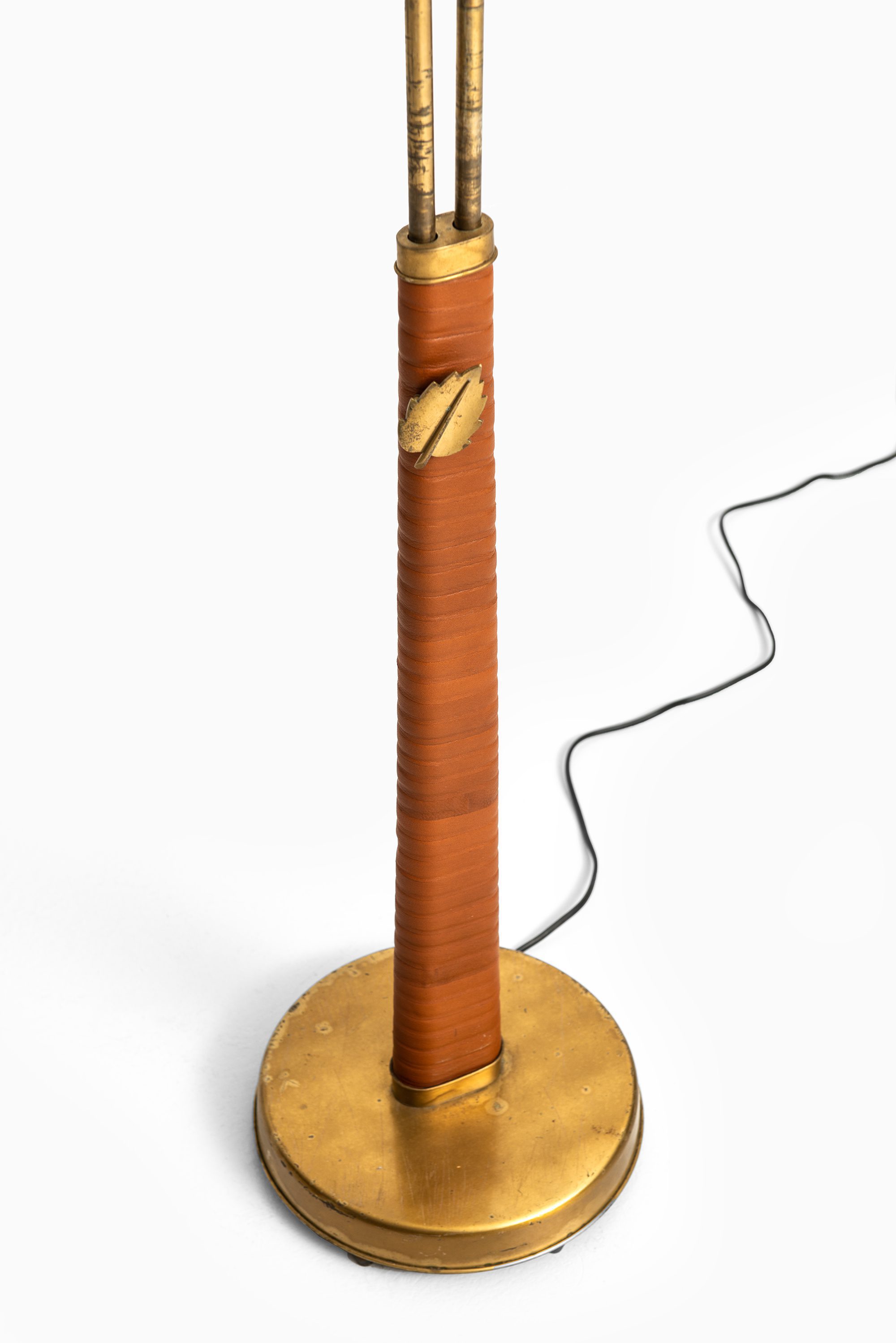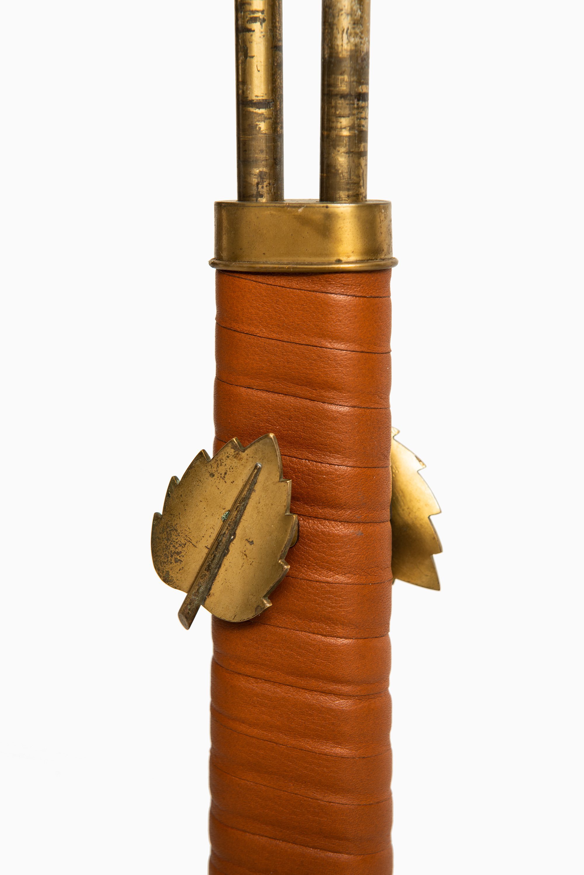 The lamp is constructed with a solid brass structure and a central stem wrapped in tan-colored leather, adding warmth and texture to the otherwise minimal form. The patina on the brass reveals the natural aging process and aligns with the vintage character of the piece. A leaf-shaped brass fitting on the leather-wrapped column serves as a decorative and structural detail, marking the transition from base to stem with subtle elegance.