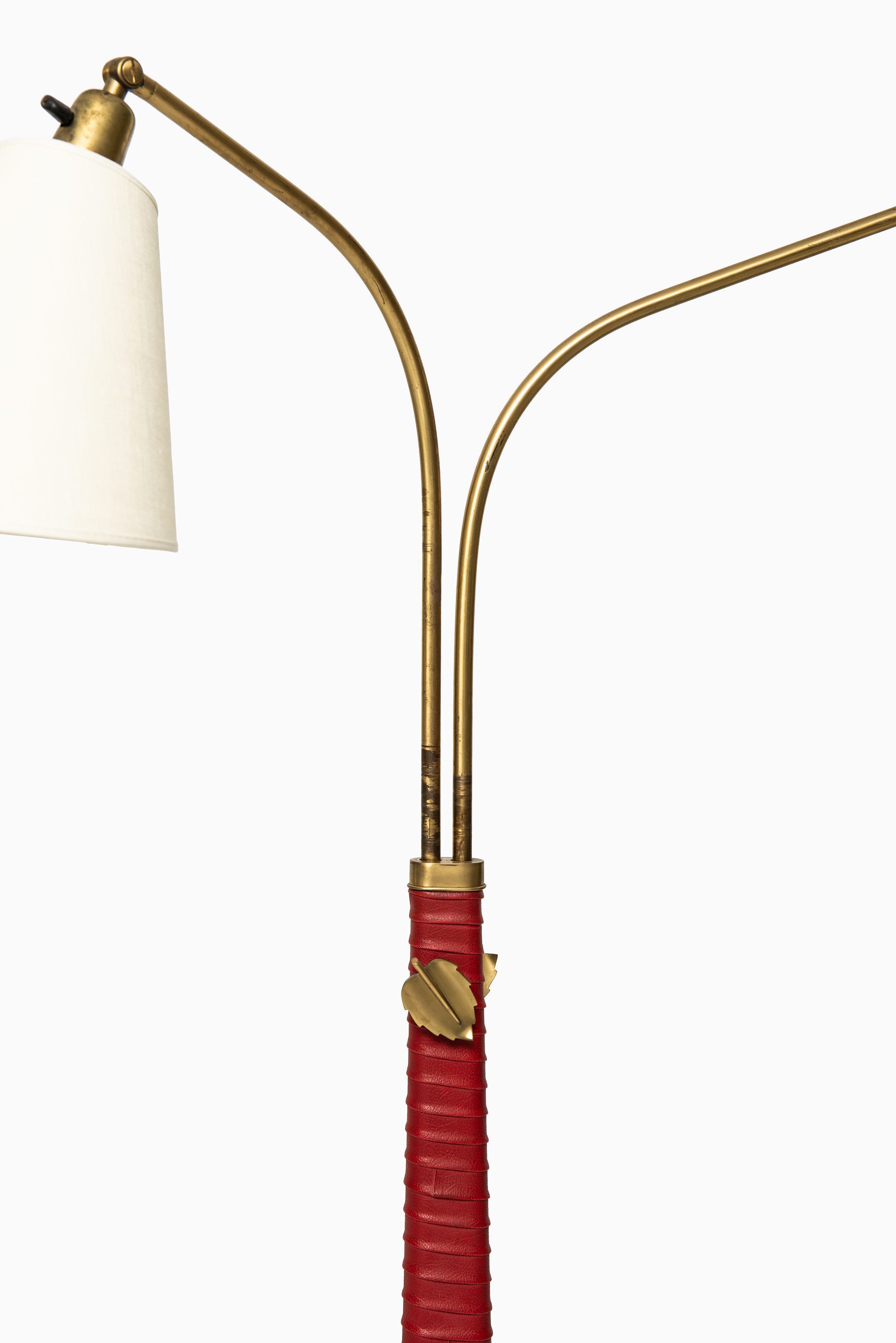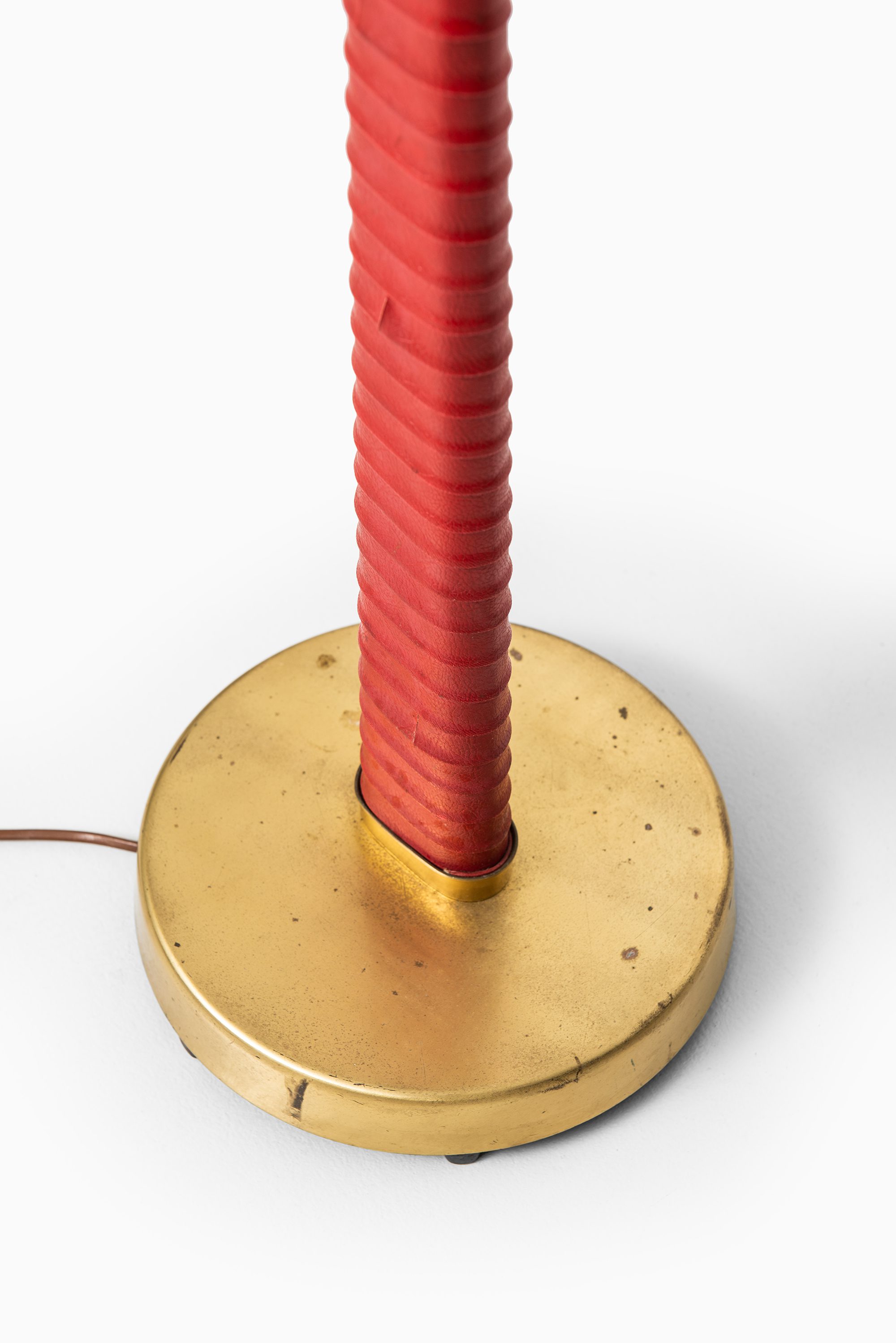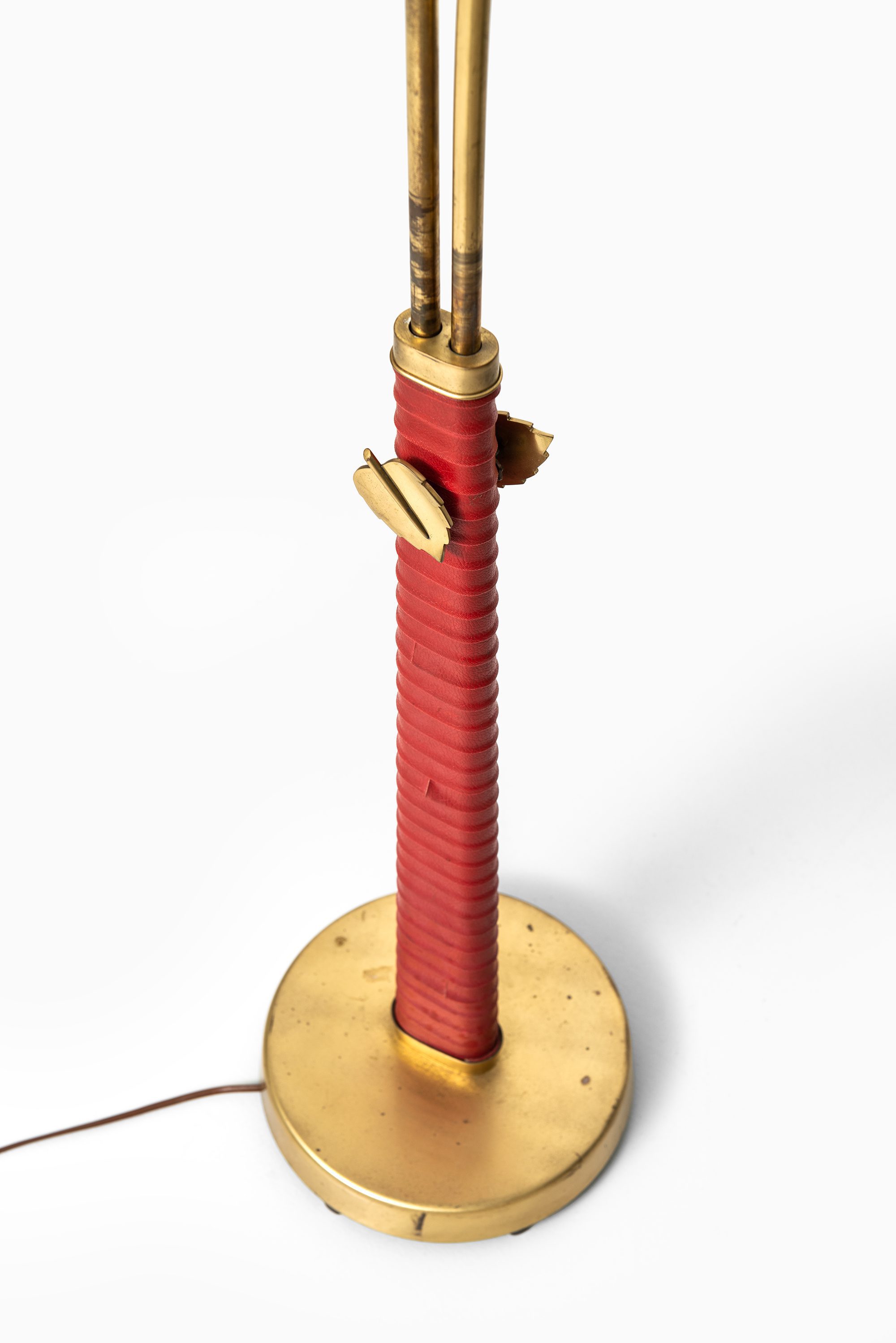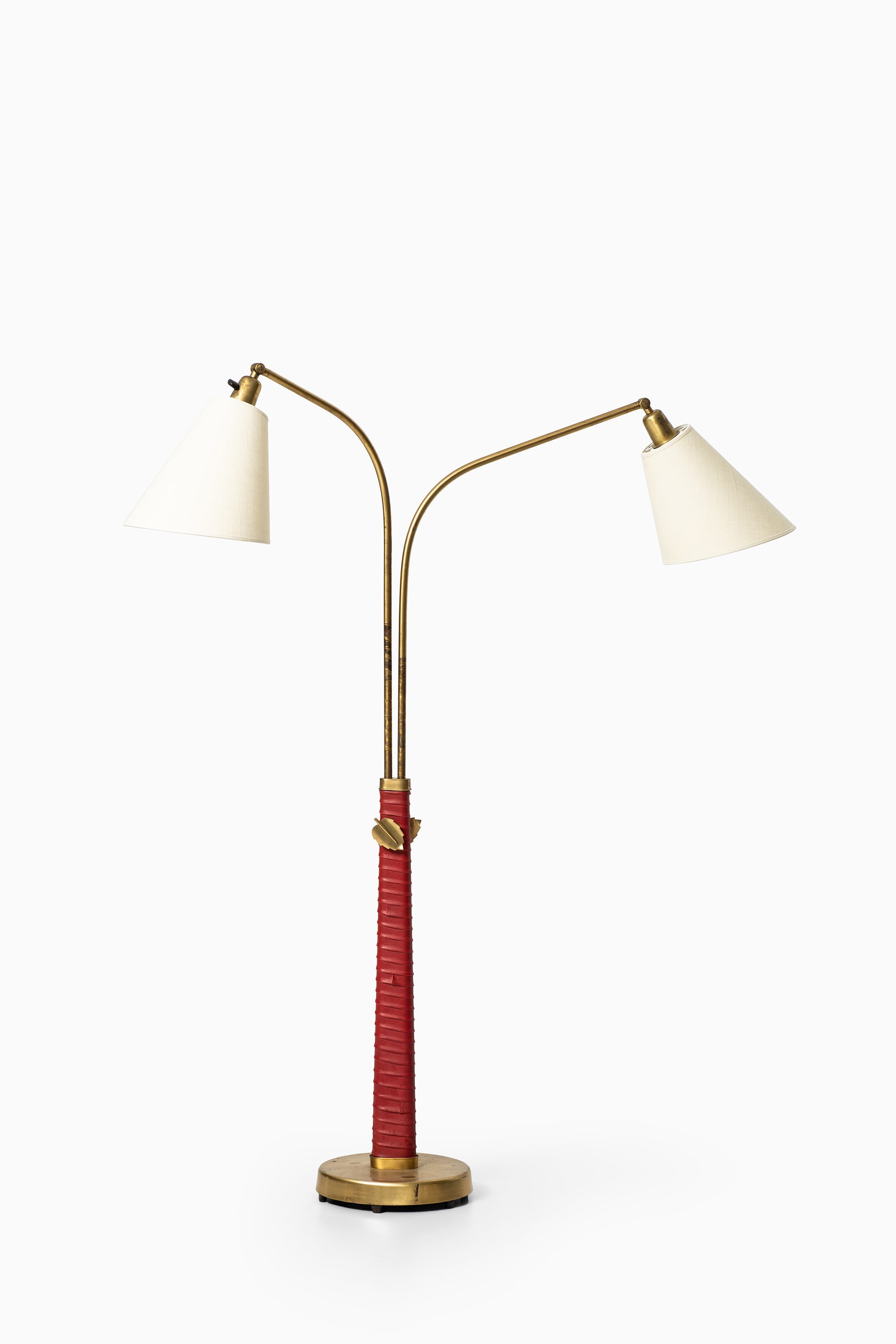 The structure is executed in brass, complemented by a wrapped leather detail on the central stem. The base is circular and weighted for stability, while the upright shaft divides into two adjustable arms, each supporting a conical shade. This dual-arm configuration reflects Bergström’s interest in flexible lighting solutions suited for reading, interiors, and working environments. The leather wrap, in a bold red tone, adds a tactile and decorative quality while also referencing the artisanal craftsmanship of Scandinavian design from the period. Brass details, including leaf-shaped adjustment knobs, provide both utility and a subtle decorative flourish.