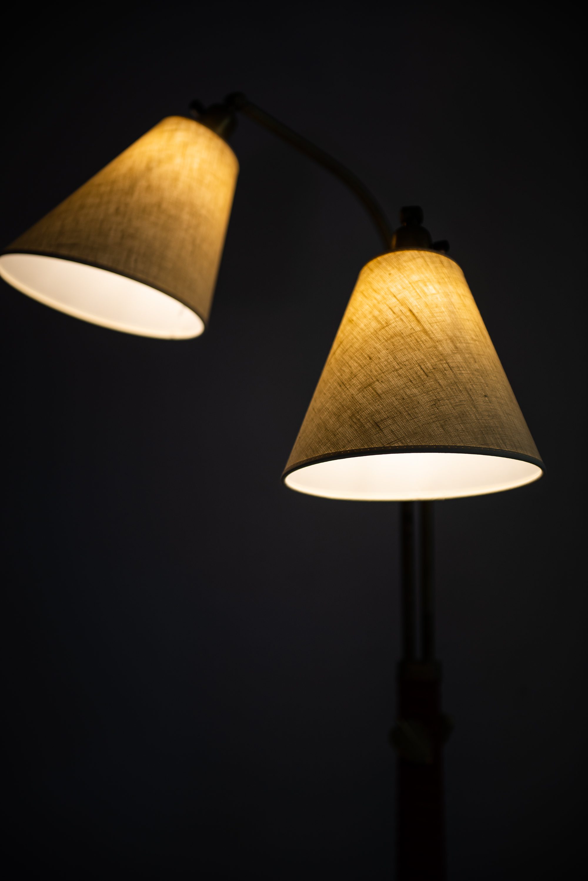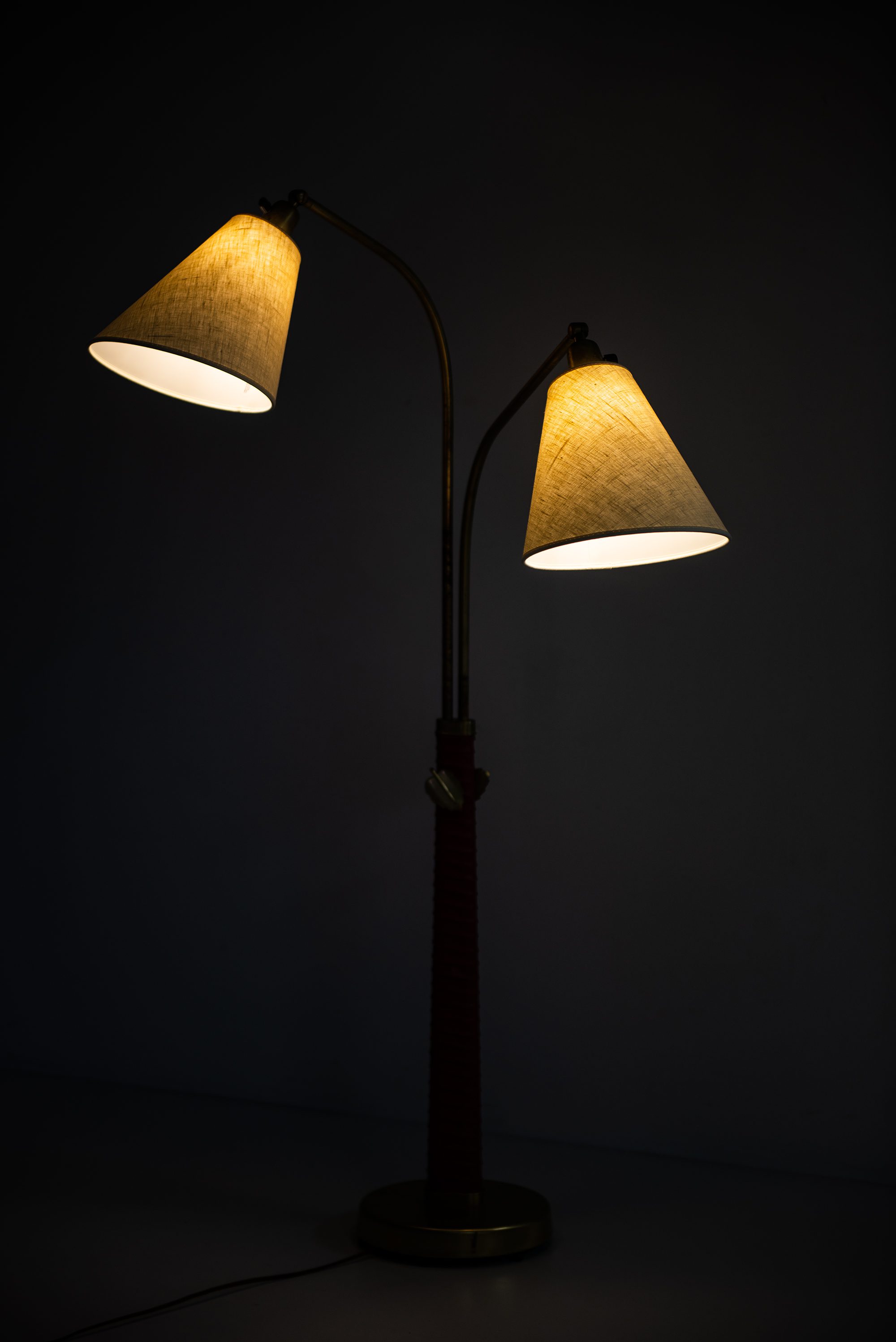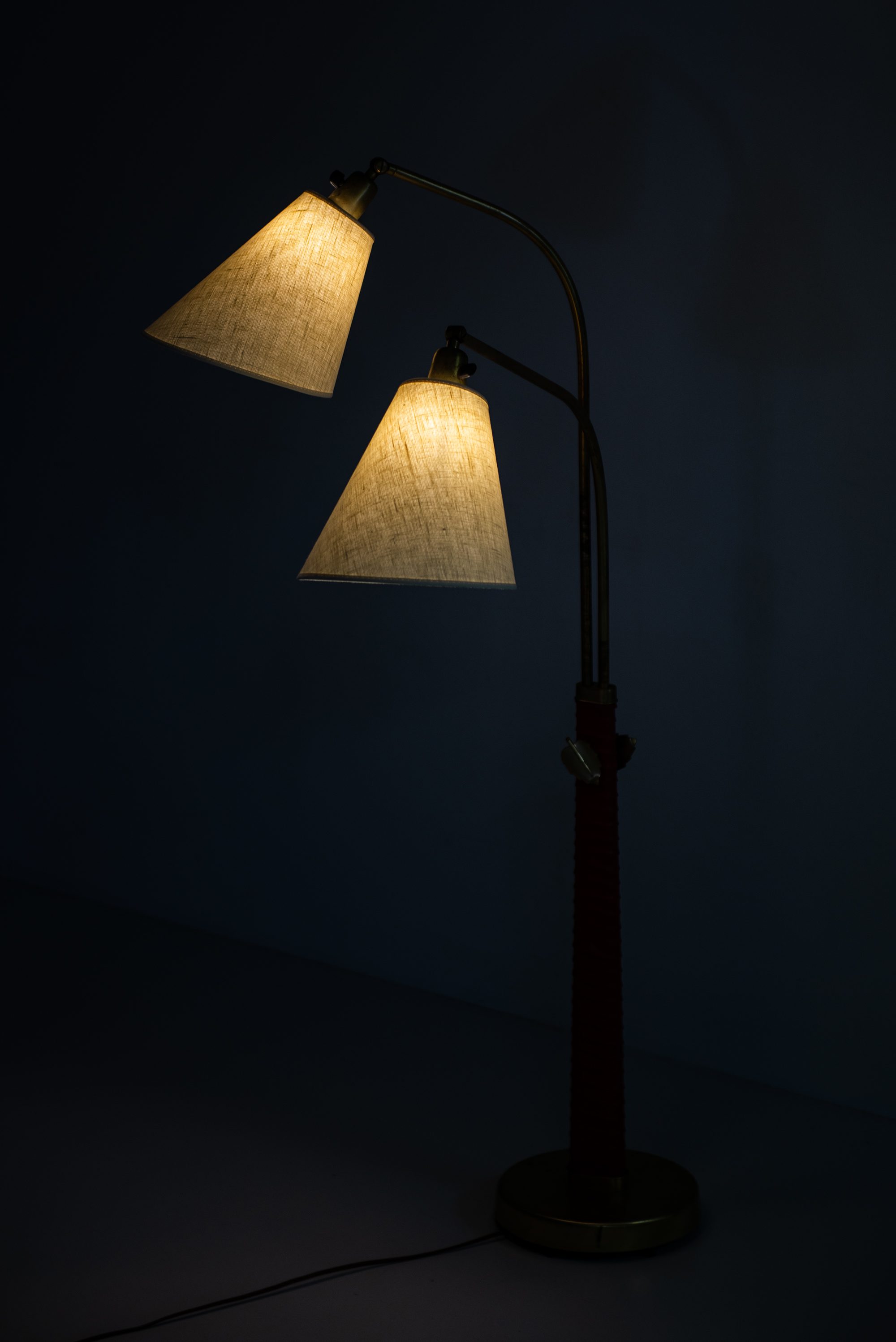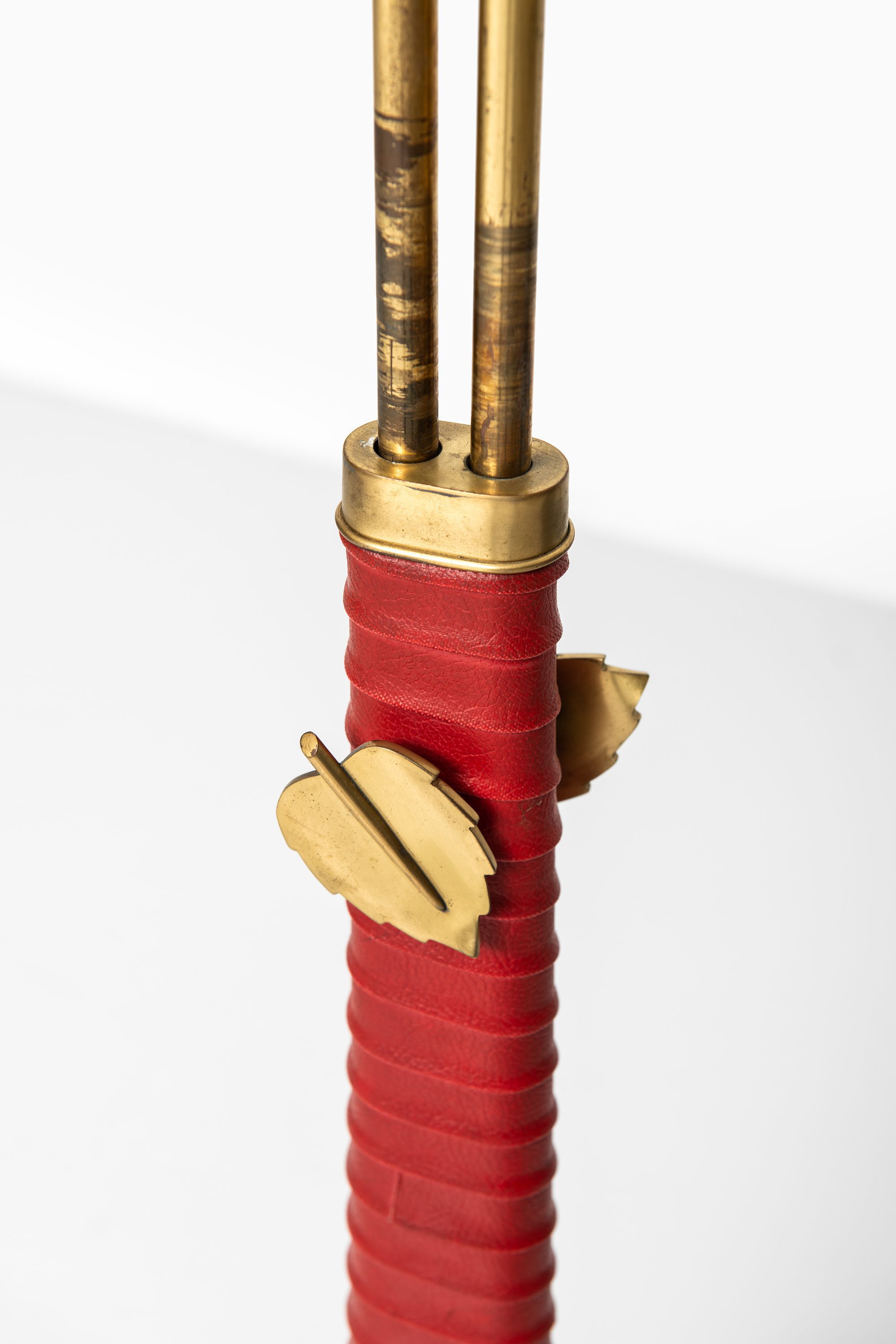 The structure is executed in brass, complemented by a wrapped leather detail on the central stem. The base is circular and weighted for stability, while the upright shaft divides into two adjustable arms, each supporting a conical shade. This dual-arm configuration reflects Bergström’s interest in flexible lighting solutions suited for reading, interiors, and working environments. The leather wrap, in a bold red tone, adds a tactile and decorative quality while also referencing the artisanal craftsmanship of Scandinavian design from the period. Brass details, including leaf-shaped adjustment knobs, provide both utility and a subtle decorative flourish.