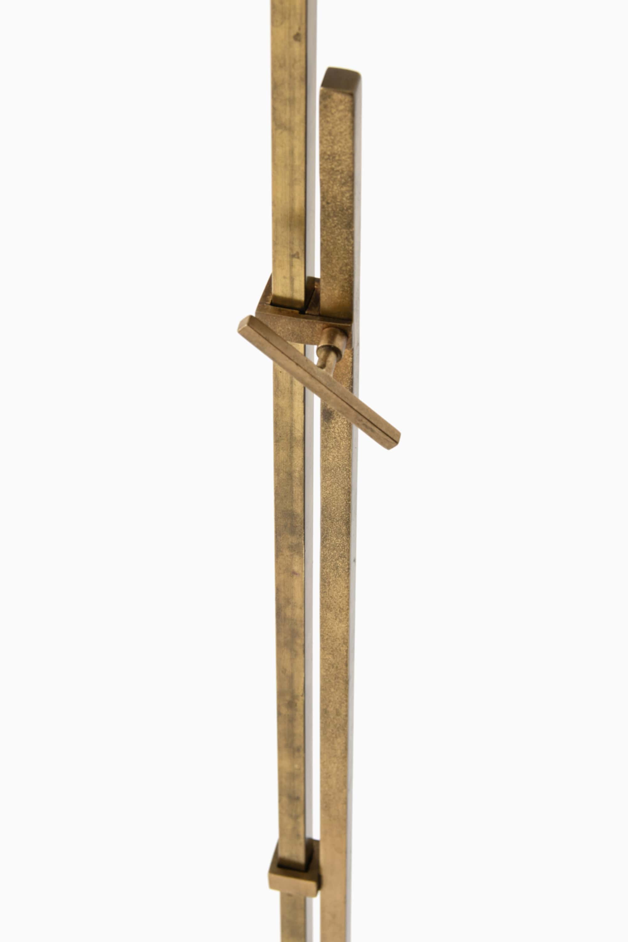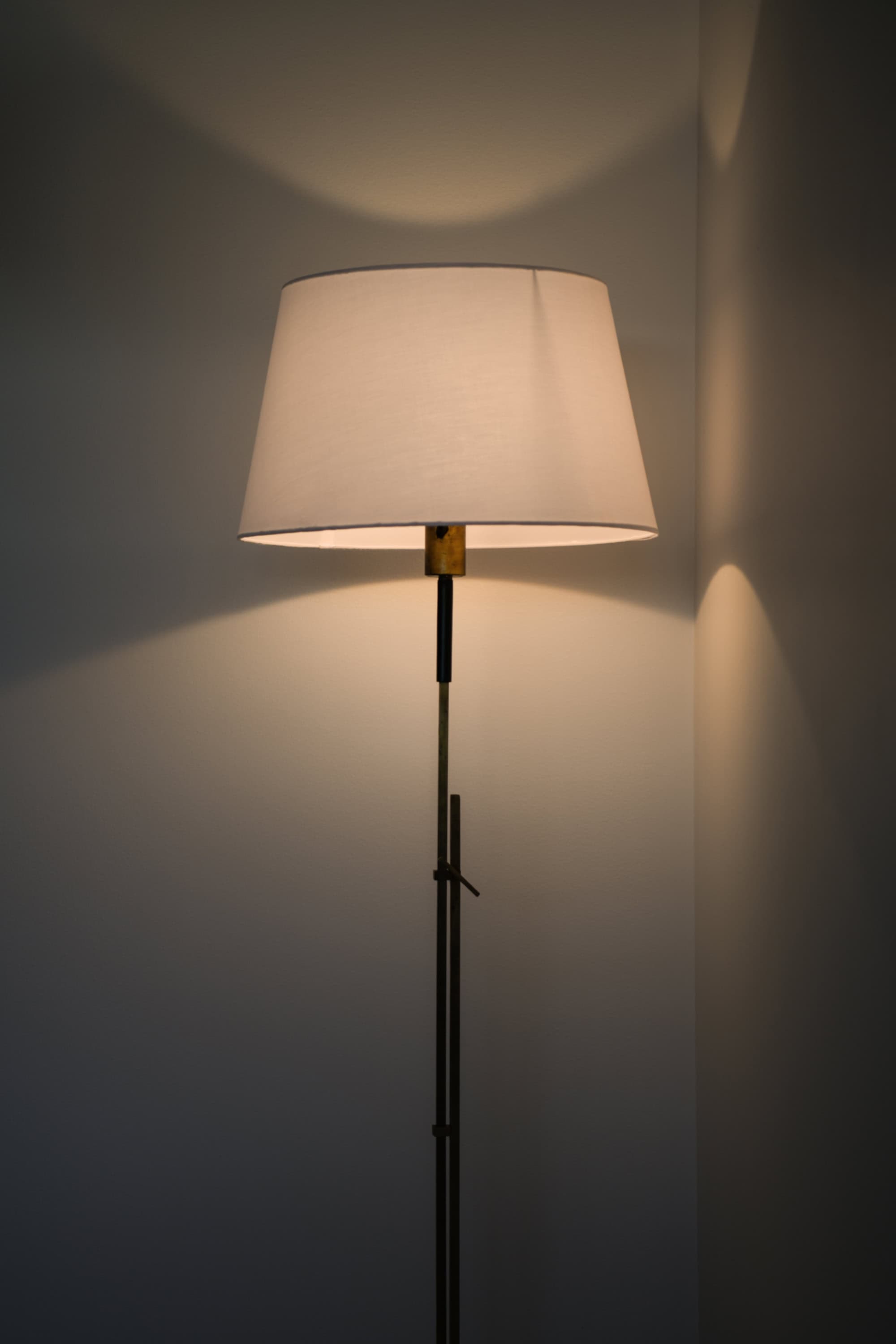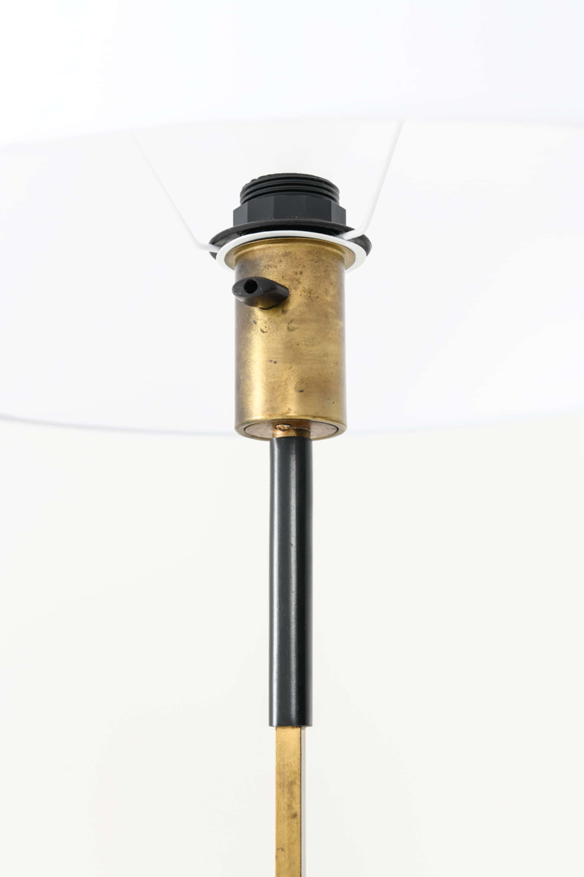 This rare height-adjustable floor lamp was designed by Hans Eichenberger and produced by Lilux in Sweden during the 1960s. The lamp is constructed in solid brass with a black leather detail on the stem, exhibiting the characteristic precision and restraint of Eichenberger’s work. The brass structure consists of two square-section rods, one sliding within the other, allowing the height to be adjusted through a simple lever mechanism. Its clean geometry is complemented by a new white fabric lampshade that provides a soft, diffused light.