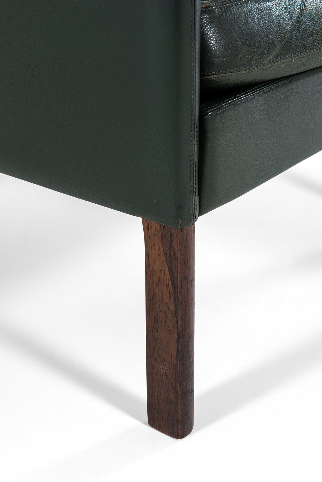 The chairs are constructed with frames in rosewood, showing a deep brown tone with visible grain variation. The upholstery is original green leather, presenting a dark, muted green color with a natural surface sheen. The leather is smoothly stretched over the seat, backrest, and armrests, forming a compact and well-defined silhouette. The chairs have a low, slightly reclined back and straight armrests that integrate visually with the boxy upholstered body, while the slender rosewood legs provide a lighter visual base.