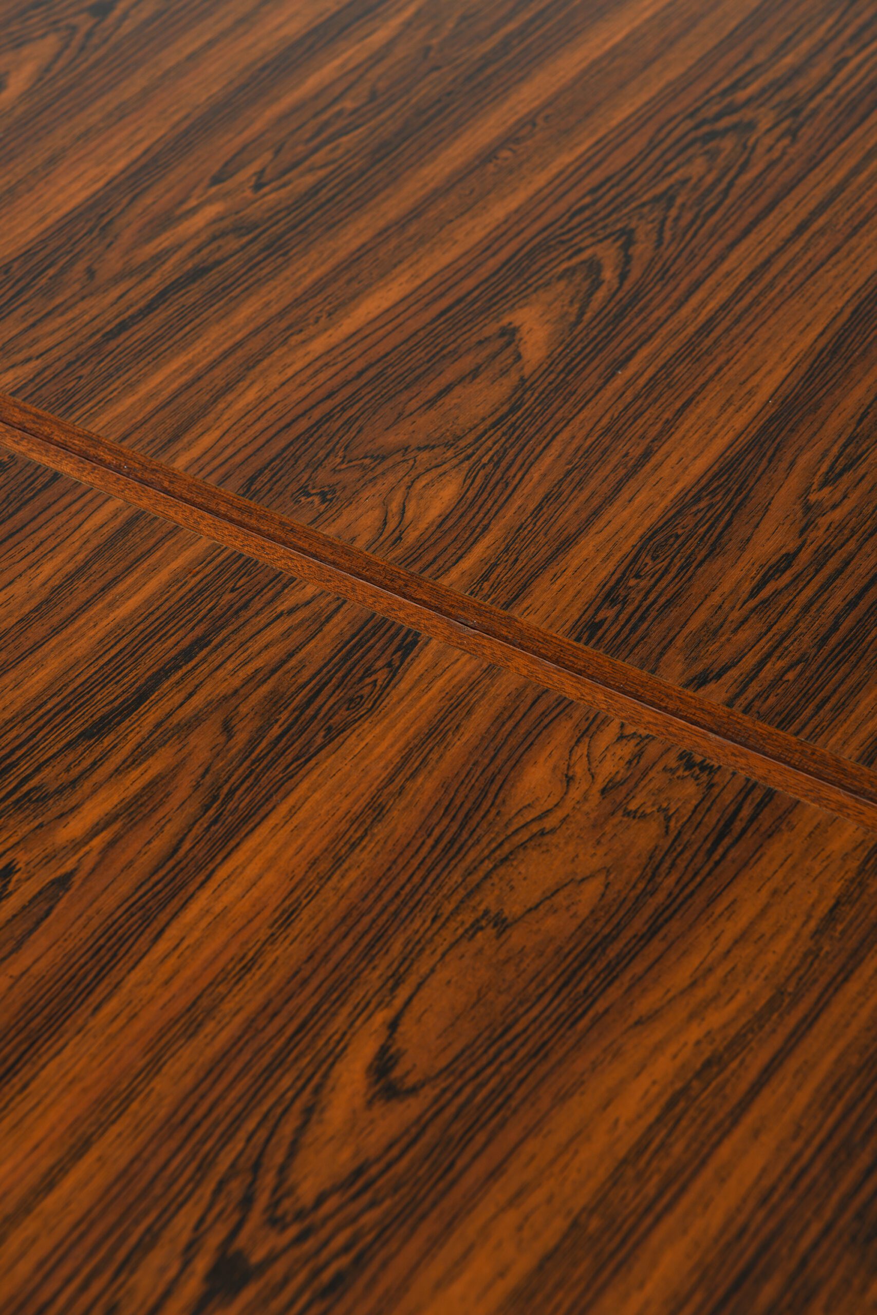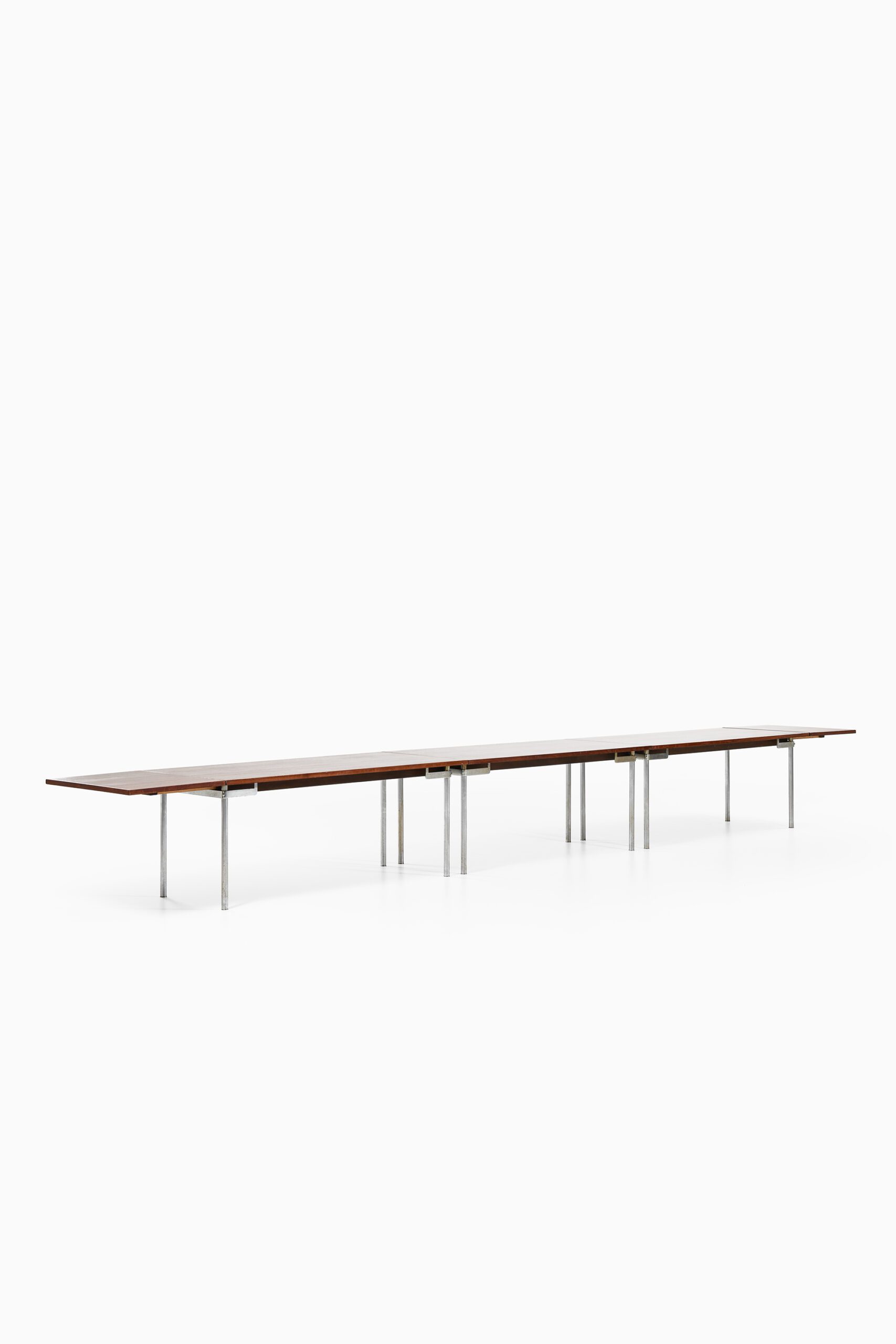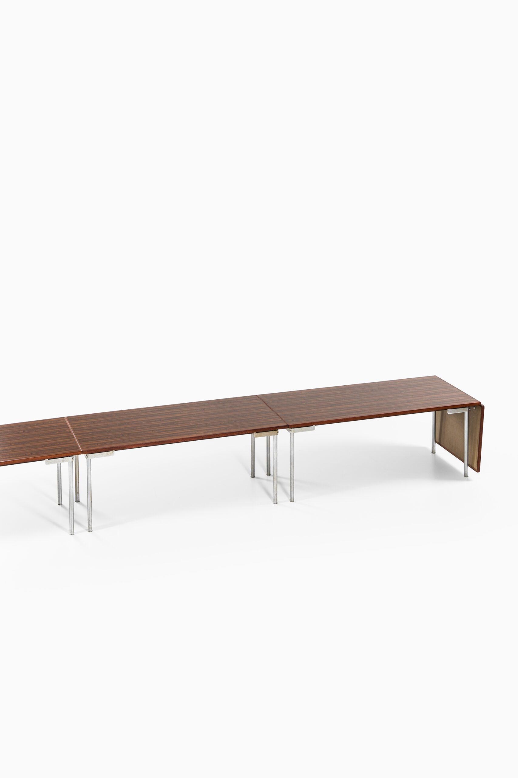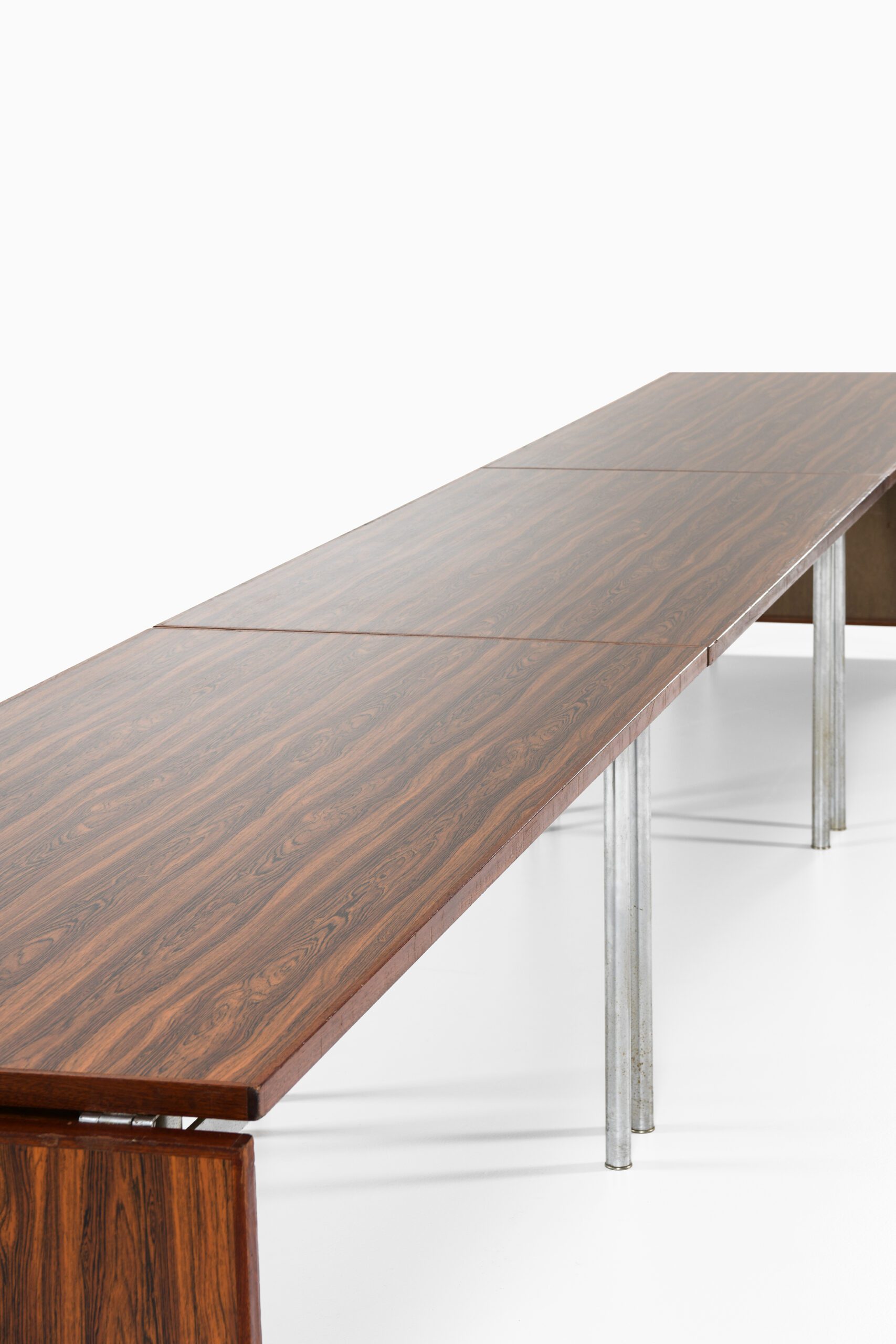 This unique and exceptionally long dining or conference table was designed by Hans J. Wegner and produced by Andreas Tuck in Denmark during the 1960s. Comprised of three modular tables joined to form a single expansive surface, the table measures an impressive 650 cm in length, making it a rare example of large-format Scandinavian modernist furniture. The tabletop is finished with bookmatched rosewood veneer, showcasing the rich reddish-brown hues and black streaks characteristic of high-quality Rio rosewood. The surface has a soft satin sheen that highlights the wood’s natural grain patterns. Multiple modular sections are precisely joined and supported by evenly spaced square-profiled chromed steel legs, providing both visual lightness and structural stability. Drop-leaf extensions on each end allow for flexible adjustment of the table’s length to suit different settings.