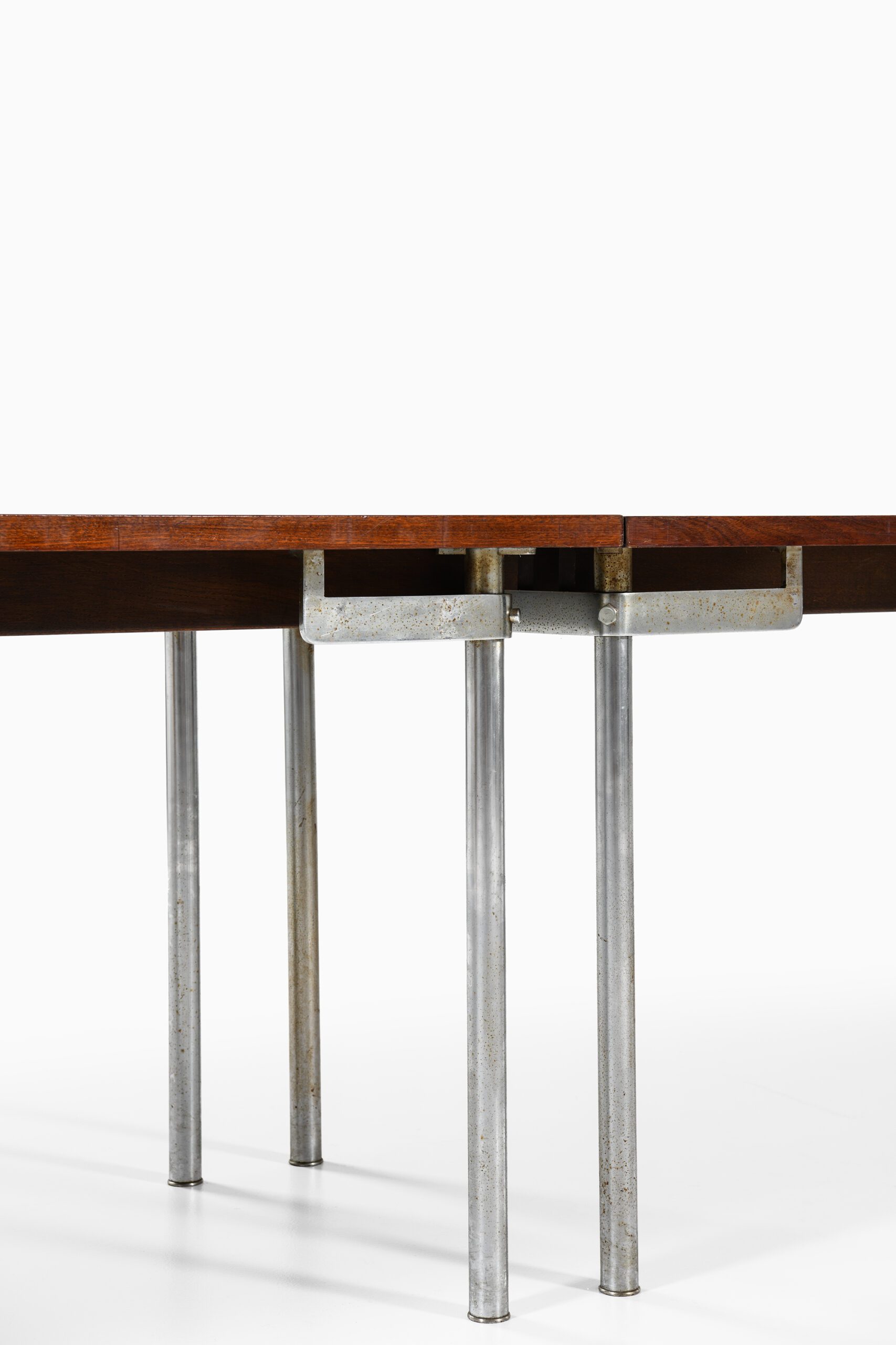 The table remains in very good vintage condition. The rosewood veneer shows minor wear consistent with age and use, while the chromed steel legs retain their original finish with minimal oxidation. The modular construction allows for disassembly and transport, and despite its extraordinary length, the proportions remain harmonious and balanced.