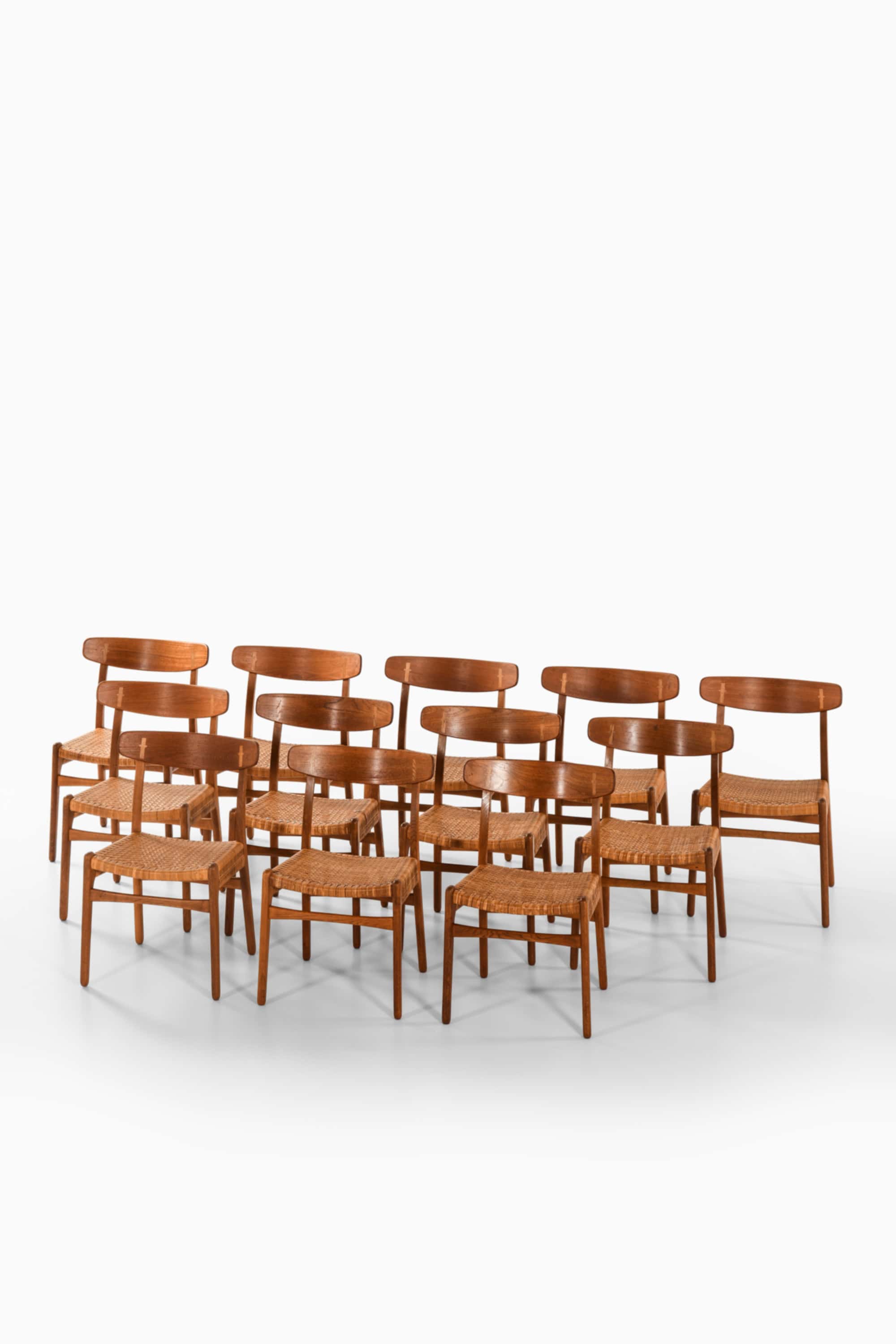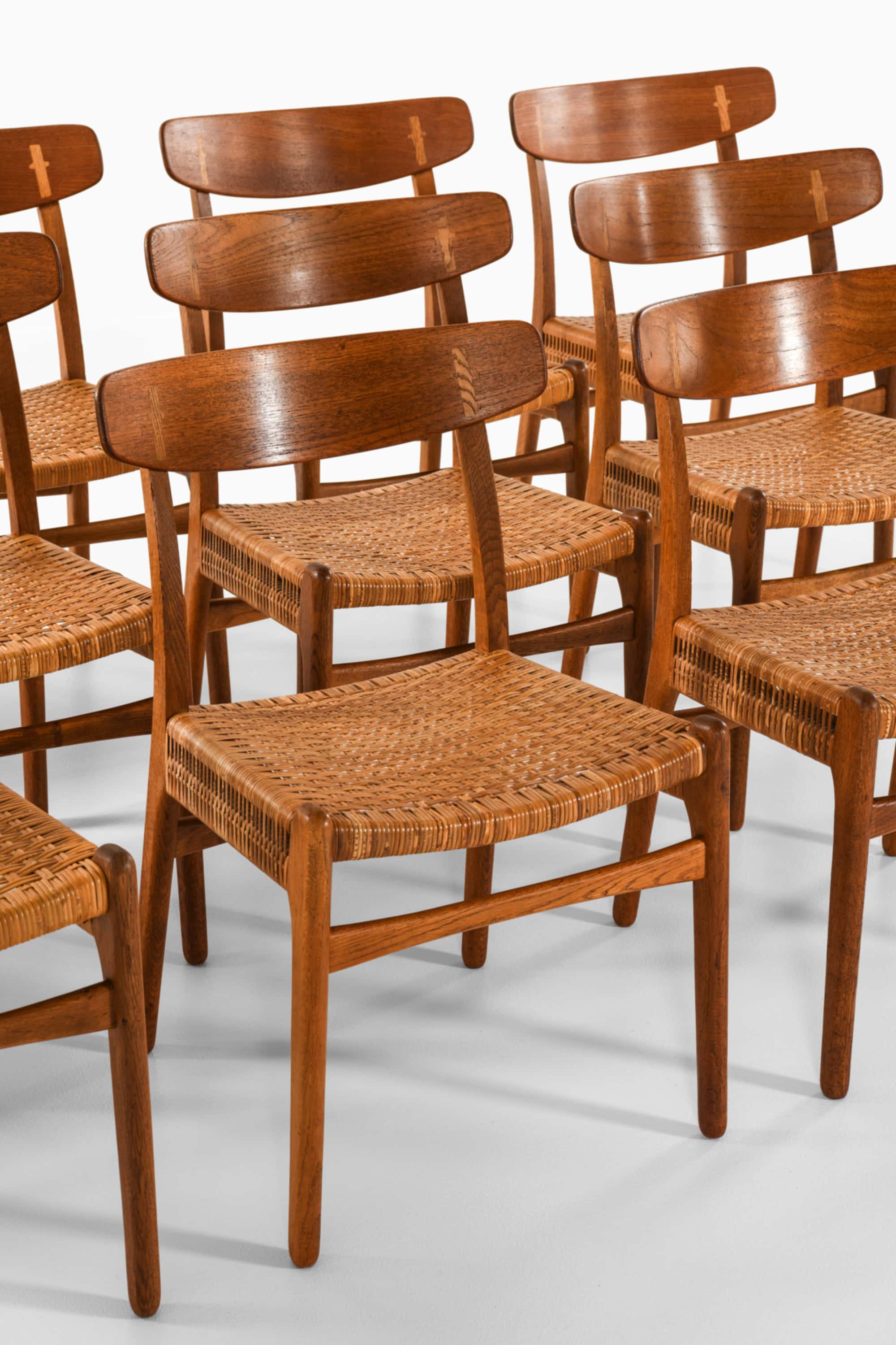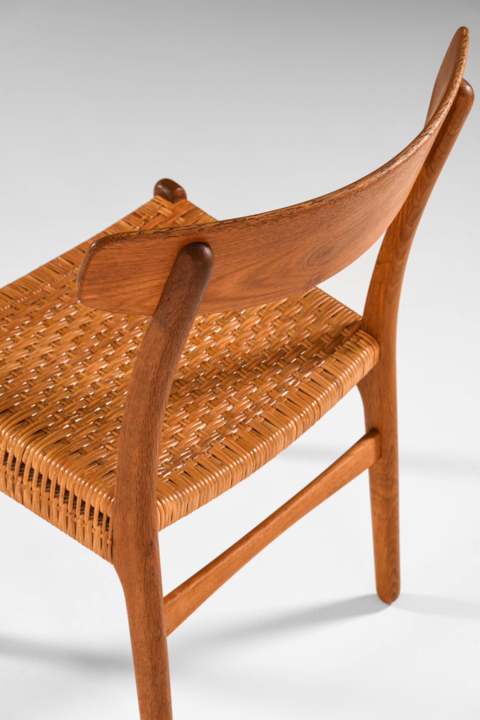 This is a set of twelve dining chairs, model CH-23, designed by Hans J. Wegner in 1950 and produced by Carl Hansen & Søn in Denmark. The chairs are crafted in solid oak and teak with woven cane seats. The combination of the two wood species emphasizes Wegner’s understanding of material contrast, where the structural frame in oak meets the darker teak backrest in a balanced and tactile composition.