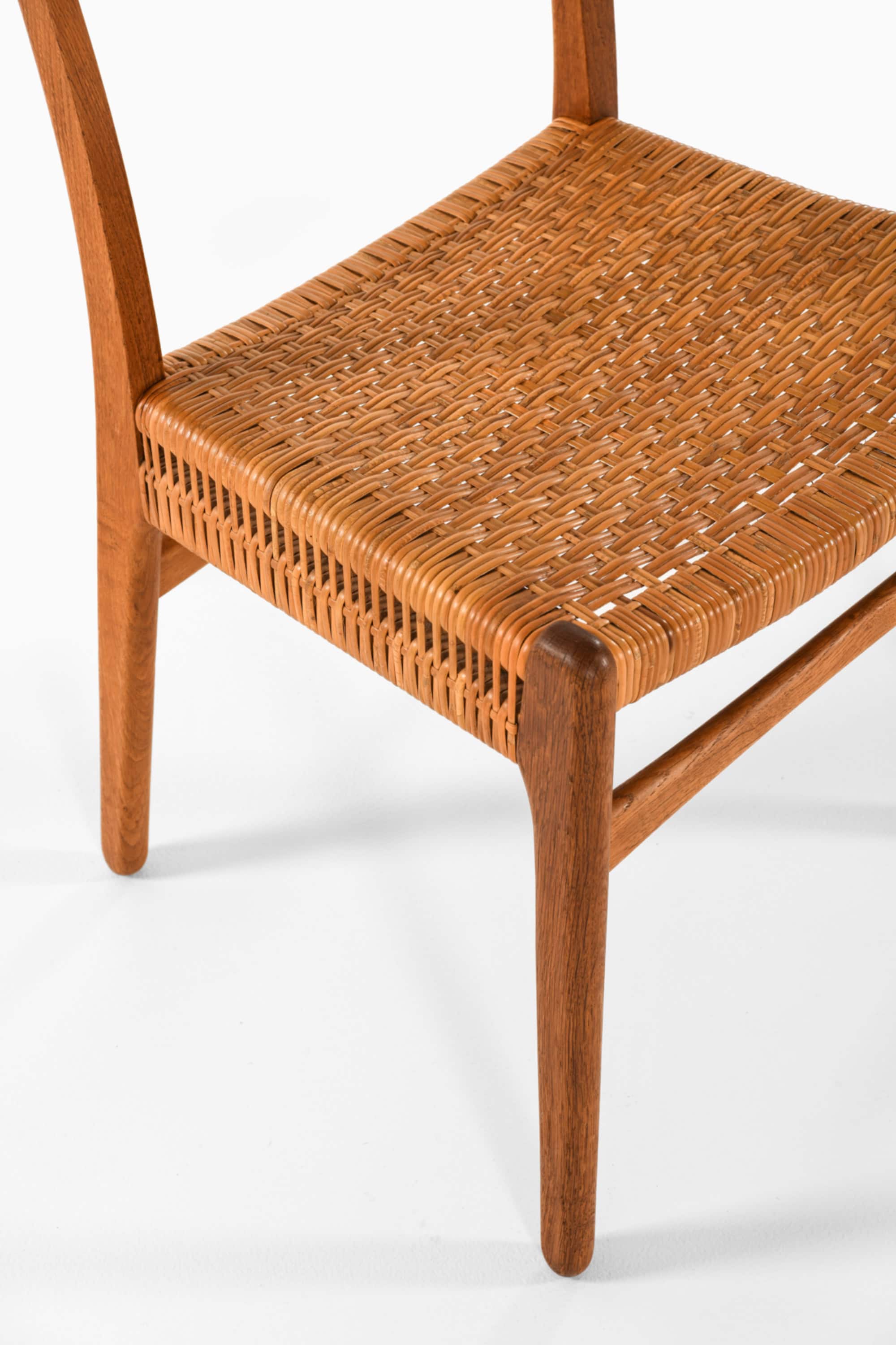 Each chair displays Wegner’s characteristic craftsmanship, most notably in the finger-jointed connections at the ends of the curved teak backrests. The handwoven cane seats are executed in a traditional Danish pattern that enhances the organic quality of the design while providing both strength and flexibility. Some sections of the cane have been replaced and repaired, consistent with careful preservation of the original structure and technique. The surfaces present a warm, even patina, with signs of age and use appropriate for their vintage condition.