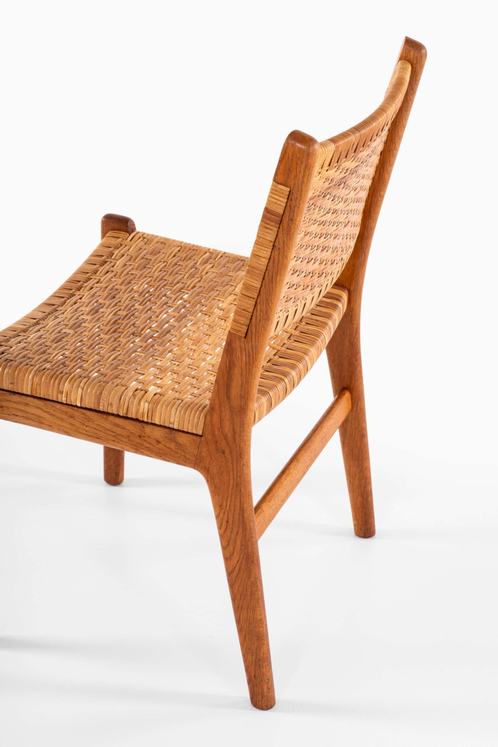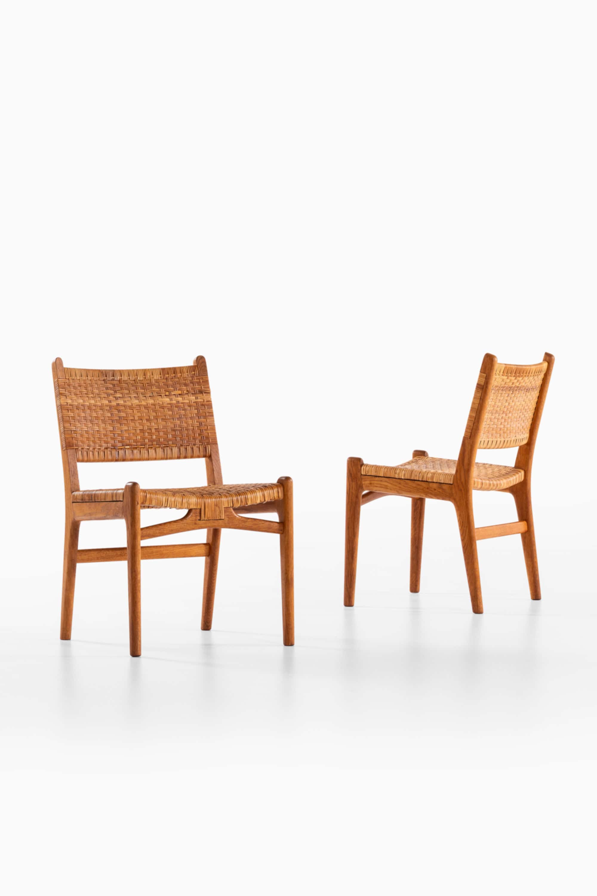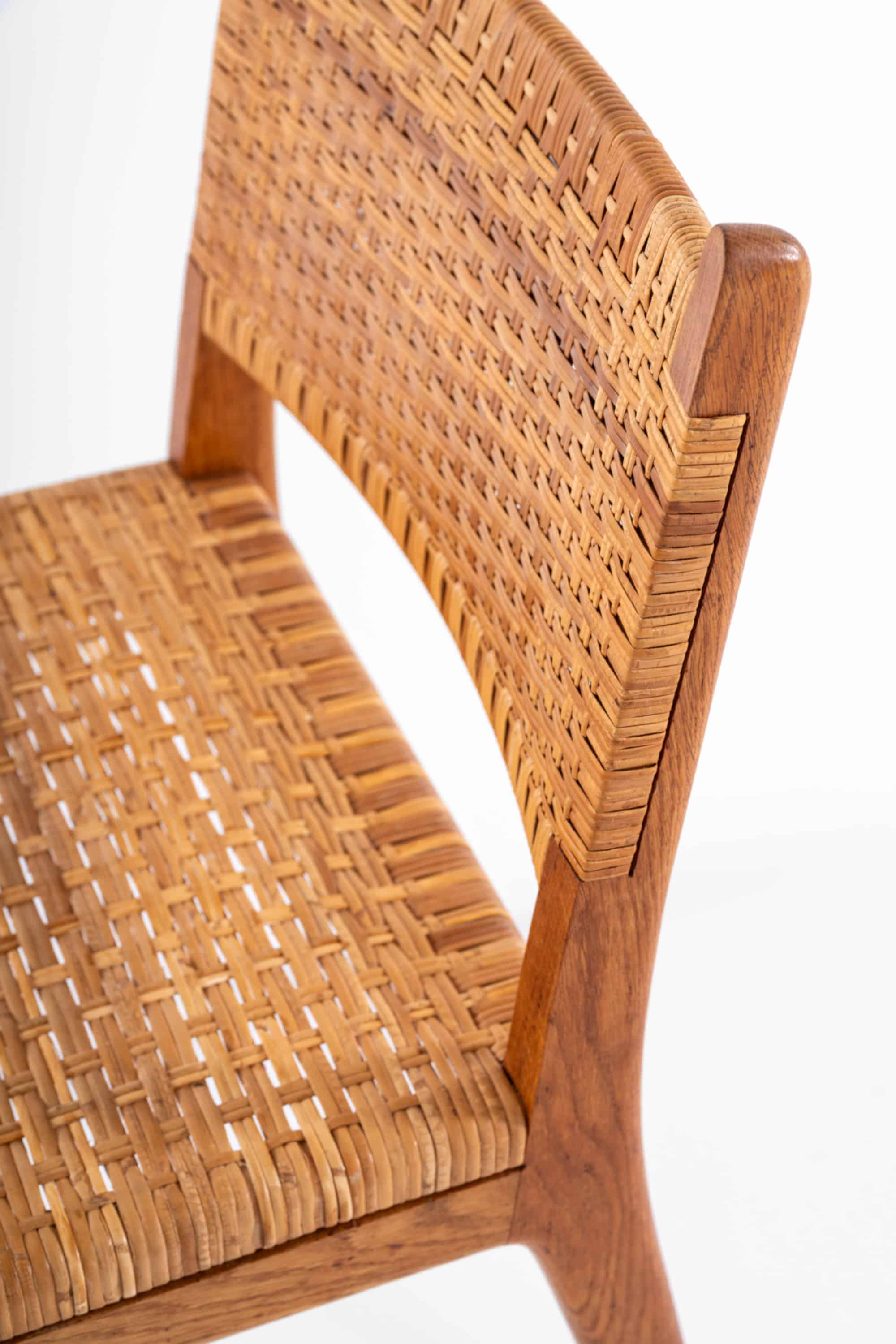 The seats and backrests are executed in handwoven cane, arranged in a tight, uniform pattern that provides both flexibility and support. The backrest is slightly curved, offering a gentle ergonomic contour, while the seat has a modest concave shaping that enhances comfort. The woven surfaces introduce a tactile contrast to the smooth oak frame and create a visually dynamic interplay of texture and light.