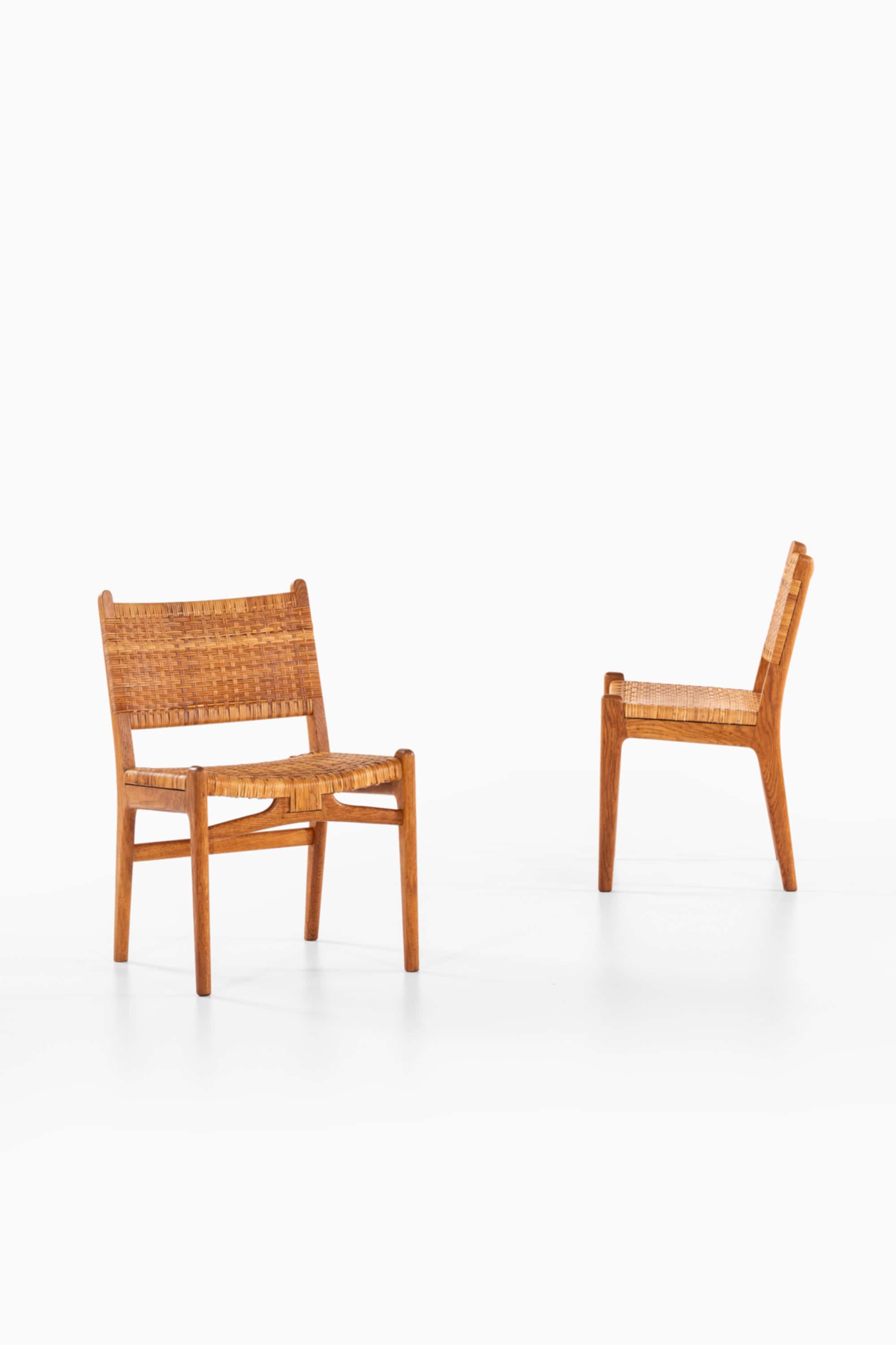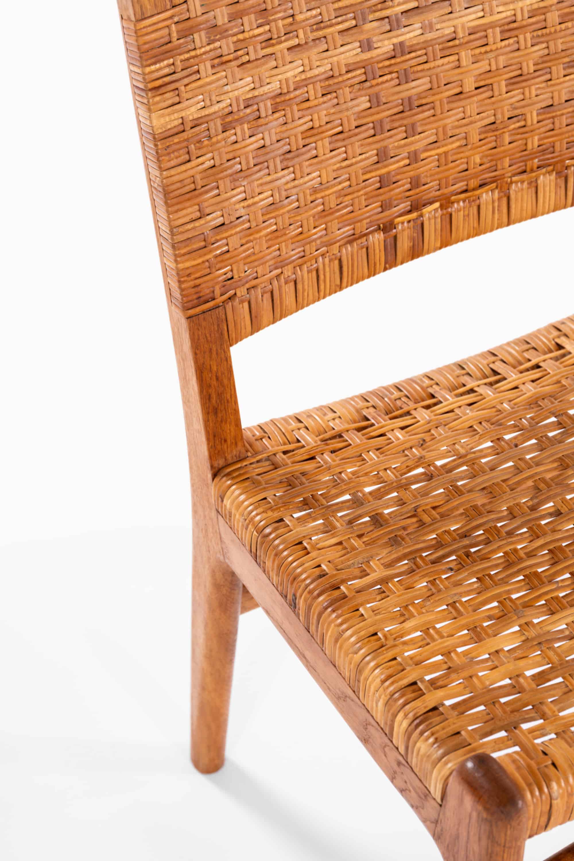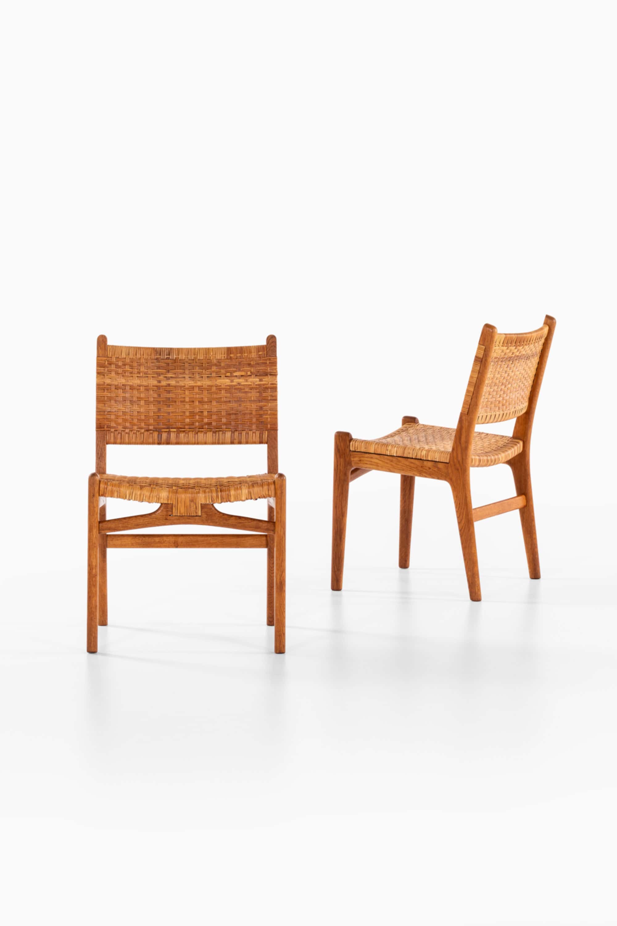 The seats and backrests are executed in handwoven cane, arranged in a tight, uniform pattern that provides both flexibility and support. The backrest is slightly curved, offering a gentle ergonomic contour, while the seat has a modest concave shaping that enhances comfort. The woven surfaces introduce a tactile contrast to the smooth oak frame and create a visually dynamic interplay of texture and light.