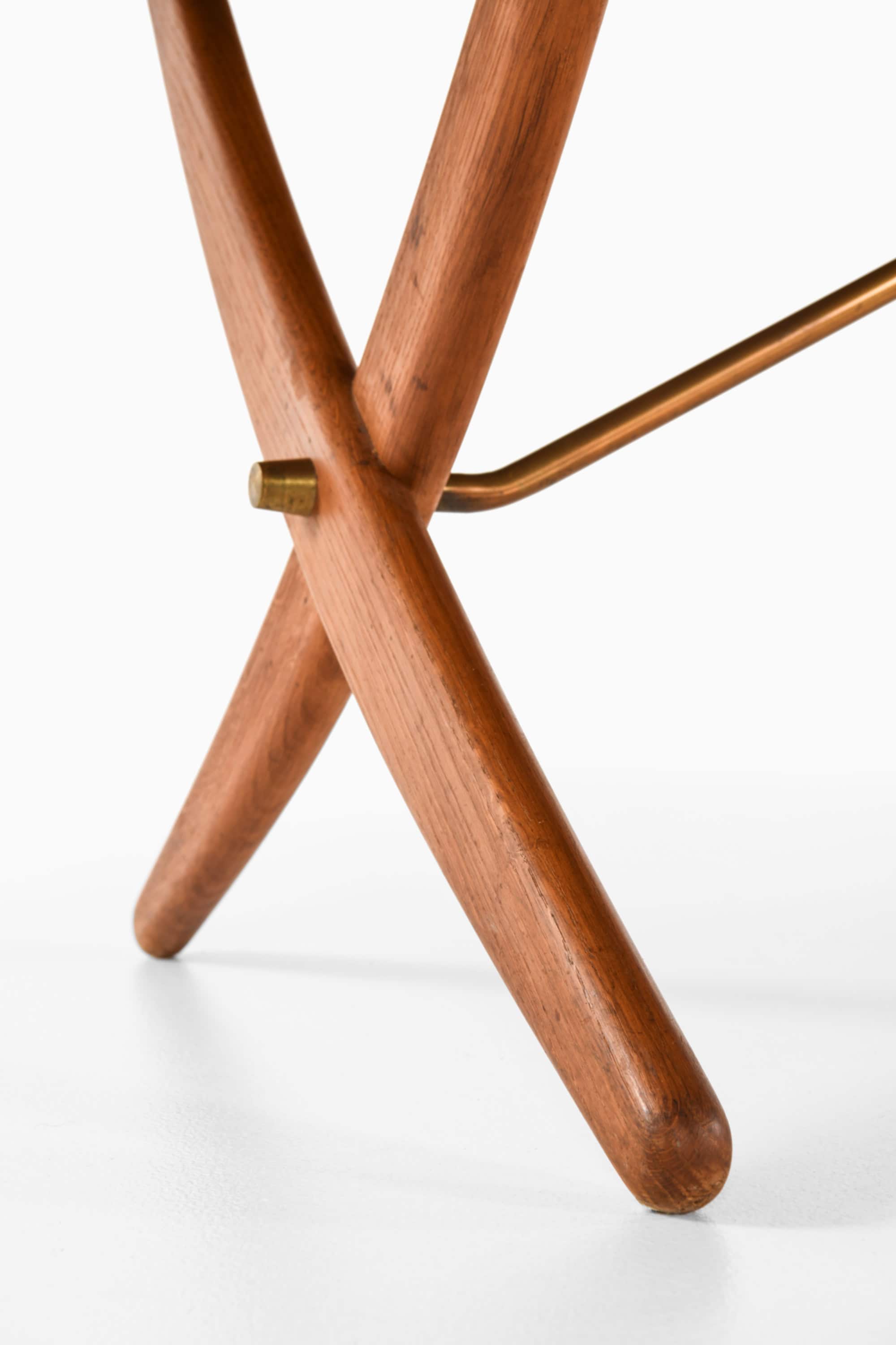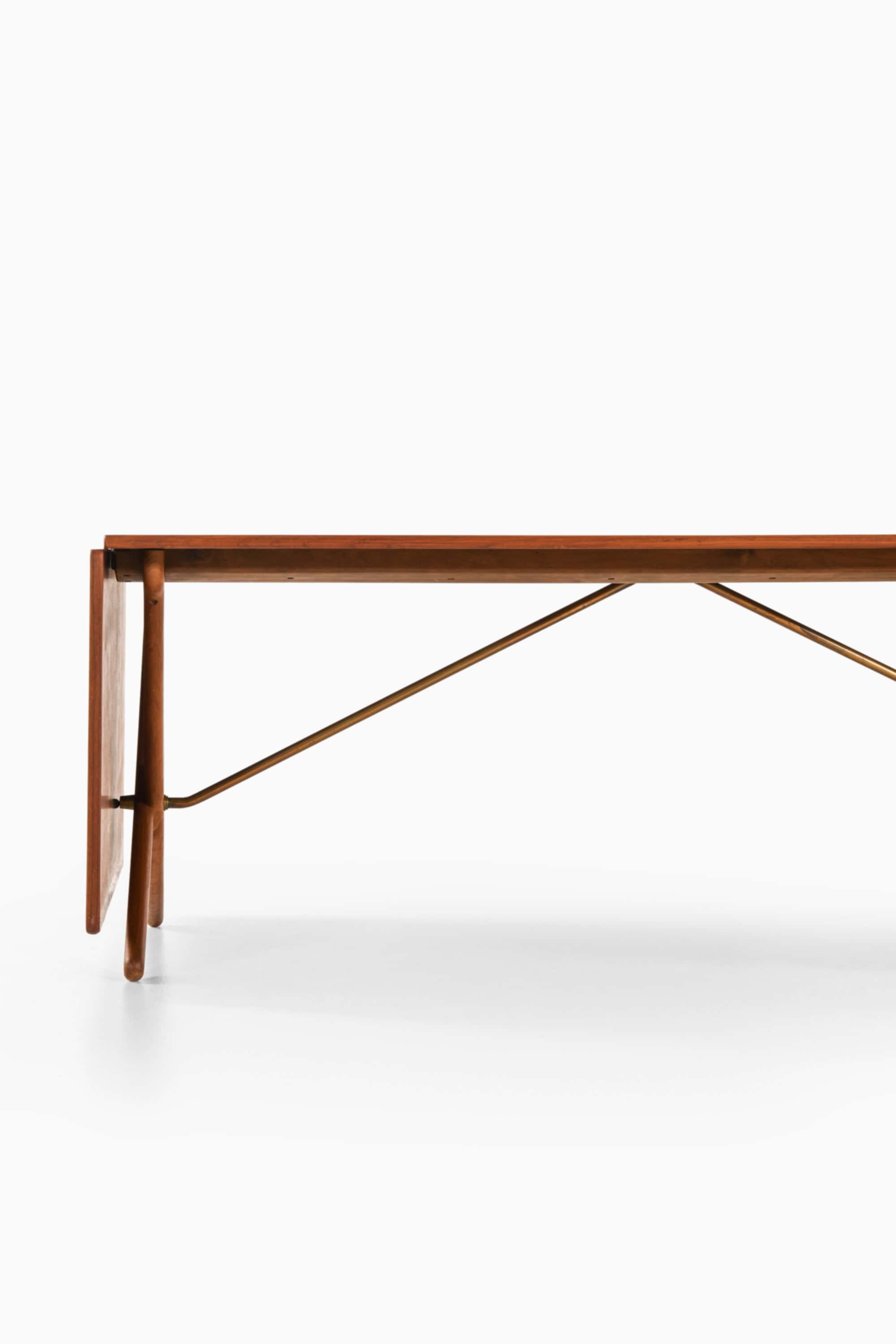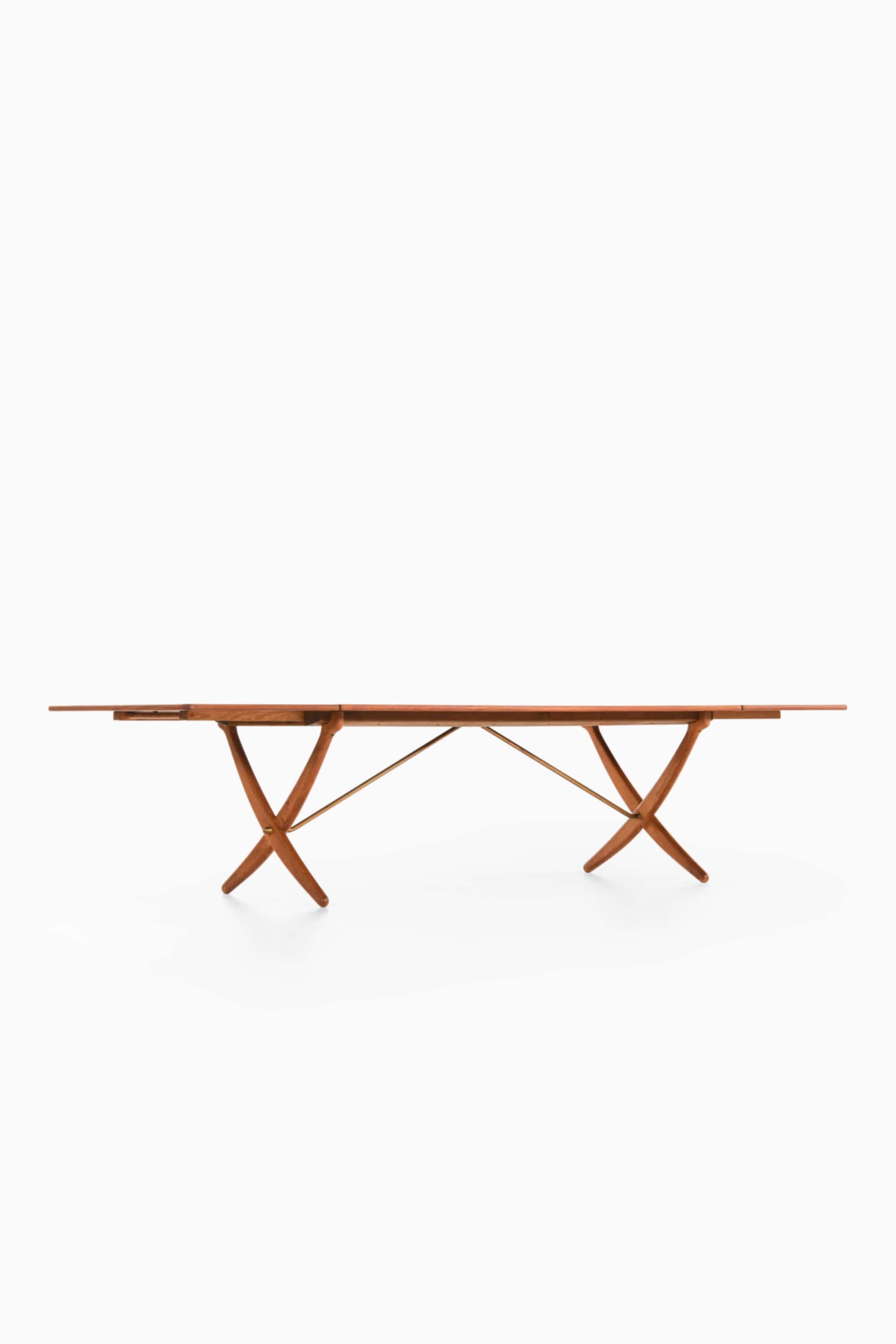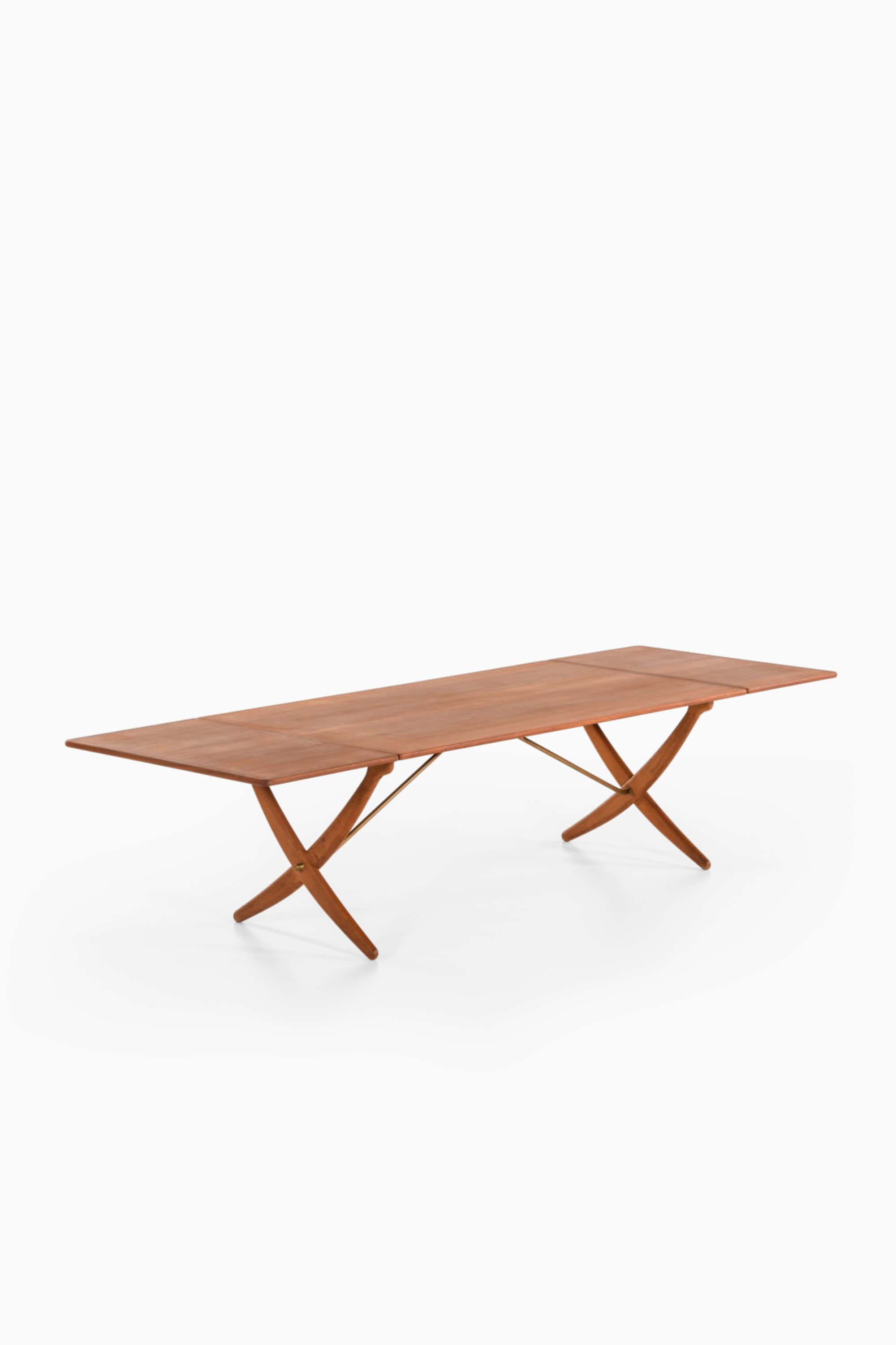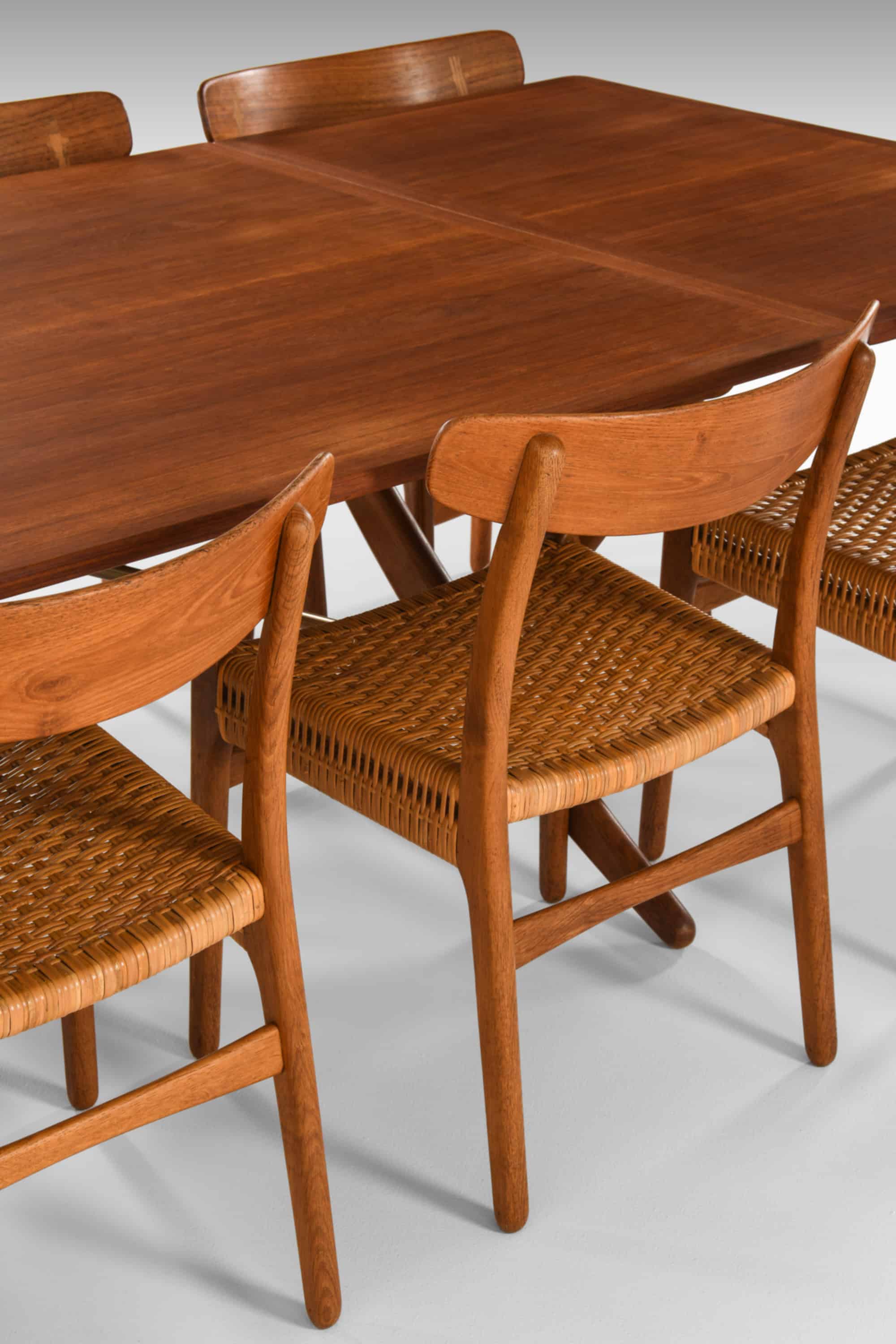 The X-shaped legs, known as “sabre legs” are a signature feature of this model. They are carefully shaped and joined with precision, reflecting the high standards of Danish cabinetmaking from the period. The table’s construction allows for extension with additional leaves, increasing its length from 194 cm (76.4 in) to 310 cm (122 in), while maintaining its structural lightness and proportion. Its width is 105.5 cm (41.5 in) and height 71 cm (28 in).