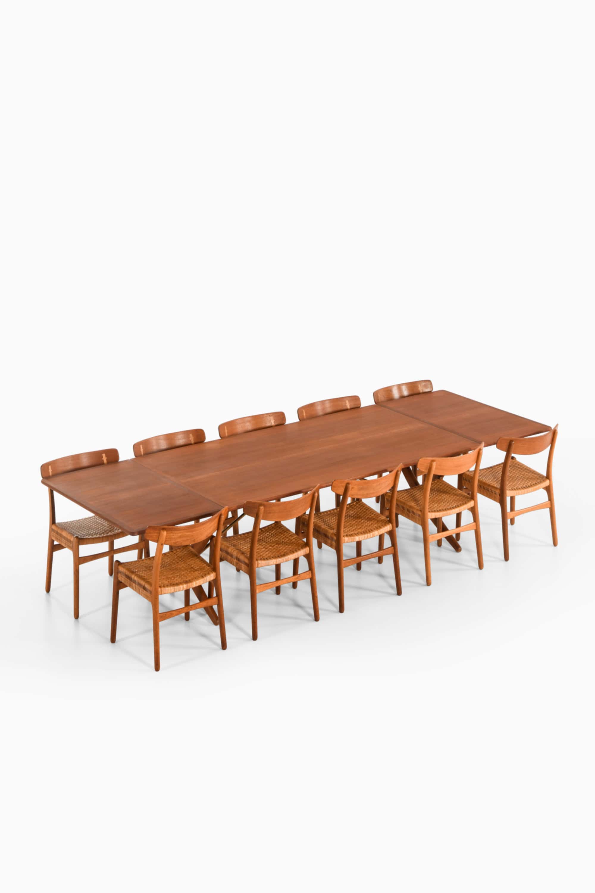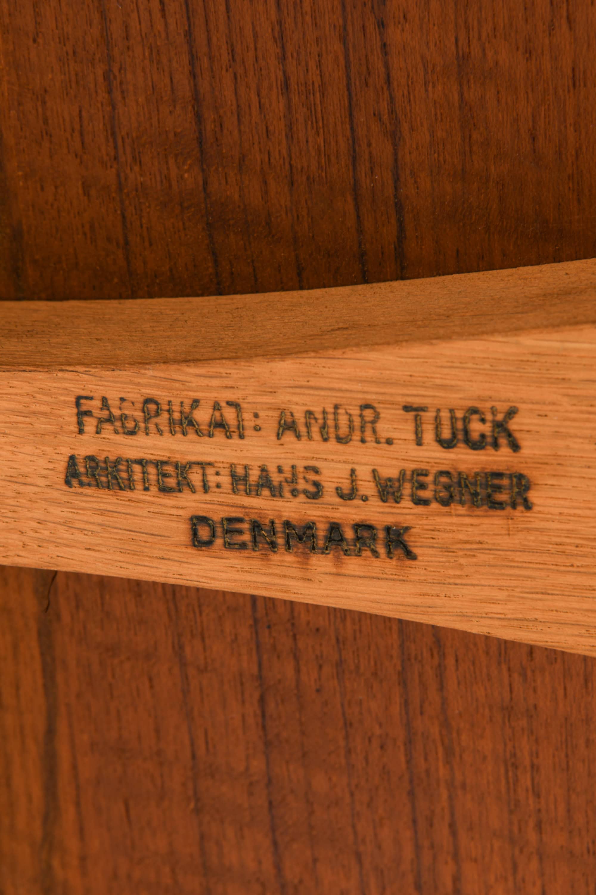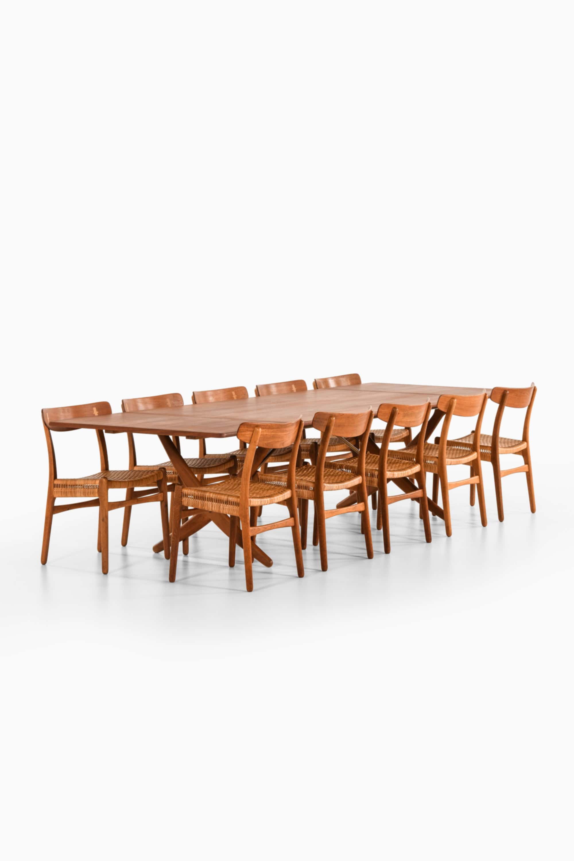 This is a rare and large version of the AT-314 dining table, designed by Danish architect Hans J. Wegner and produced by master cabinetmaker Andreas Tuck in Denmark. The table exemplifies Wegner’s ability to combine structural clarity with sculptural elegance, resulting in a piece that is both technically refined and visually balanced. It was produced during the mid-20th century, a period when Danish Modern design emphasized craftsmanship, honest materials, and functional form.
