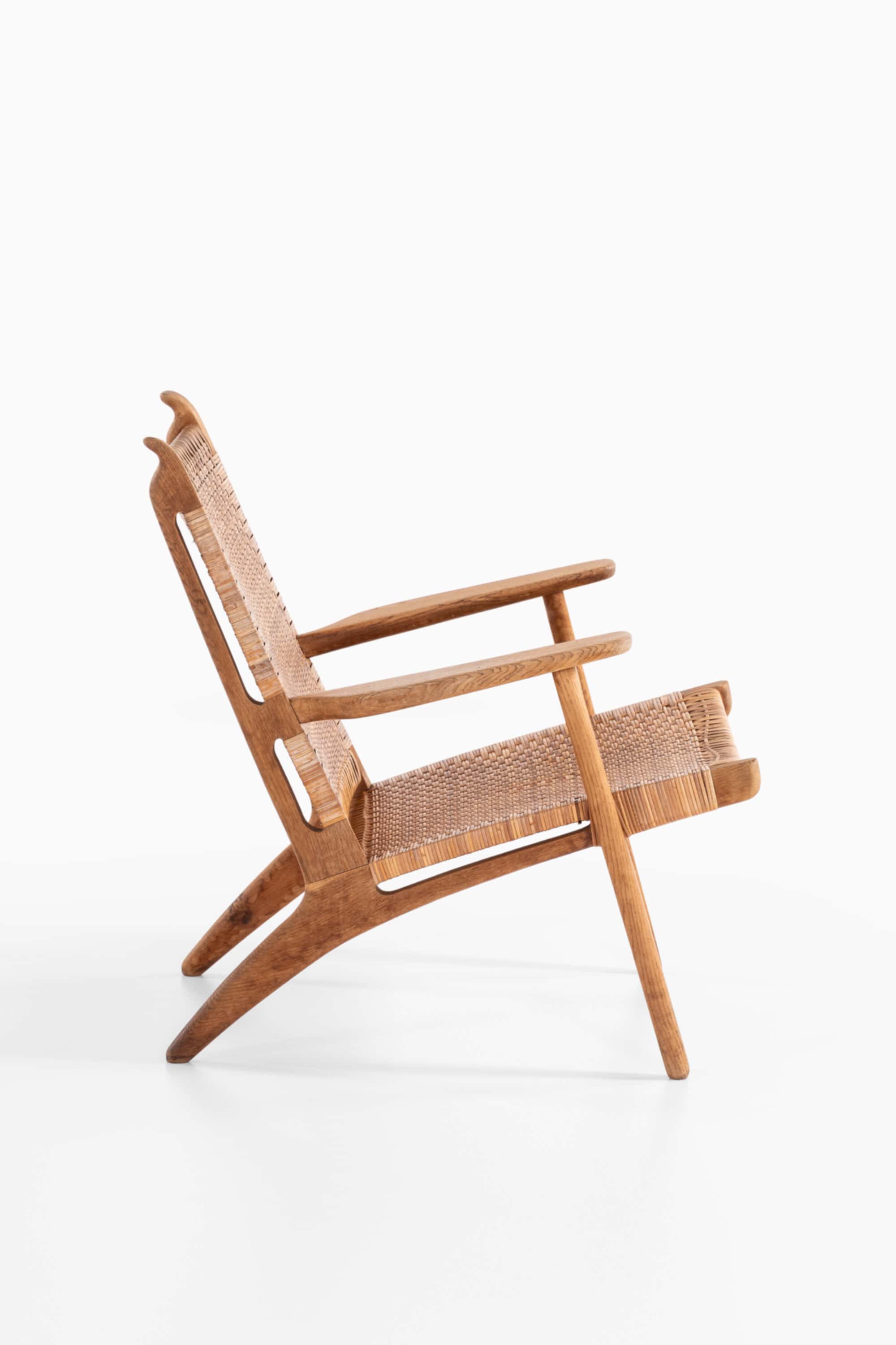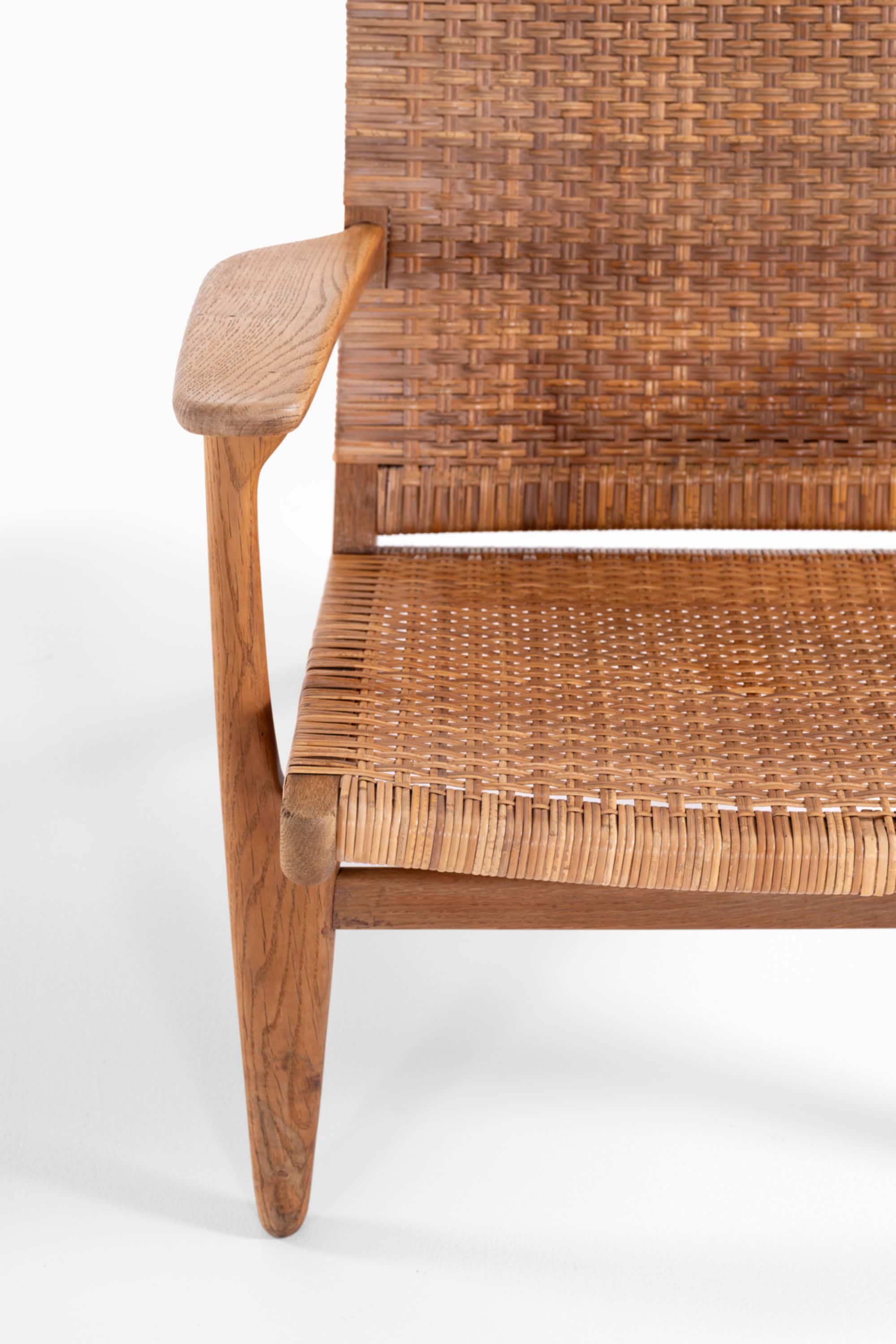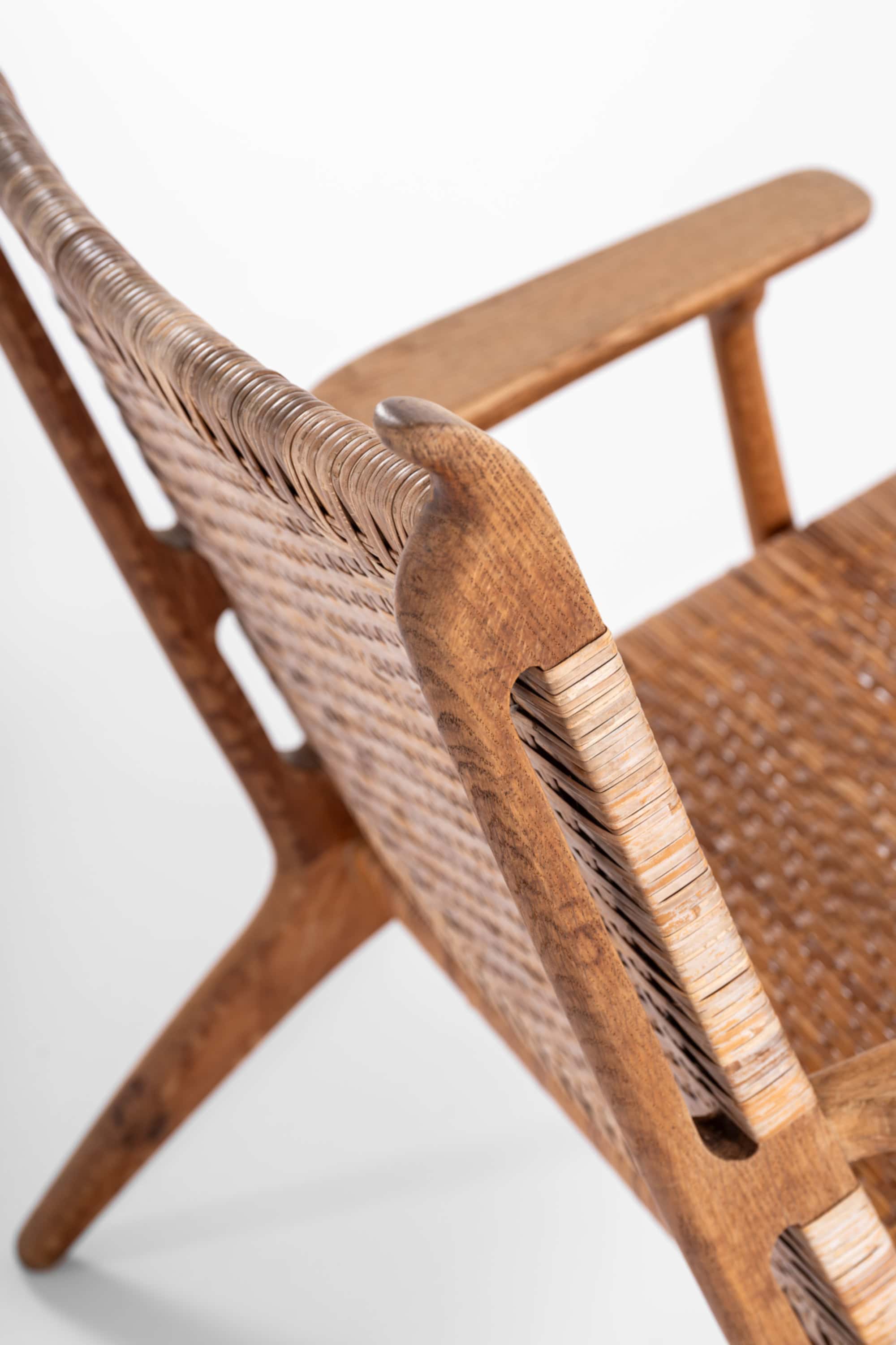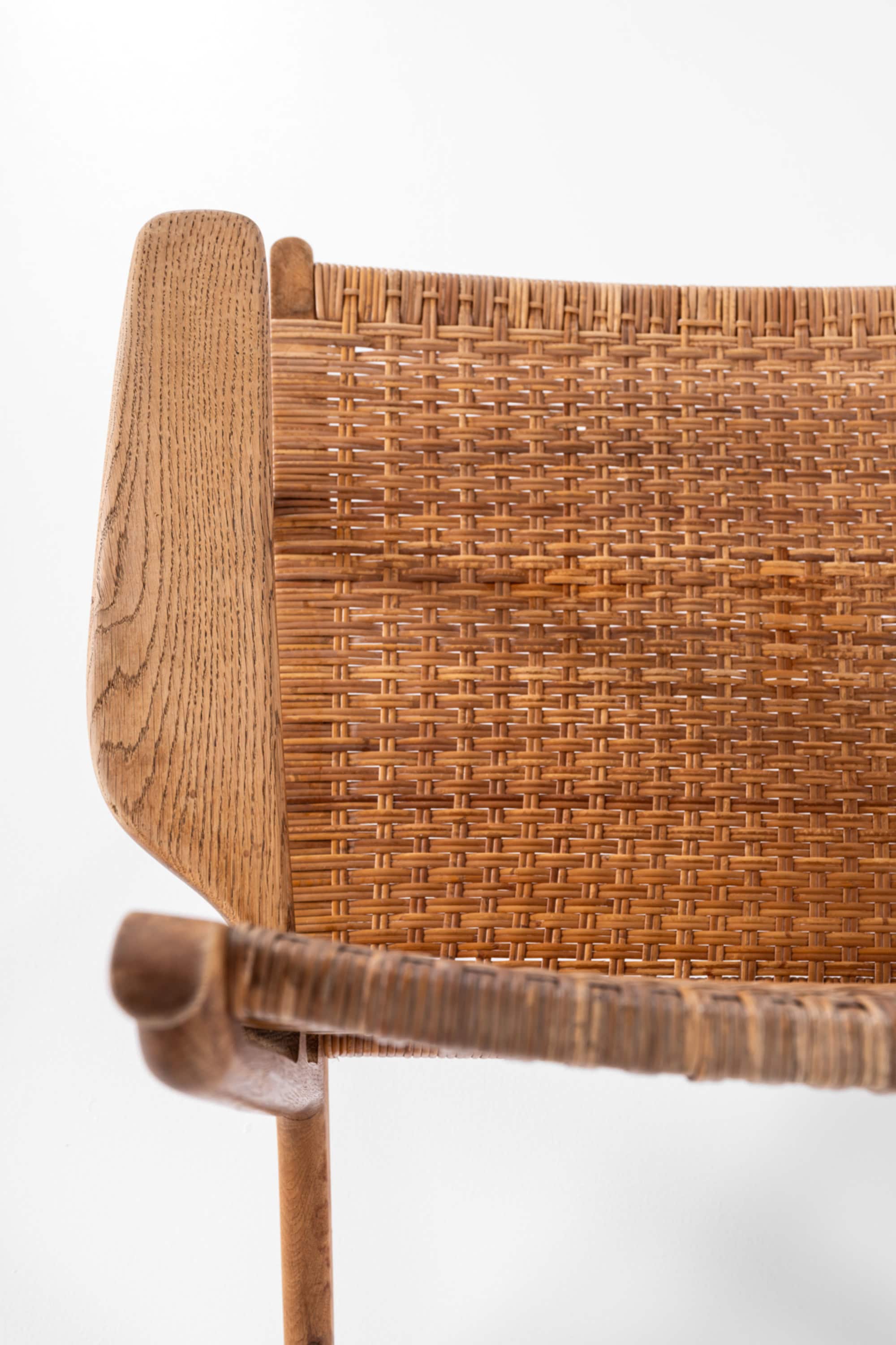 The seat and backrest are executed in tightly woven cane, creating a continuous surface that follows the chair’s angled geometry. The weaving is precise and rhythmic, offering both flexibility and support, while contributing a warm, tactile contrast to the solid oak frame. The slight curvature of the backrest and the low seat height emphasize a relaxed seating position, typical of Wegner’s early lounge designs.