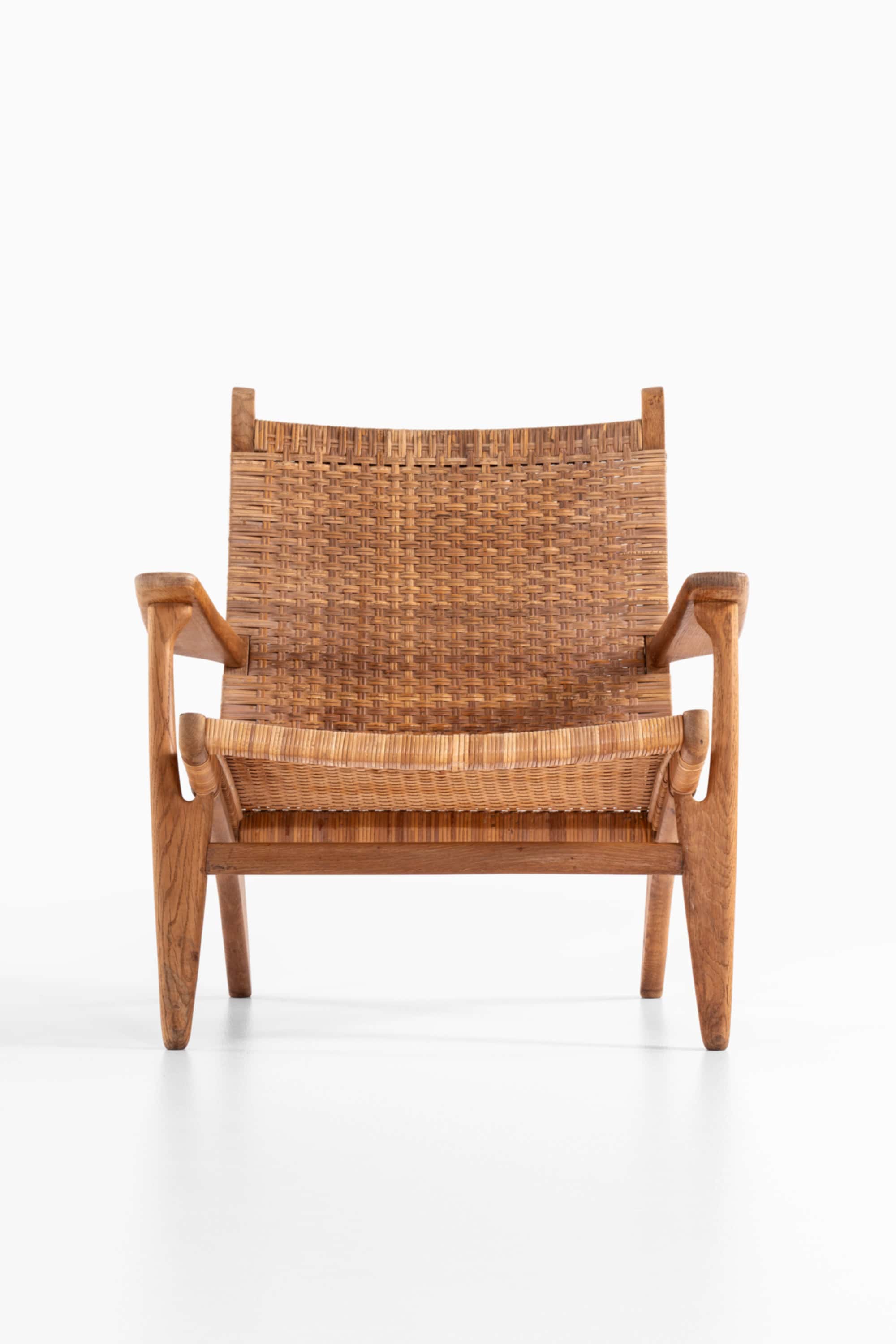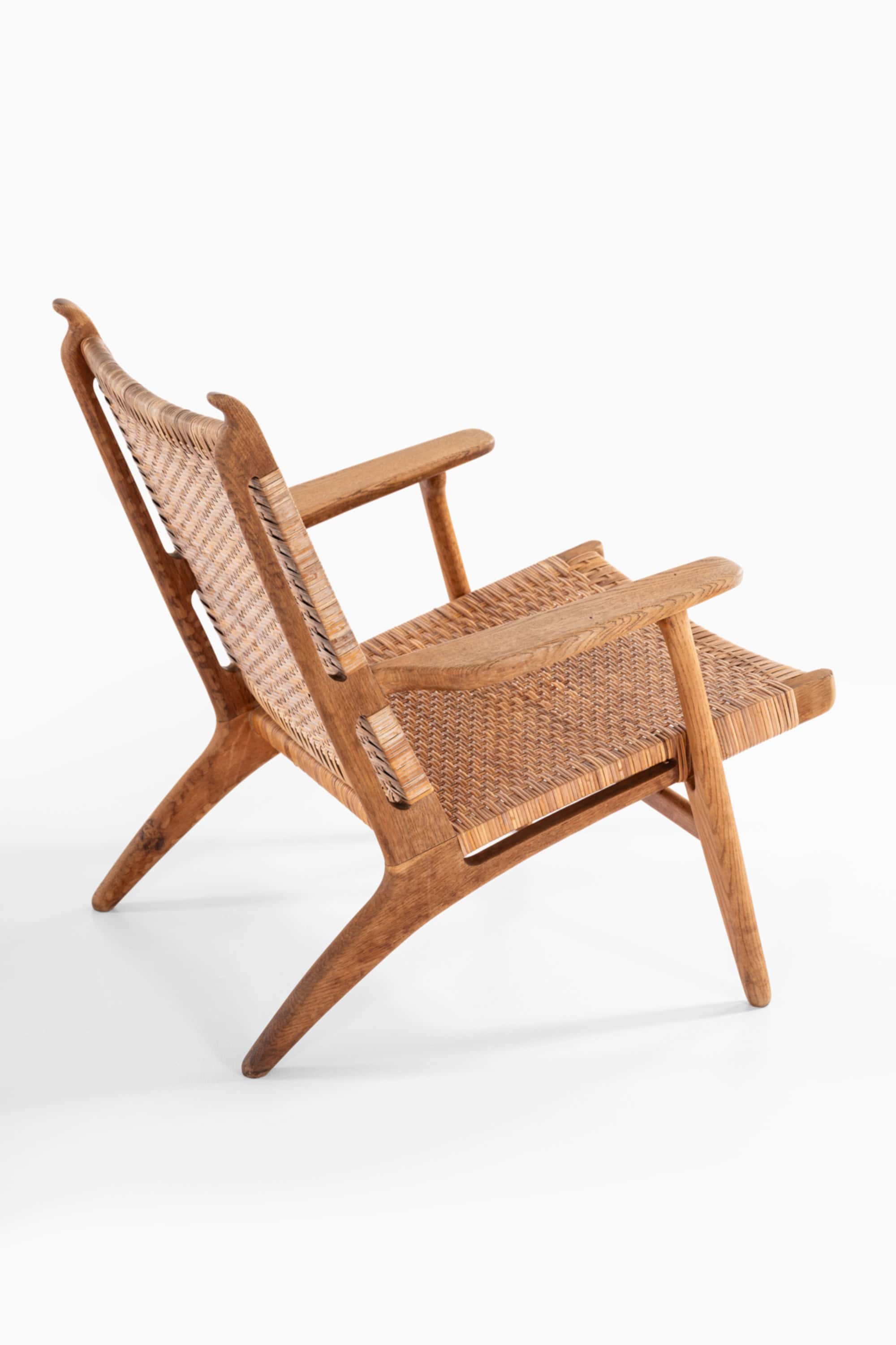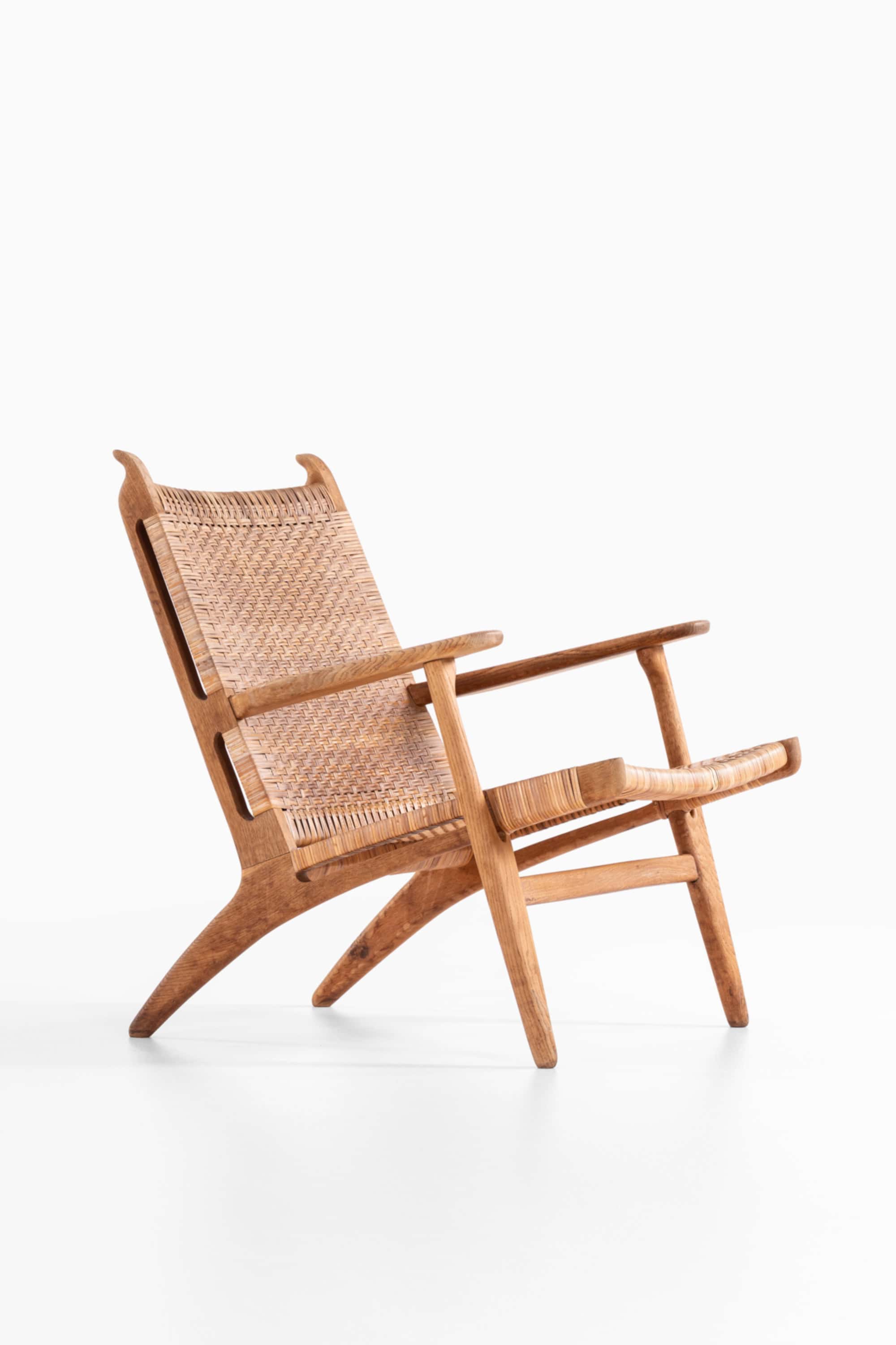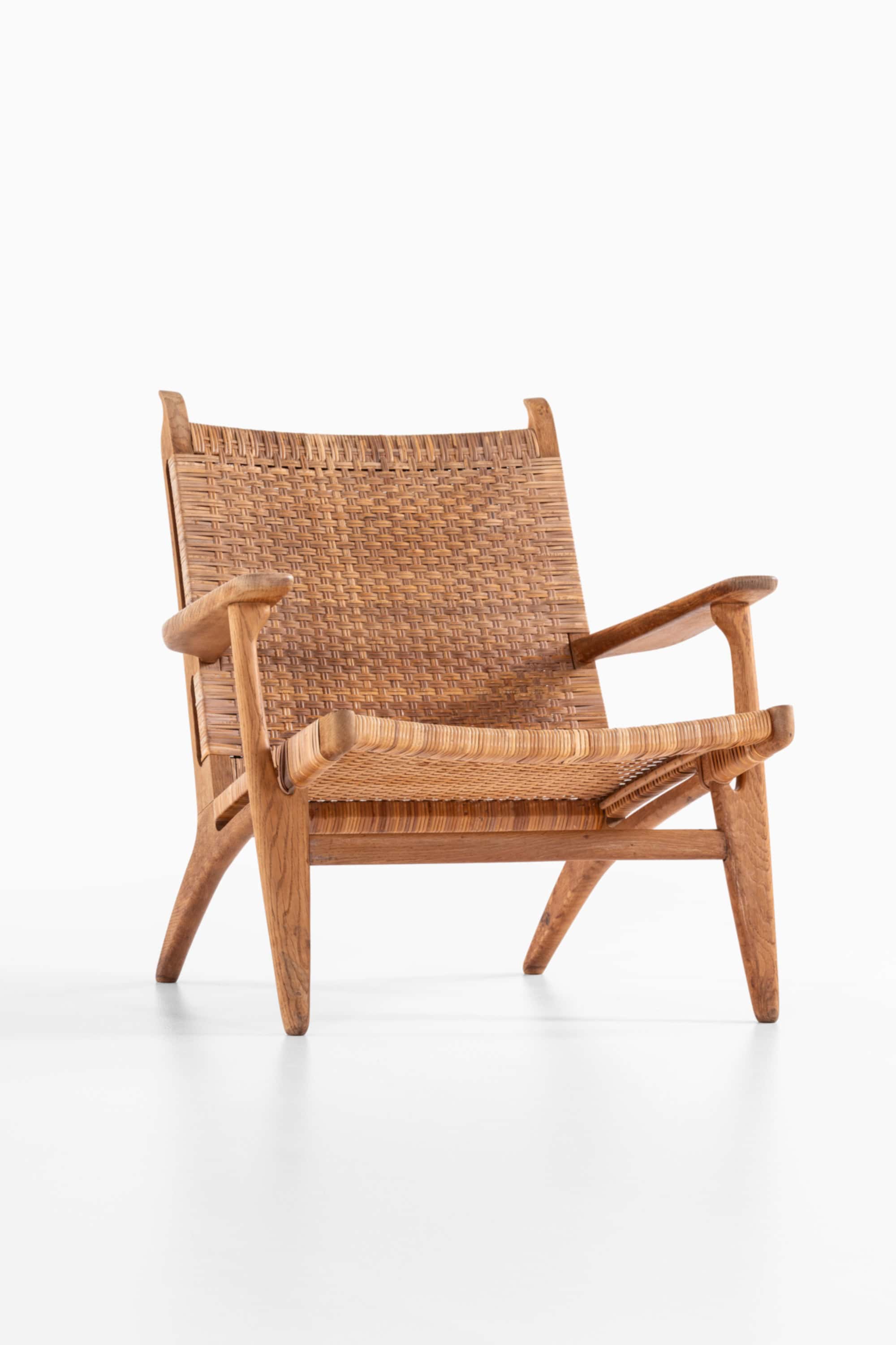 The seat and backrest are executed in tightly woven cane, creating a continuous surface that follows the chair’s angled geometry. The weaving is precise and rhythmic, offering both flexibility and support, while contributing a warm, tactile contrast to the solid oak frame. The slight curvature of the backrest and the low seat height emphasize a relaxed seating position, typical of Wegner’s early lounge designs.