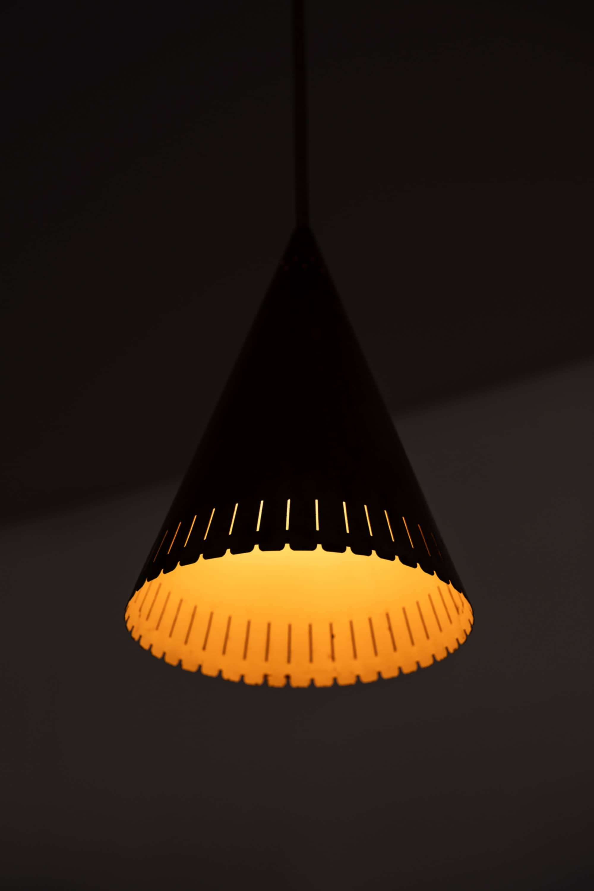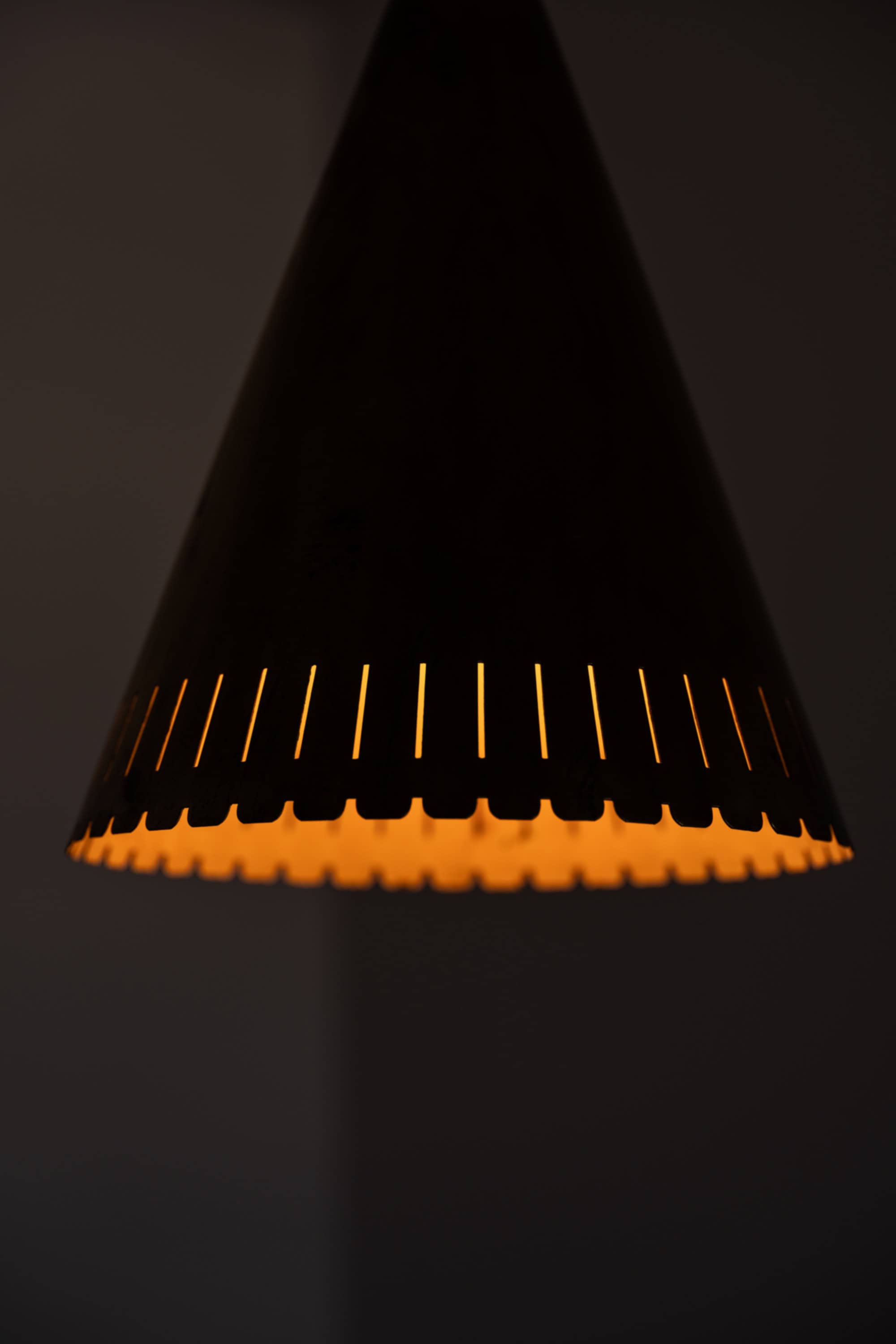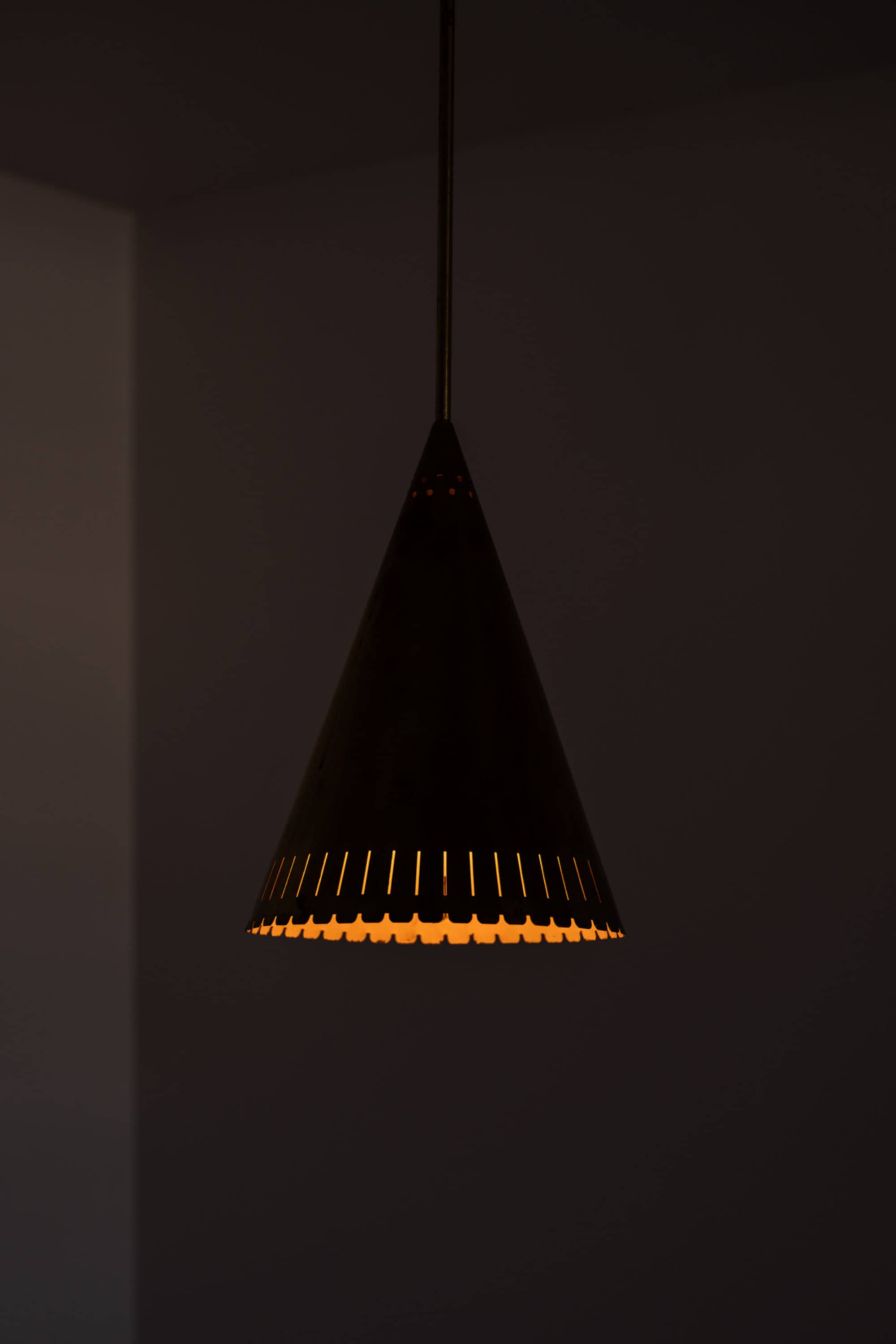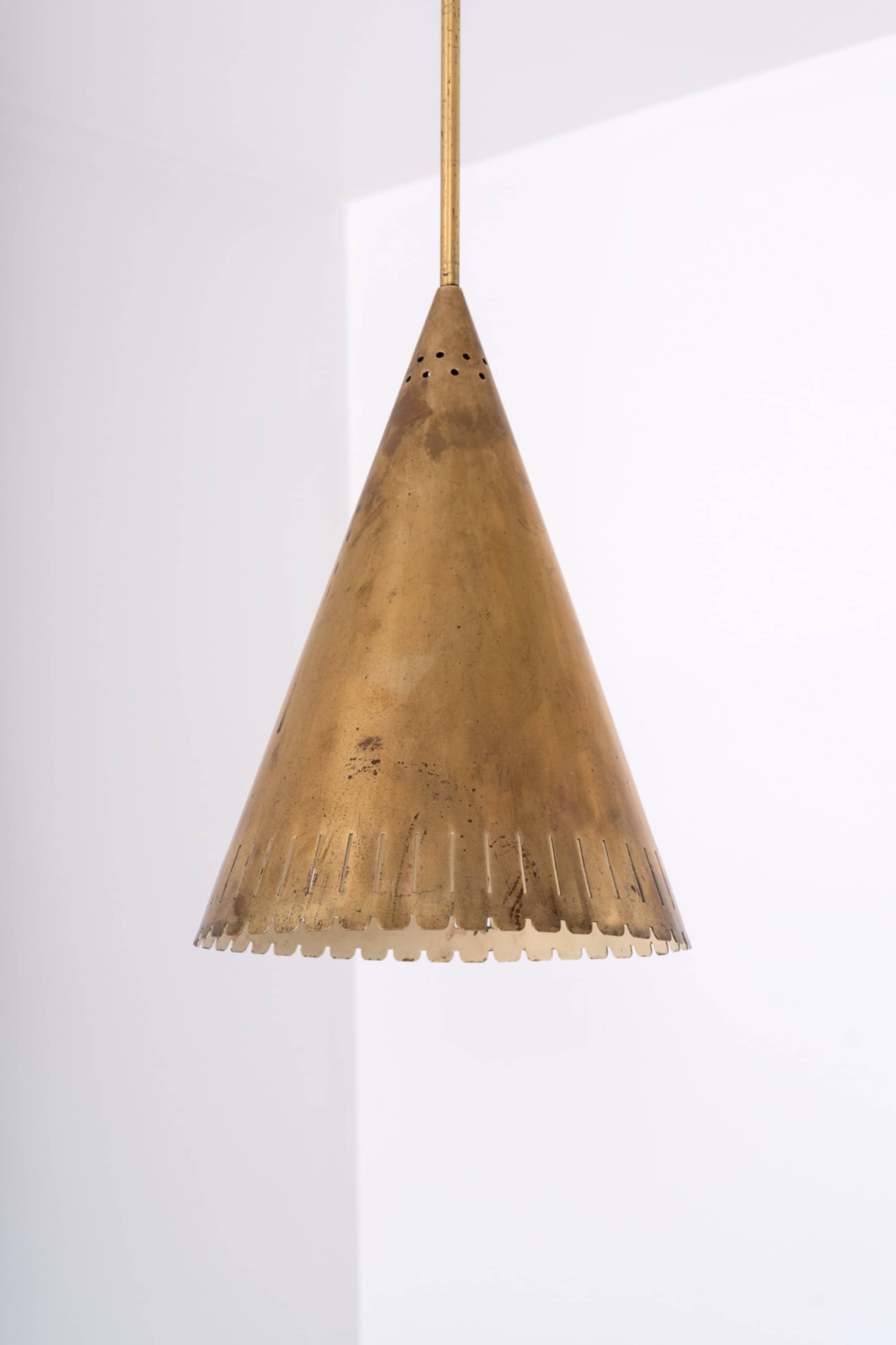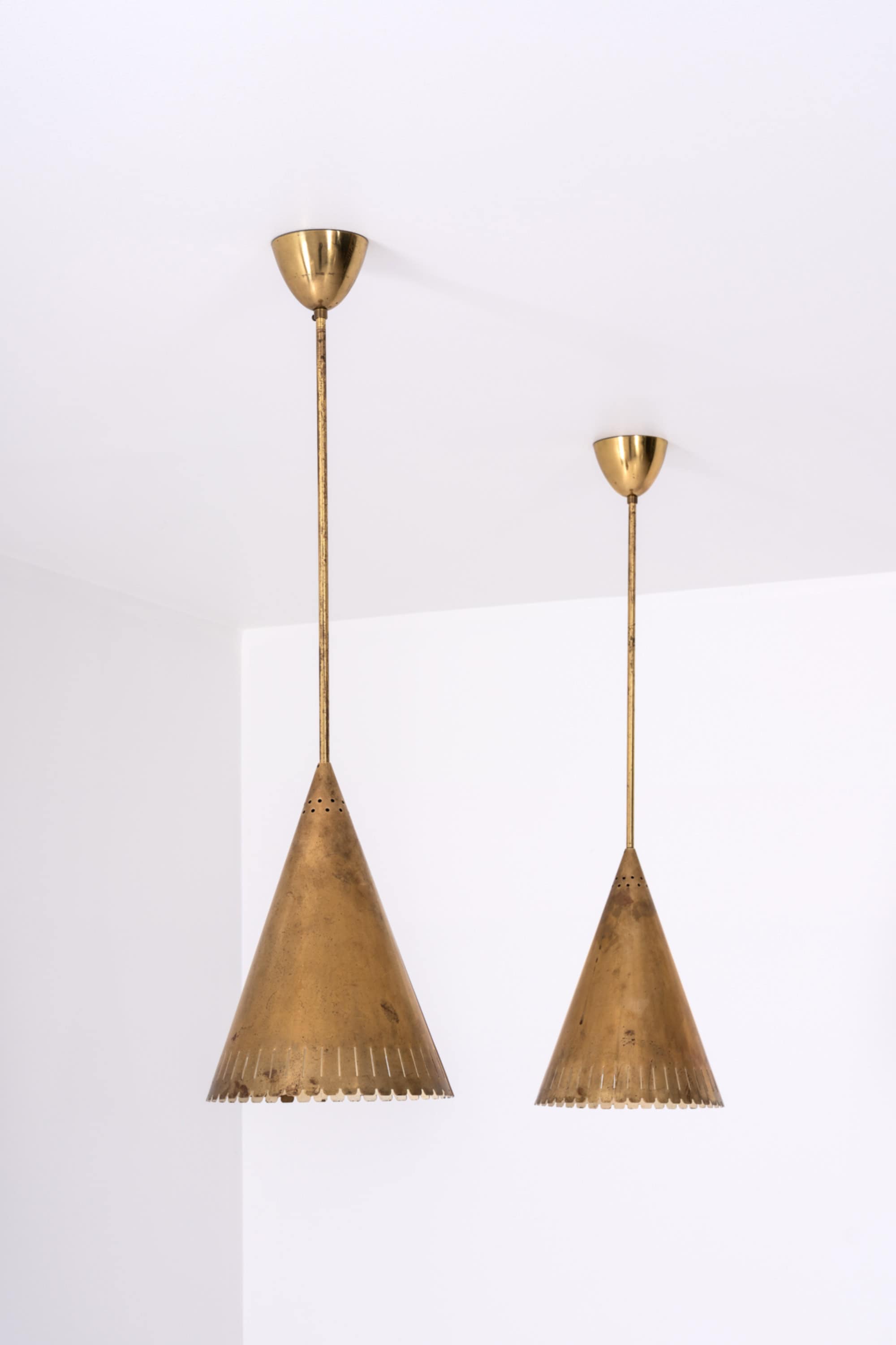 Each lamp is executed entirely in brass and features a distinctly conical shade with a sharply defined silhouette. The surface of the shade is punctuated by a series of small perforations near the upper section, as well as a rhythmically cut, scalloped edge at the lower rim. These details serve both aesthetic and functional purposes, allowing light to escape in controlled patterns while reinforcing the graphic character of the design. The long, slender suspension rods and simple ceiling cups emphasize verticality and give the lamps an elegant, architectural presence.