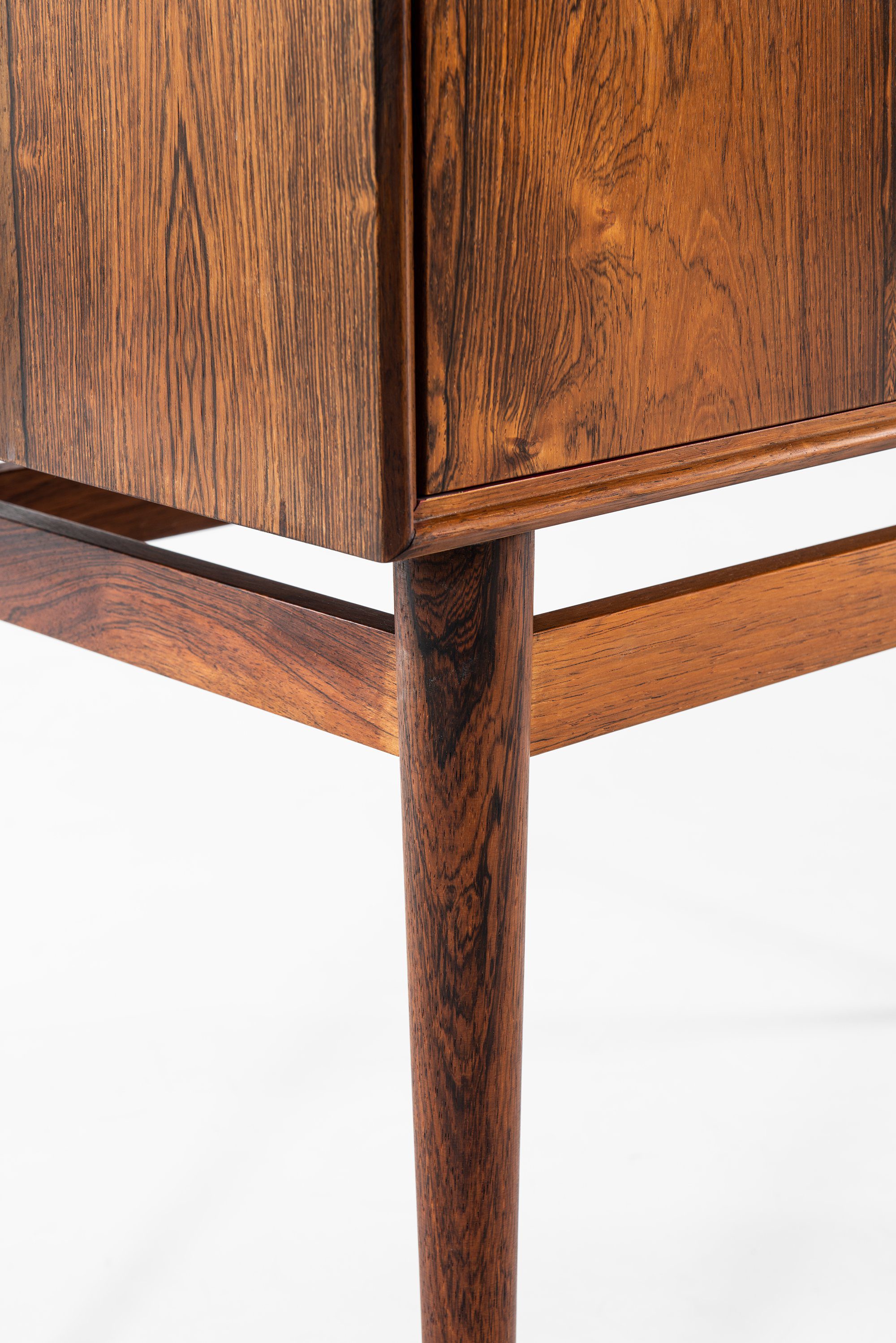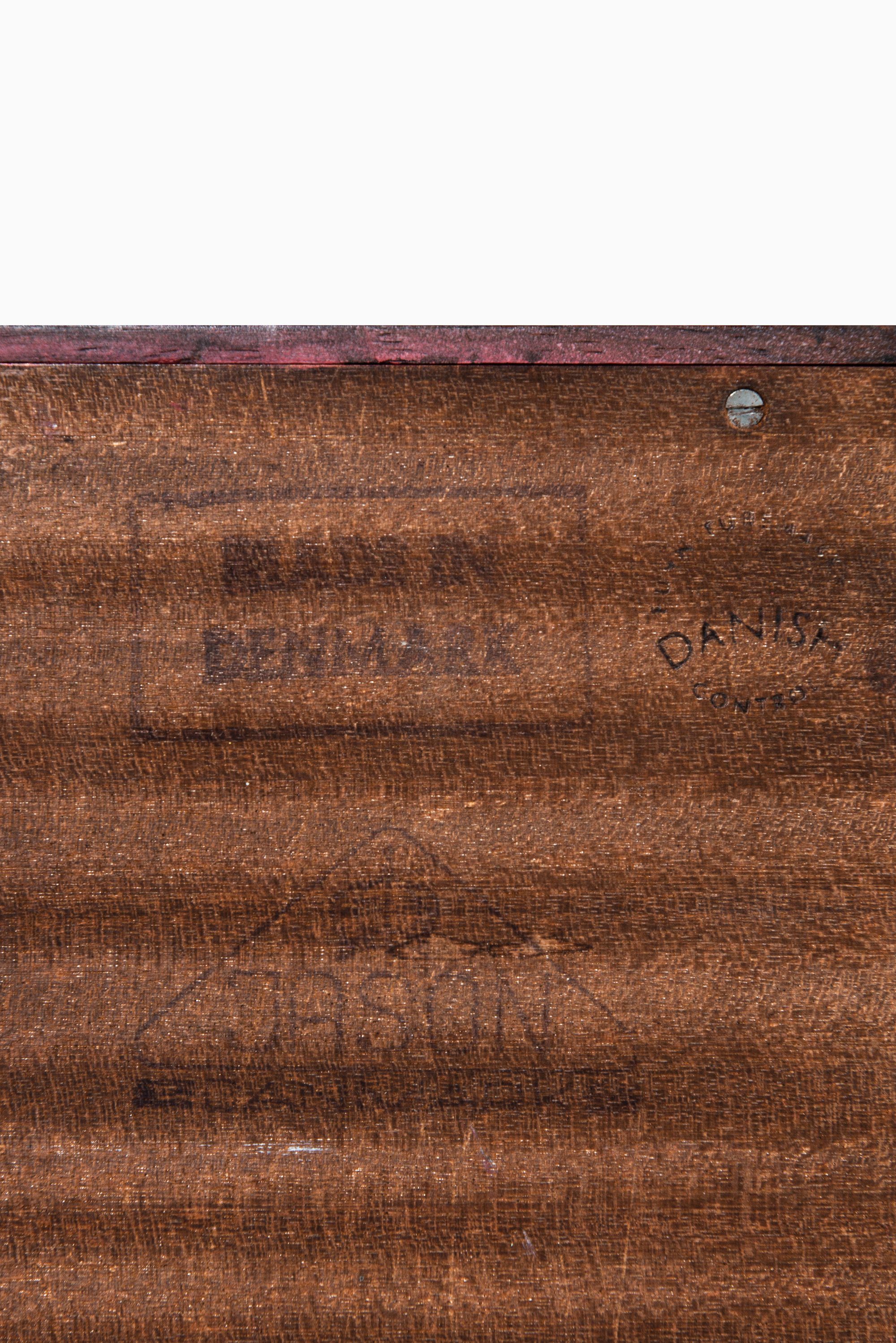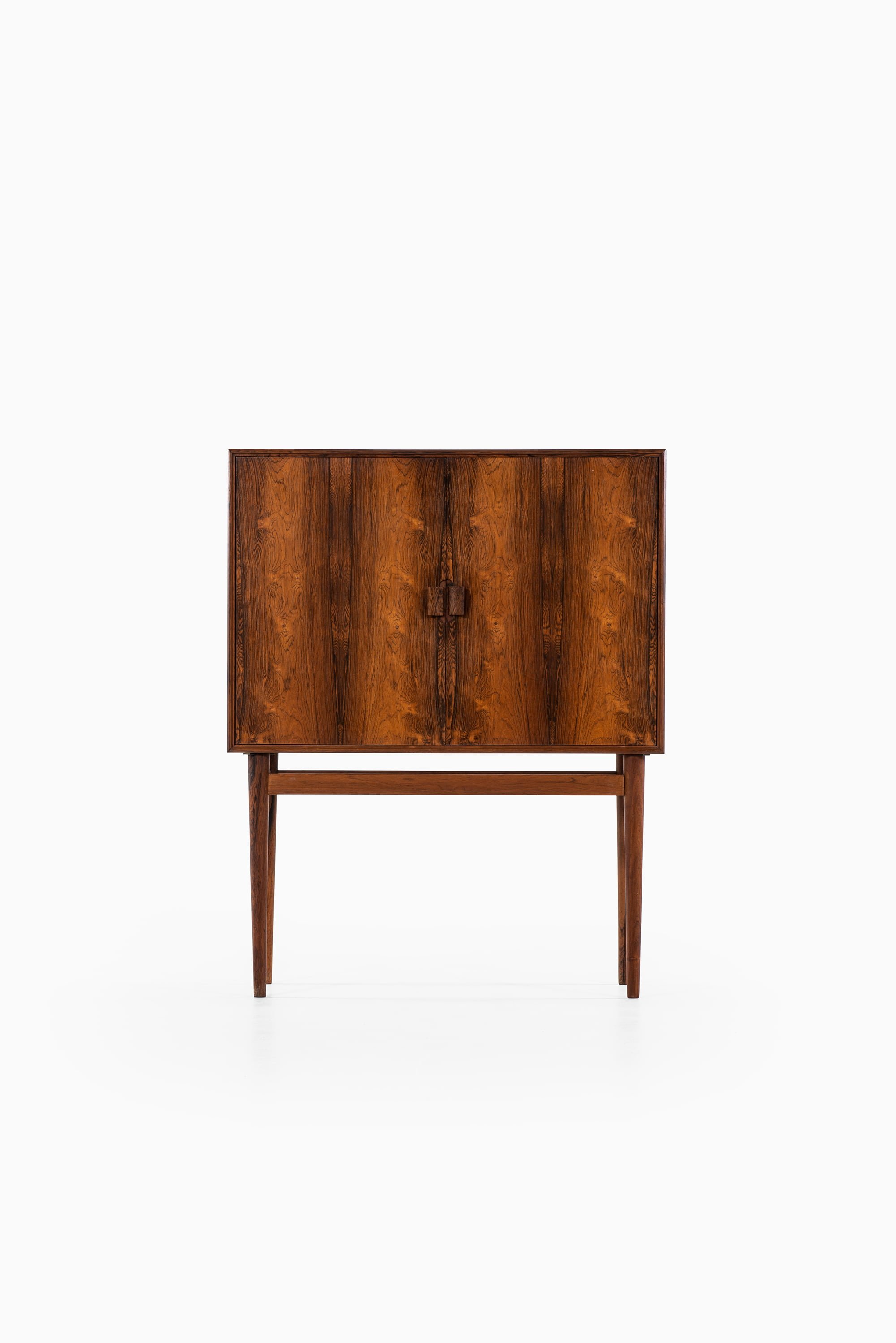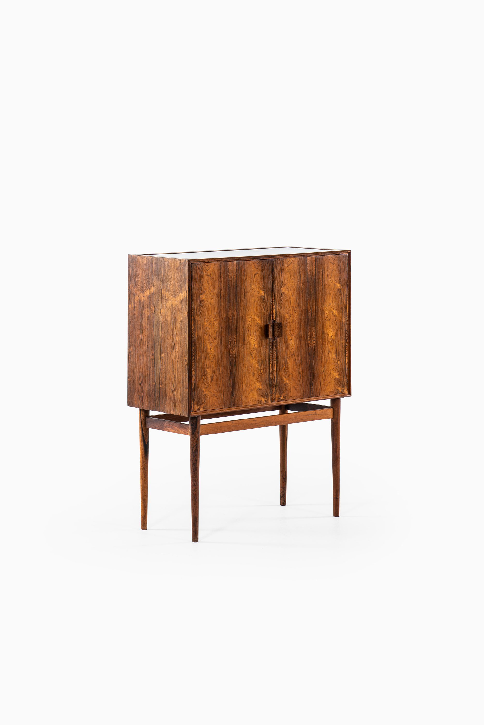 This rare bar cabinet, model 63, was designed by Danish furniture designer Helge Vestergaard Jensen and produced by Jason Møbler in Denmark during the 1950s. Vestergaard Jensen was known for his refined, architectural approach to furniture, often combining functionalist principles with elegant detailing and high-quality craftsmanship. His work is characterized by clean lines, well-proportioned forms, and meticulous attention to materiality — all qualities visible in this piece.
