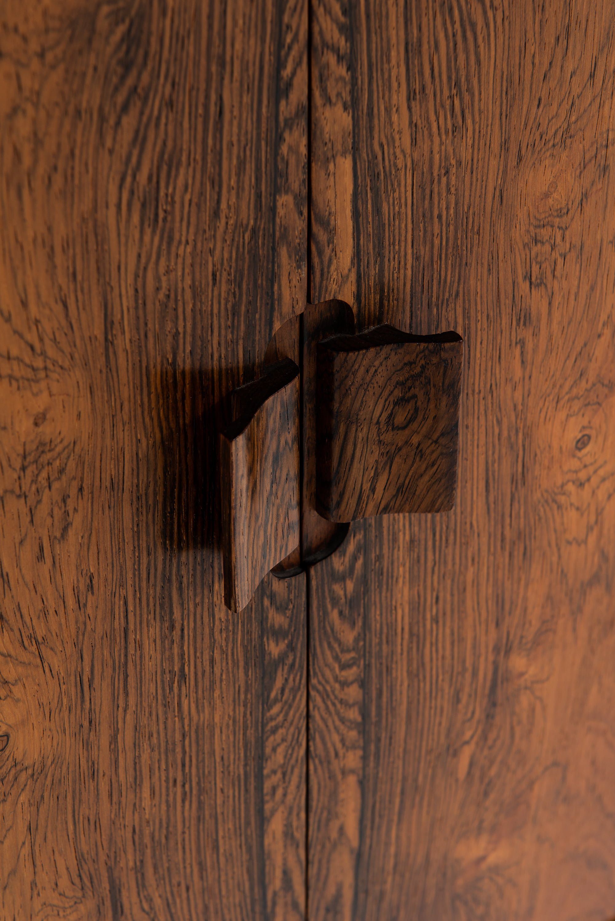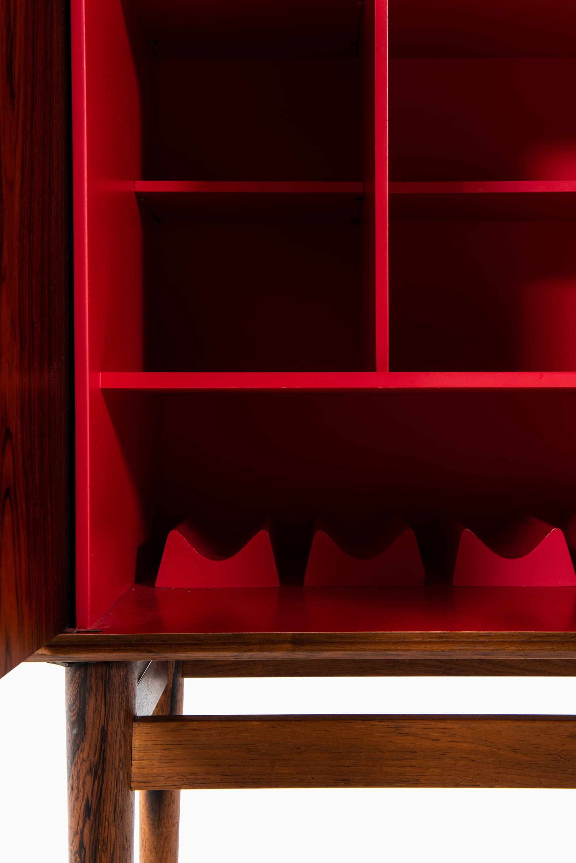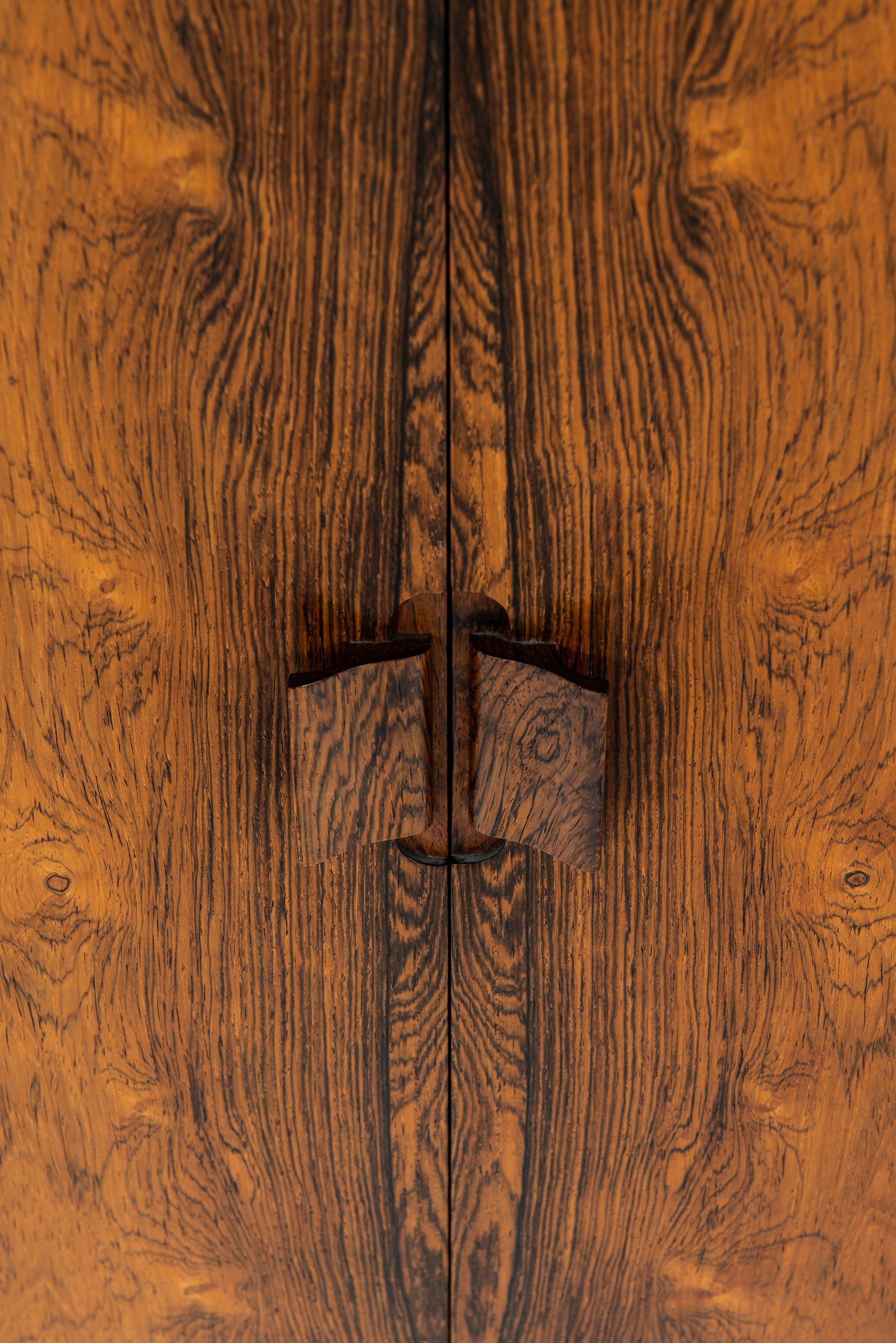 The cabinet is constructed from richly grained rosewood, showcasing a deep, warm tone and striking natural patterning across the doors and frame. The interior reveals a contrasting, bold red lacquer finish with multiple compartments and shelves designed for storage and display of glassware and bottles, while the exterior’s minimalist silhouette rests on slender, tapered legs that elevate the piece and lend it a light visual presence. The top is finished with black Formica, offering a practical, durable surface for preparing and serving drinks.