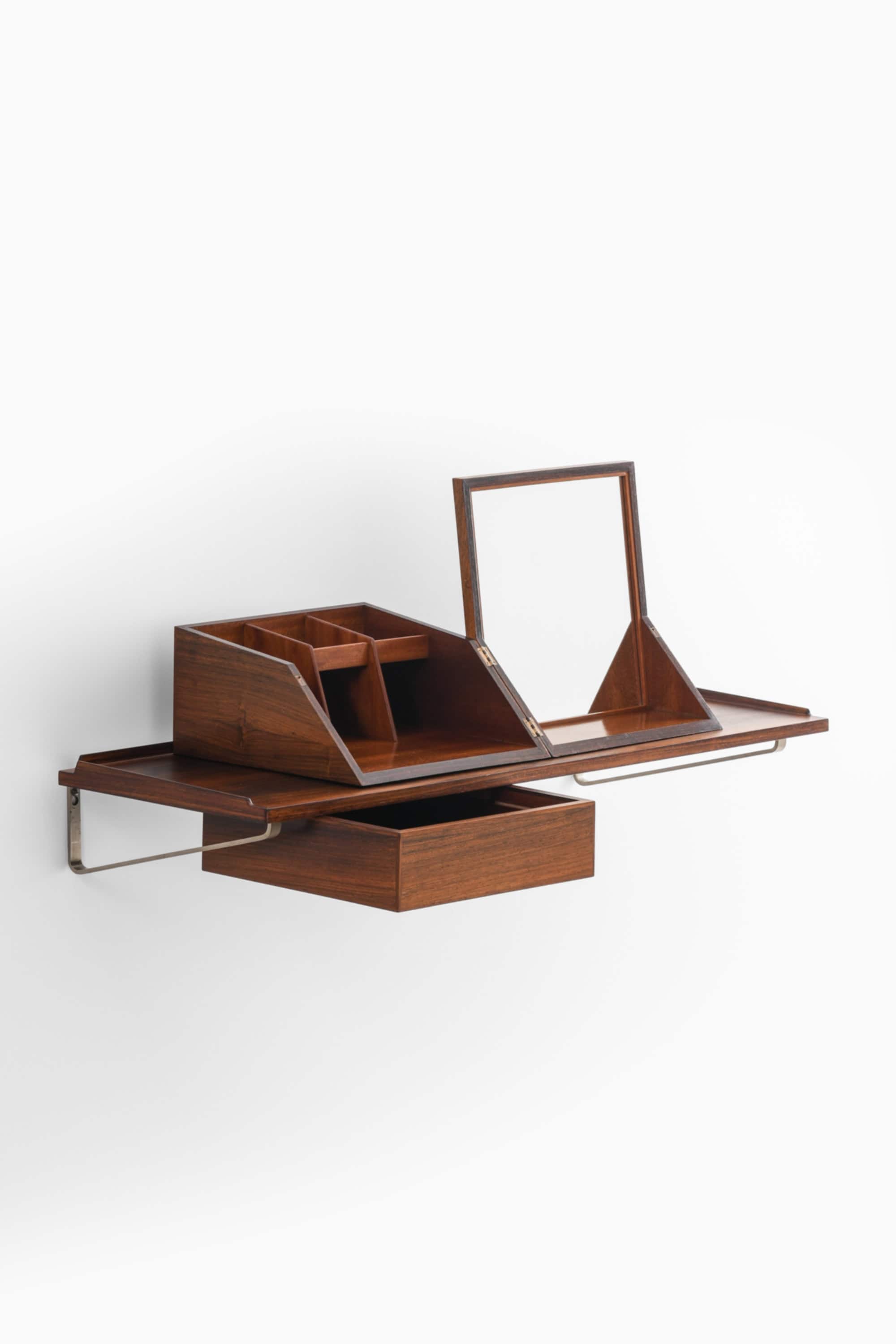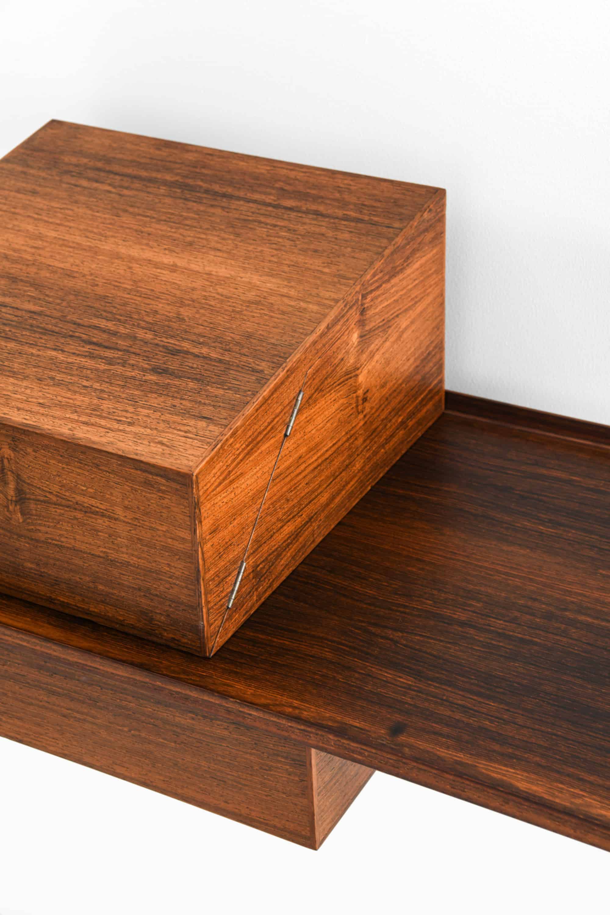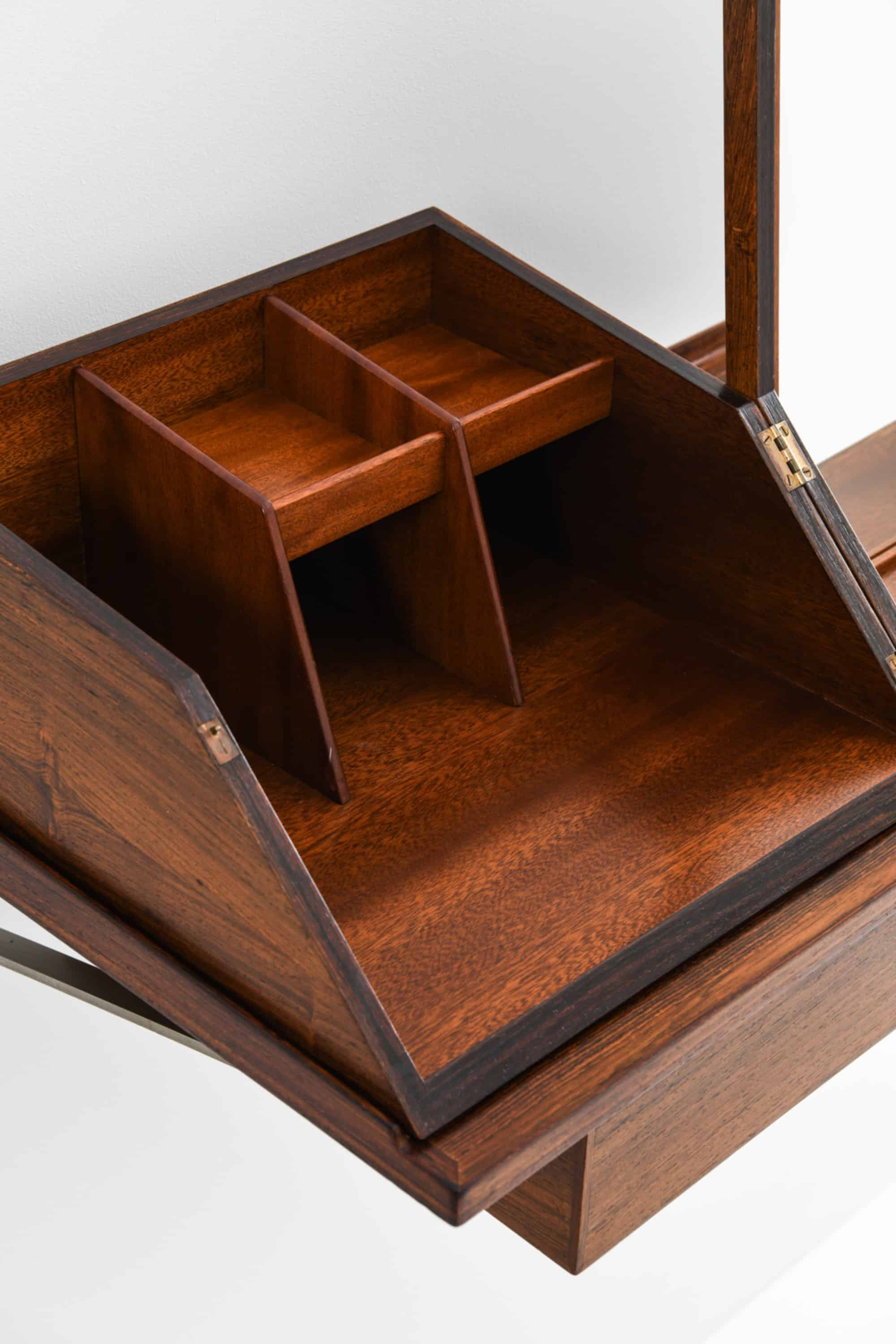 This wall-mounted table and matching vanity box were designed and crafted by cabinetmaker Jørgen Wolff in Denmark, circa 1955. Both pieces are executed in richly grained rosewood, with the box featuring a mahogany interior, an integrated mirror, and multiple compartment dividers. The combination demonstrates the Danish cabinetmaker tradition at its highest standard, where functional clarity meets refined joinery and material sensibility.