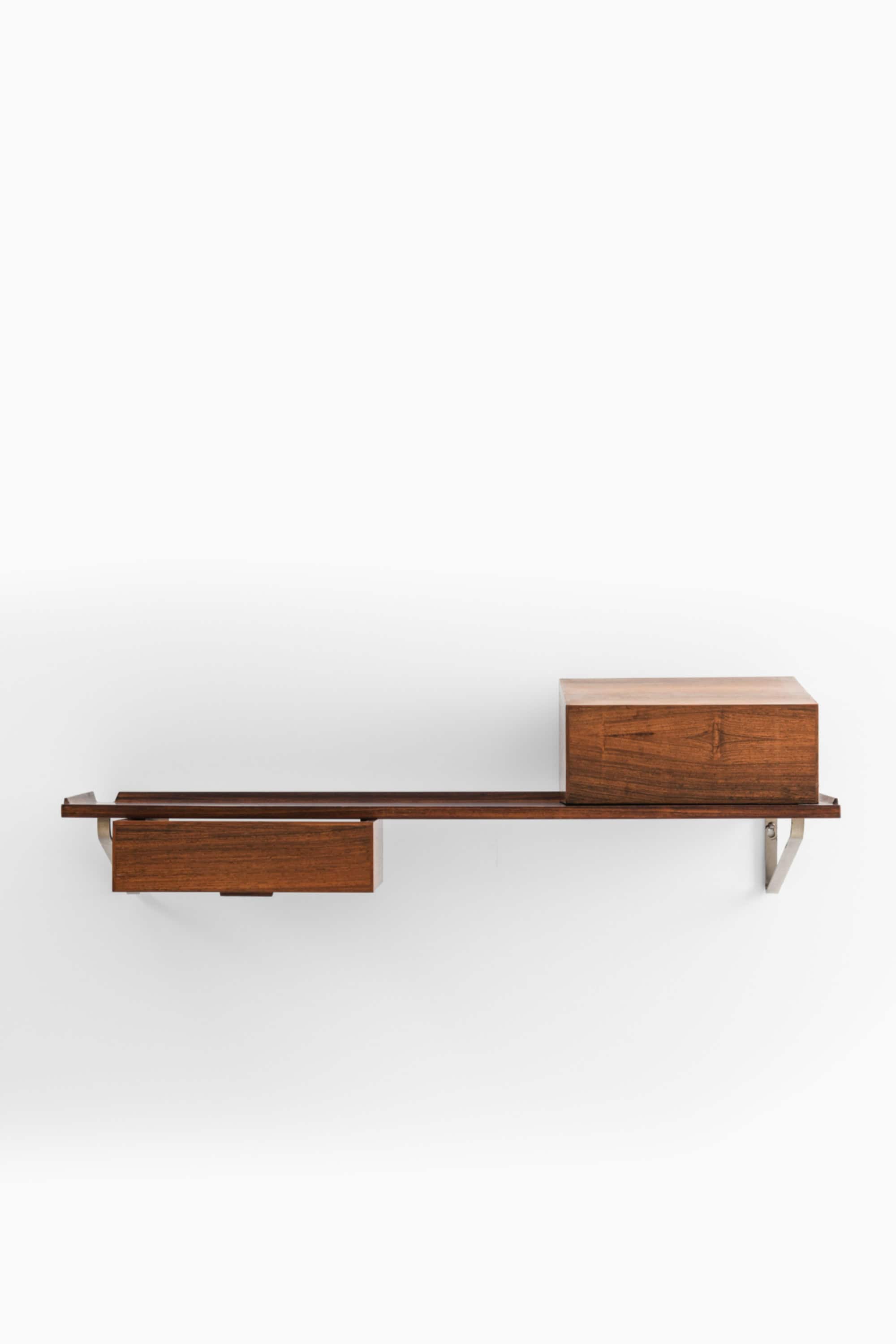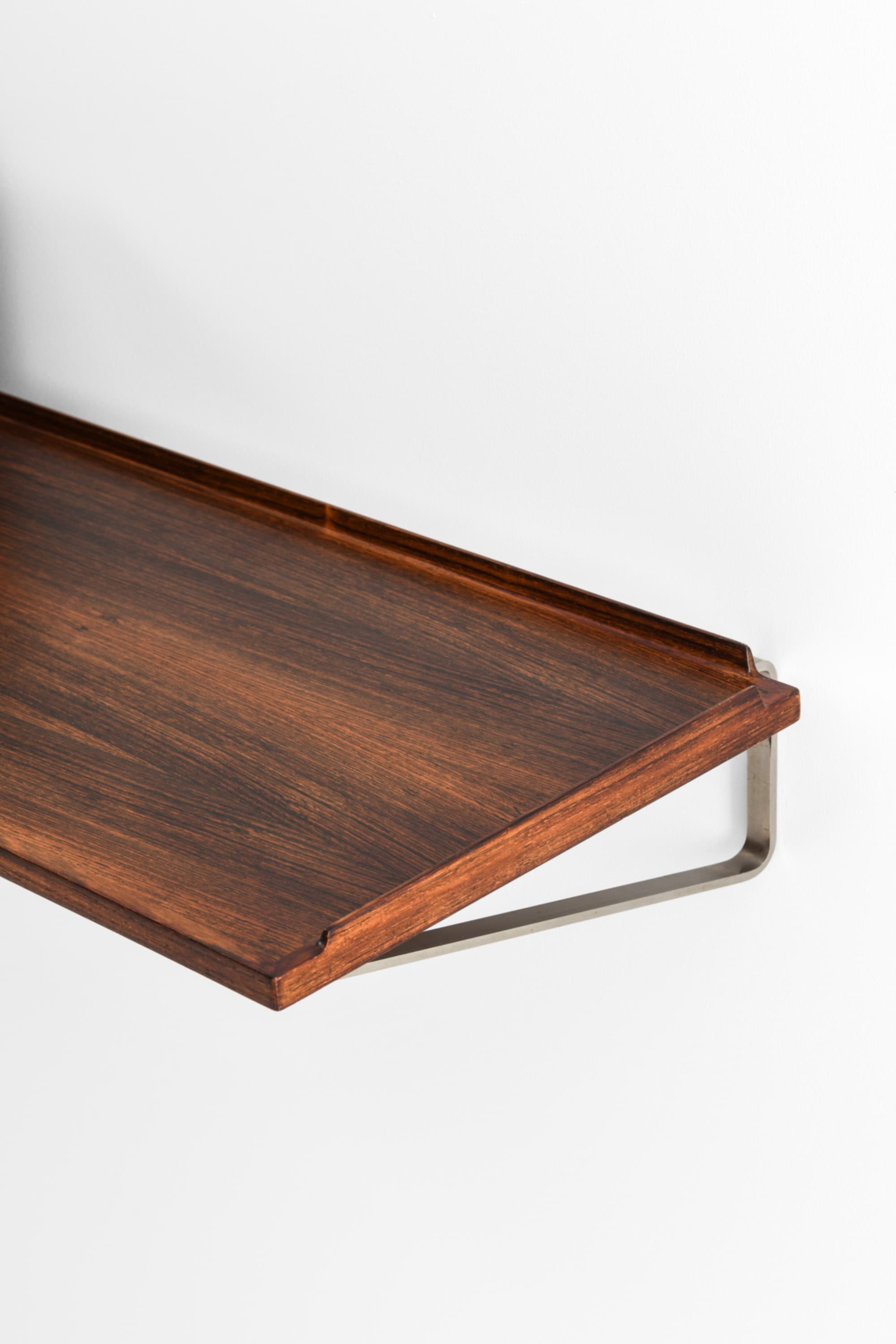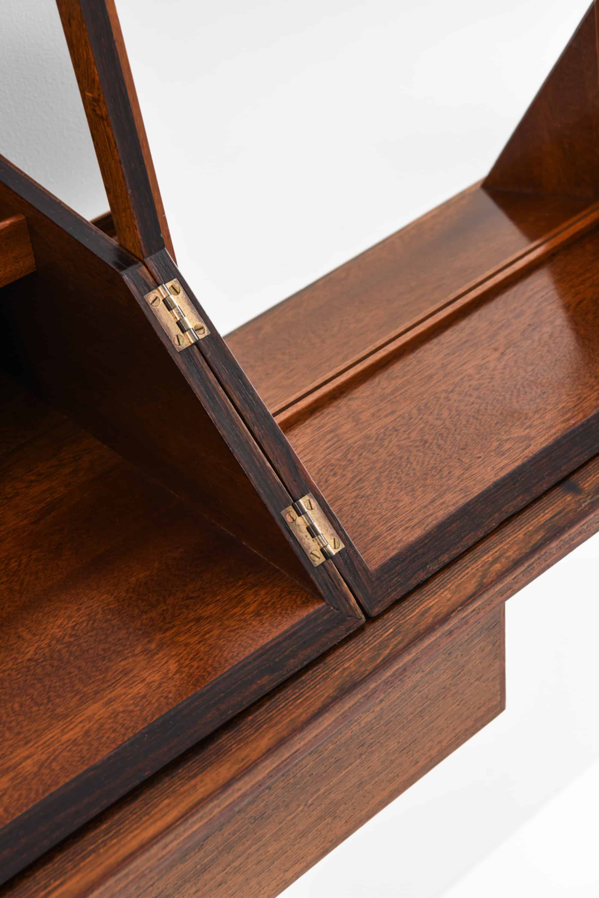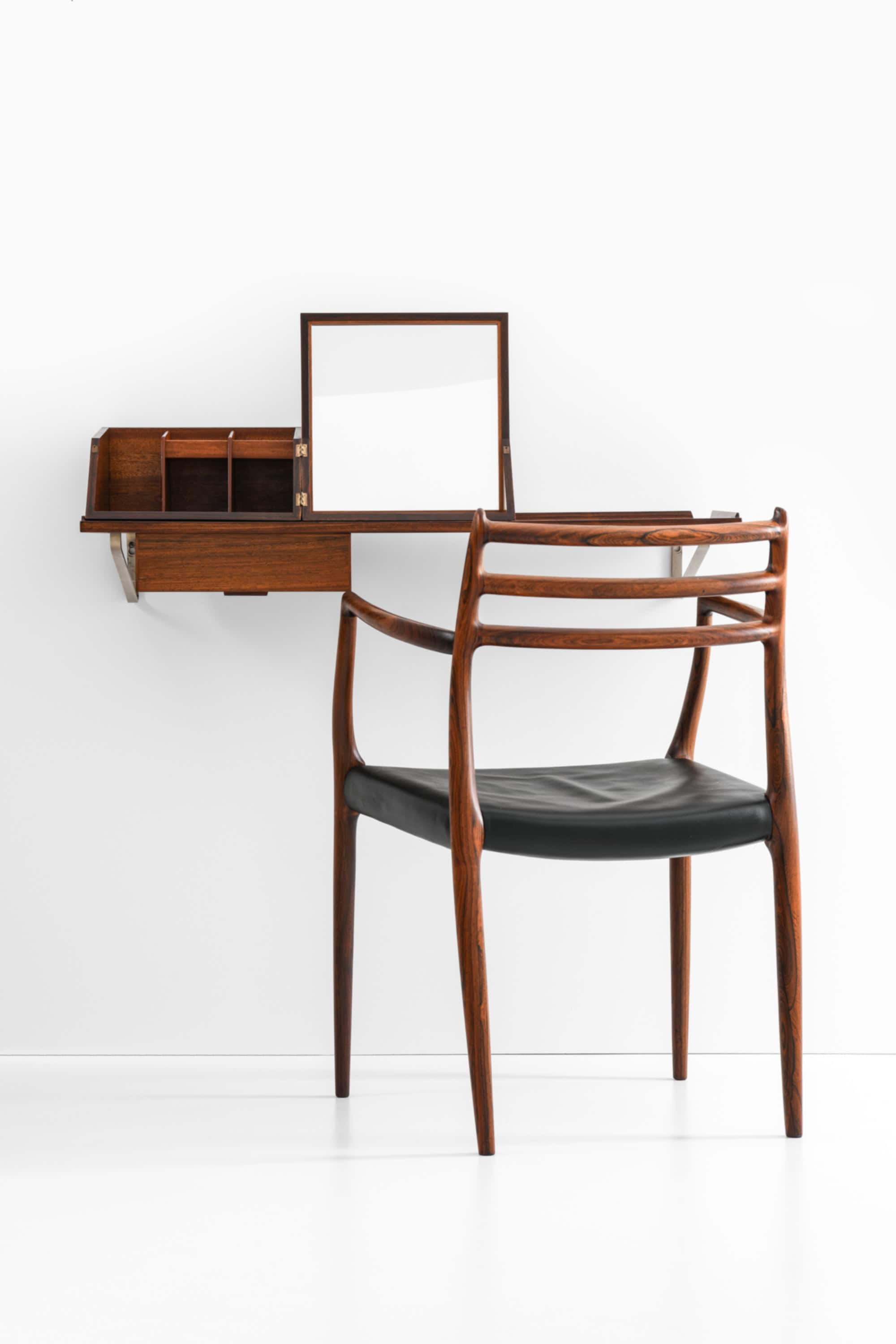 This wall-mounted table and matching vanity box were designed and crafted by cabinetmaker Jørgen Wolff in Denmark, circa 1955. Both pieces are executed in richly grained rosewood, with the box featuring a mahogany interior, an integrated mirror, and multiple compartment dividers. The combination demonstrates the Danish cabinetmaker tradition at its highest standard, where functional clarity meets refined joinery and material sensibility.