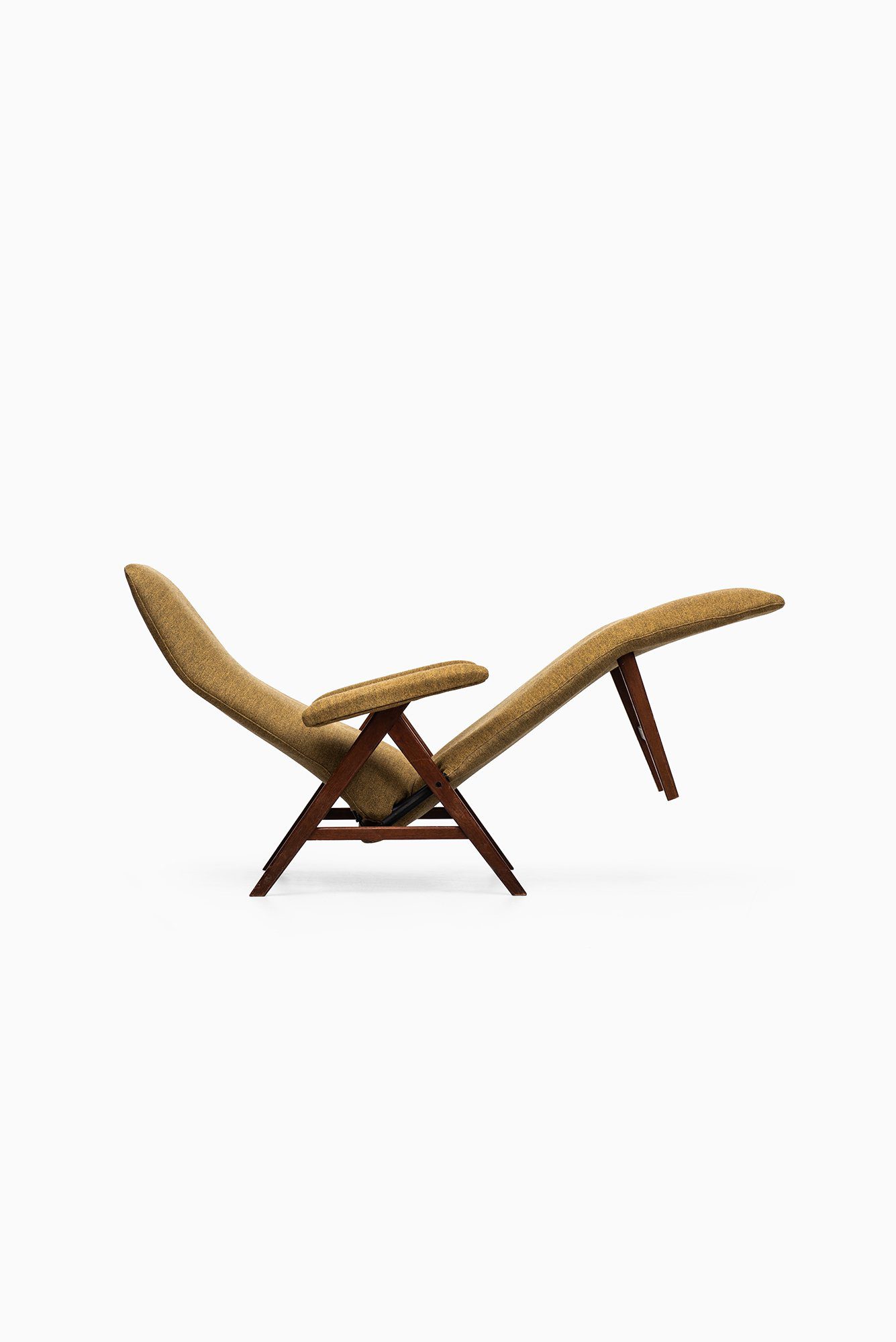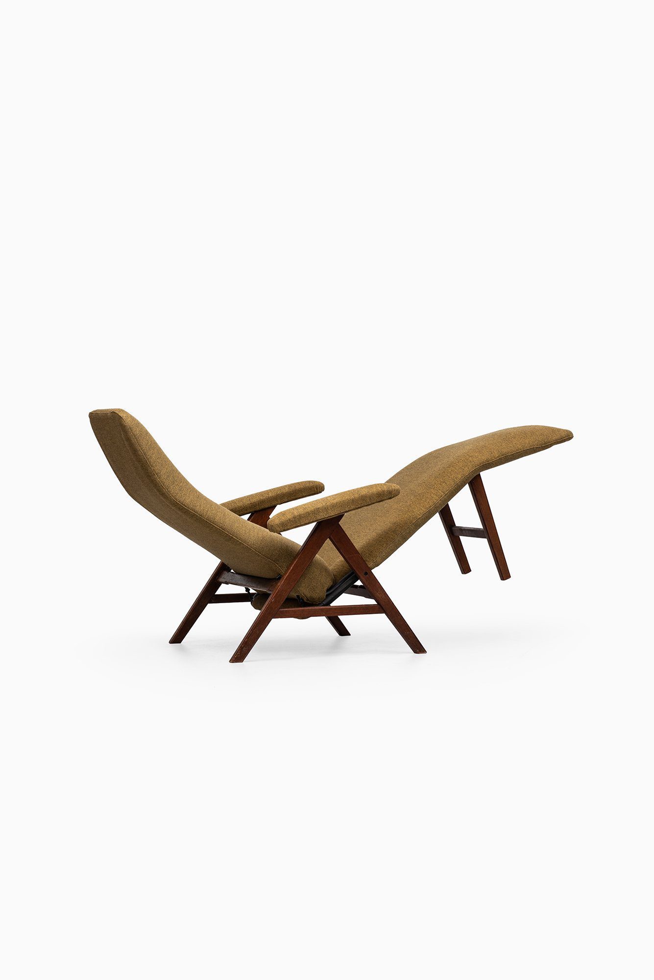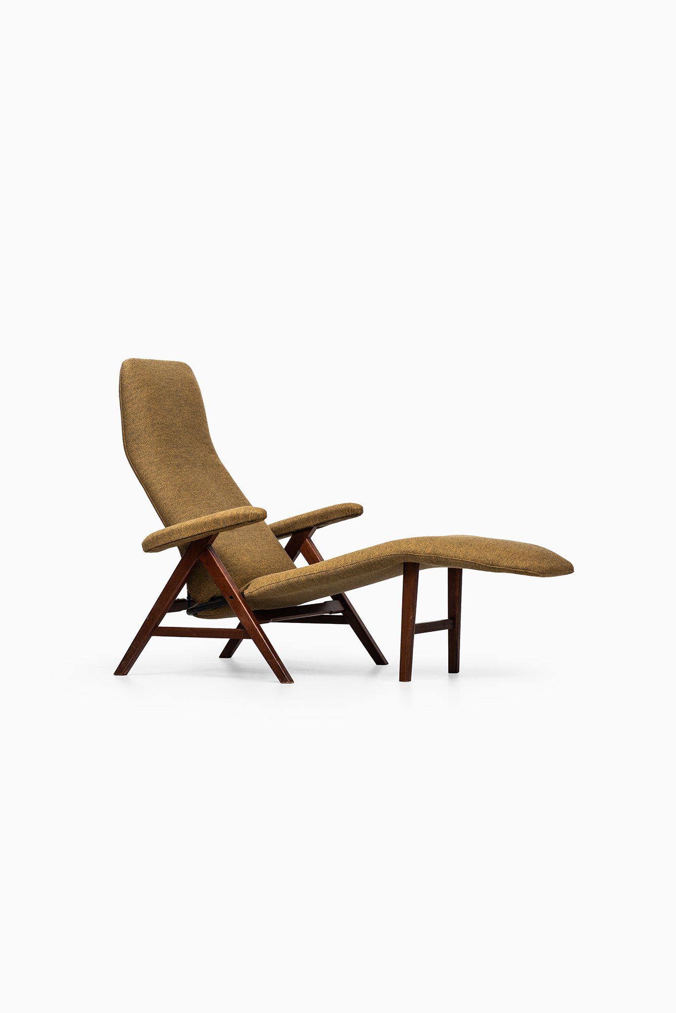 This rare reclining lounge chair was designed by Henry Walter Klein and produced by Bramin Møbler in Denmark during the 1960s. The chair is constructed with a solid teak frame and upholstered in a textured green wool fabric, a combination that reflects the natural material palette characteristic of Scandinavian modern design. The warm tone of the teak contrasts harmoniously with the muted olive-green upholstery, creating a visually balanced and inviting appearance.