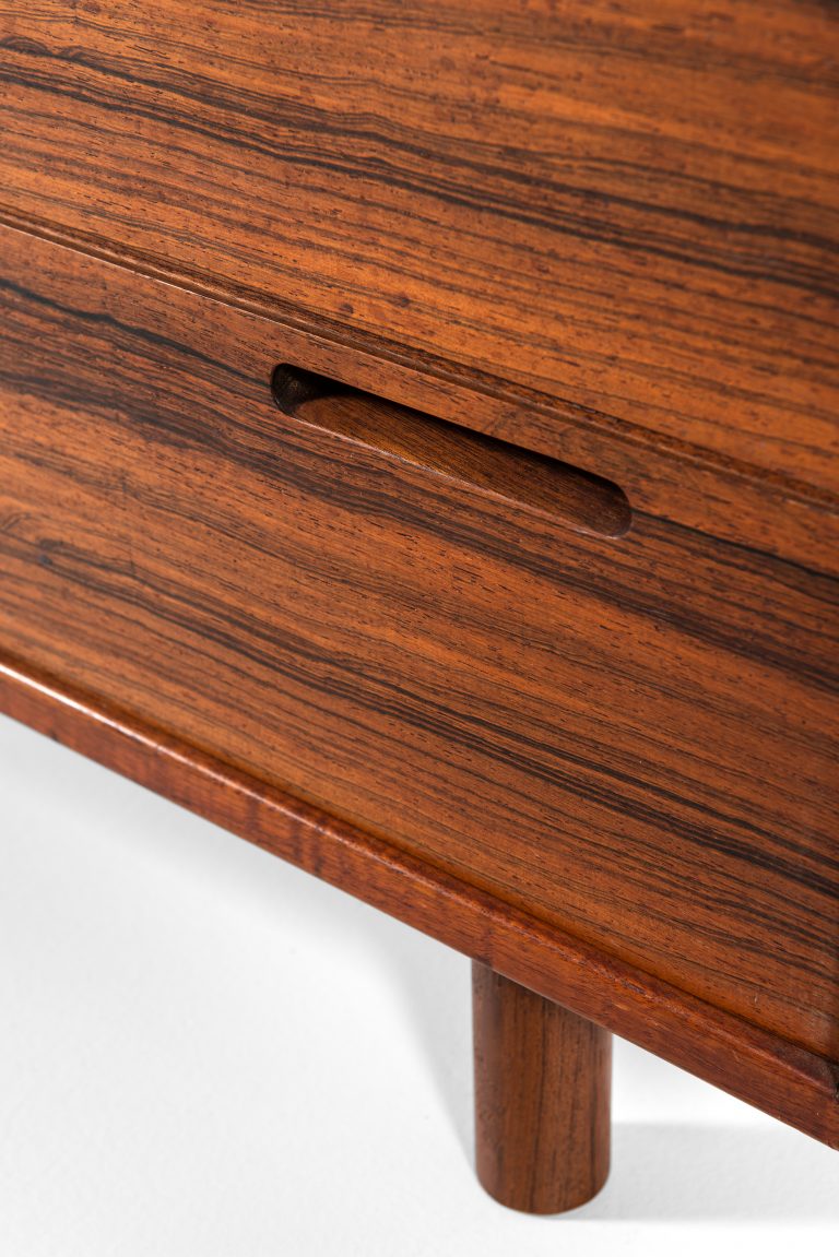 This rare bureau or chest of drawers, designed by Ib Kofod-Larsen and produced by Fredericia Møbelfabrik in Denmark, is a refined example of mid-century Danish cabinetmaking. Executed in rosewood, the piece exemplifies Kofod-Larsen’s mastery in combining sculptural detailing with functional clarity, and his sensitivity to material expression.