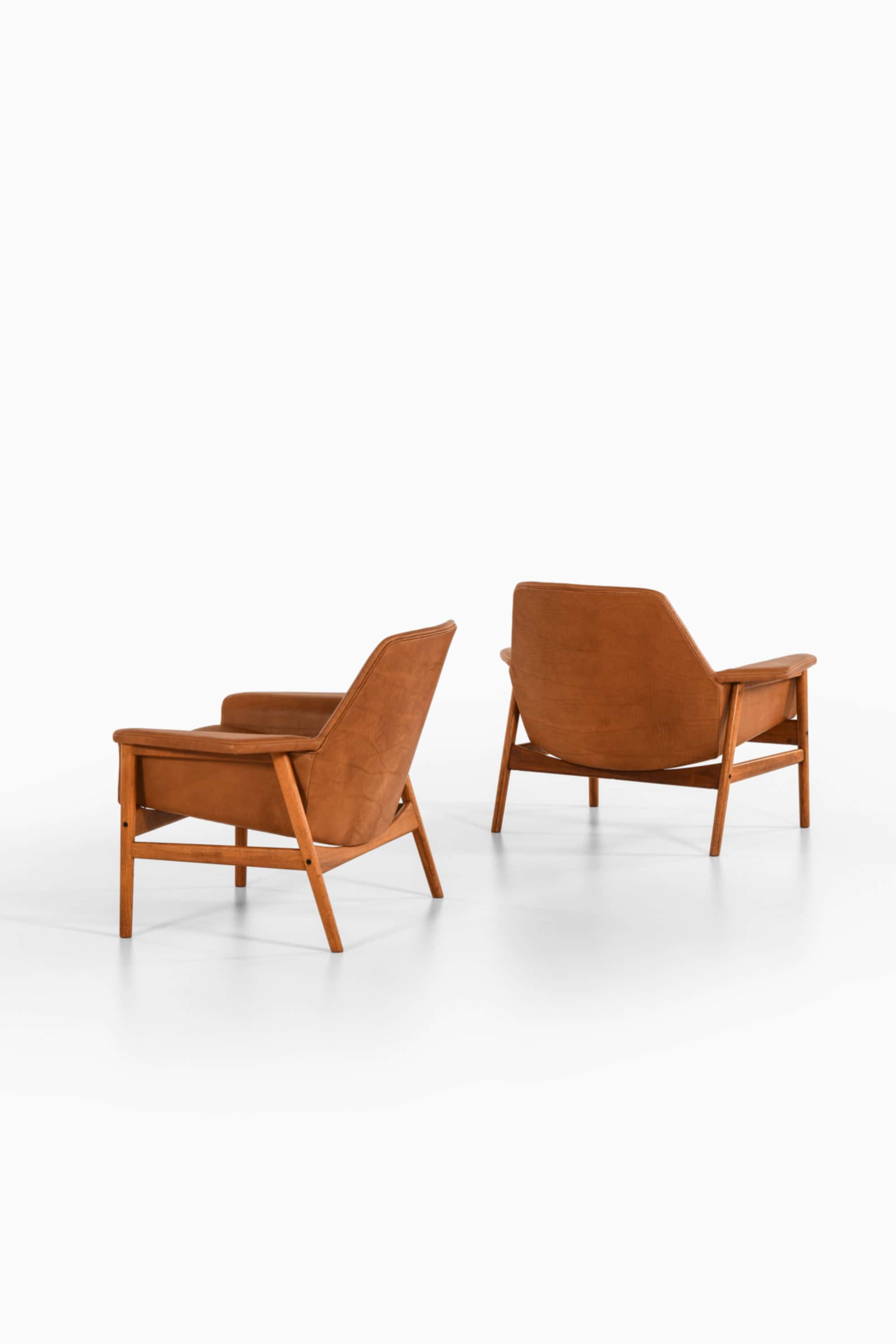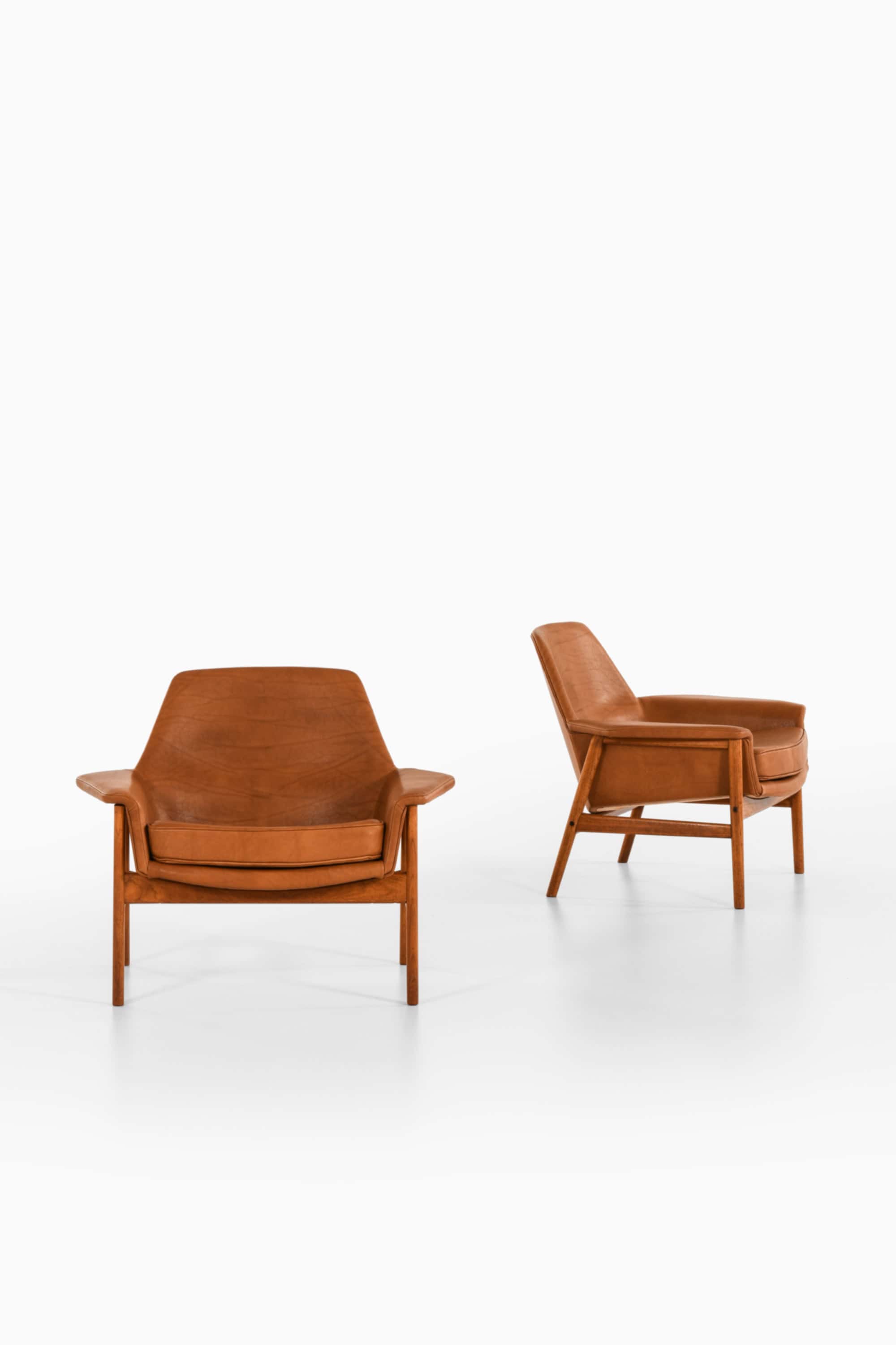 This very rare pair of wide easy chairs was designed by Ib Kofod-Larsen and produced by OPE in Sweden in 1958. The chairs are constructed with solid teak frames combined with generously proportioned upholstered elements, resulting in a design that emphasizes both comfort and sculptural clarity. The silhouette is broad and low, with a slightly reclined backrest and wide armrests that extend forward in a continuous, gently curved line.