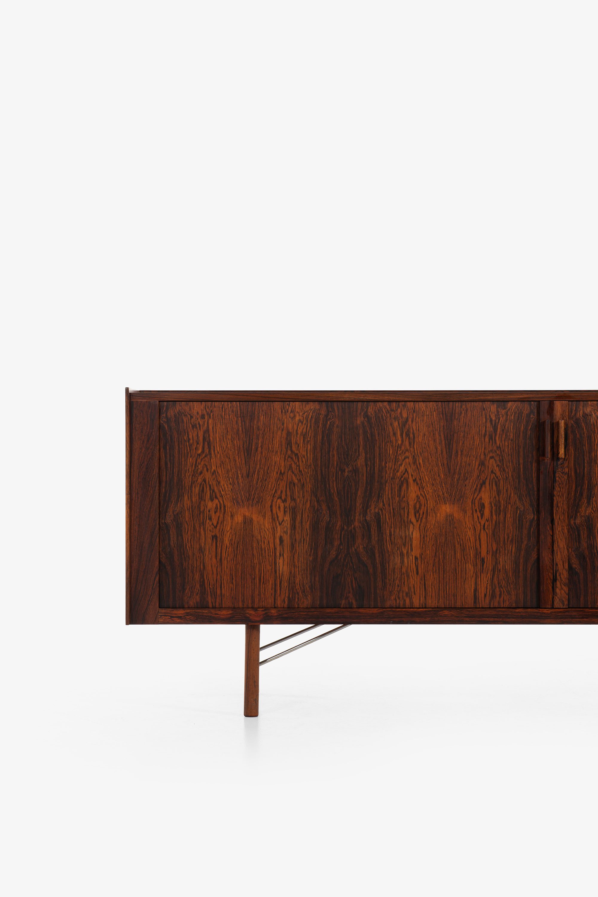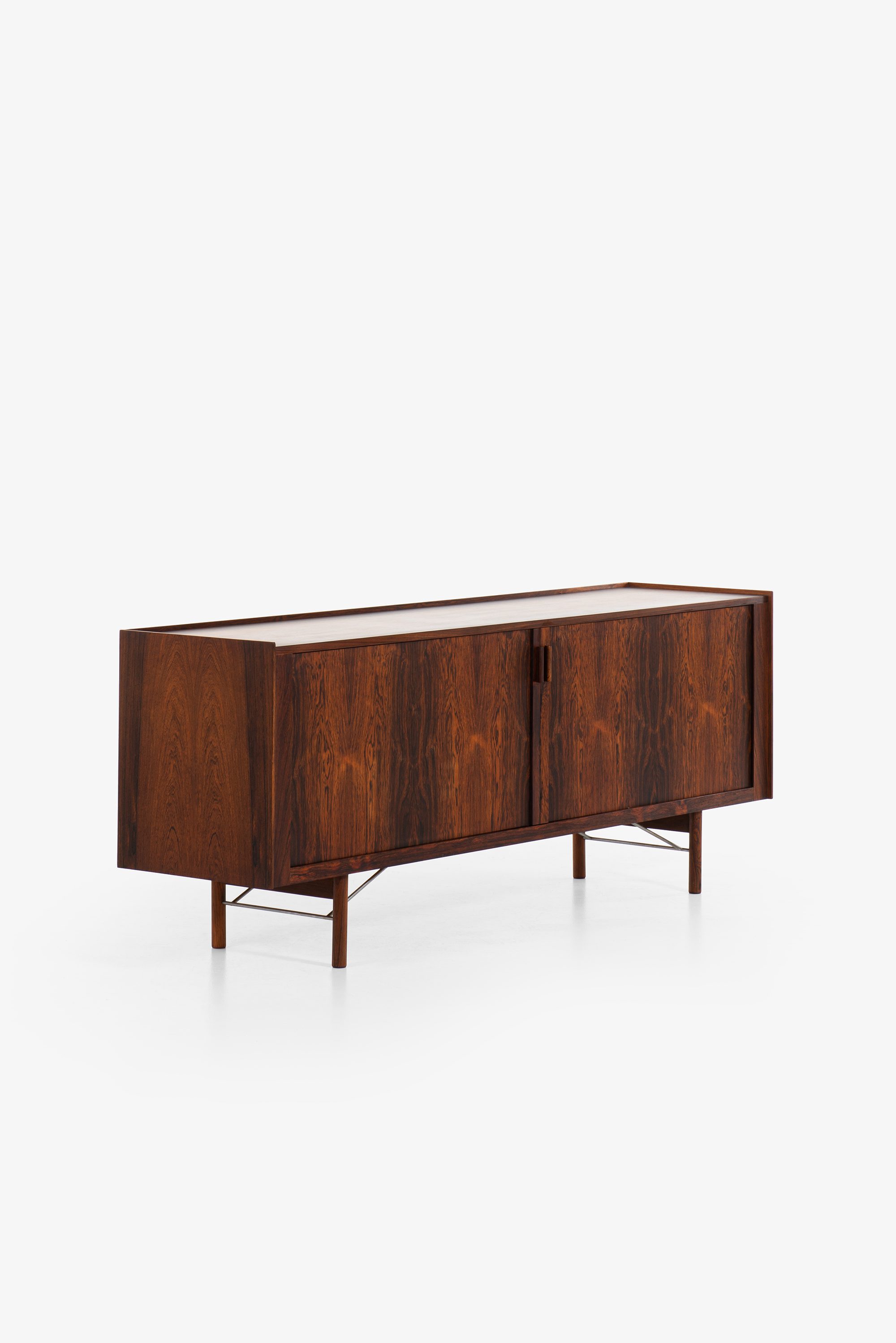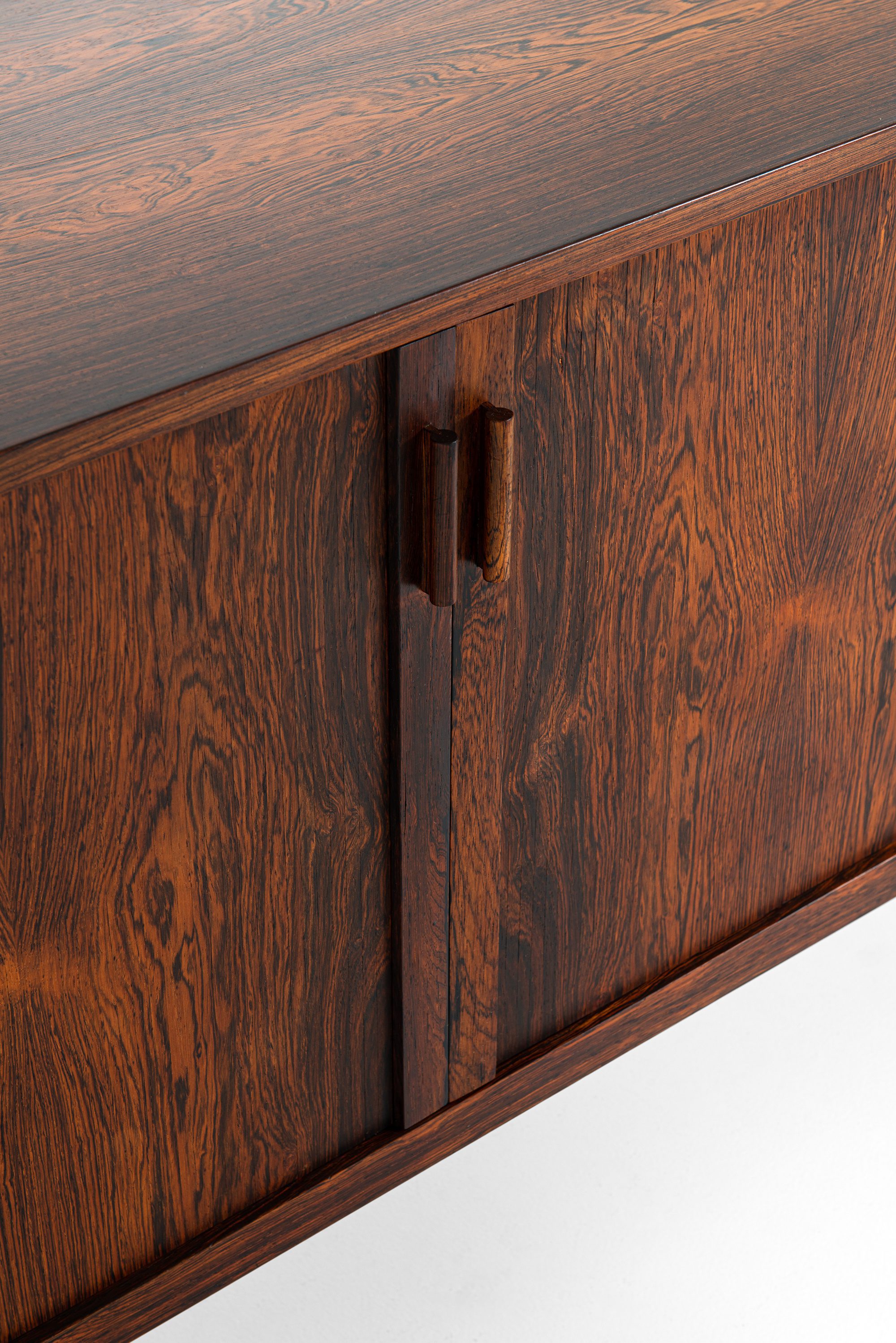 The sideboard is constructed from richly grained rosewood, offering a deep, warm tone with prominent figure throughout the case, doors, and top. The vertical symmetry and book-matched panels contribute to a balanced and sophisticated appearance. The front is fitted with a pair of integrated vertical handles in solid rosewood, subtly projecting from the doors with sculptural tactility, preserving the minimalist aesthetic. The doors open to reveal an interior of light birch or maple with fitted shelves and sliding drawers, some of which retain their original green felt lining.