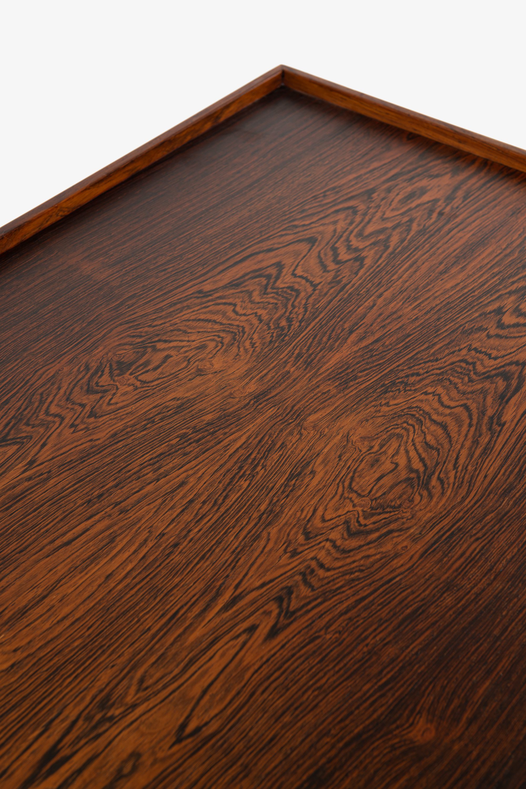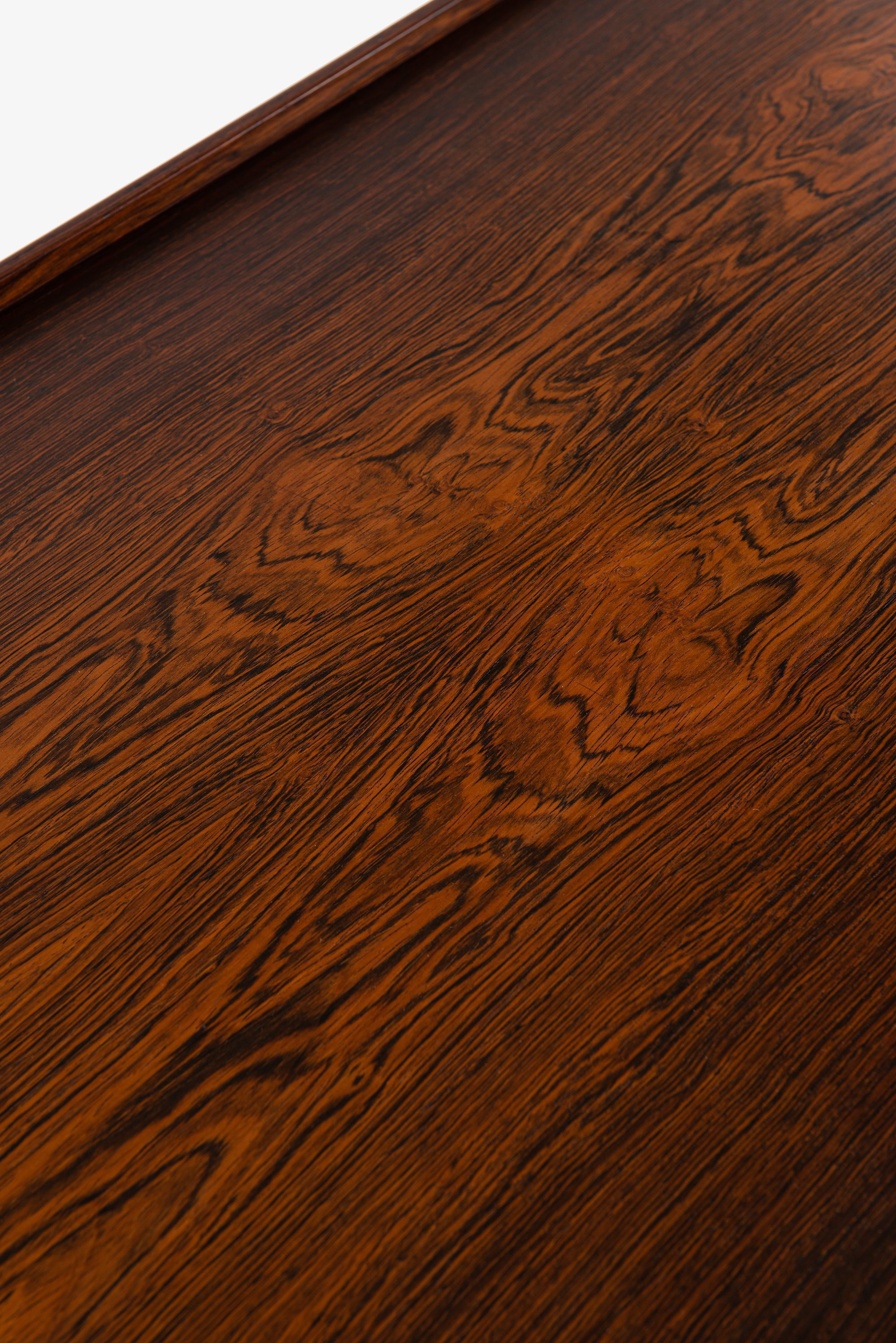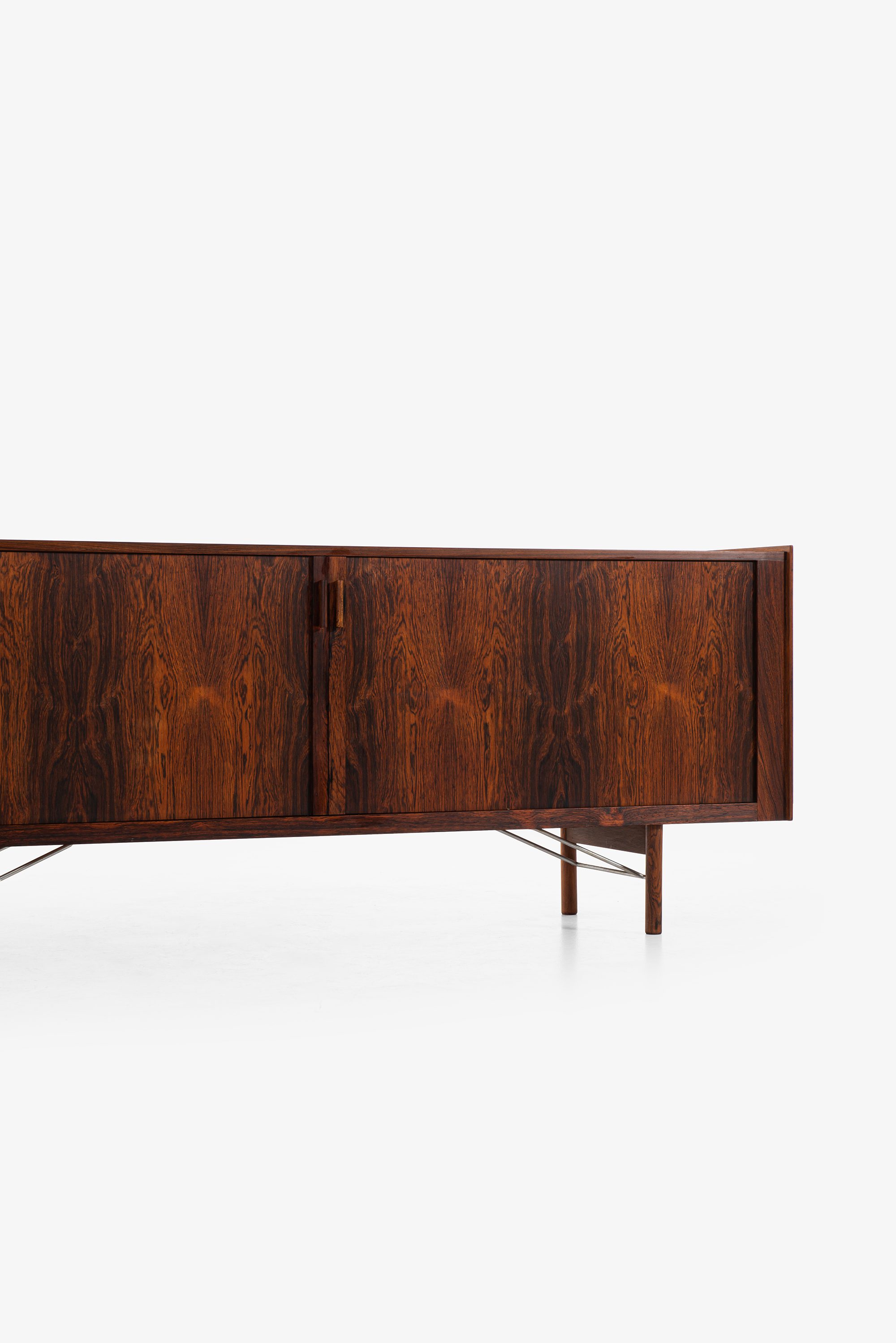 The sideboard is constructed from richly grained rosewood, offering a deep, warm tone with prominent figure throughout the case, doors, and top. The vertical symmetry and book-matched panels contribute to a balanced and sophisticated appearance. The front is fitted with a pair of integrated vertical handles in solid rosewood, subtly projecting from the doors with sculptural tactility, preserving the minimalist aesthetic. The doors open to reveal an interior of light birch or maple with fitted shelves and sliding drawers, some of which retain their original green felt lining.