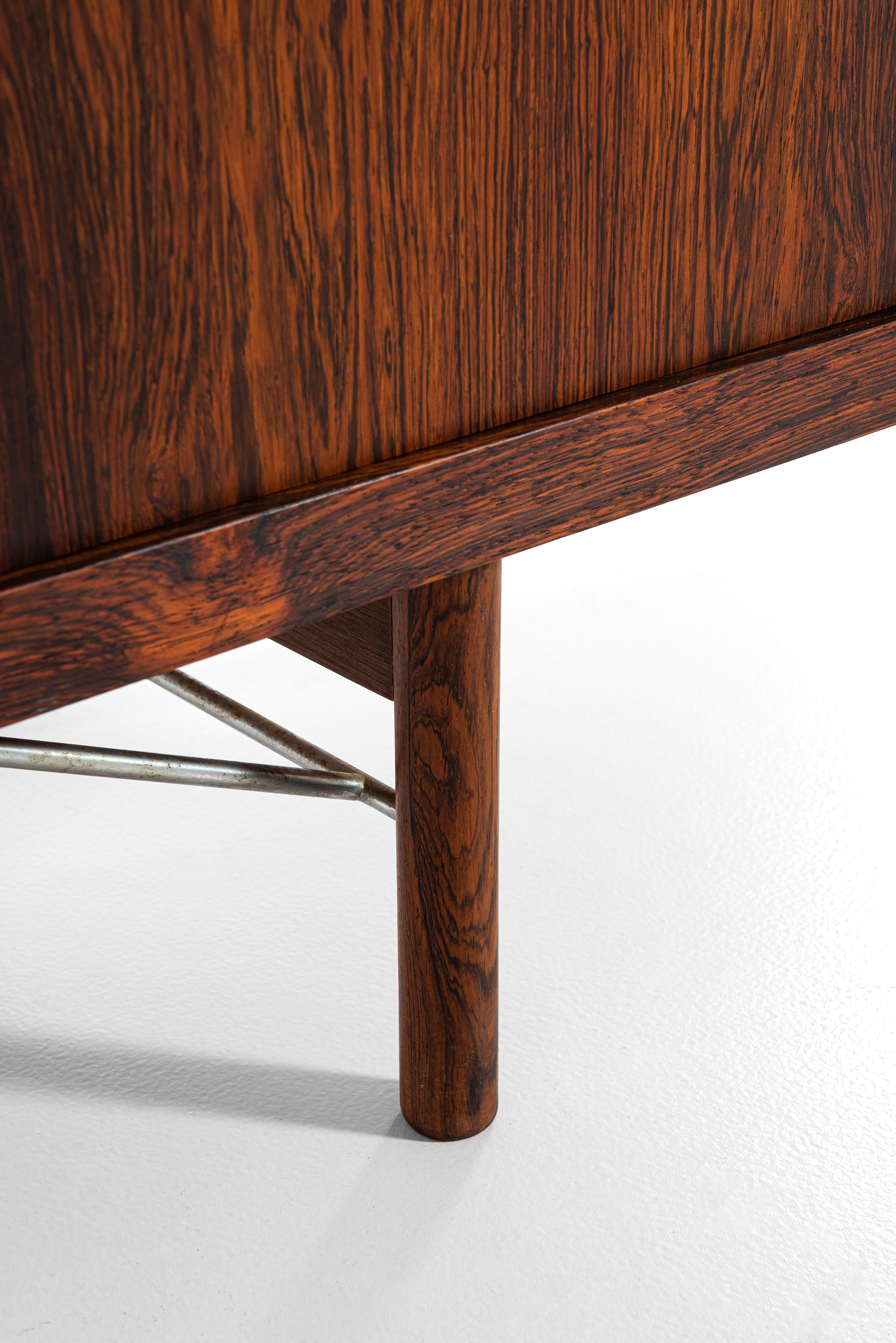 Supporting the cabinet is a raised base consisting of turned cylindrical legs, reinforced by steel stretchers arranged in a cross-braced geometry. The structural metal elements are minimal yet effective, offering a visual counterpoint to the organic rosewood grain while providing enhanced stability and architectural presence.
