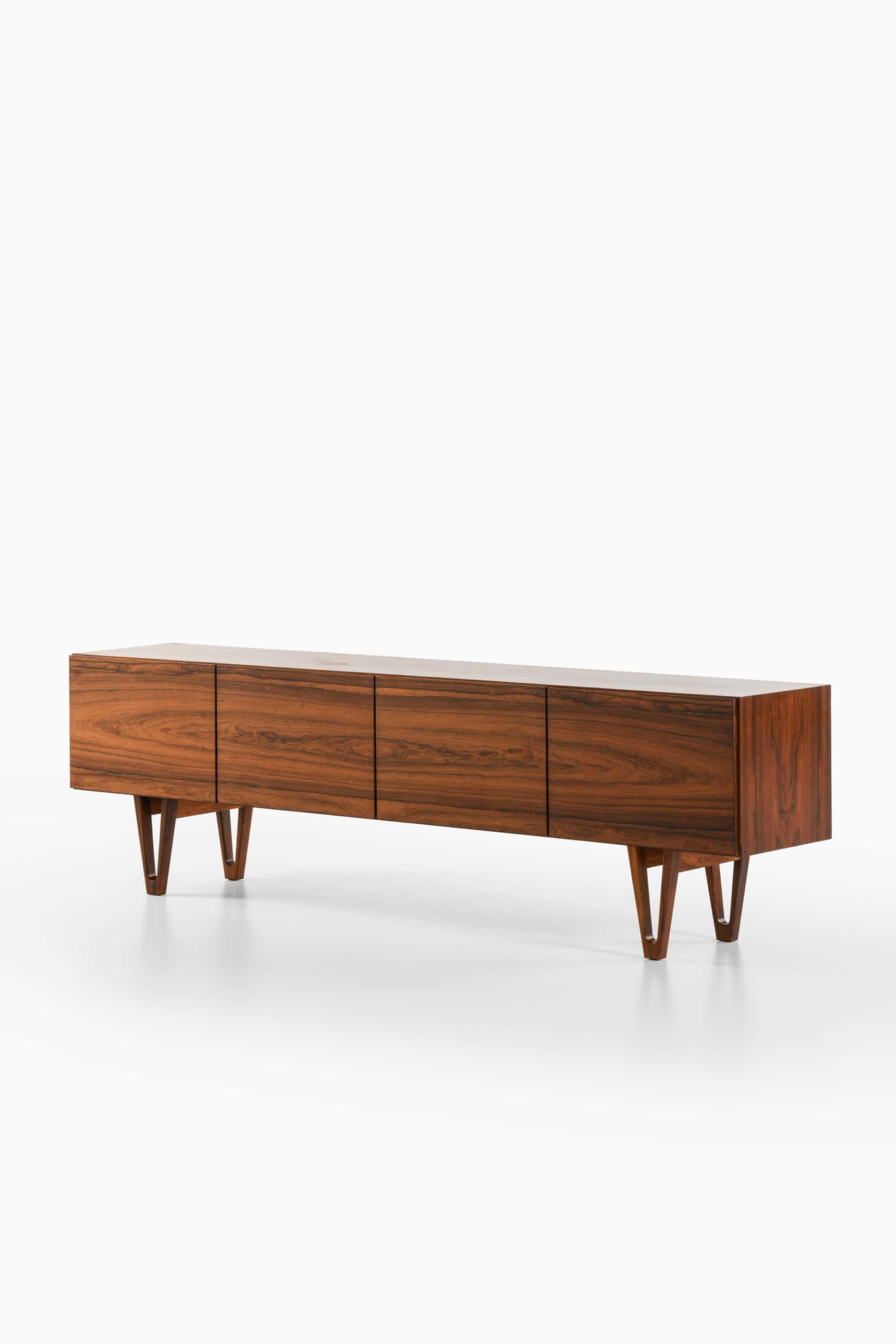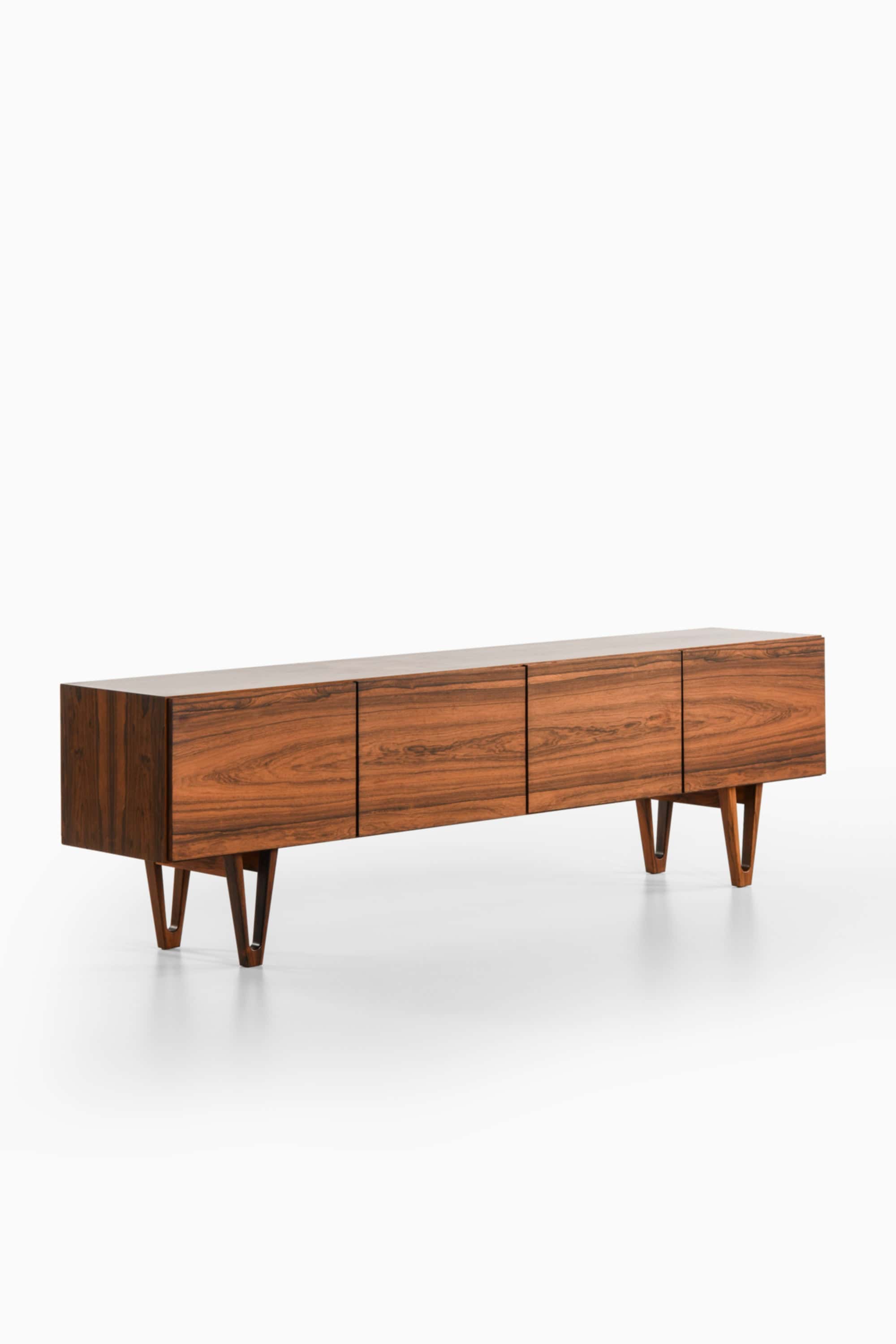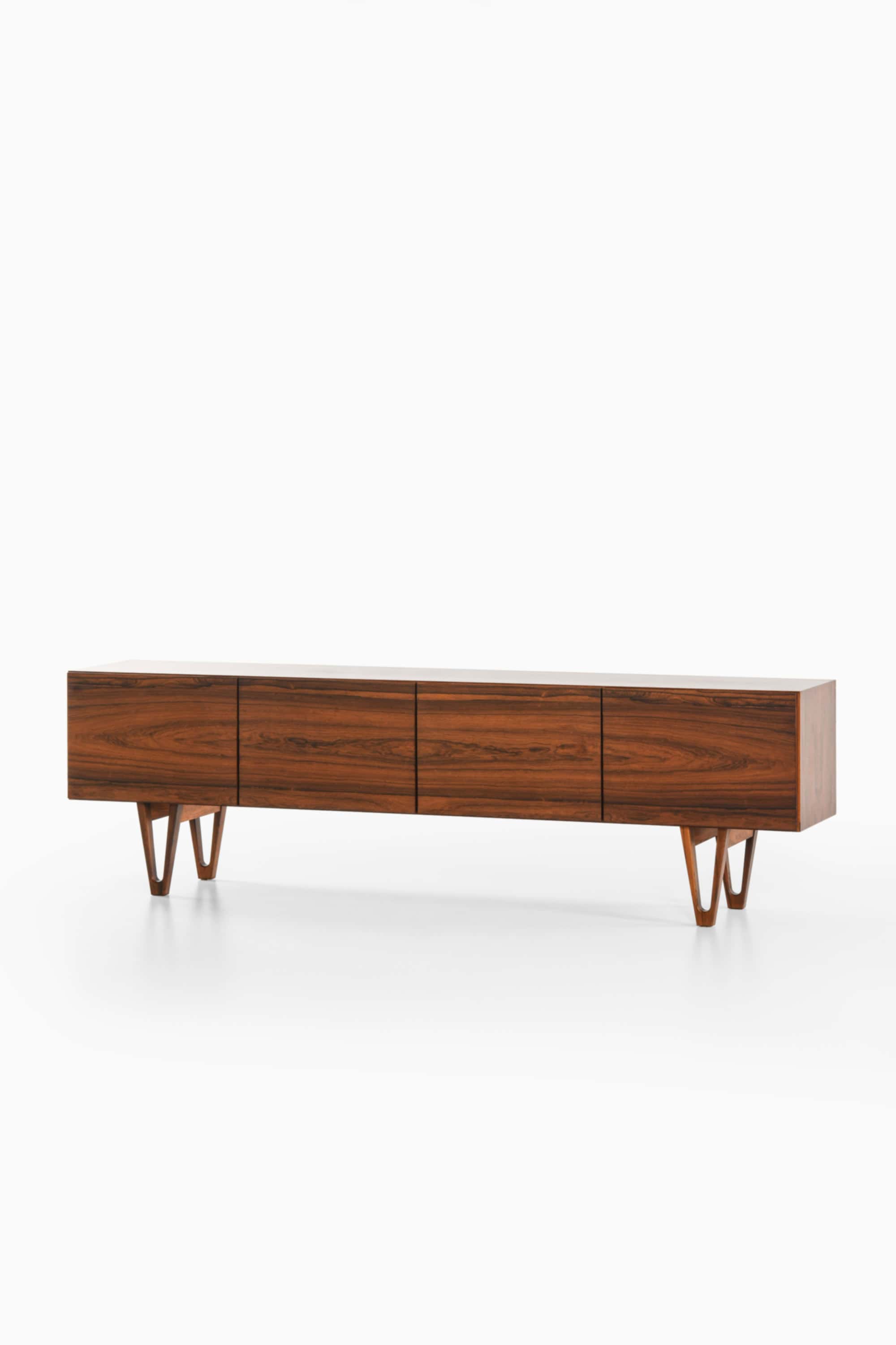 This rare sideboard, model Trol, was designed by Ib Kofod-Larsen and produced by Seffle Möbelfabrik in Sweden during the 1950s. The piece is executed in rosewood with a rich surface marked by expressive grain patterns and deep tonal variation. The long rectangular cabinet rests on sculptural, V-shaped legs that are characteristic of Kofod-Larsen’s refined and architectural approach to furniture design. These legs elevate the composition visually while maintaining a stable and balanced structure.