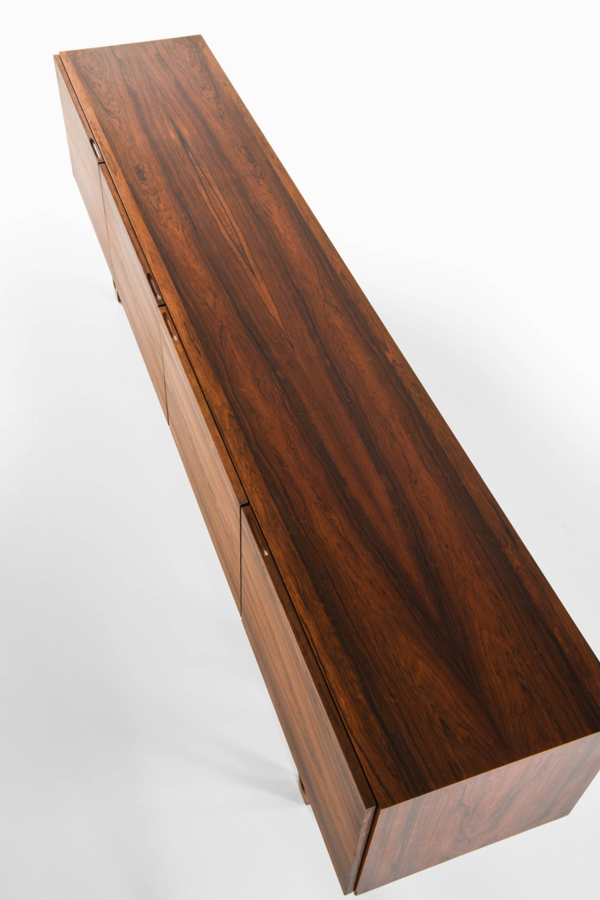 The exterior of the sideboard is formed by four front sections, each with horizontal rosewood veneers aligned to create a continuous flow of grain across the facade. The edges are sharp and clean, emphasizing the rectangular geometry of the piece. When opened, the interior reveals a functional arrangement comprising shelves and a series of drawers. The drawers are designed with contrasting light interiors that highlight the craftsmanship and thoughtful partitioning typical of Scandinavian modern cabinetry.