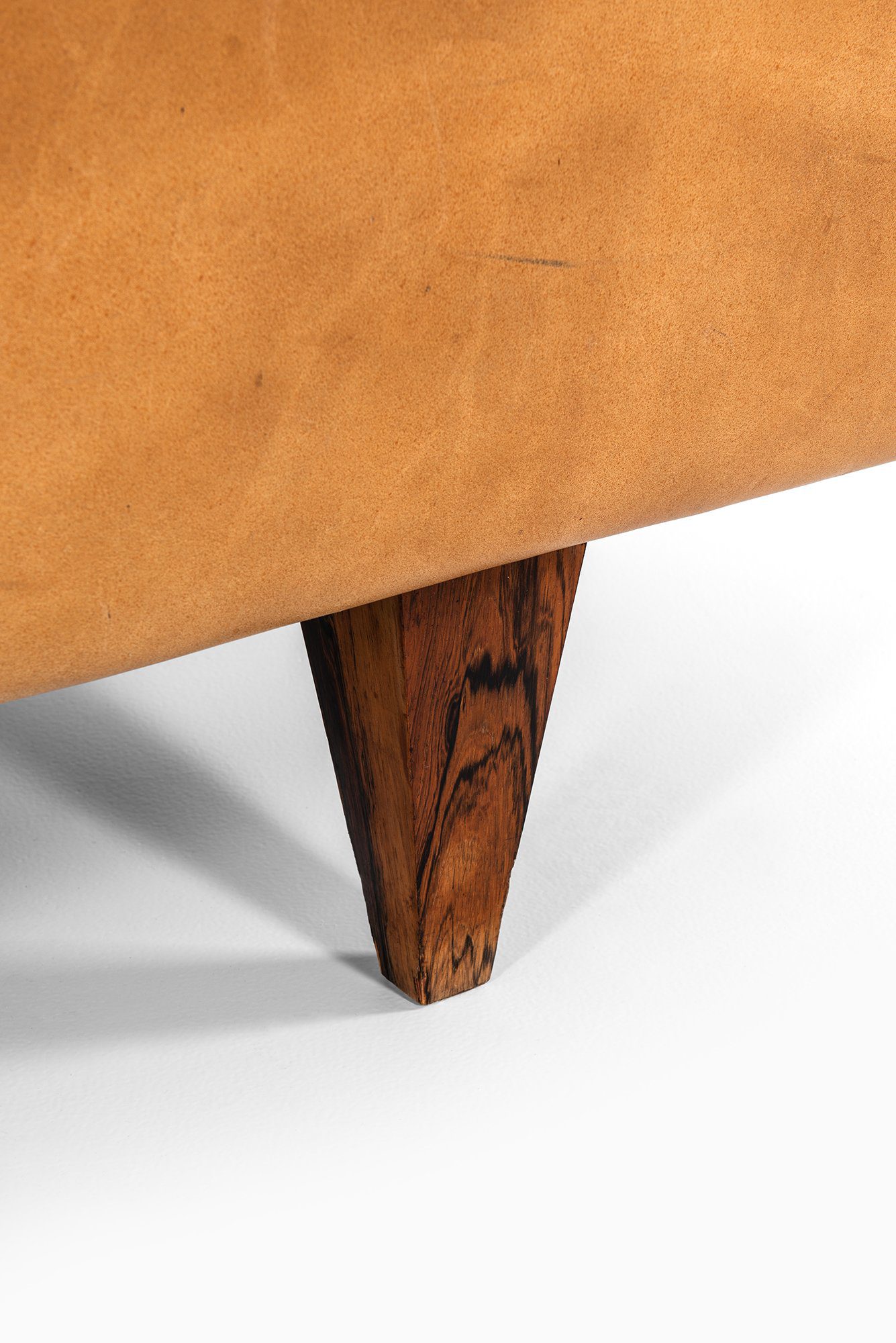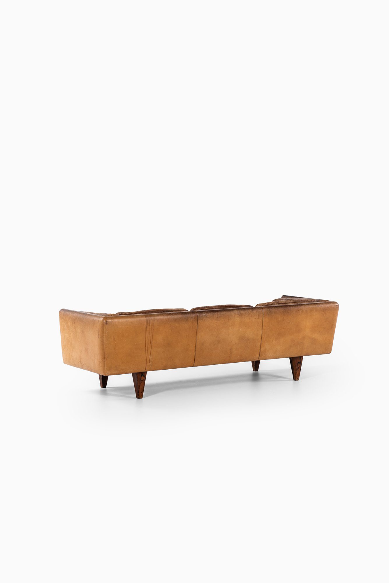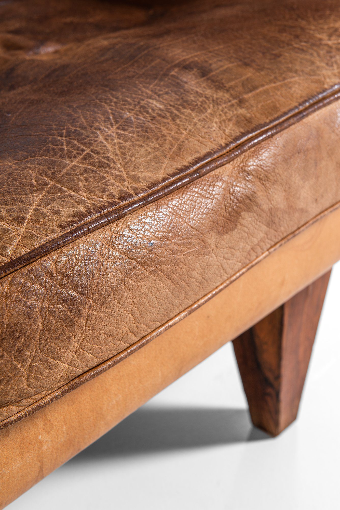 The sofa is executed in rosewood and upholstered in original cognac brown leather. The design features an enveloping form with slightly flared armrests and a deep, supportive seat. The tapered rosewood legs are angled to enhance the visual lightness of the structure, providing a contrast to the substantial, softly contoured cushions. The patinated leather displays a rich tonal variation, with natural creases and wear that accentuate the authenticity and age of the piece.