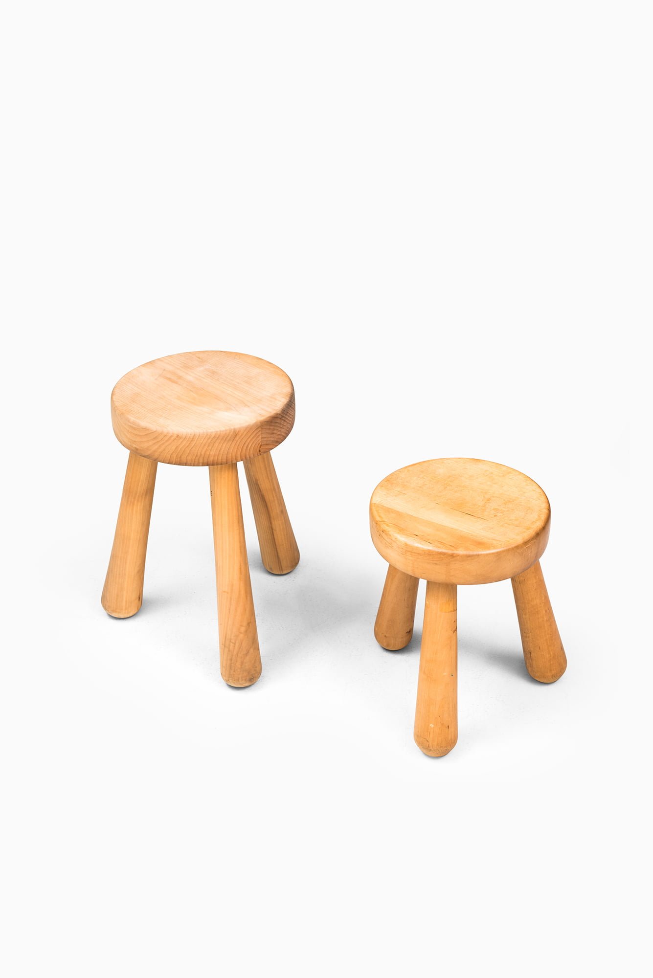 This rare stool was designed and produced by Ingvar Hildingsson in Sweden during the 1940s. It is crafted from birch, showcasing the warm, natural tone and fine grain of the wood. The stool’s design is simple yet robust, with a circular seat resting on three solid, slightly tapered legs that give it a grounded and balanced appearance. The surface displays a smooth finish, with subtle patina from age that highlights its vintage character.