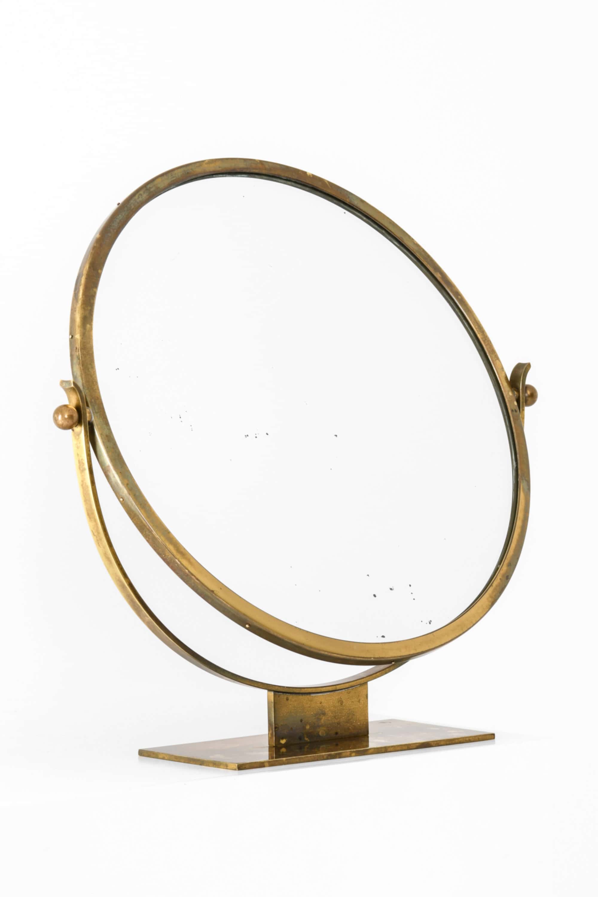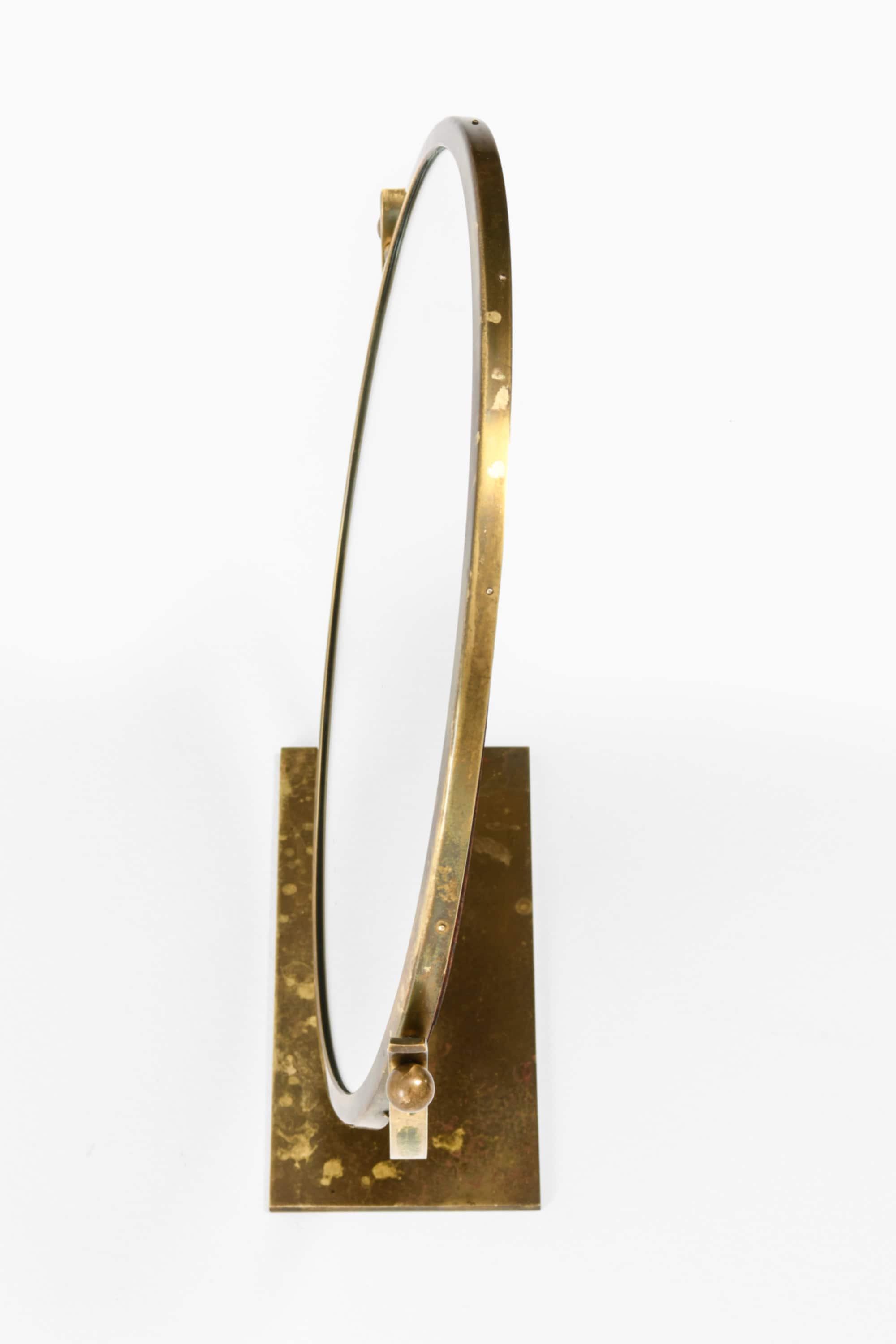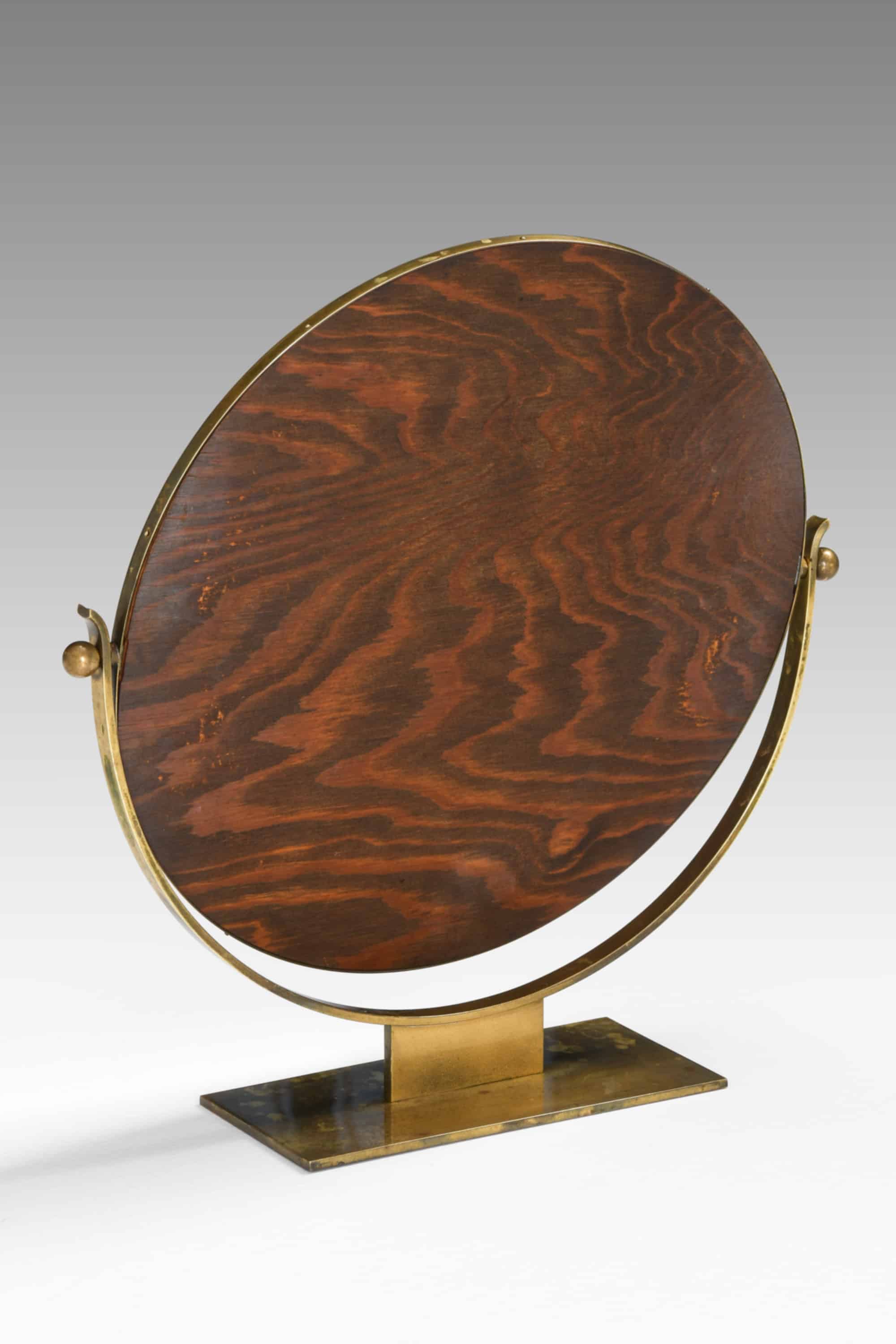This table mirror, model 4851, was designed by Ivar Ålenius-Björk and produced by Ystad Metall in Sweden after 1942. The mirror features a circular reflective surface held within a thin brass frame, mounted on a pivoting axis that allows for angle adjustment. The frame is supported by a rectangular brass base, giving it a stable and balanced stance. The back of the mirror is finished with a warm-toned wood panel, providing a subtle contrast to the brass structure and enhancing the overall material richness.
