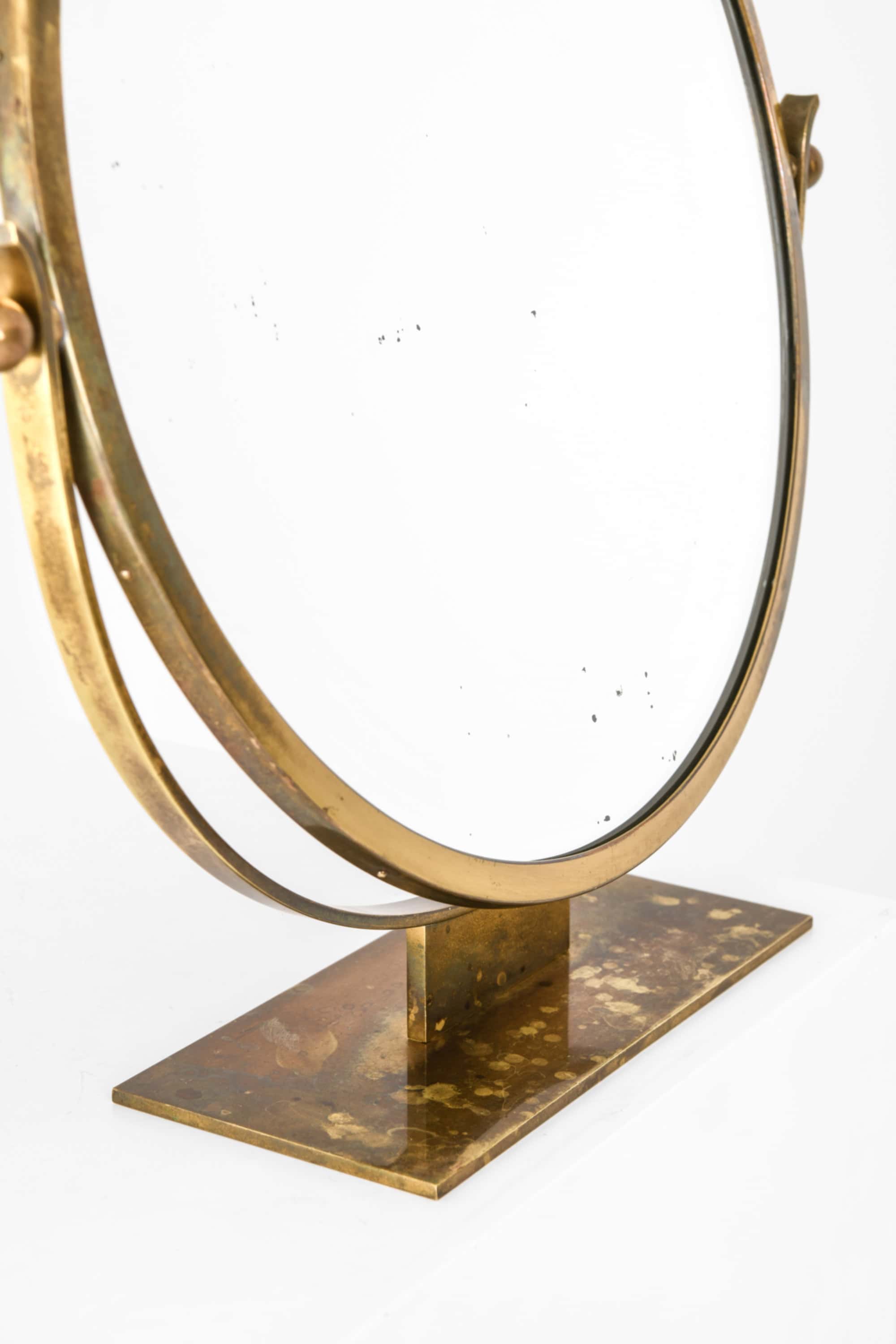 The condition is good vintage with visible signs of age and patina, including surface marks and oxidation that lend character and authenticity to the piece. The mirror glass shows small age-related spots, typical for a piece of this period, and the brass has developed a warm, naturally aged finish.