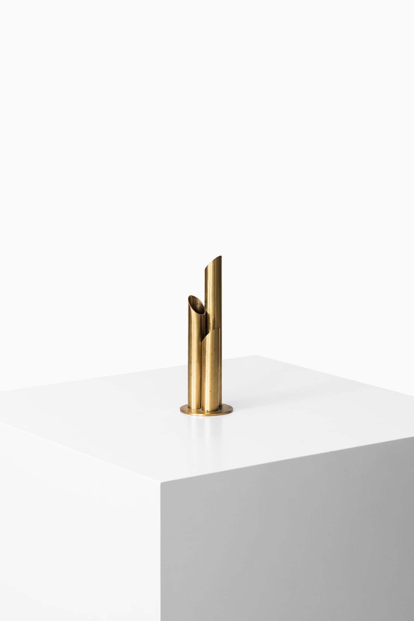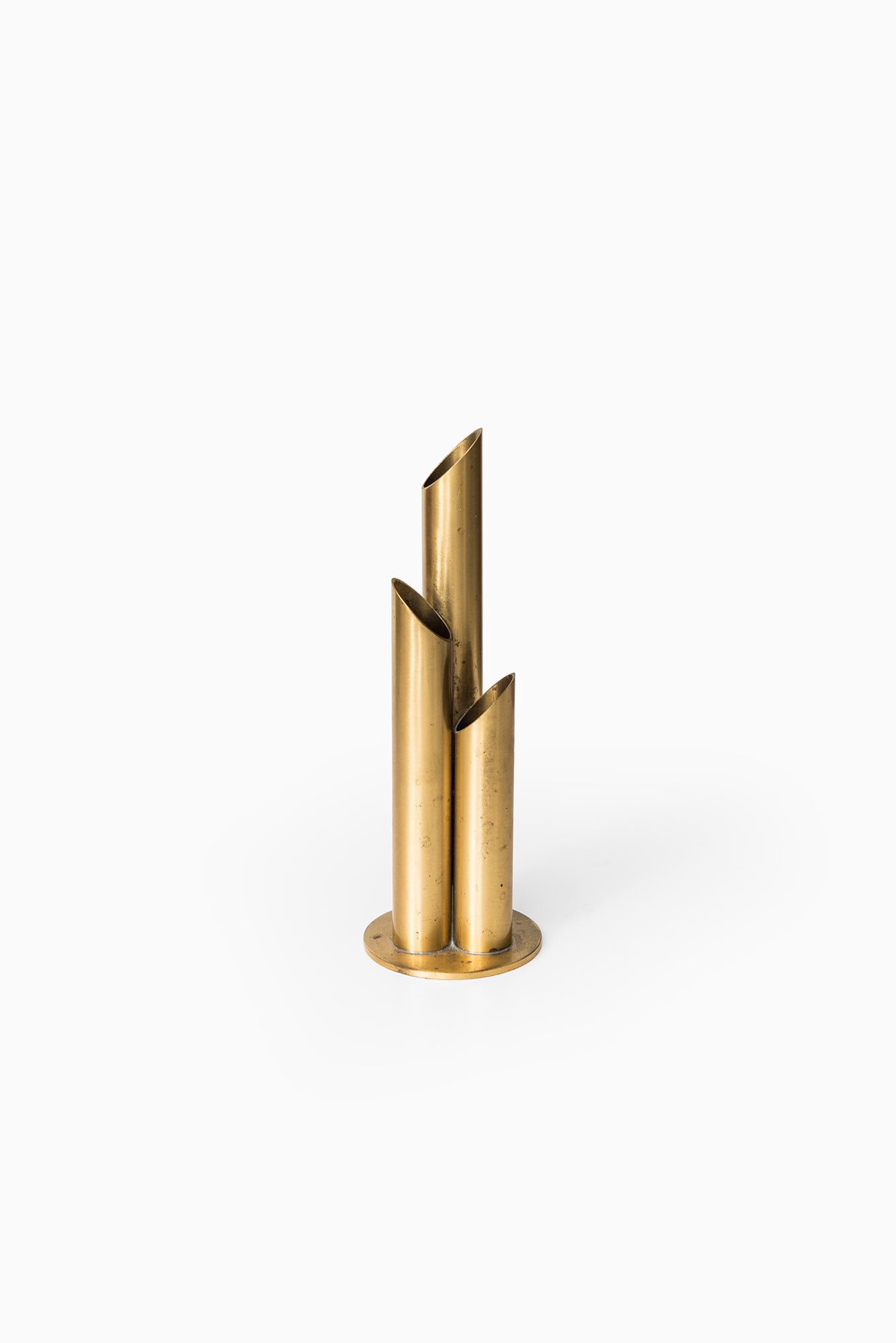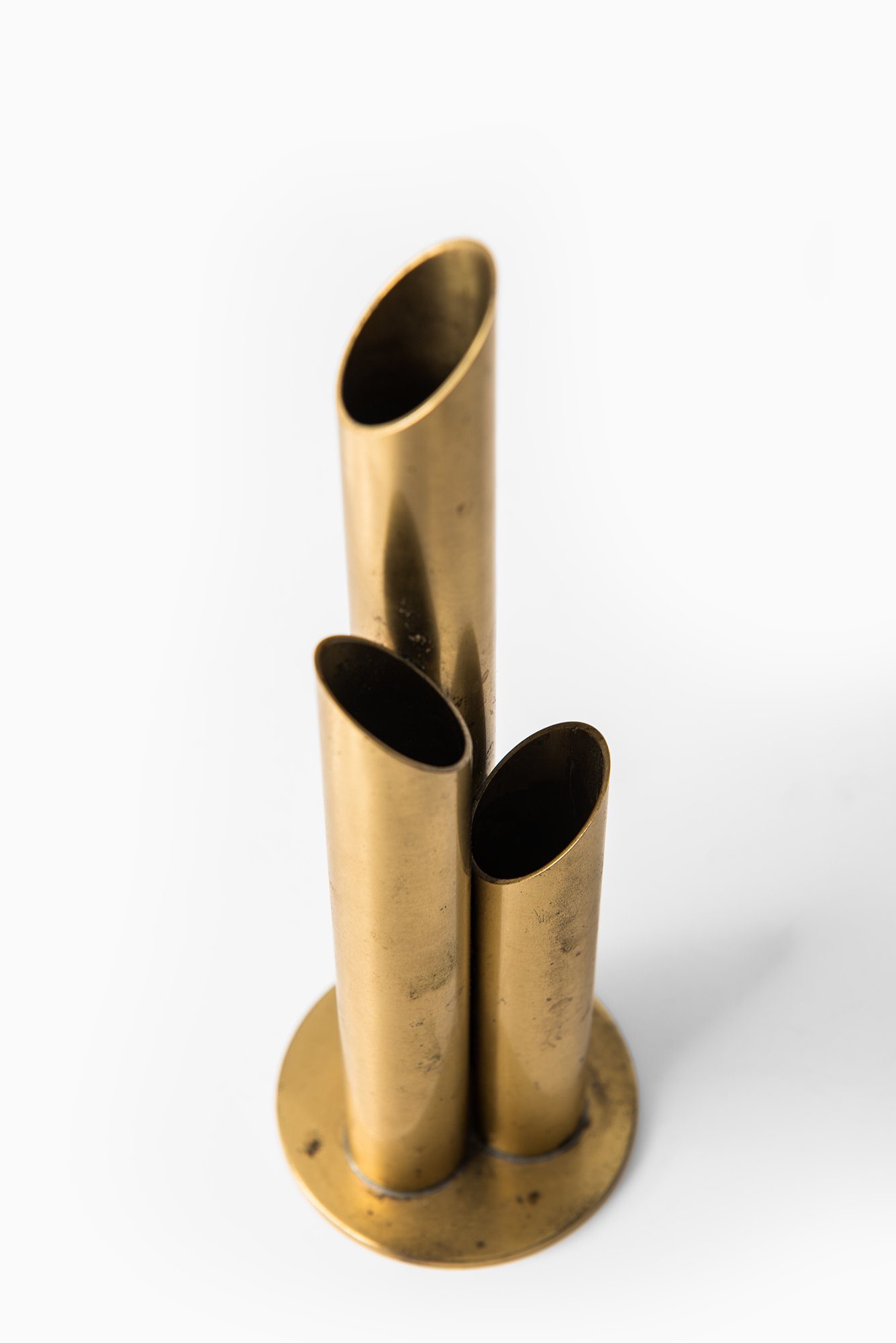 This rare Art Deco vase was designed by Ivar Ålenius-Björk and produced by Ystad Metall in Sweden during the 1930s. The form consists of three cylindrical brass tubes of varying heights, each with an angled opening, joined together on a circular base. The staggered arrangement creates a vertical rhythm, while the angled cuts soften the geometry, giving the piece a sense of movement and sculptural depth. The polished brass surface has developed a warm patina, with light traces of age consistent with its vintage condition.