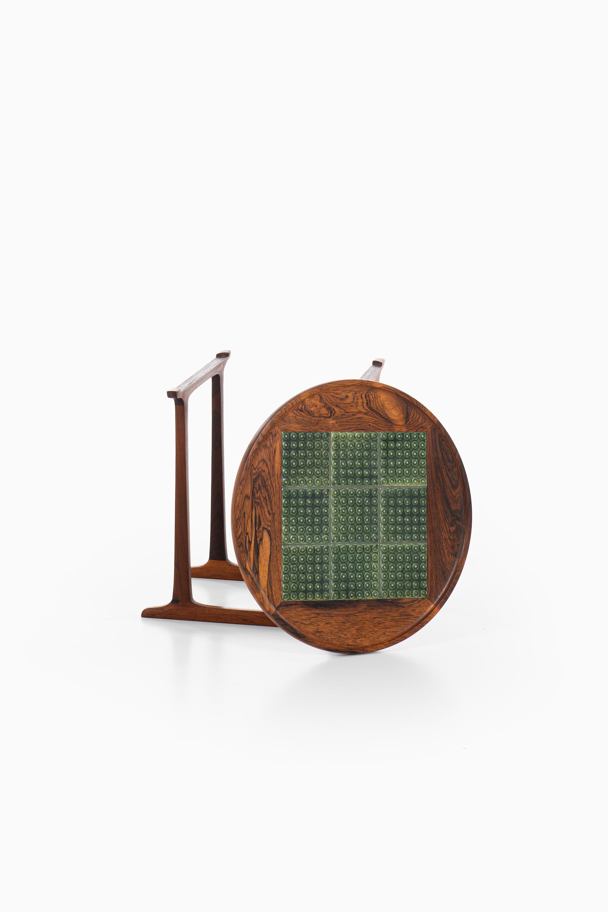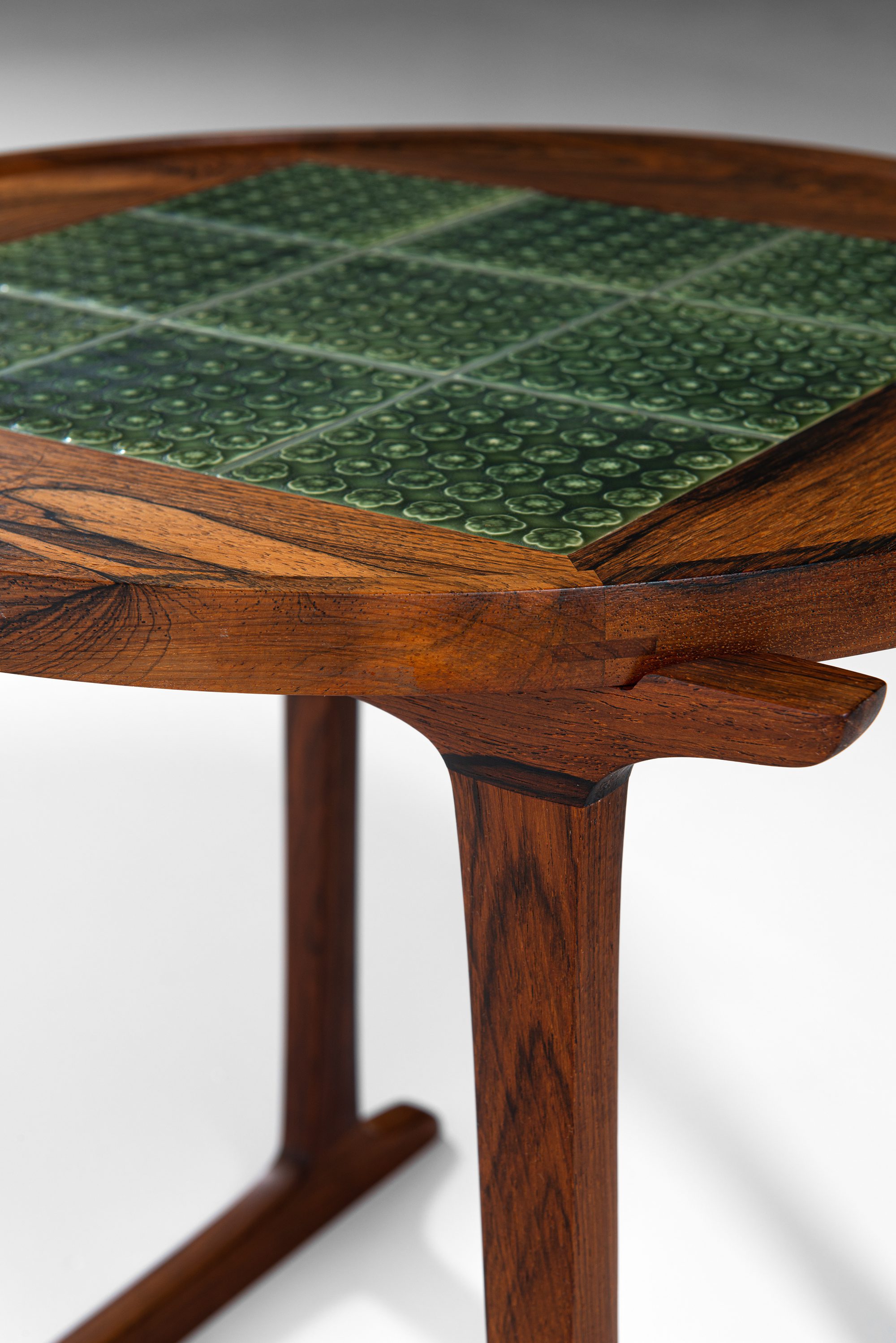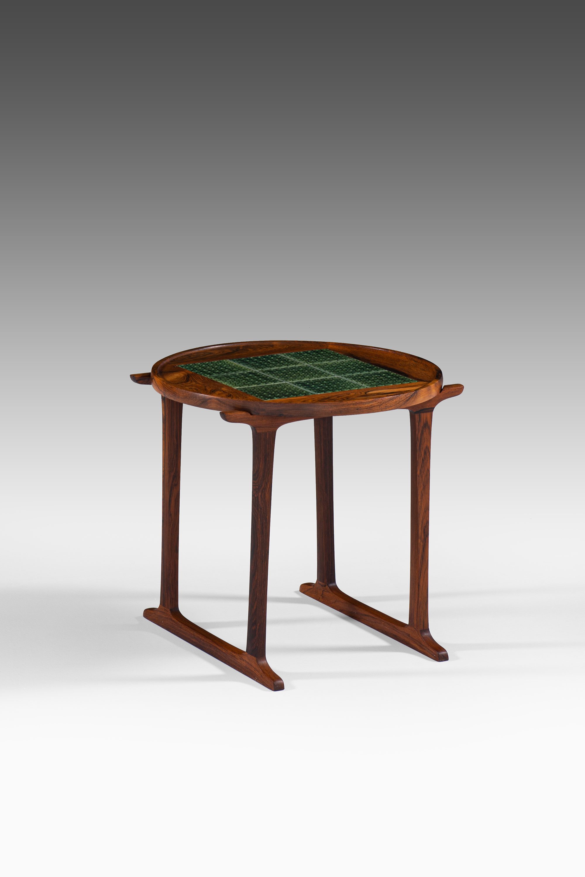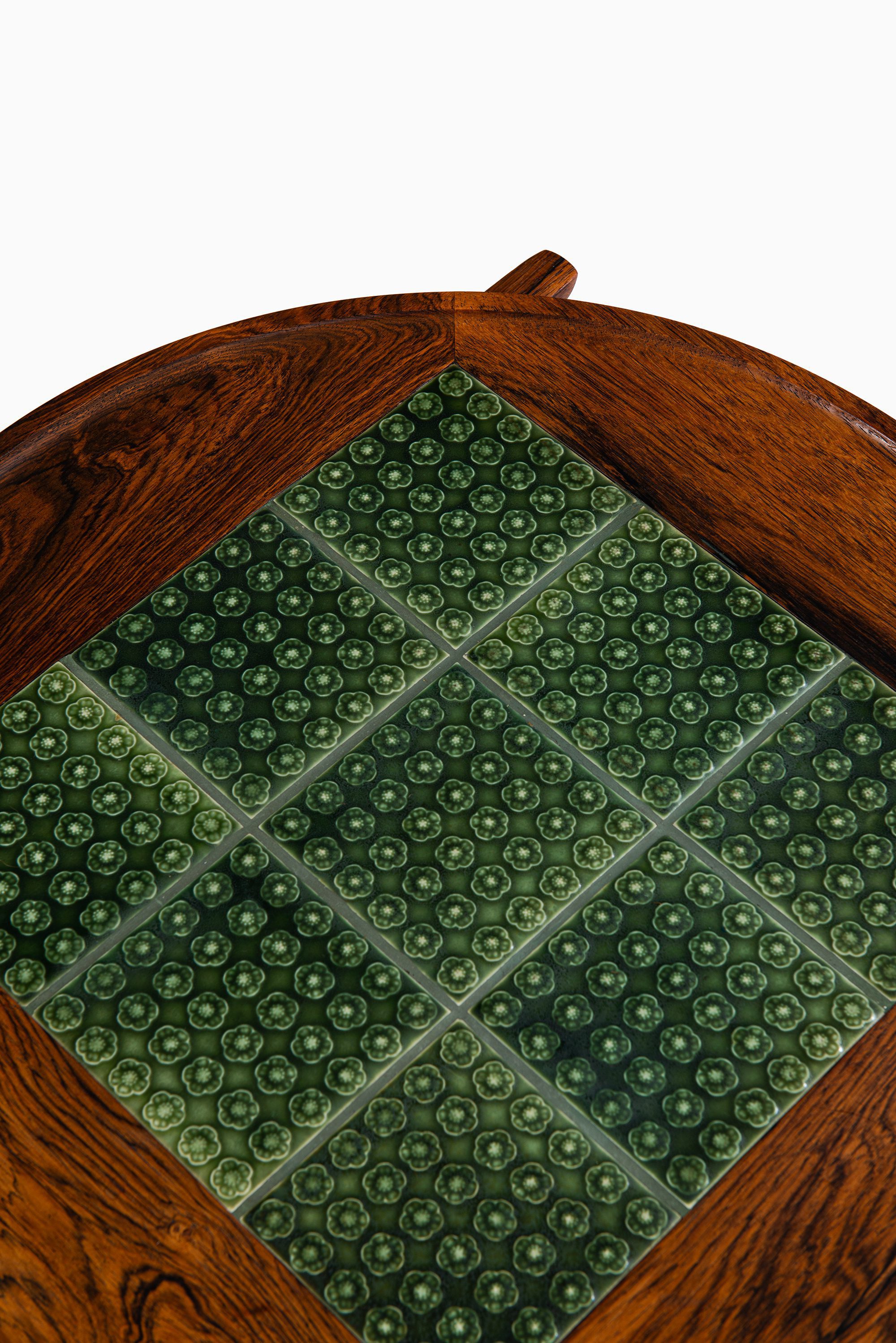 This rare side table was designed by Jens Harald Quistgaard and produced by Nissen Langå in Denmark during the 1960s. It is crafted in richly grained rosewood, paired with a square inset of nine “Azur” ceramic tiles produced by Krojyden Randers. The tiles feature a textured circular relief pattern in a deep green glaze, providing both a functional heat-resistant surface and a vivid visual contrast to the warm tones of the rosewood.