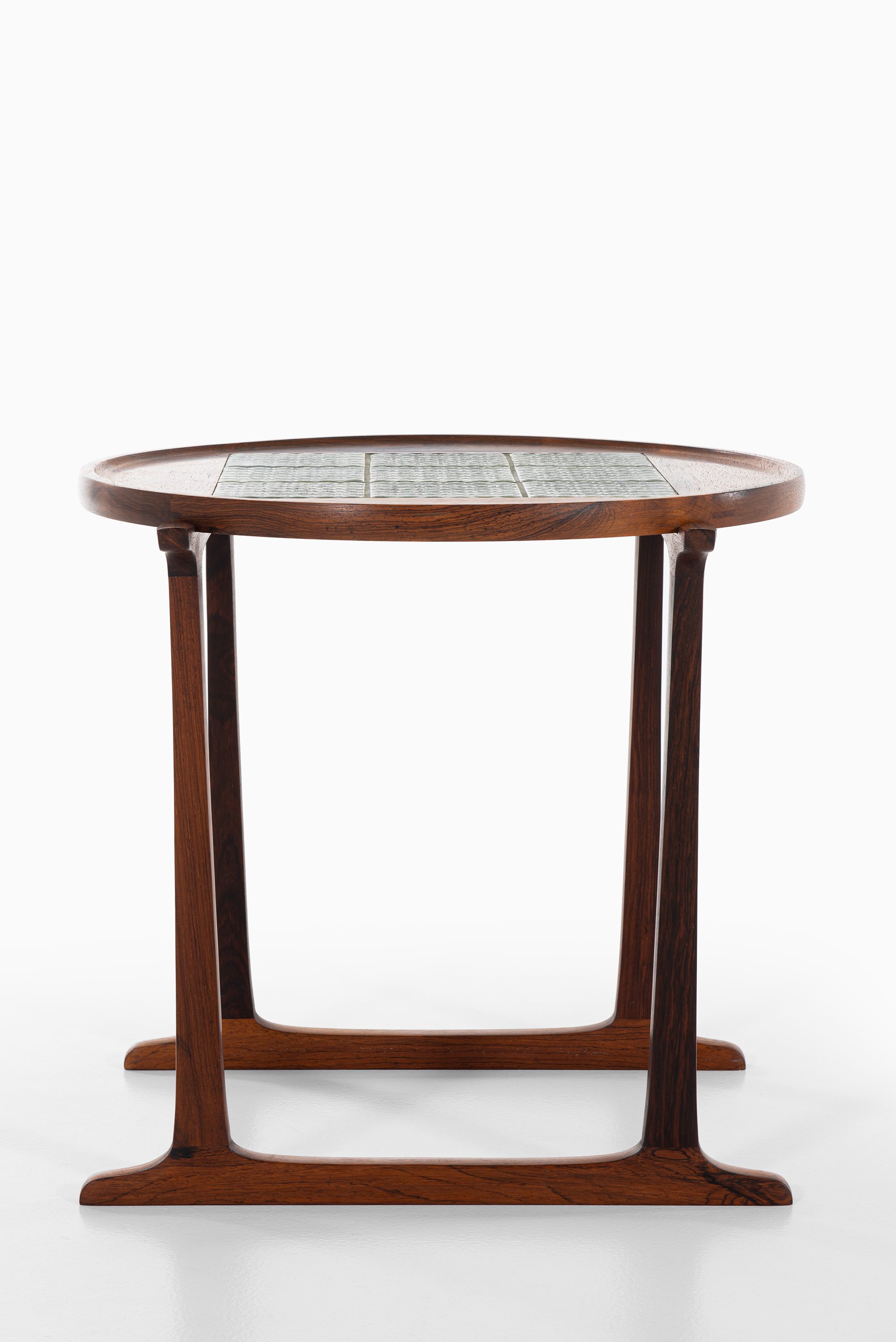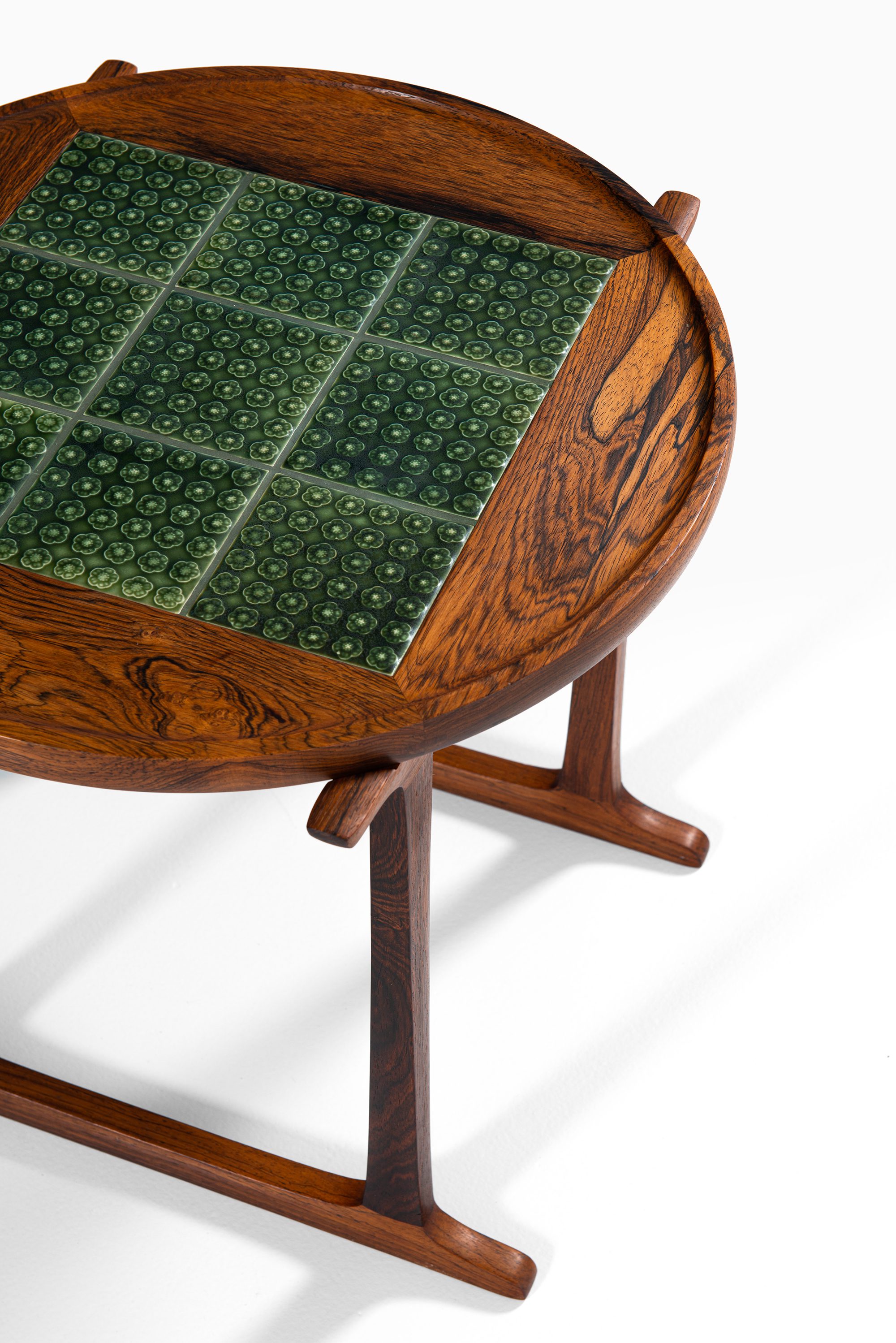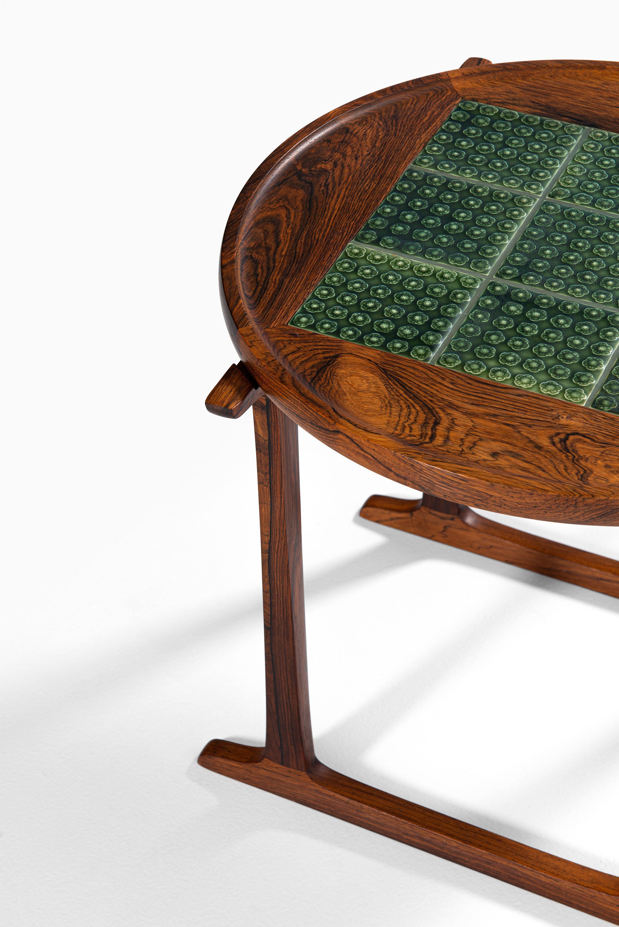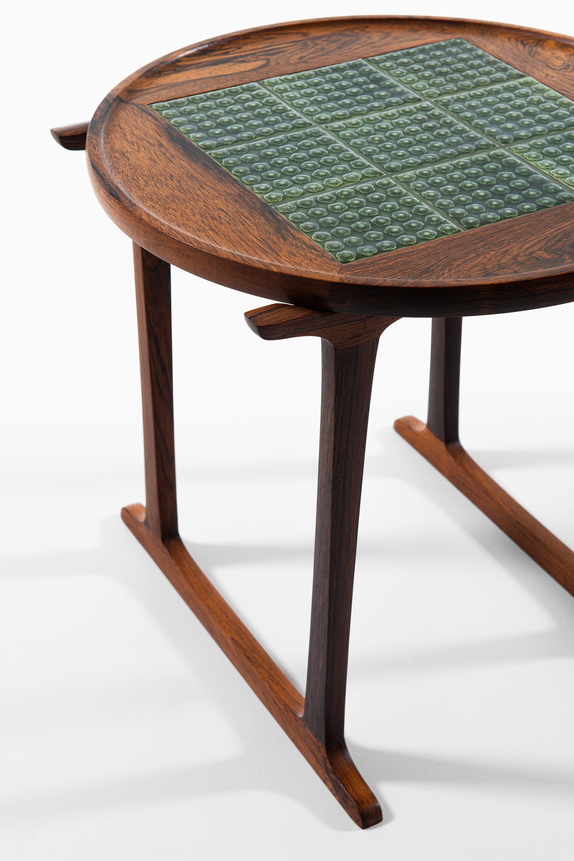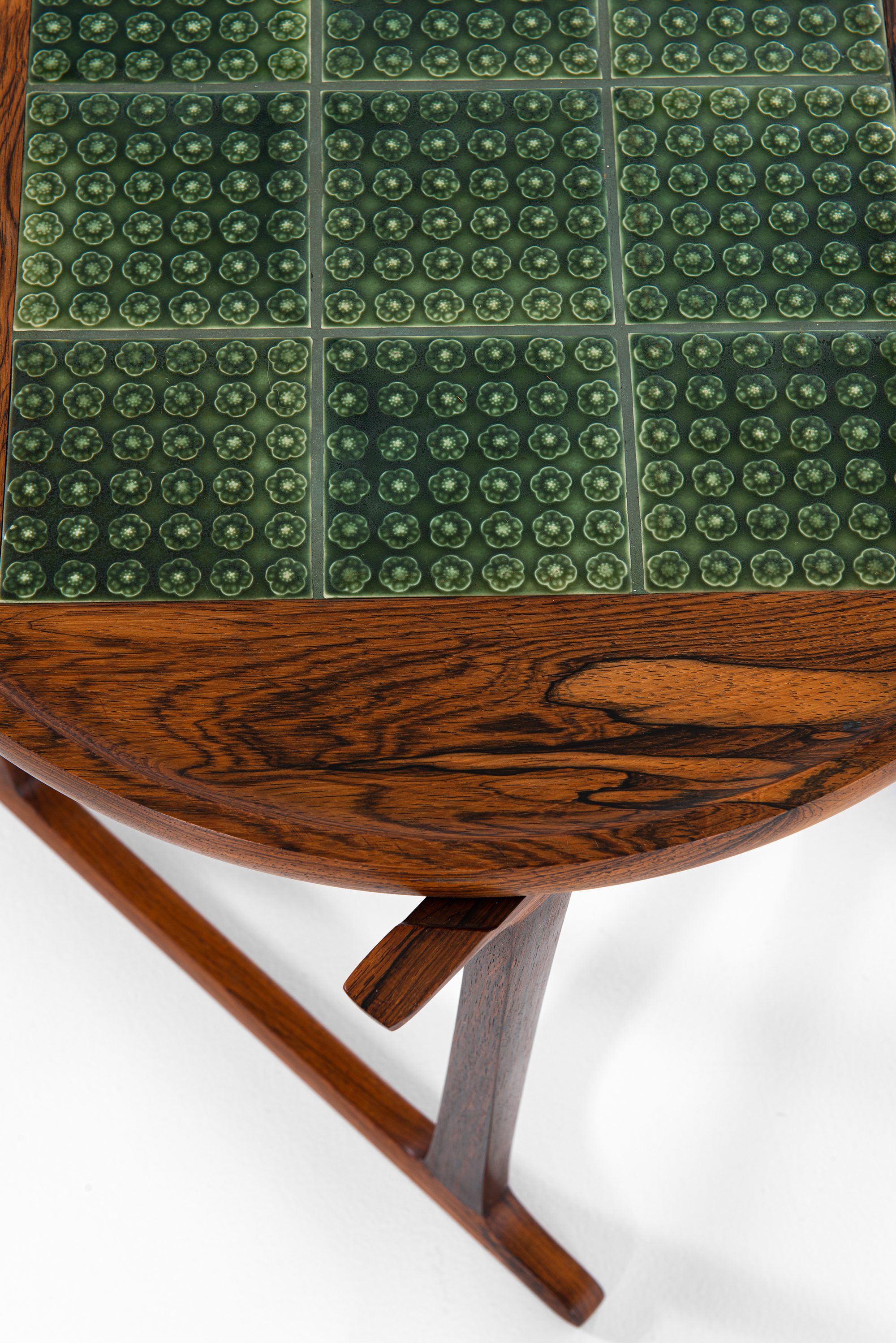 This rare side table was designed by Jens Harald Quistgaard and produced by Nissen Langå in Denmark during the 1960s. It is crafted in richly grained rosewood, paired with a square inset of nine “Azur” ceramic tiles produced by Krojyden Randers. The tiles feature a textured circular relief pattern in a deep green glaze, providing both a functional heat-resistant surface and a vivid visual contrast to the warm tones of the rosewood.