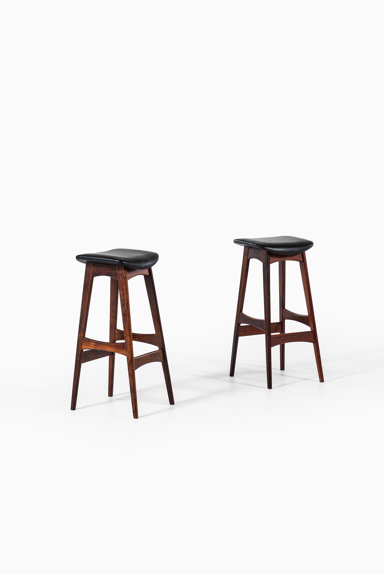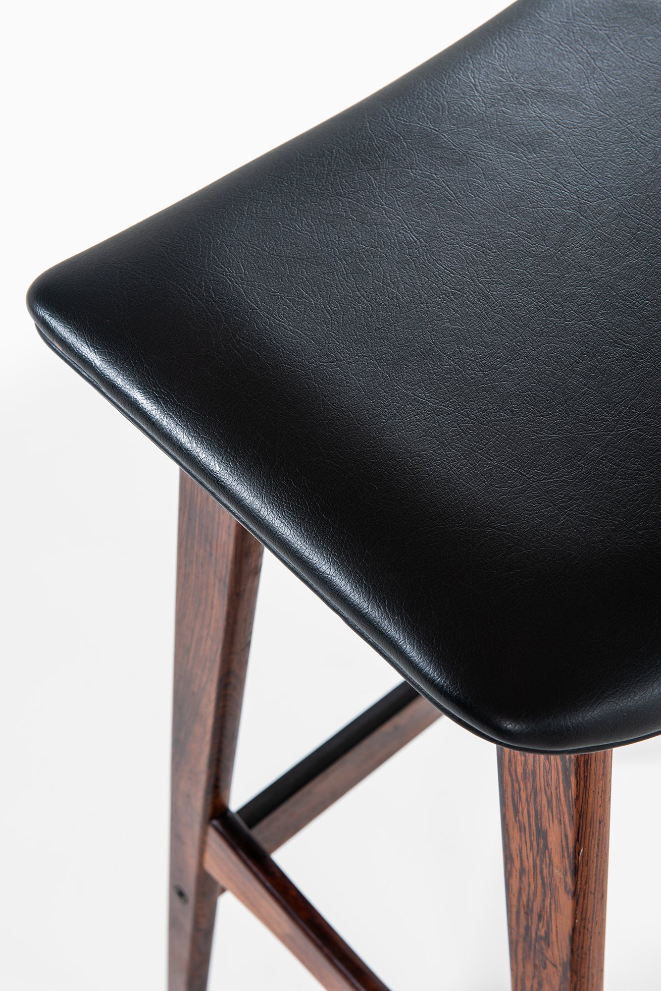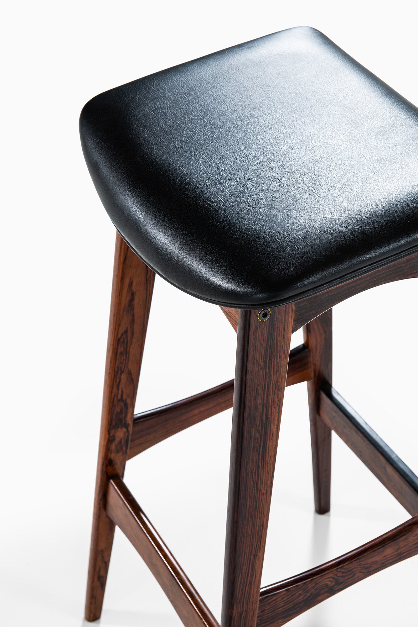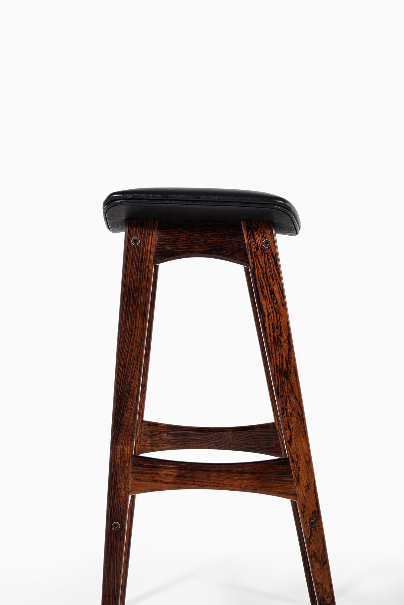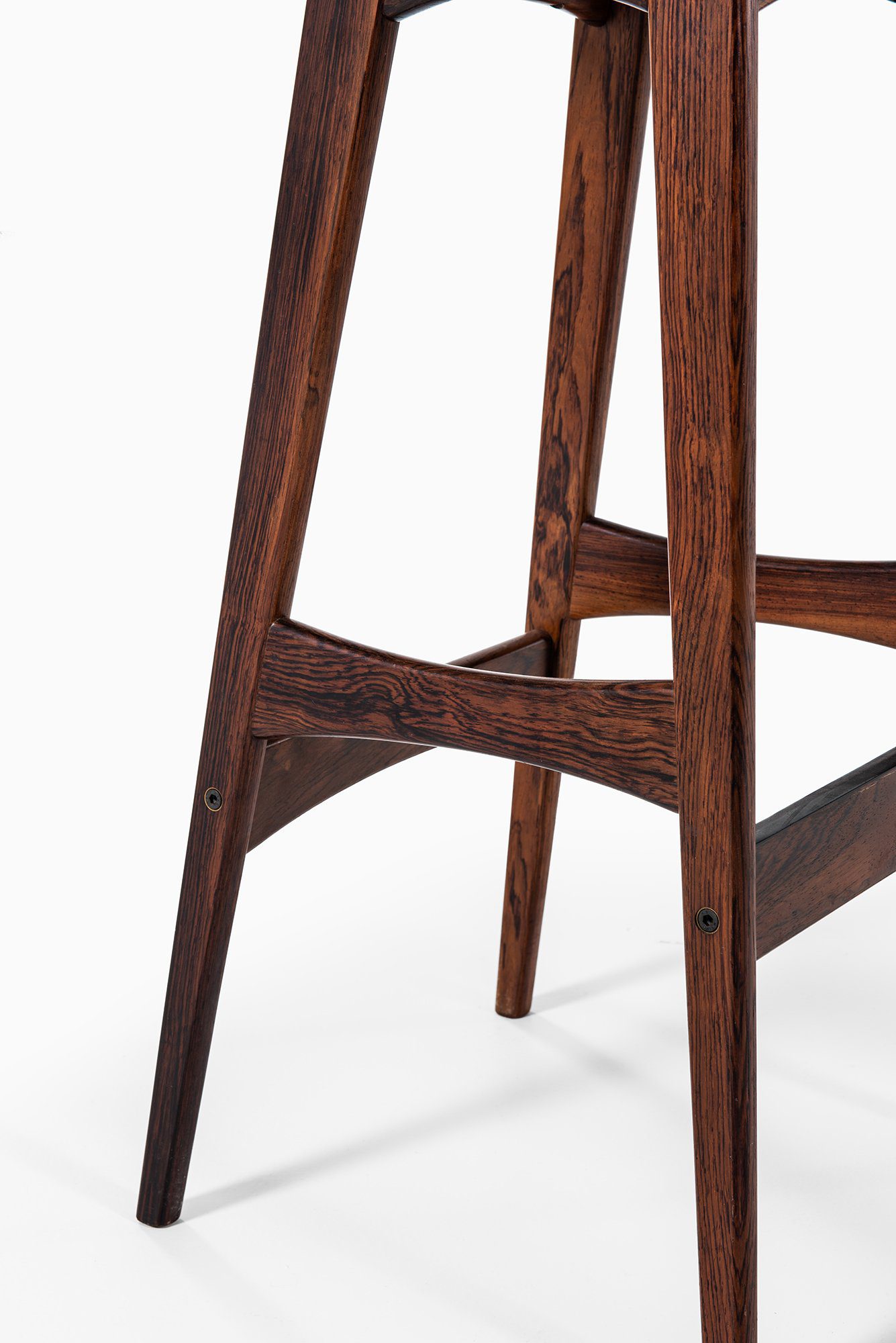 The frames are constructed in solid wood with a deep brown tone and visible grain, suggesting rosewood or a closely related hardwood commonly used by the manufacturer during this period. Each stool stands on four tapered legs connected by shaped stretchers that also function as footrests. The stretchers are gently curved and carefully integrated into the legs, contributing both structural rigidity and visual rhythm. The overall silhouette is narrow and elegant, suited for bar or counter-height seating.