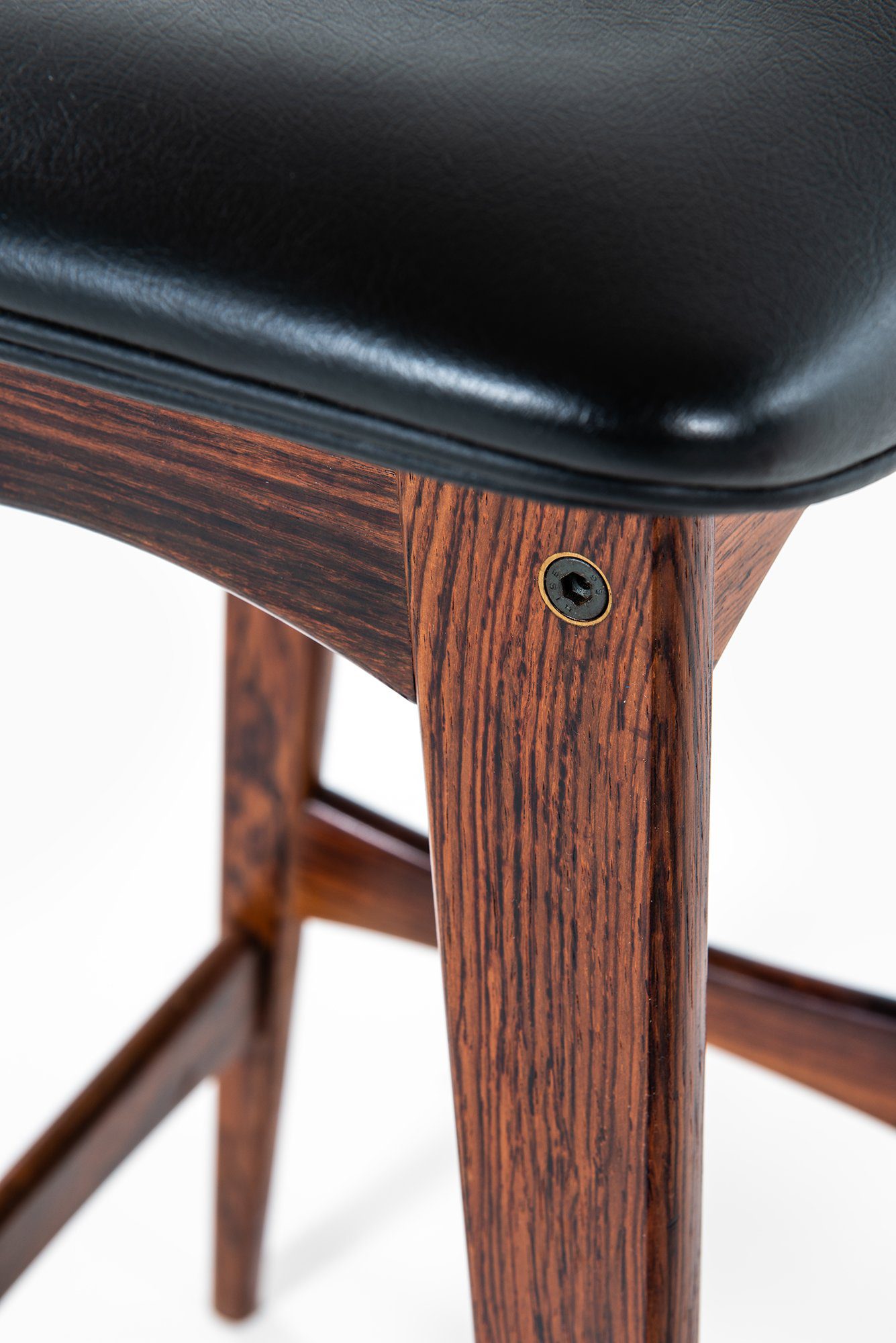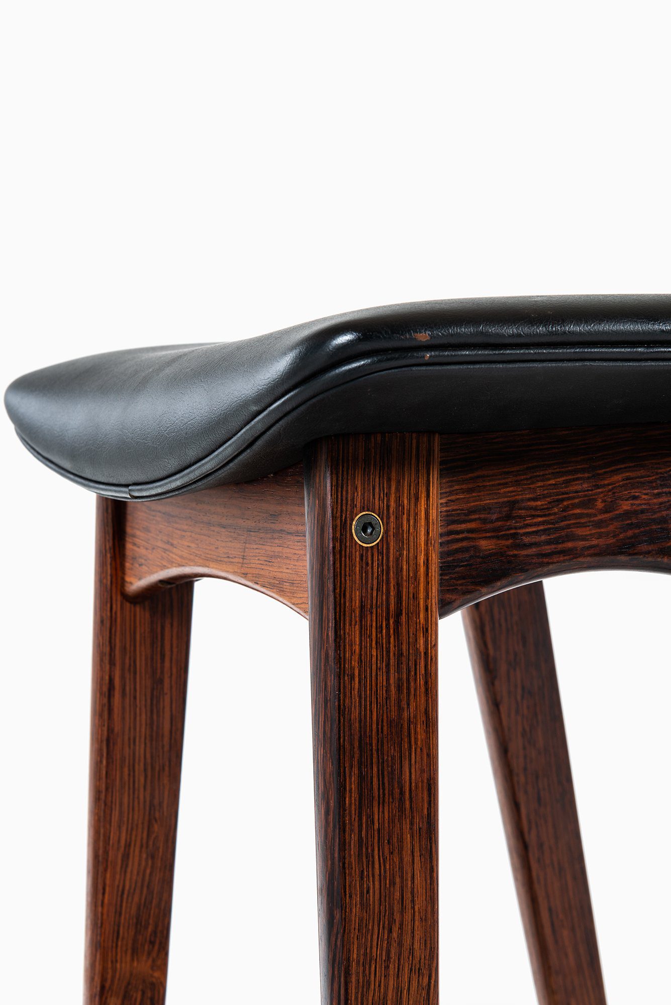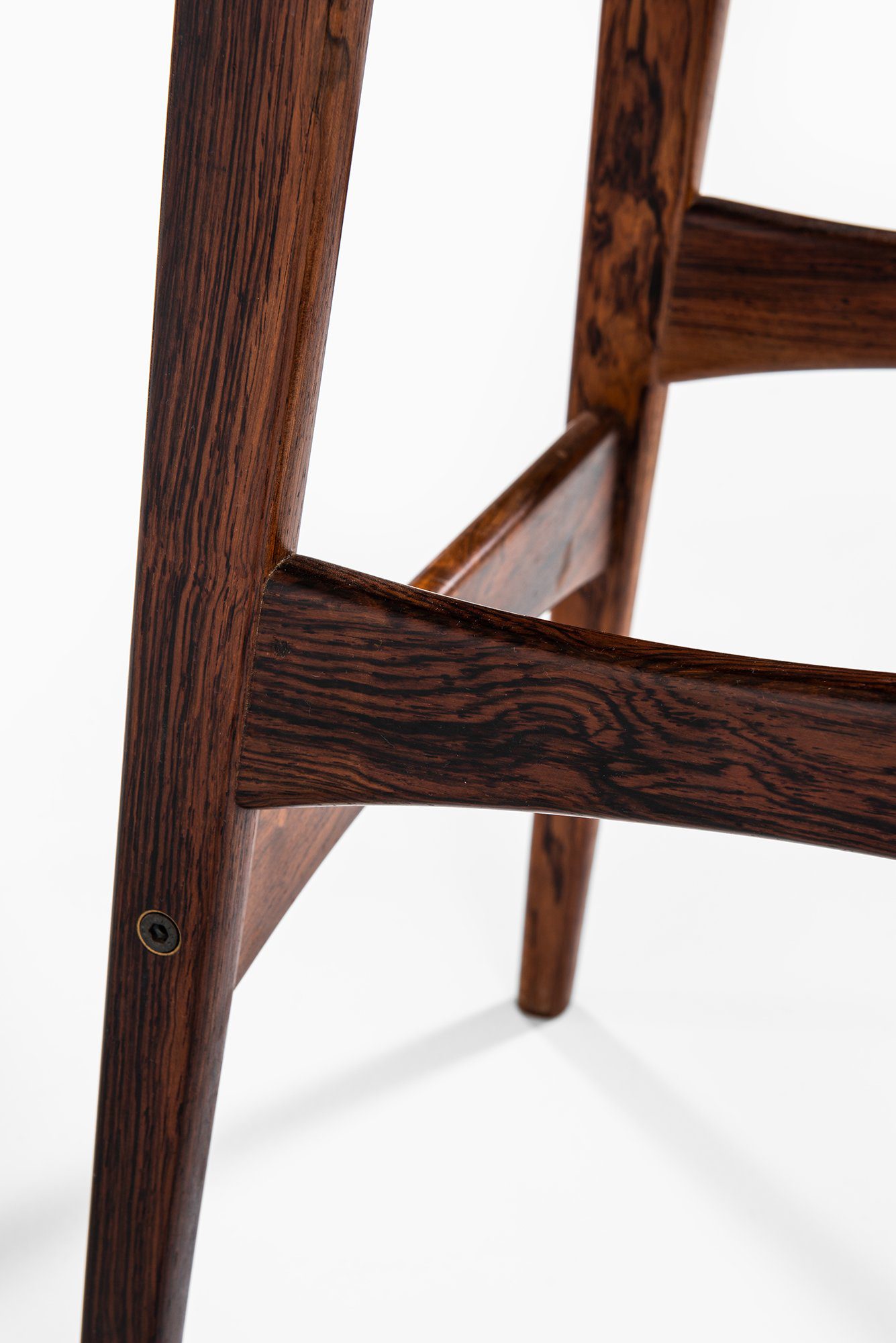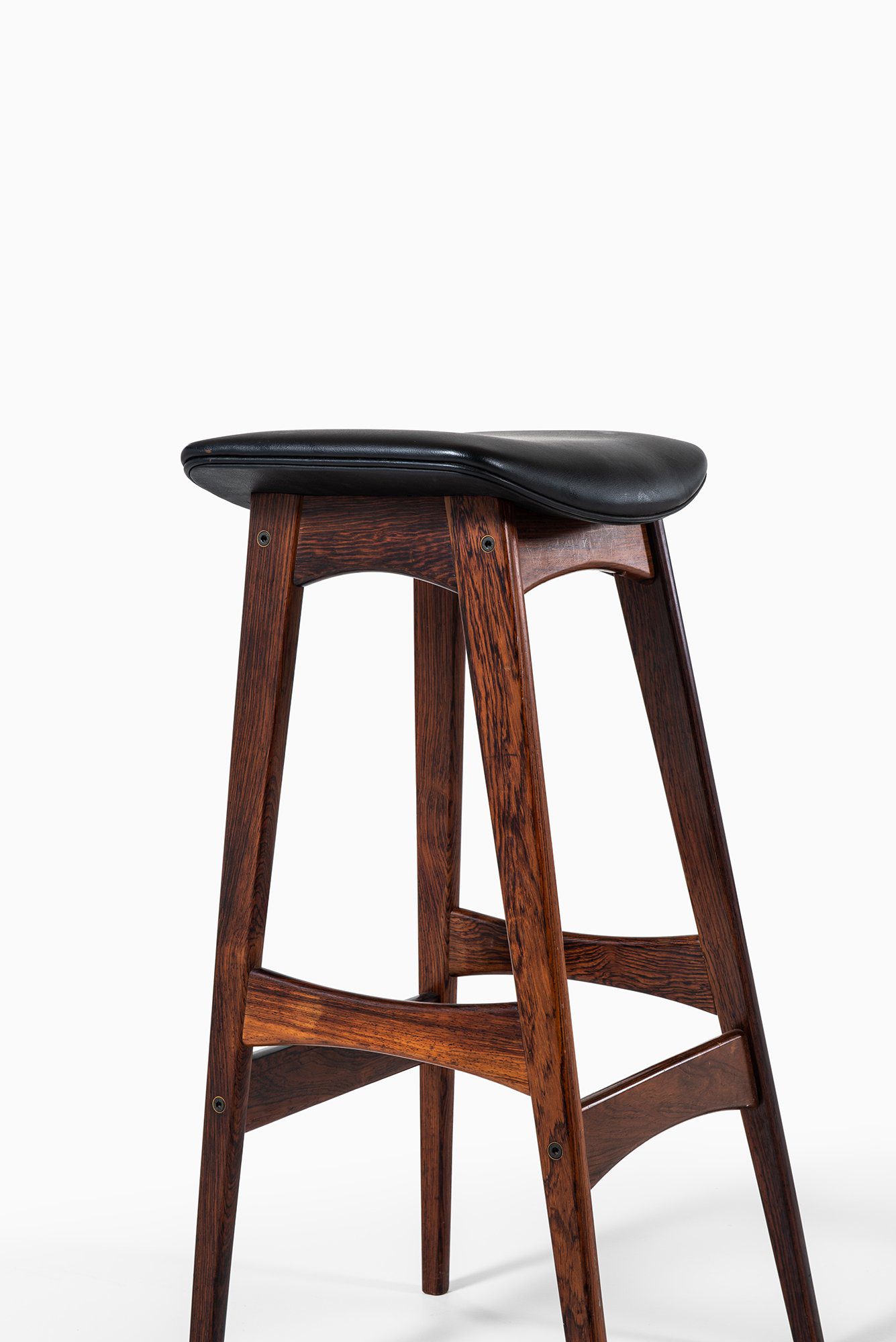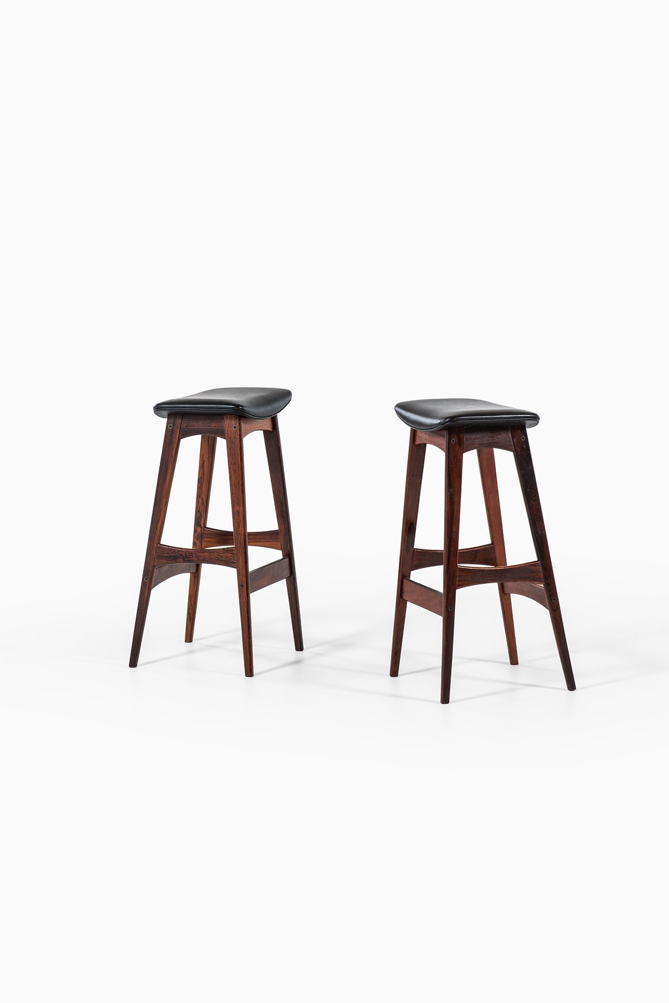The frames are constructed in solid wood with a deep brown tone and visible grain, suggesting rosewood or a closely related hardwood commonly used by the manufacturer during this period. Each stool stands on four tapered legs connected by shaped stretchers that also function as footrests. The stretchers are gently curved and carefully integrated into the legs, contributing both structural rigidity and visual rhythm. The overall silhouette is narrow and elegant, suited for bar or counter-height seating.