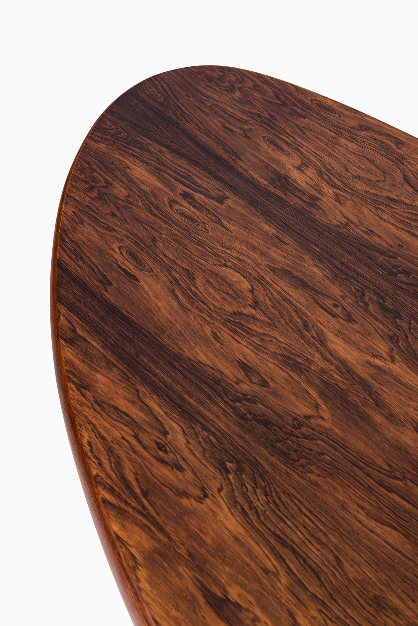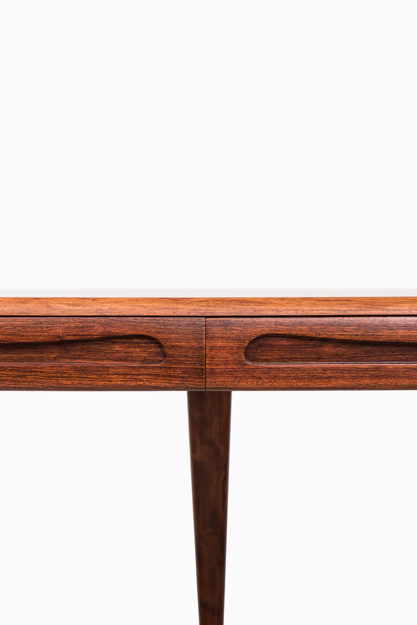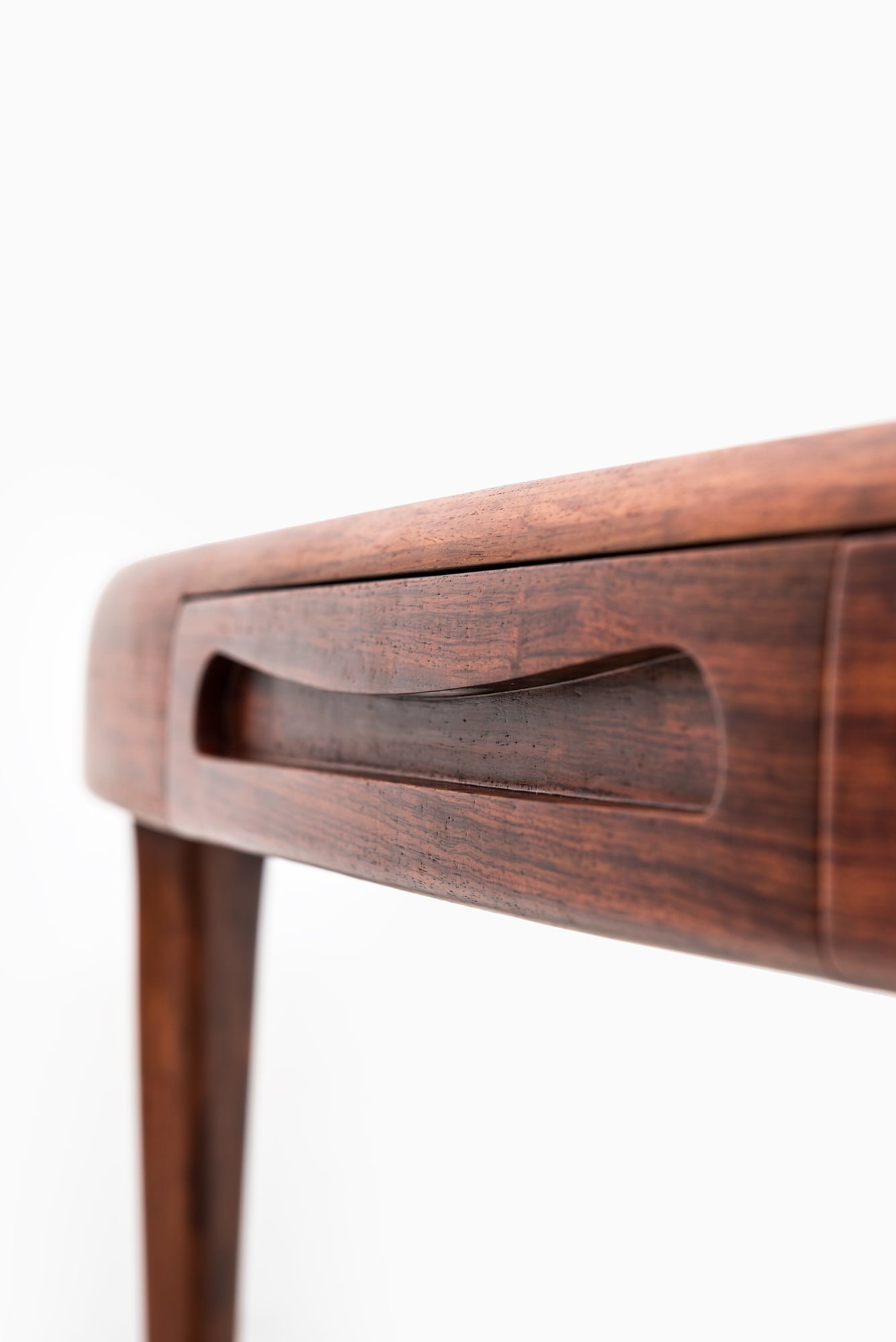 The table is constructed in rosewood with mahogany details, both prized mid-century materials for their durability and rich visual character. The rosewood top displays highly figured grain patterns with dark streaks set against a warm reddish-brown background, lending the surface depth and dynamism. The edges are smoothly rounded, giving the piece an organic softness, while the sculpted integrated drawer handles are characteristic of Andersen’s approach to form, carved seamlessly into the frame rather than applied as separate elements.