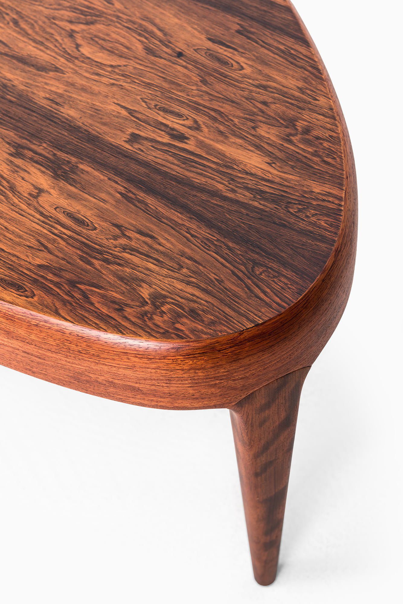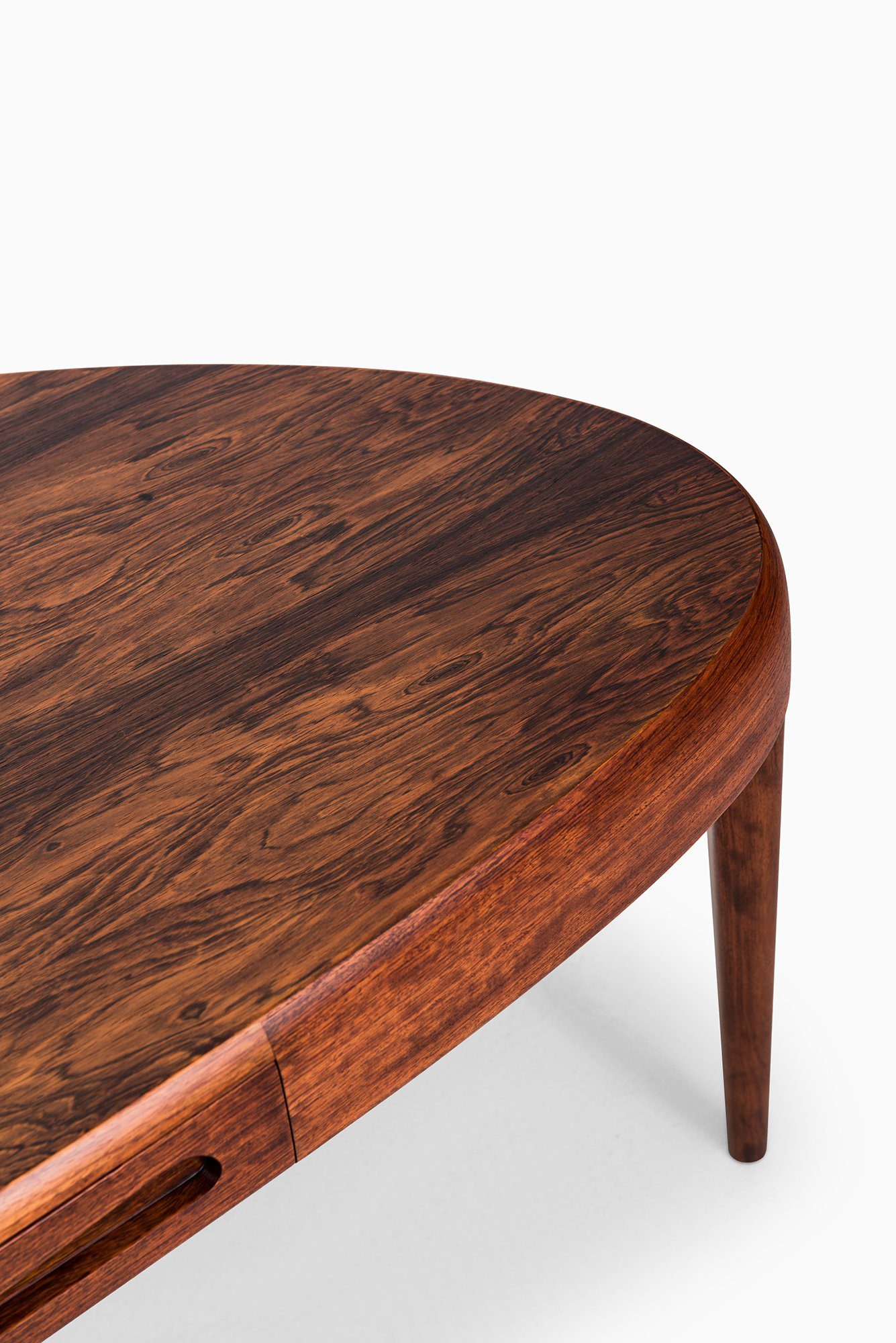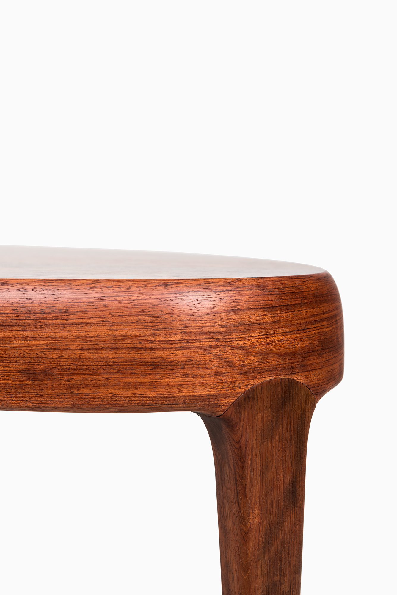 The table is constructed in rosewood with mahogany details, both prized mid-century materials for their durability and rich visual character. The rosewood top displays highly figured grain patterns with dark streaks set against a warm reddish-brown background, lending the surface depth and dynamism. The edges are smoothly rounded, giving the piece an organic softness, while the sculpted integrated drawer handles are characteristic of Andersen’s approach to form, carved seamlessly into the frame rather than applied as separate elements.