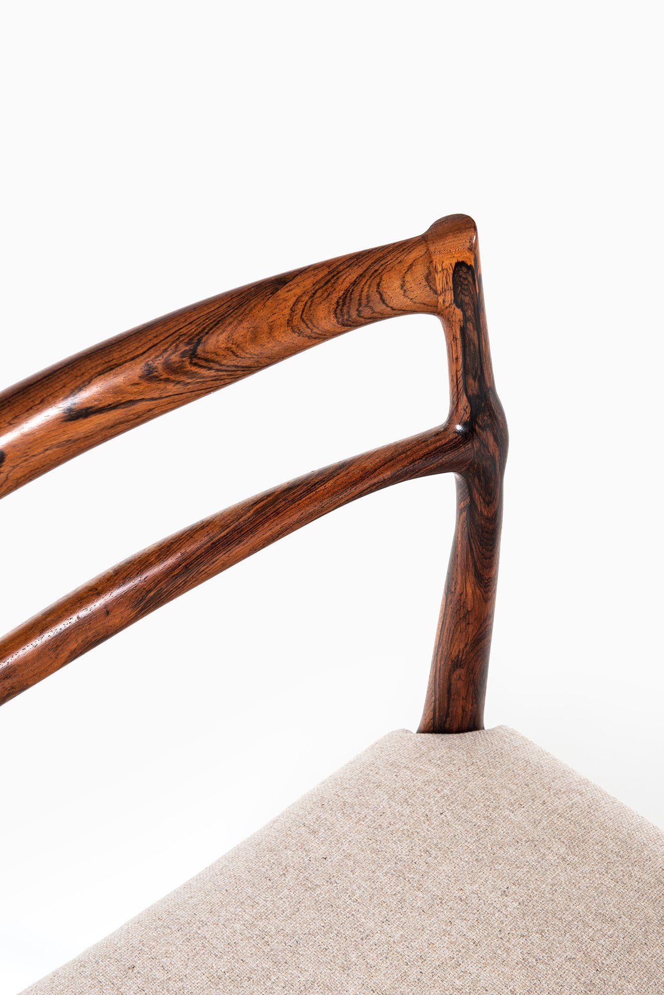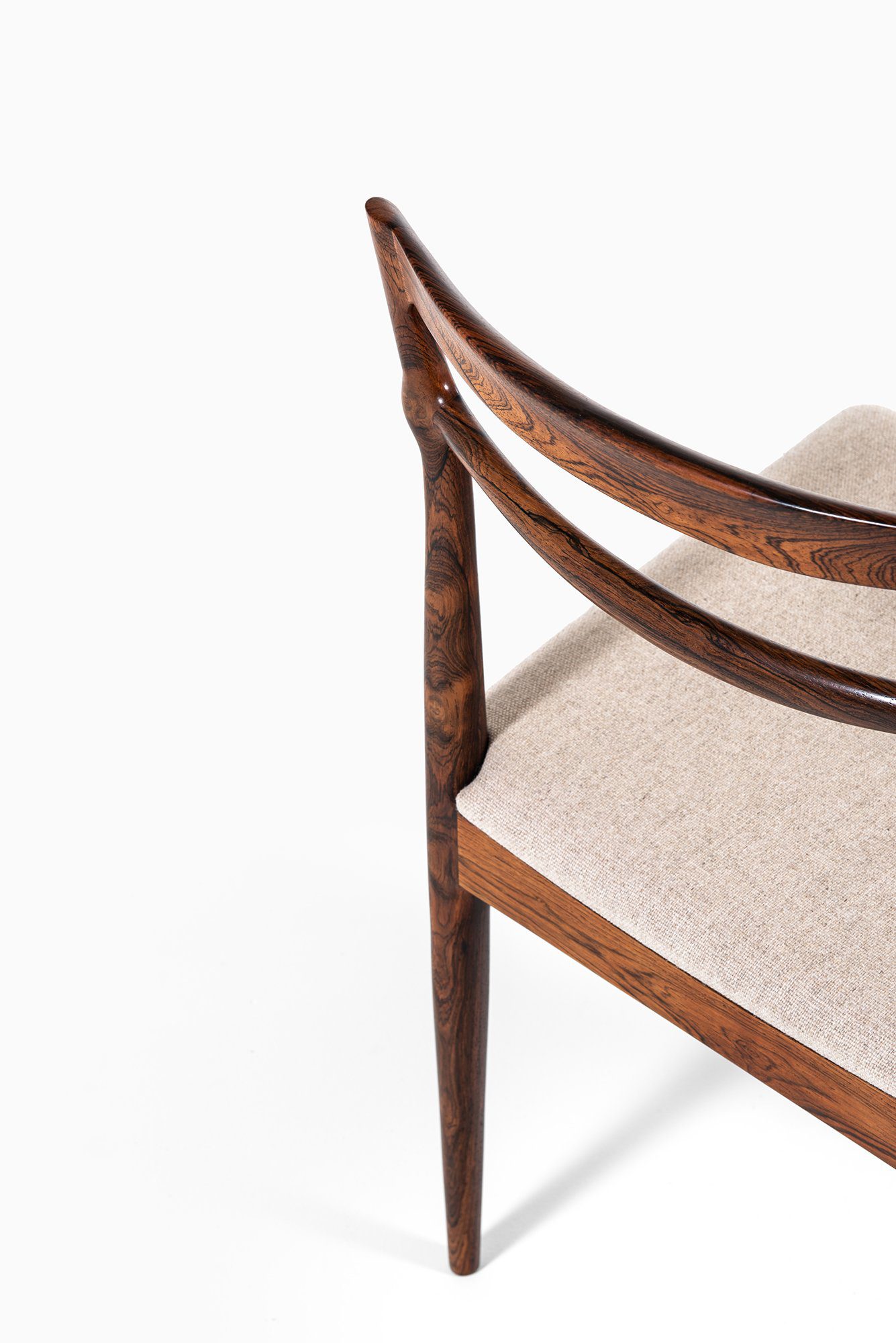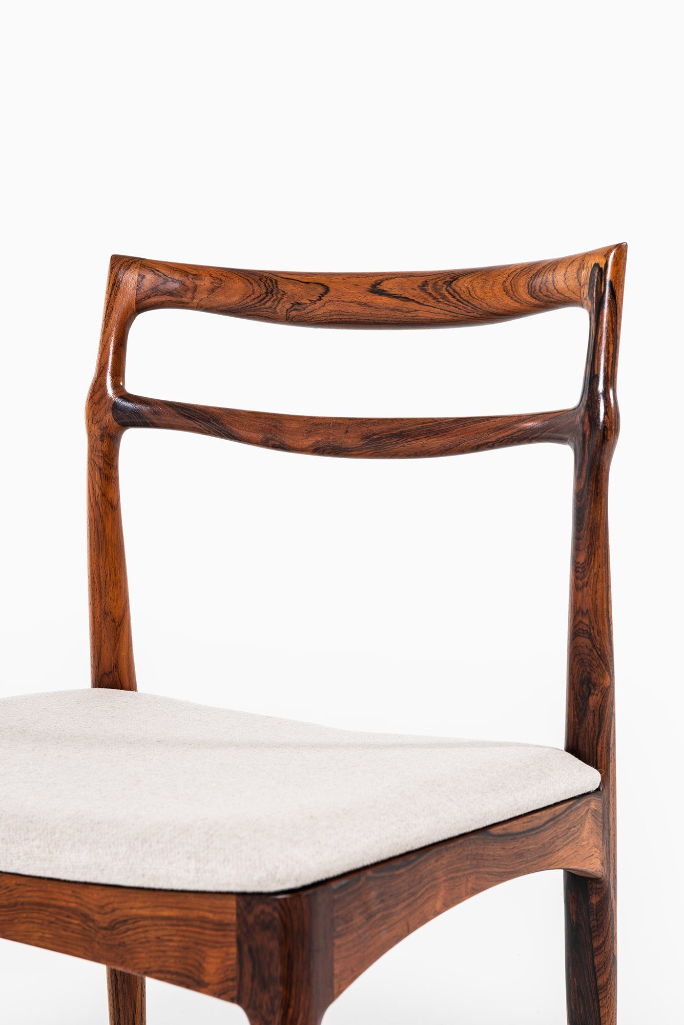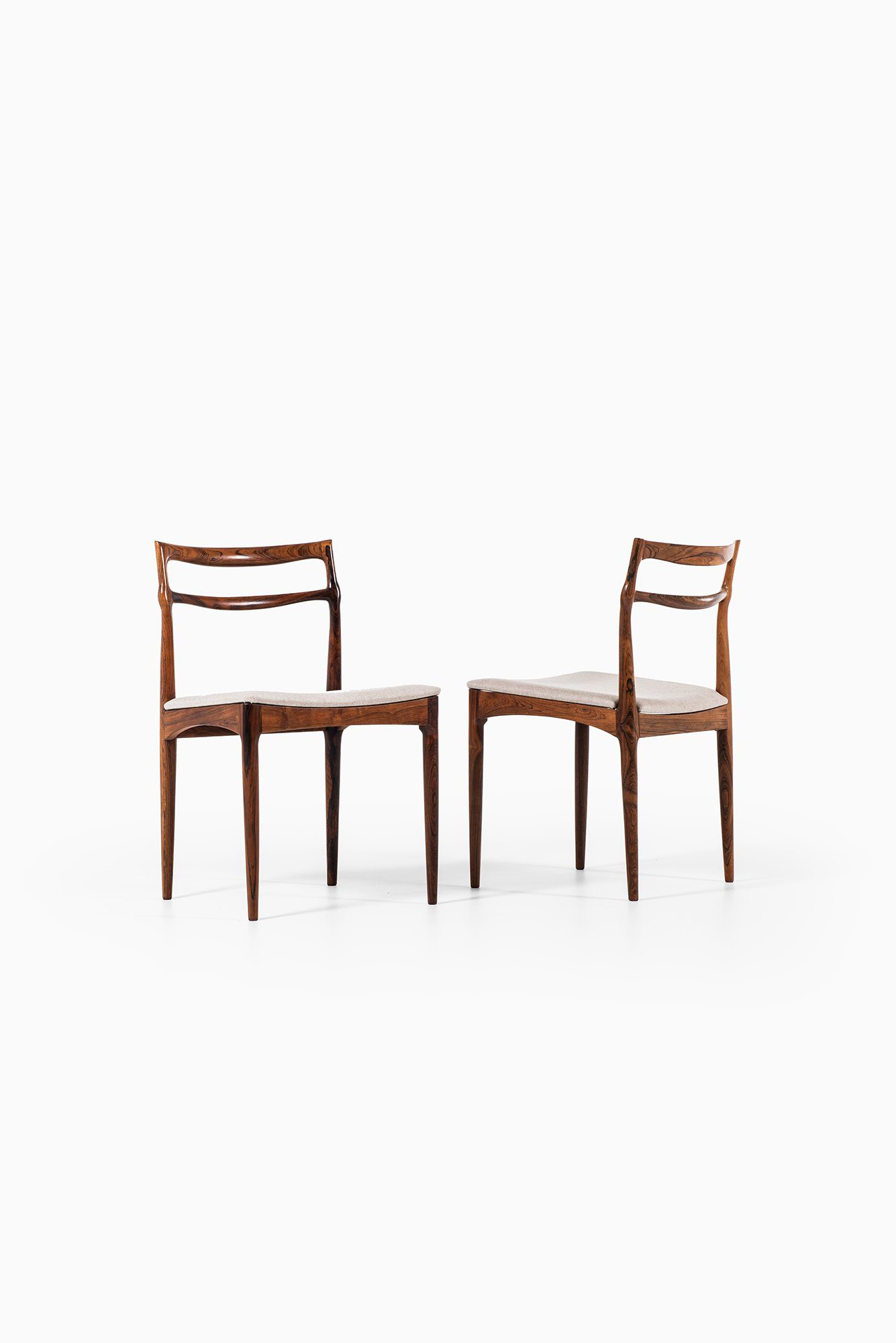Each chair is executed in solid rosewood, a material admired for its deep, expressive grain and natural luster. The backrests are formed by two gently curved horizontal rails that flow seamlessly into the rear legs, emphasizing both strength and elegance. The transitions between components are sculpted with remarkable sensitivity, displaying Andersen’s signature attention to detail and the fluidity of form typical of his mid-century works.