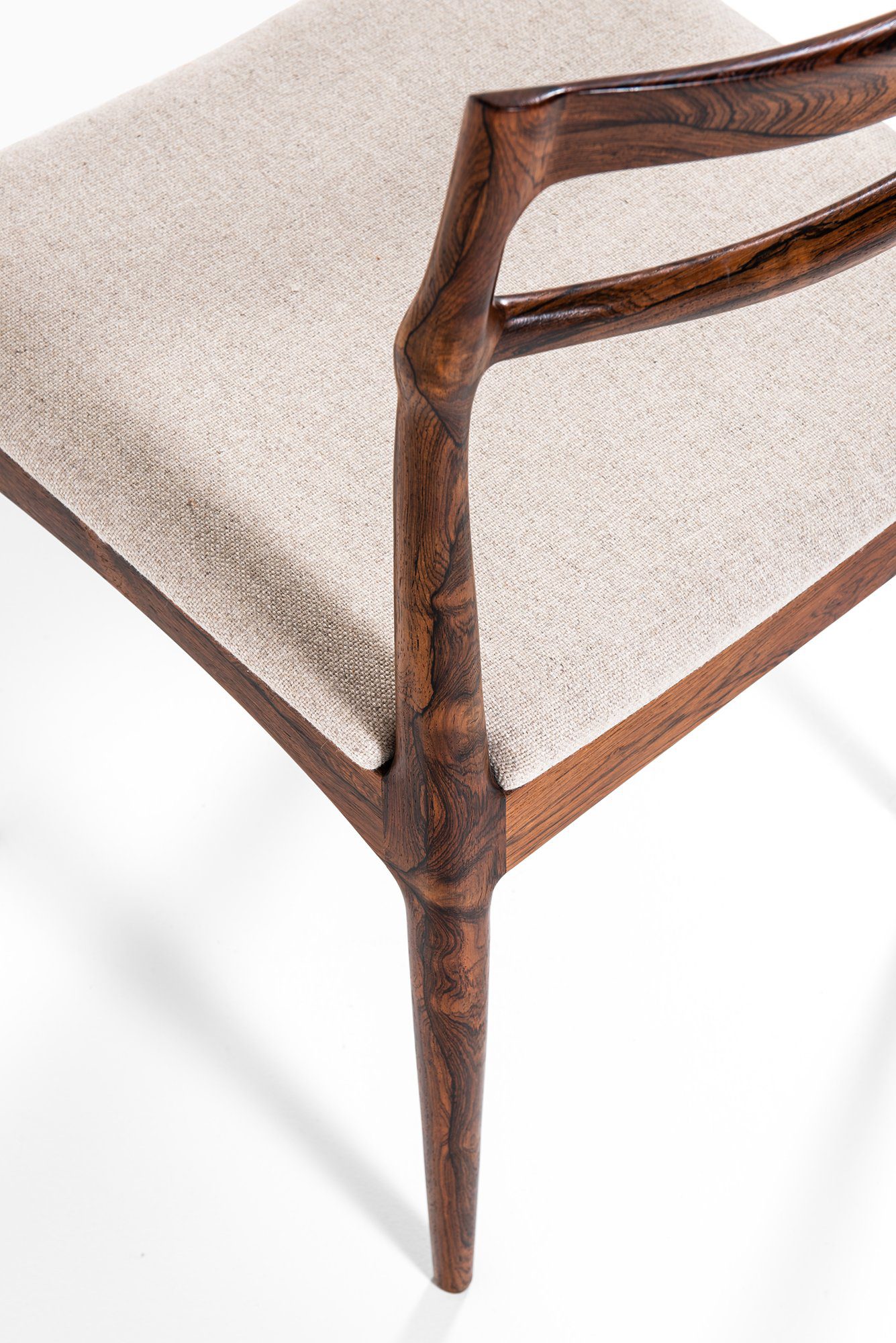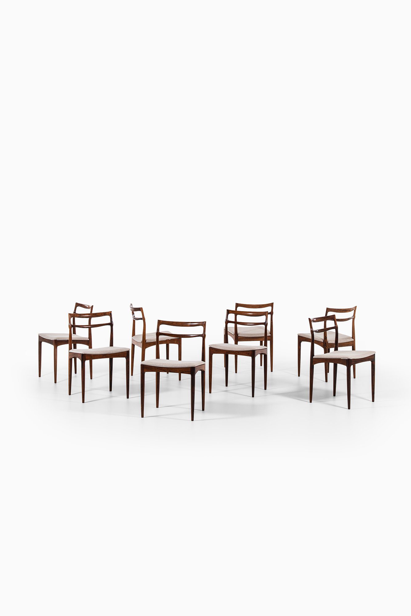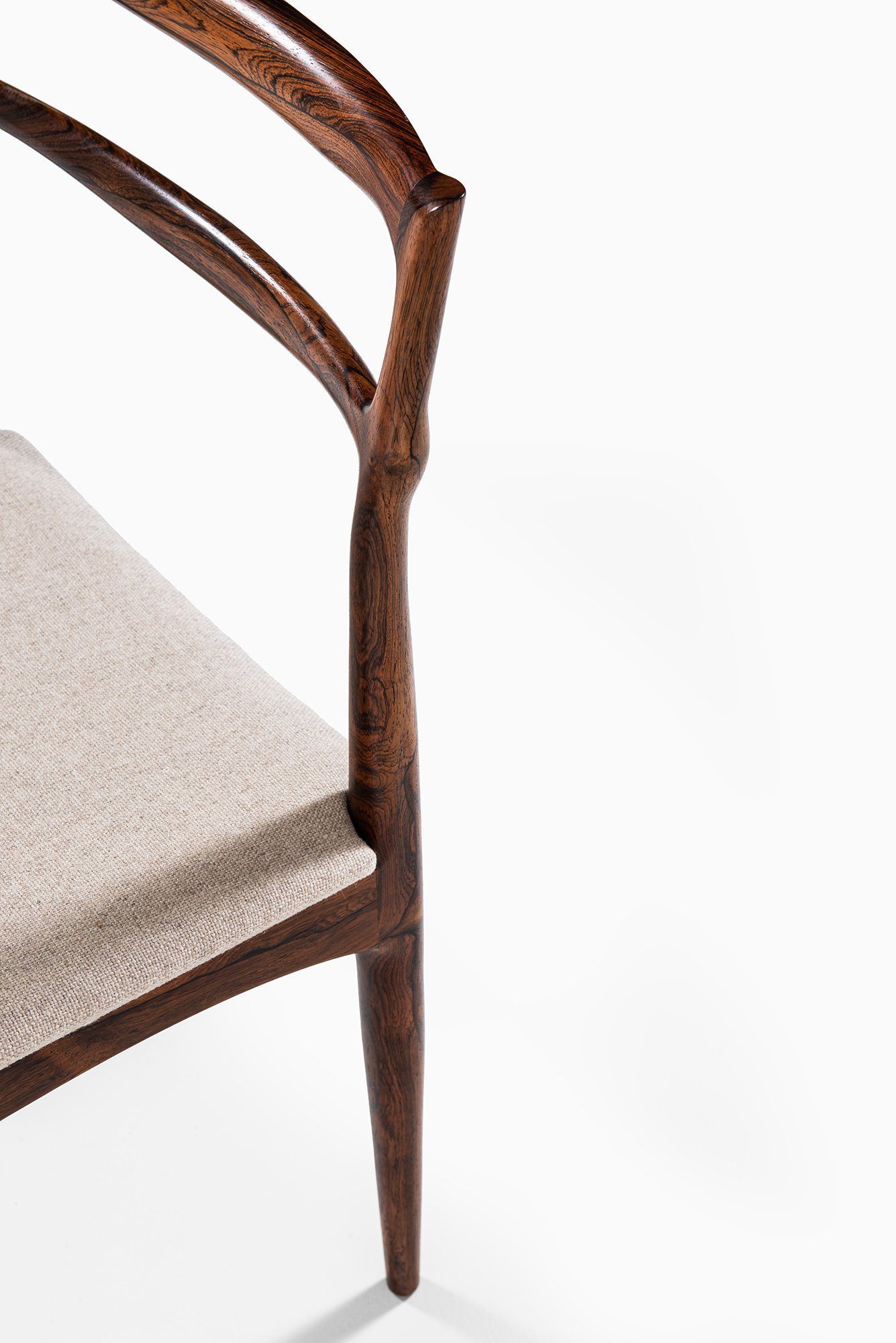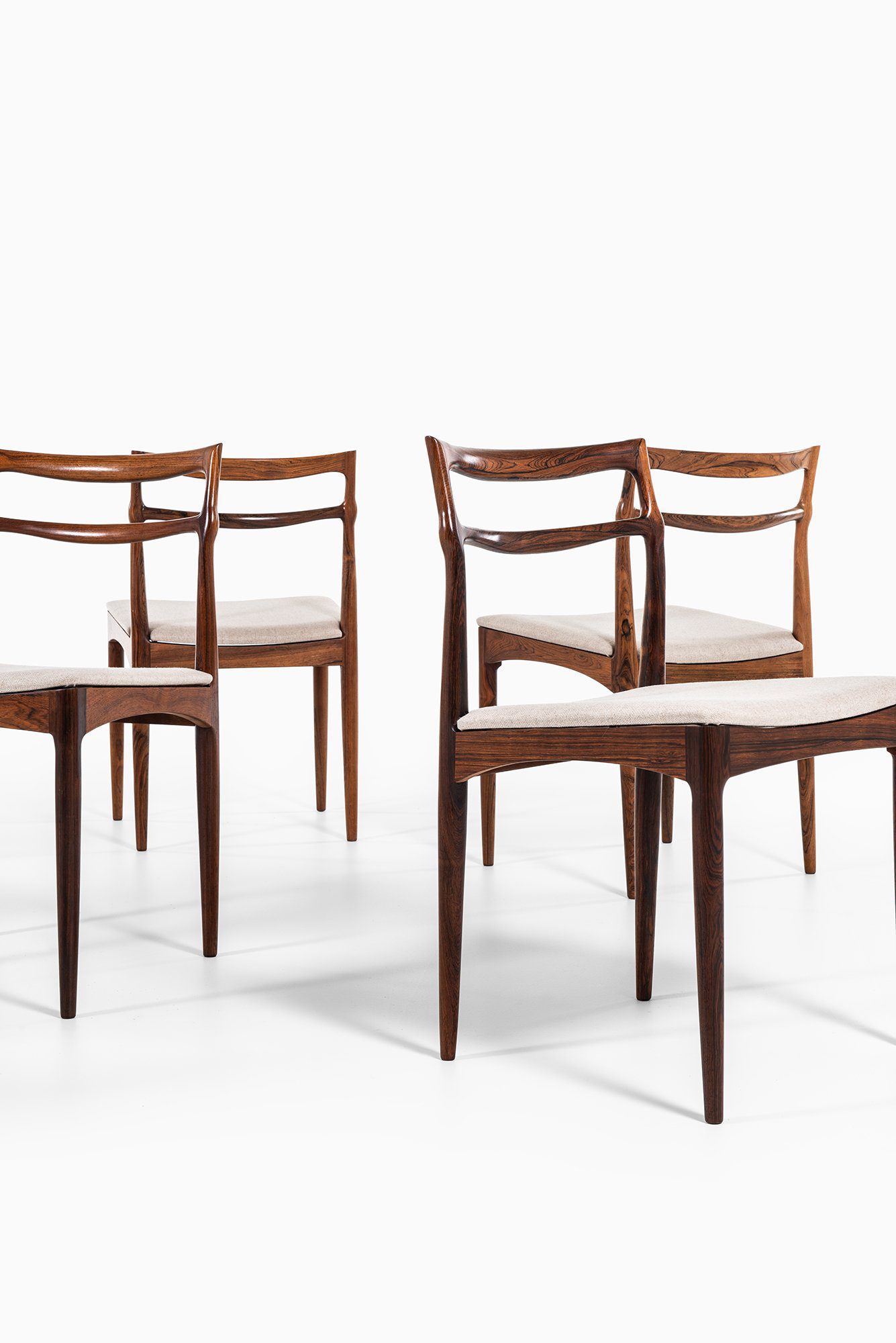 Each chair is executed in solid rosewood, a material admired for its deep, expressive grain and natural luster. The backrests are formed by two gently curved horizontal rails that flow seamlessly into the rear legs, emphasizing both strength and elegance. The transitions between components are sculpted with remarkable sensitivity, displaying Andersen’s signature attention to detail and the fluidity of form typical of his mid-century works.