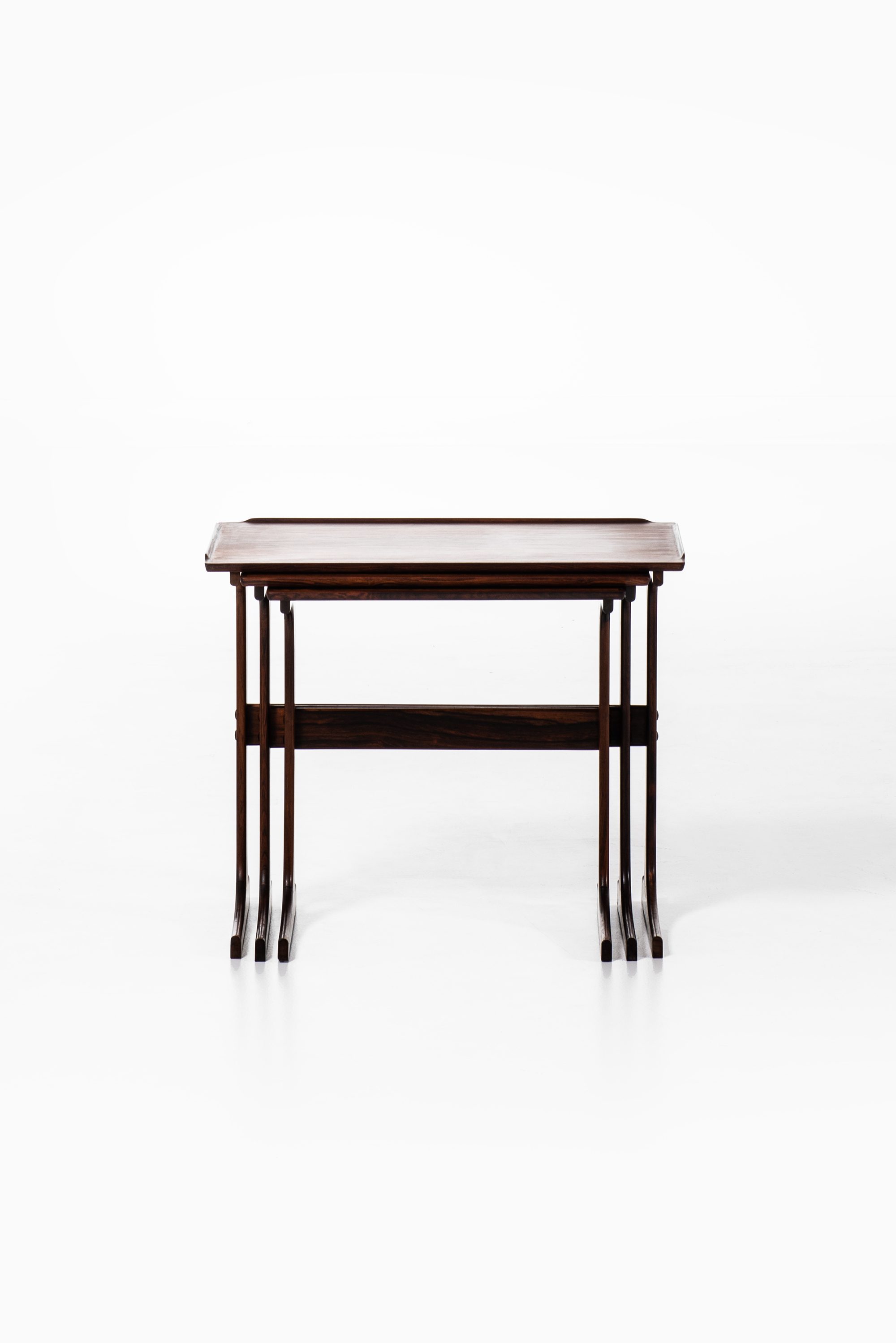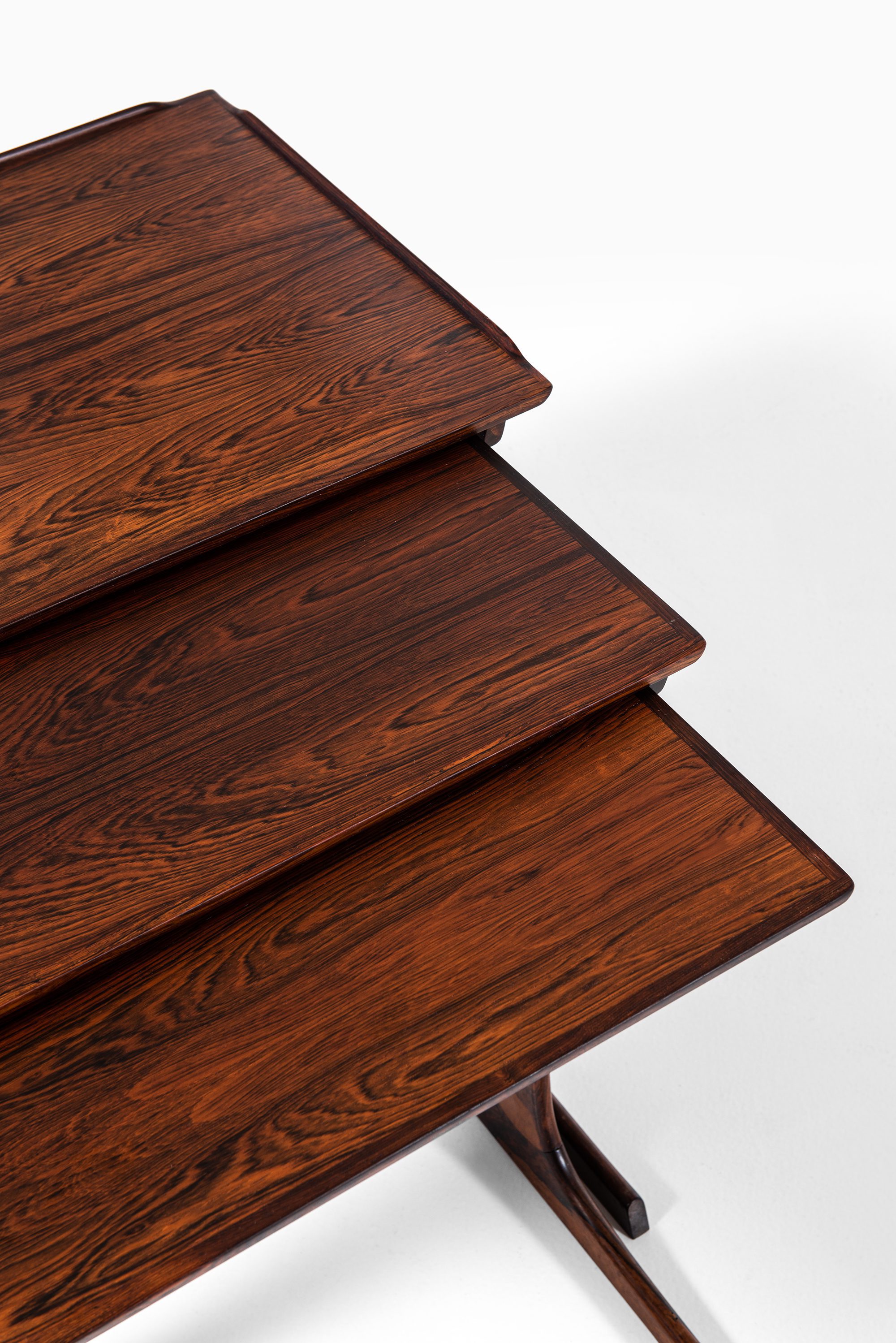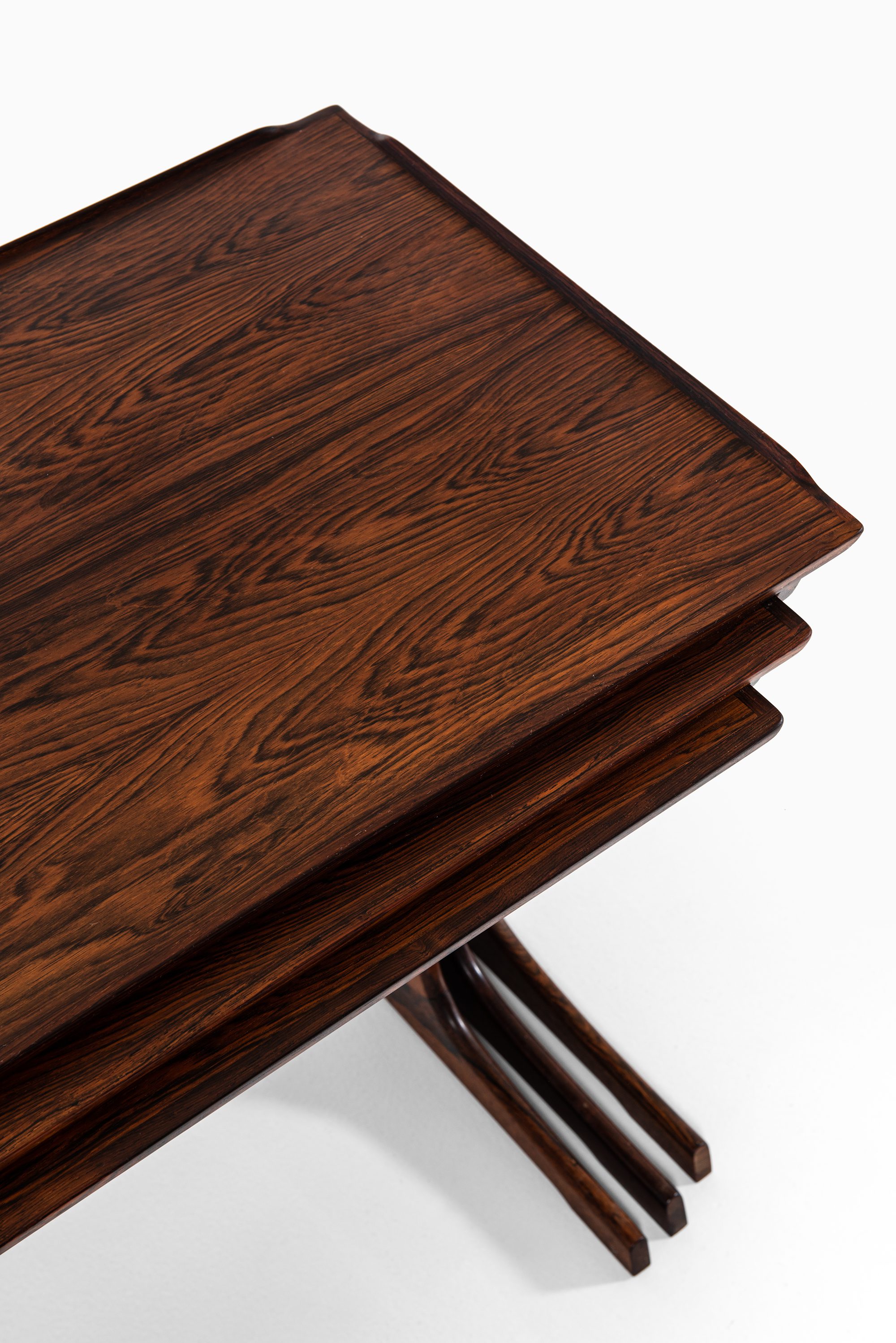 This rare set of nesting tables was designed by Johannes Andersen and produced by CFC Silkeborg in Denmark during the 1960s. The tables are executed in rosewood, a material widely used in Scandinavian mid-century furniture for its durability and richly figured grain. The surfaces display warm brown tones with darker streaks, enhancing the sculptural qualities of the design. Each table is designed to fit seamlessly under the next, creating a flexible and space-saving solution typical of the era.
